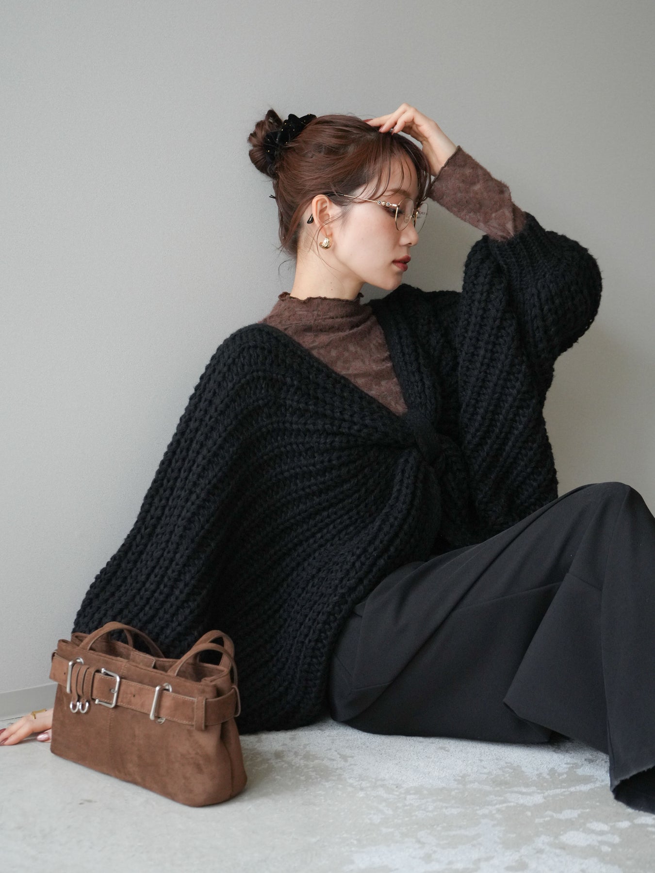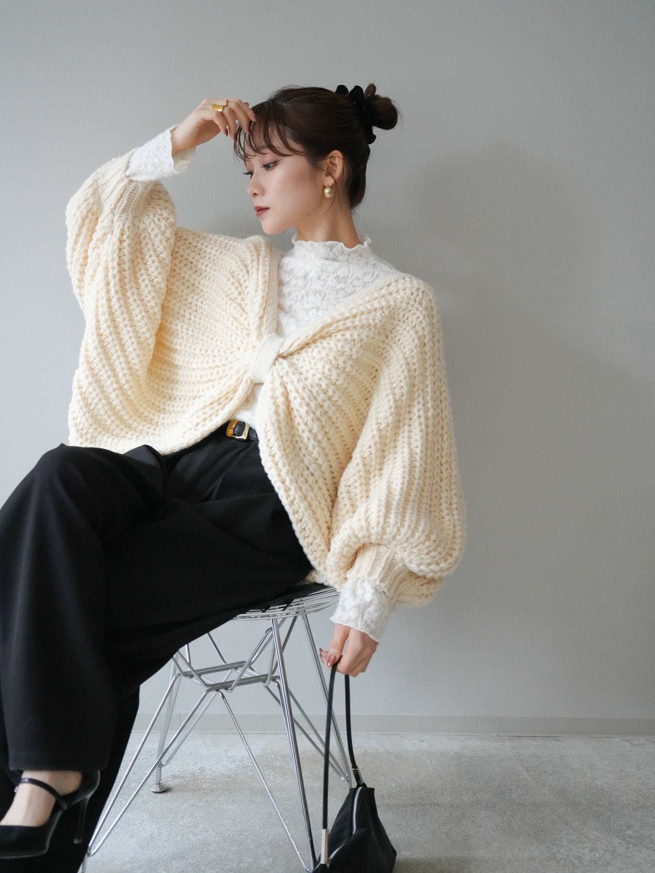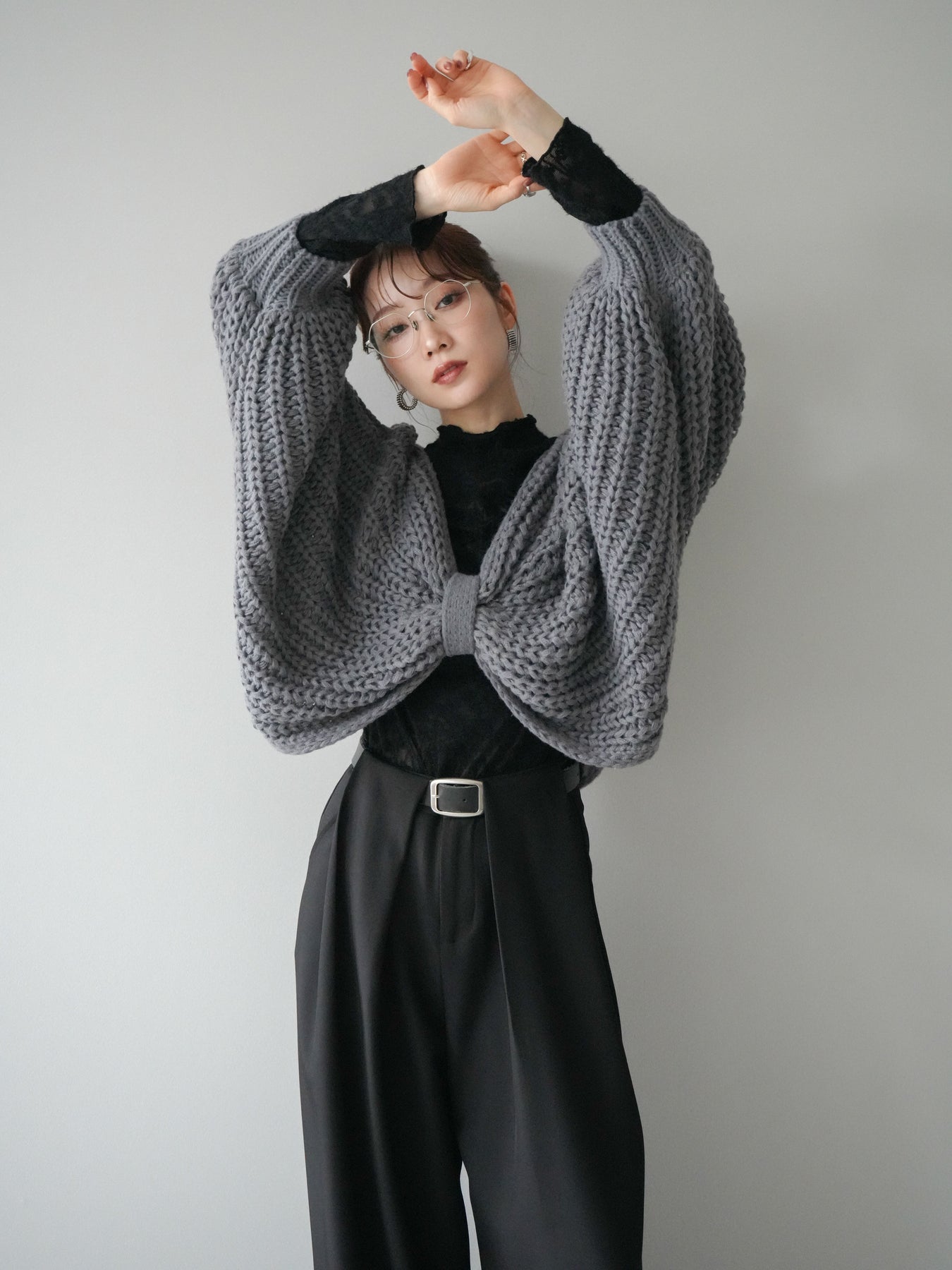 [SET]ローゲージ畦編みドルマンニットボレロ+起毛レースプチネックトップス(2set)