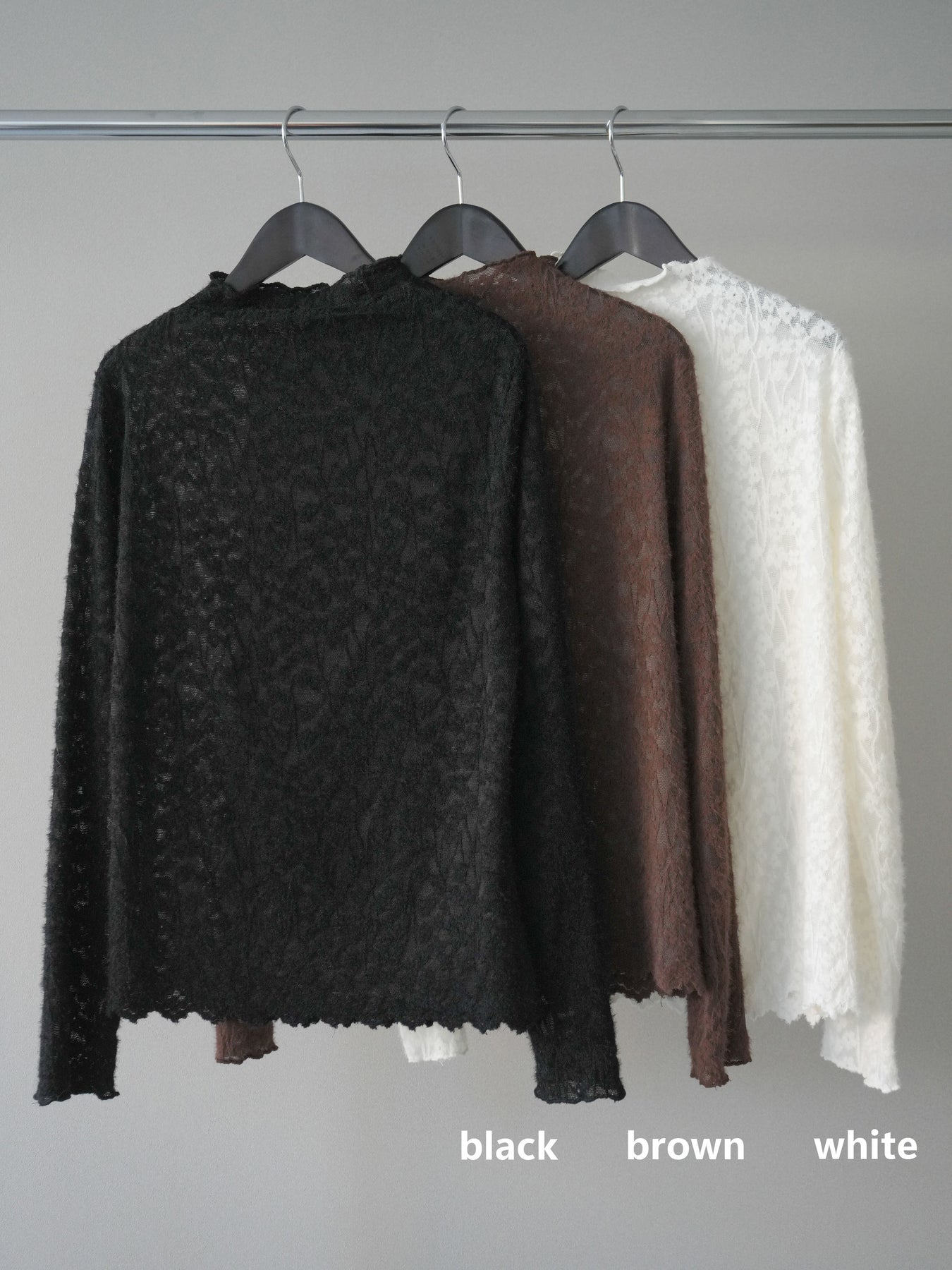 繊細なレースに起毛加工を施した、シーズンライクなプチネックトップス。 程よい透け感と柔らかな起毛の質感が、上品さとあたたかみを兼ね備えています。 ネックと裾、袖口のメローデザインがさりげないアクセントとなり、女性らしい印象に。 インナーとしてはもちろん、キャミソールやワンピースとのレイヤードにも活躍します。 1枚あると着こなしの幅が広がる、万能なレーストップスです。 ※ボトムス、キャミソール(インナー)以外の商品は一律でインナーは付属していません。