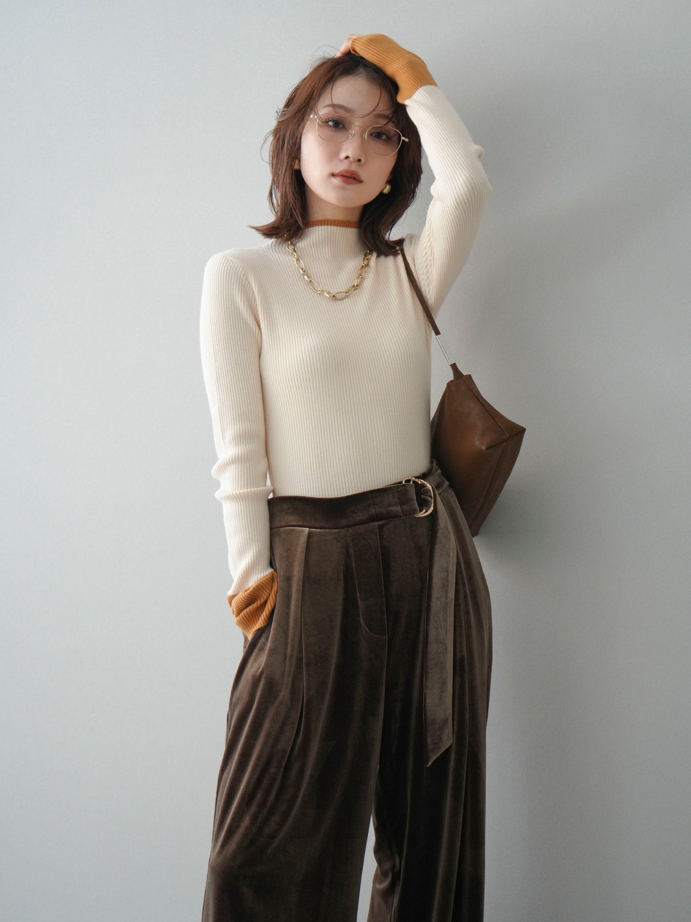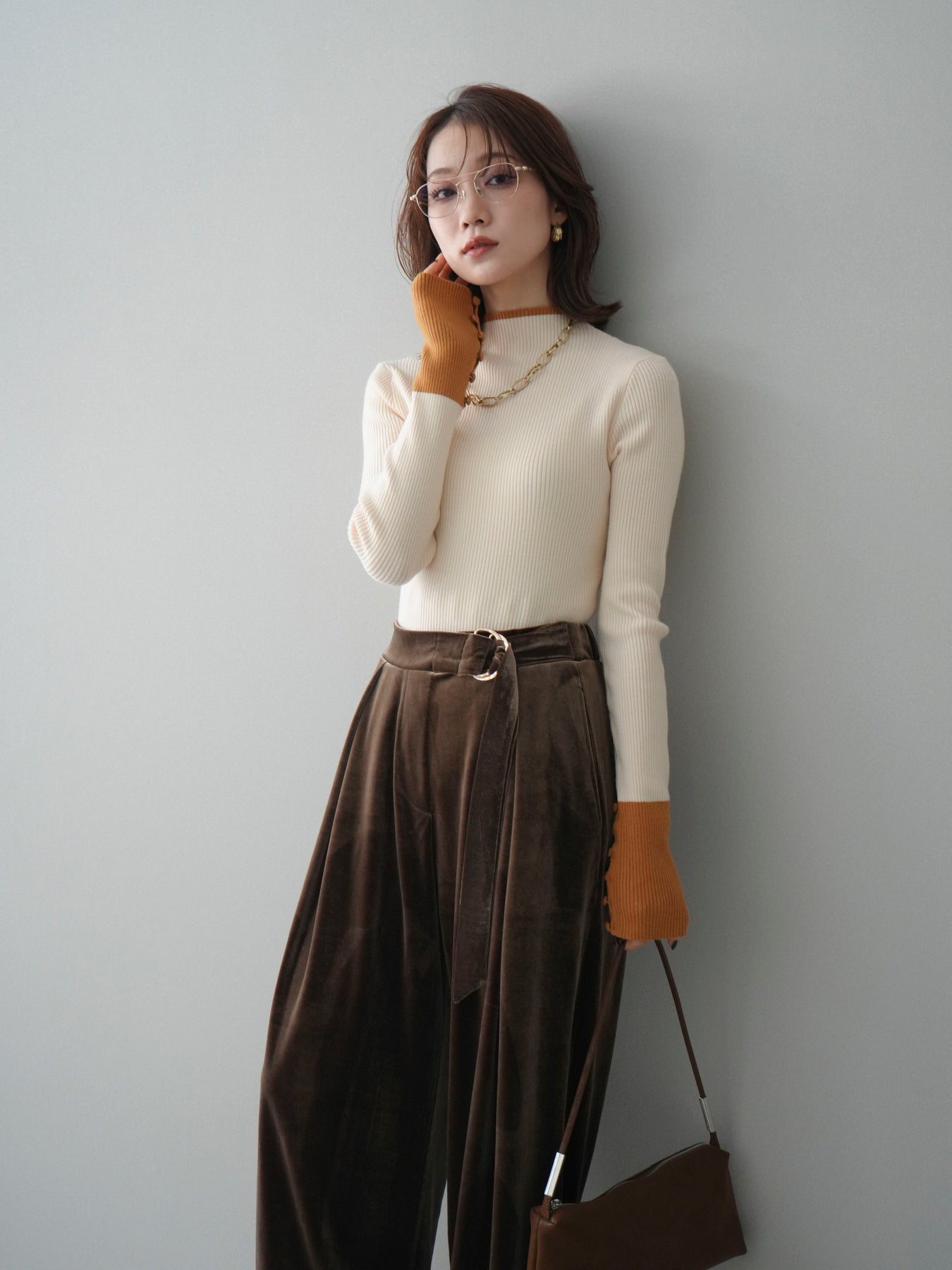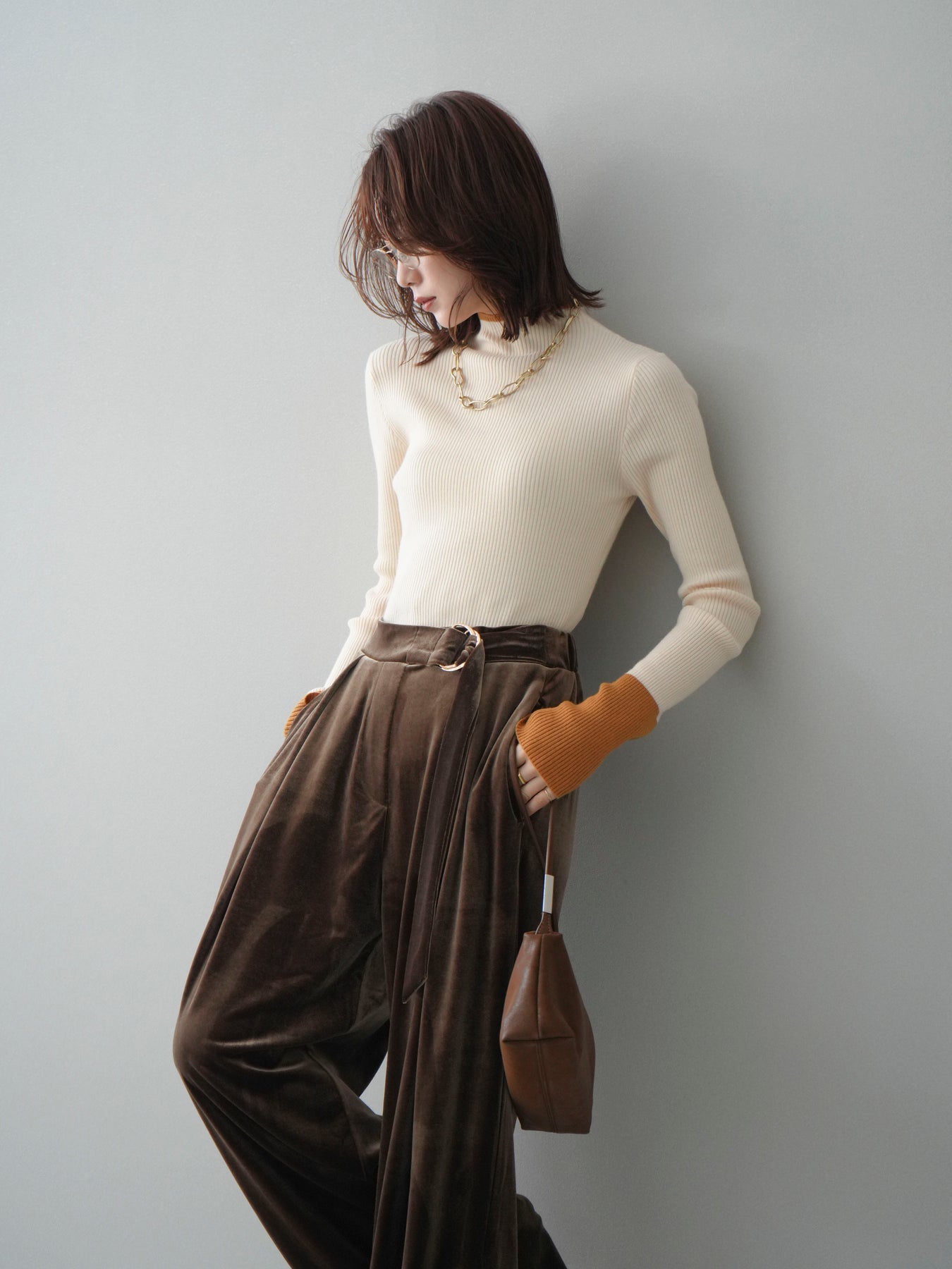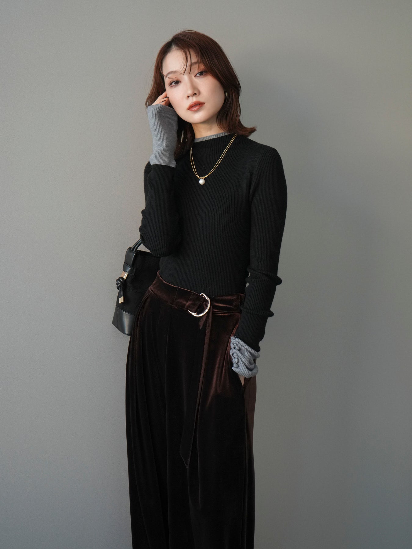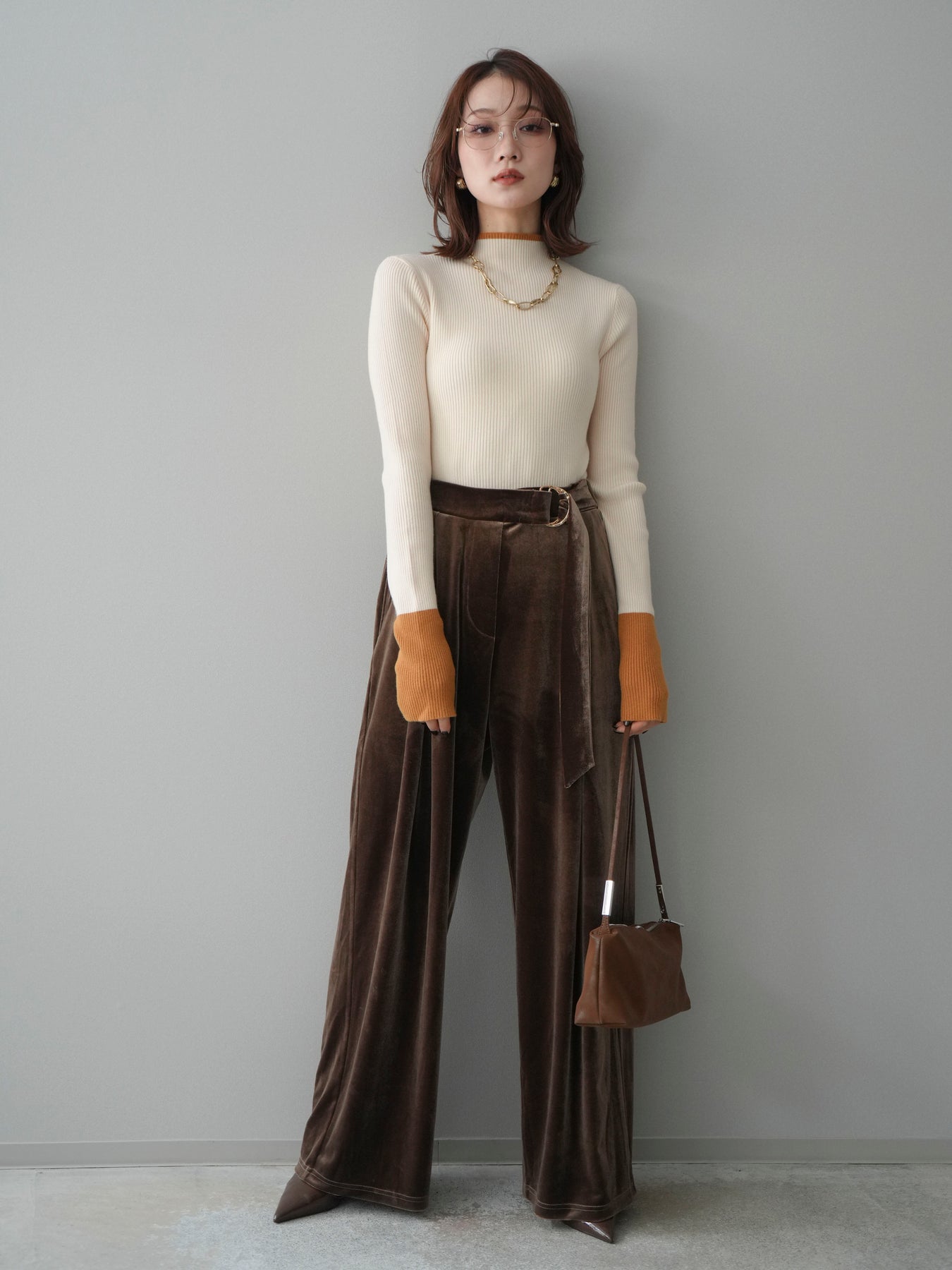 [SET]袖ボタンハイネック配色リブニットトップス+ベロアベルトスリムパンツ(2set)