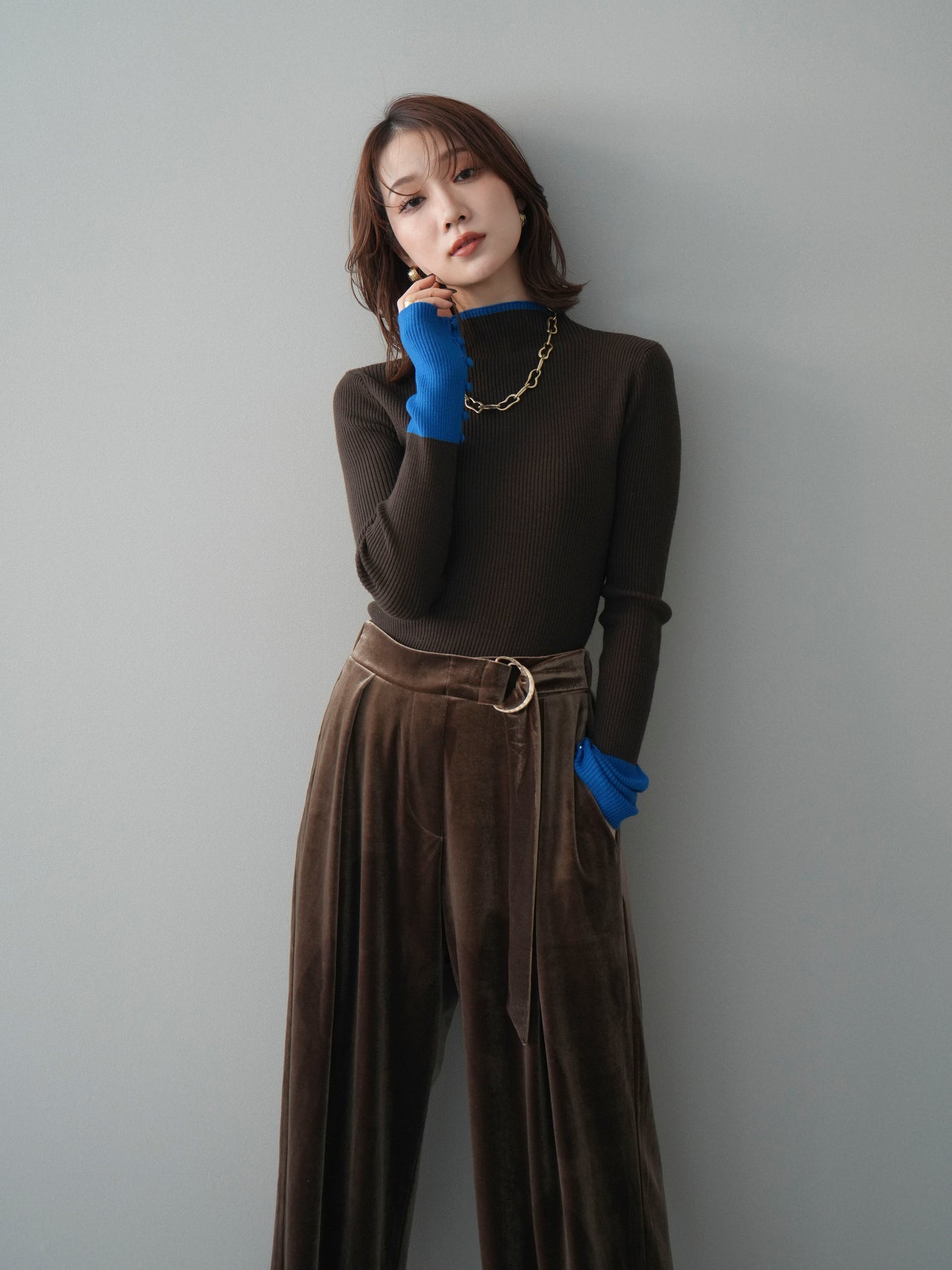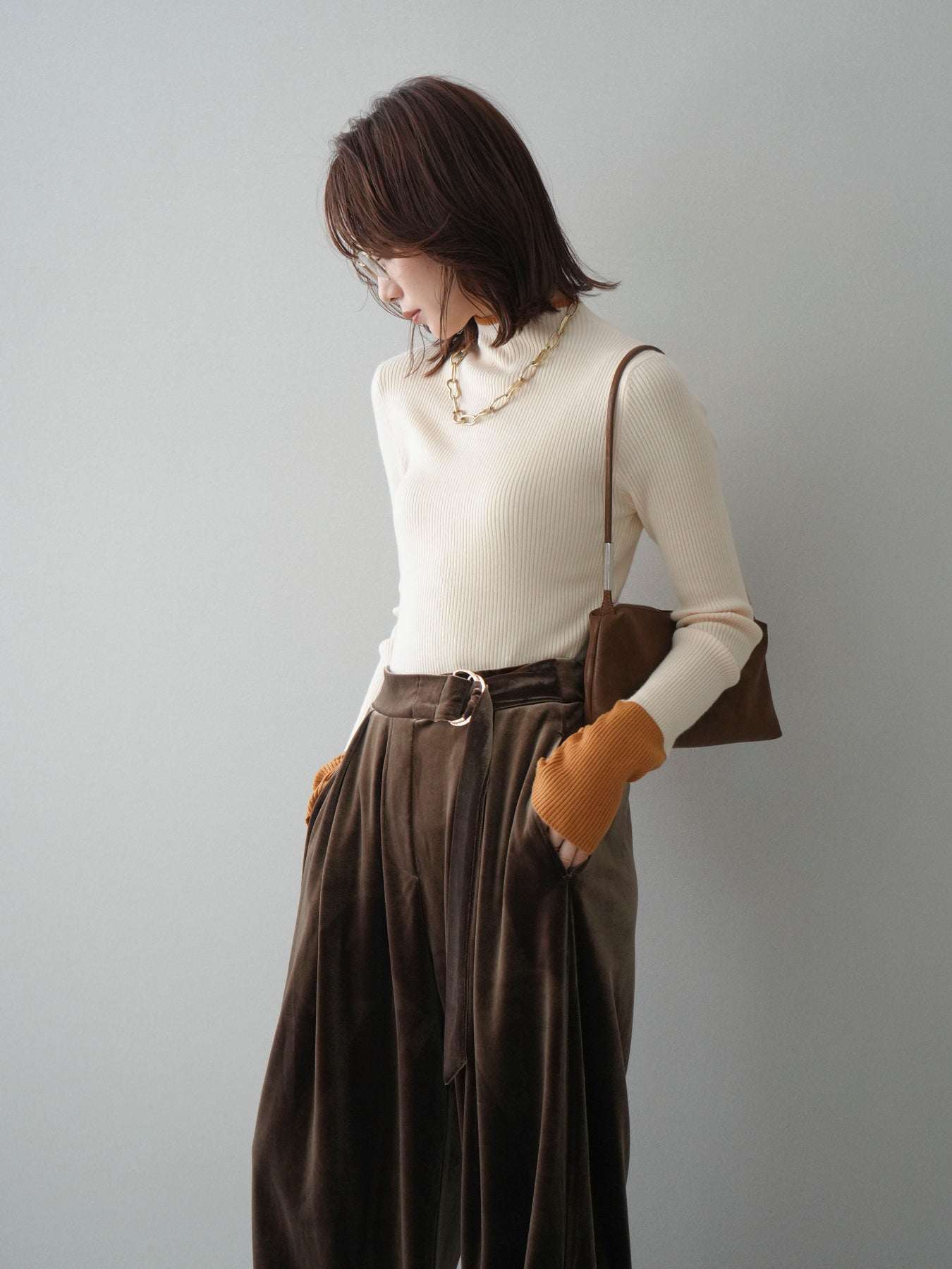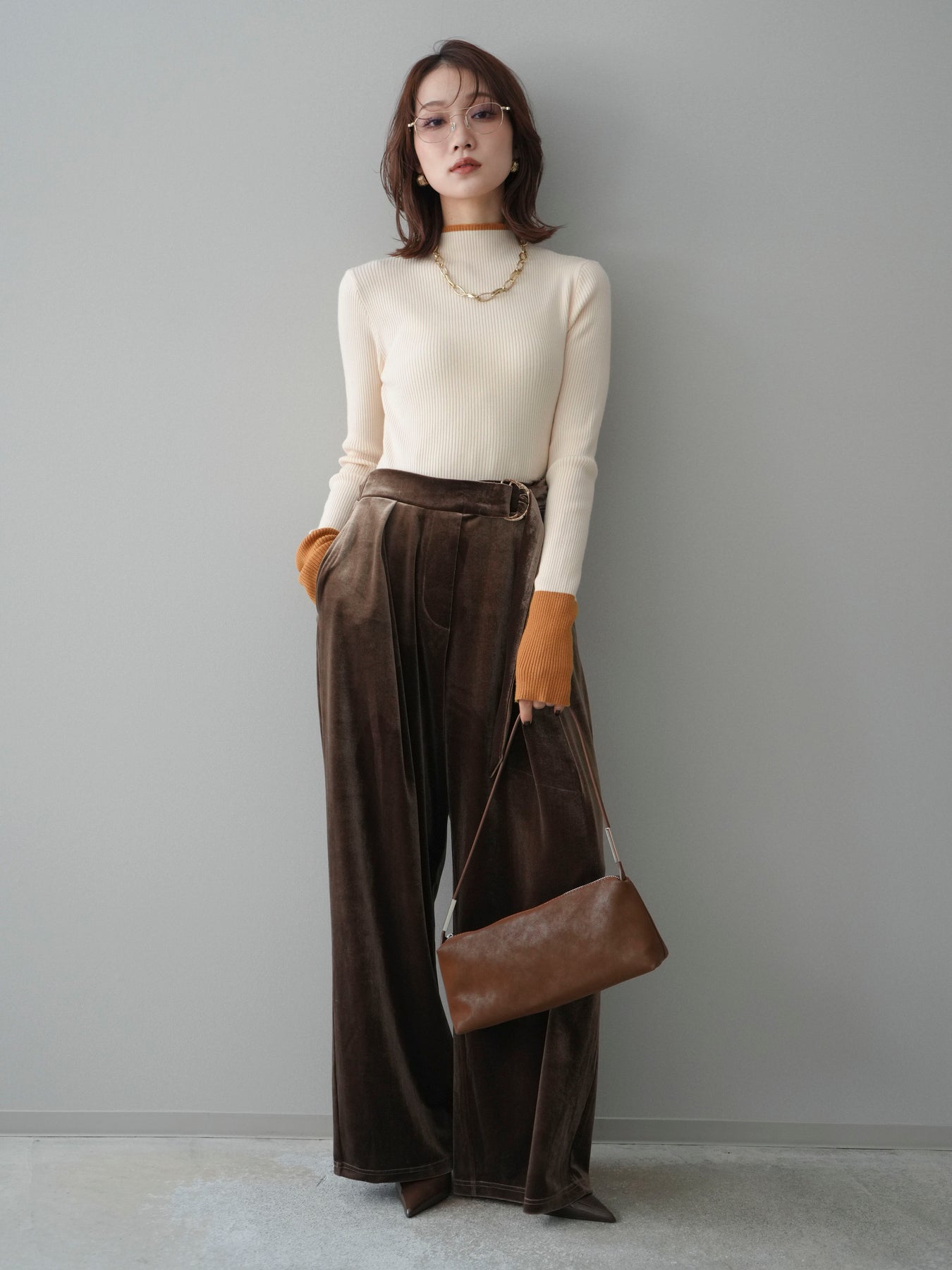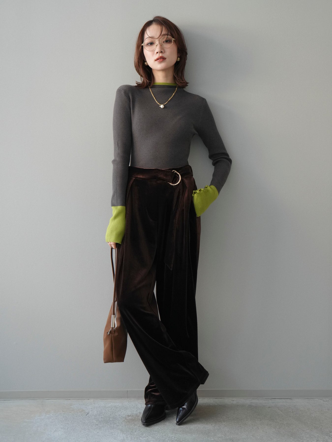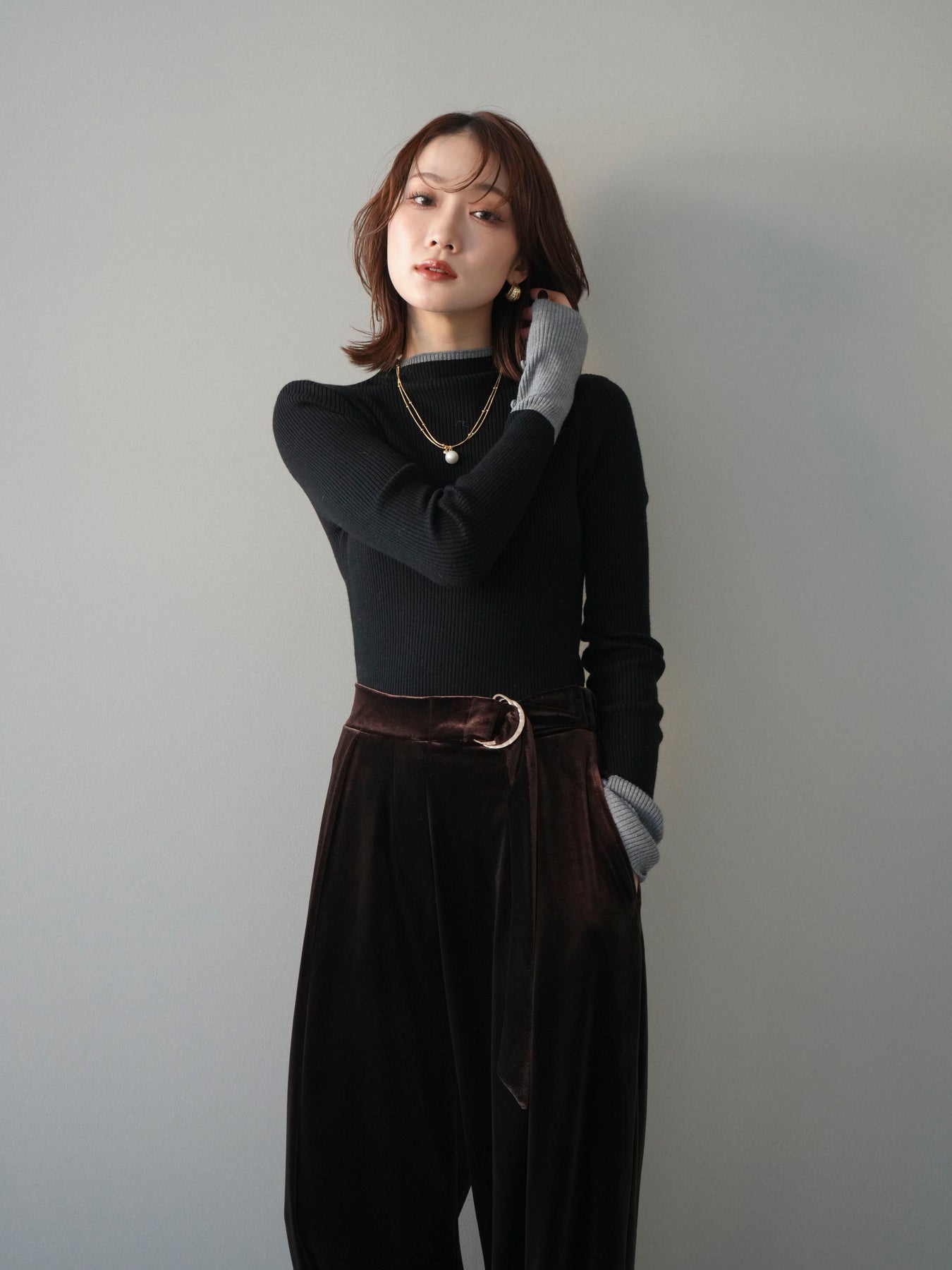 [SET]袖ボタンハイネック配色リブニットトップス+ベロアベルトスリムパンツ(2set)