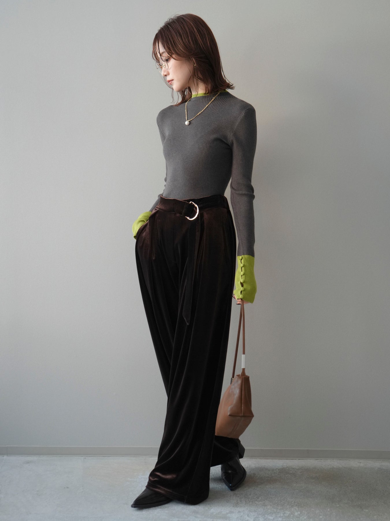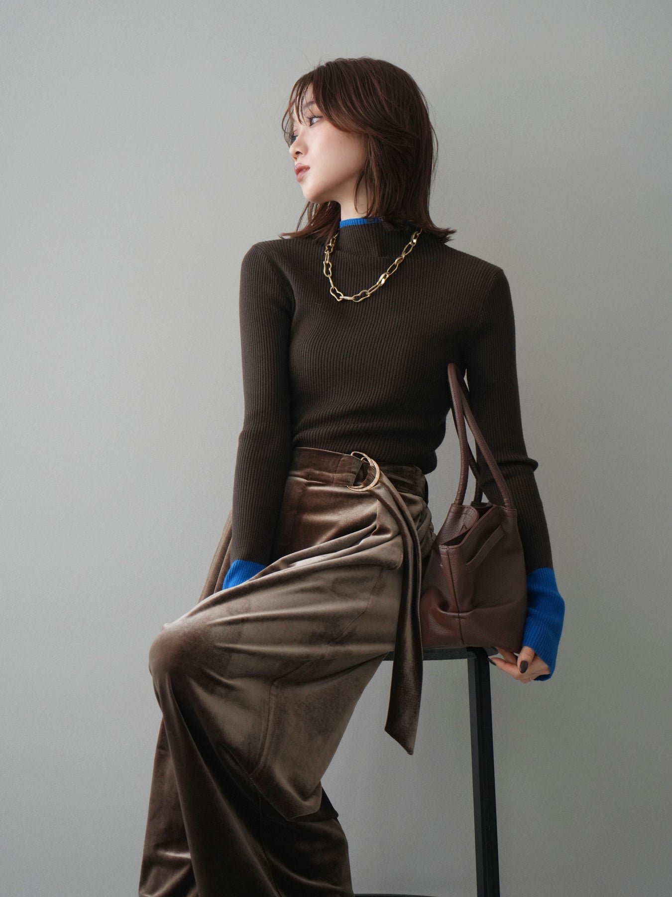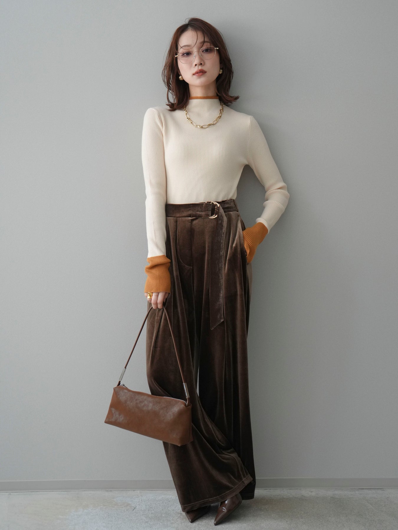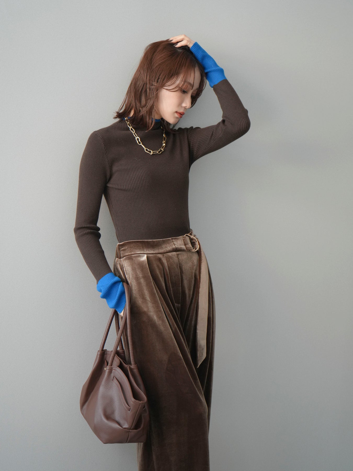 [SET]袖ボタンハイネック配色リブニットトップス+ベロアベルトスリムパンツ(2set)