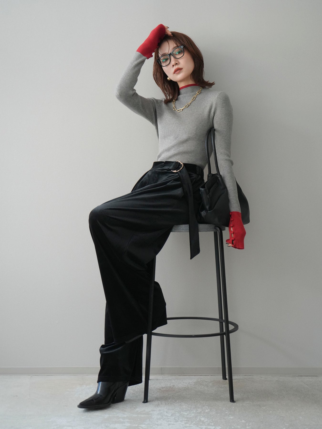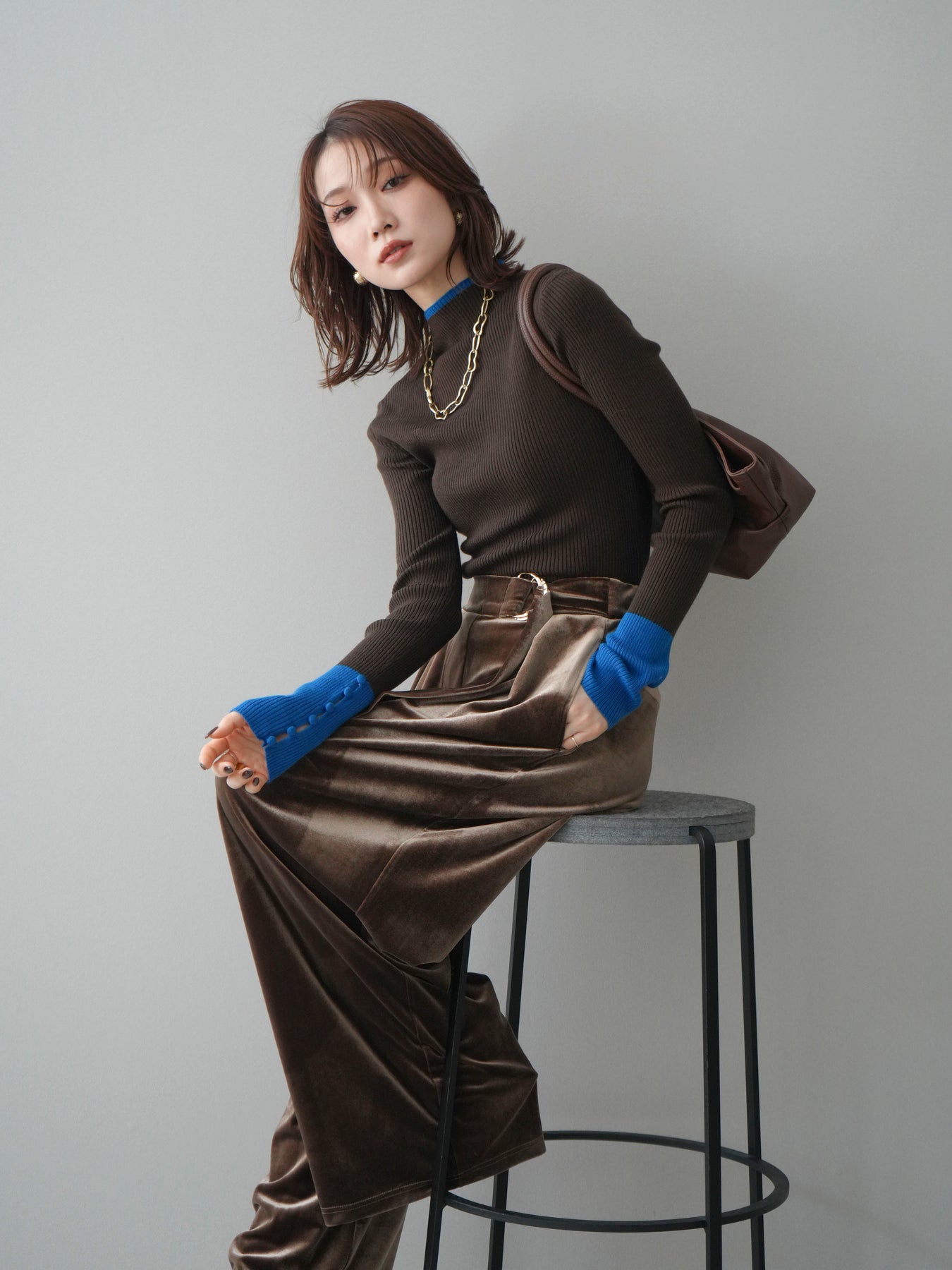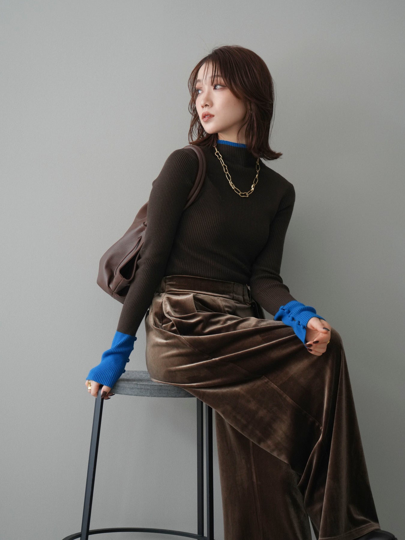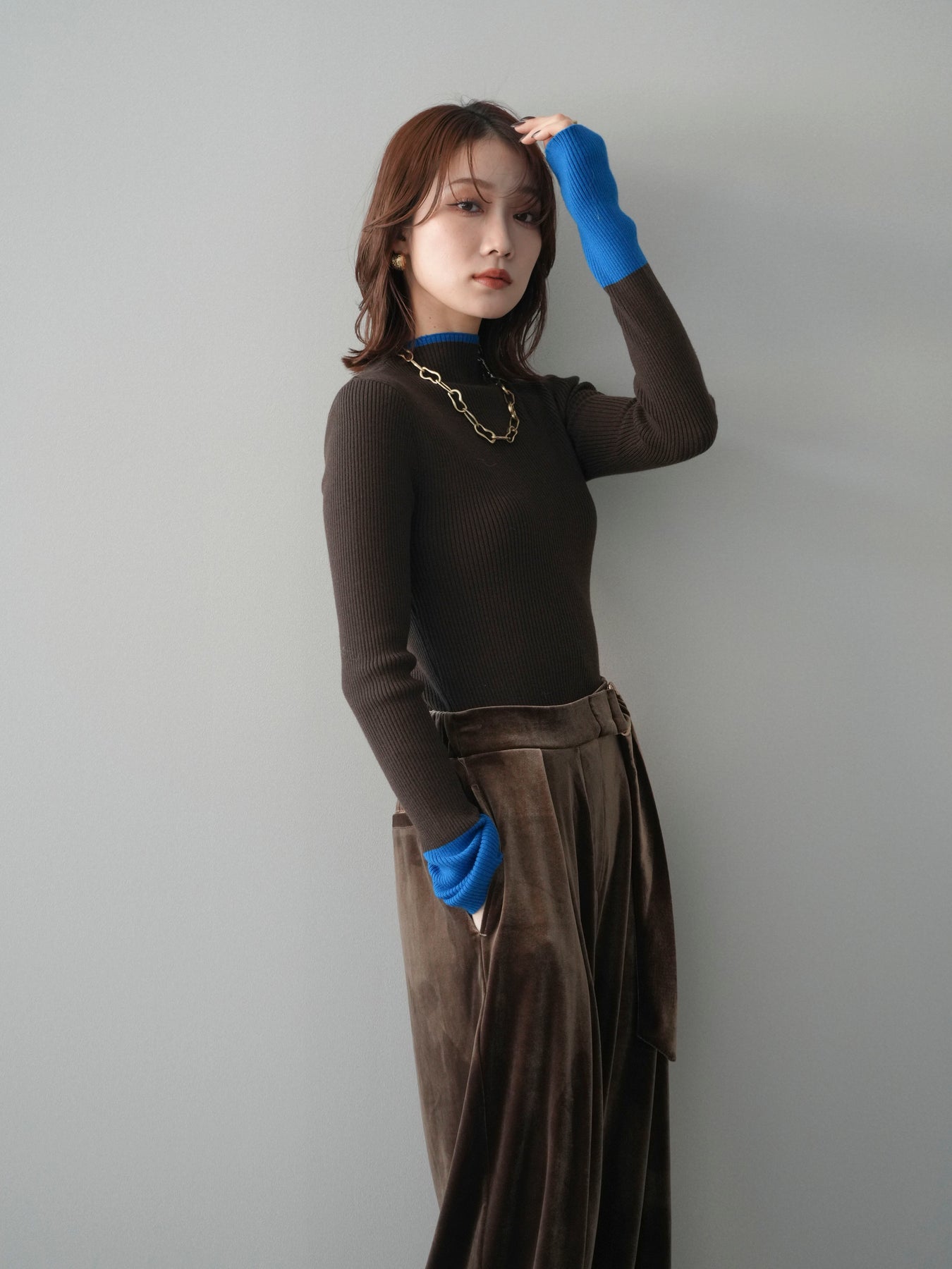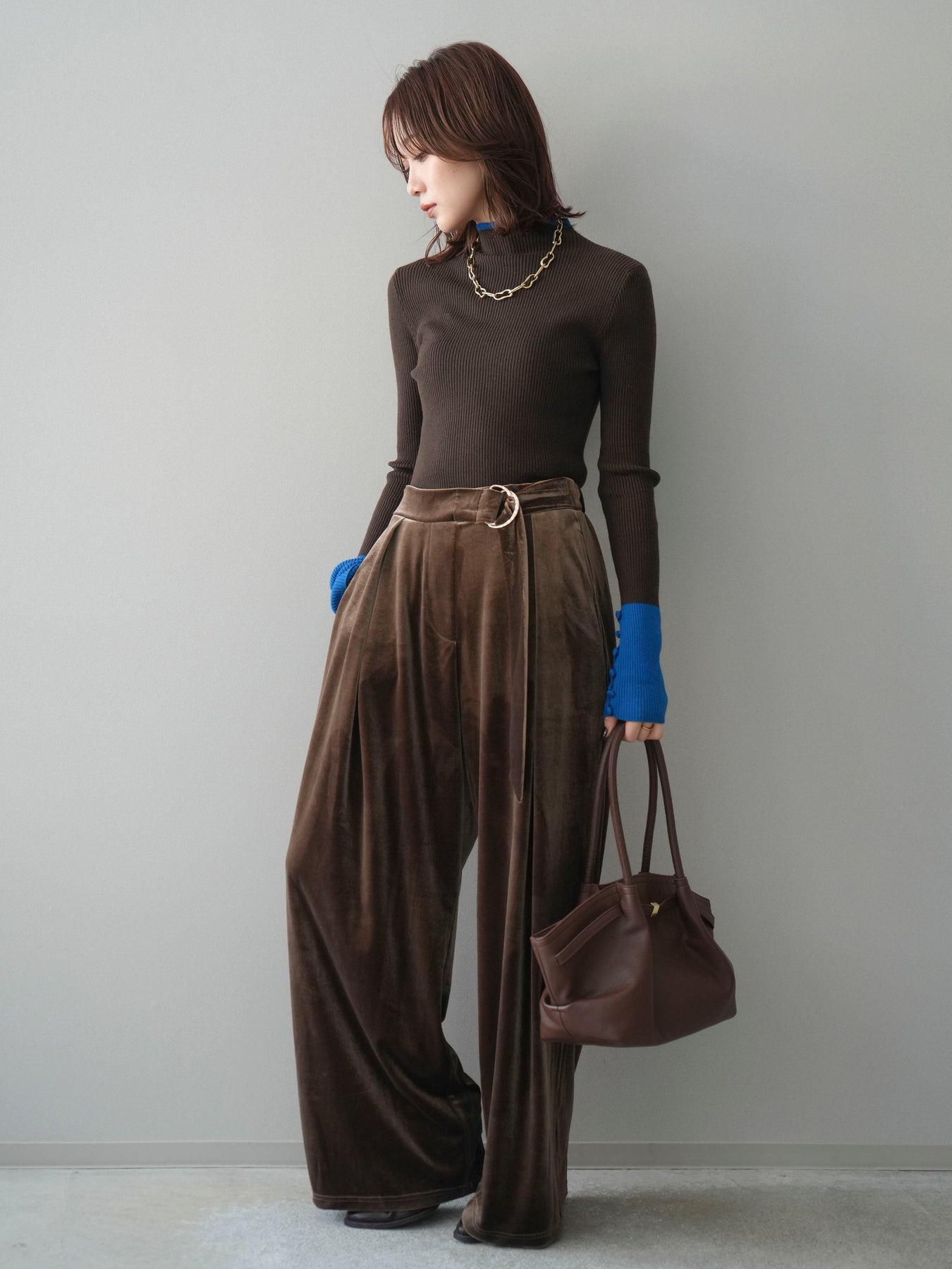 [SET]袖ボタンハイネック配色リブニットトップス+ベロアベルトスリムパンツ(2set)