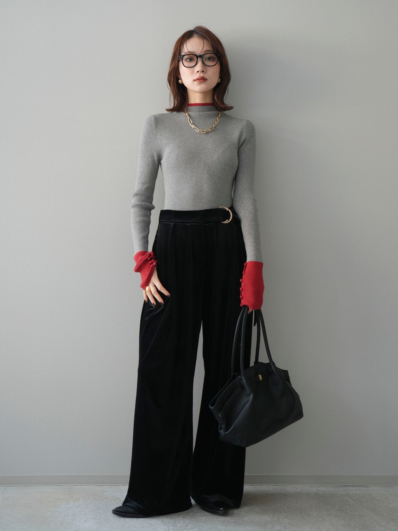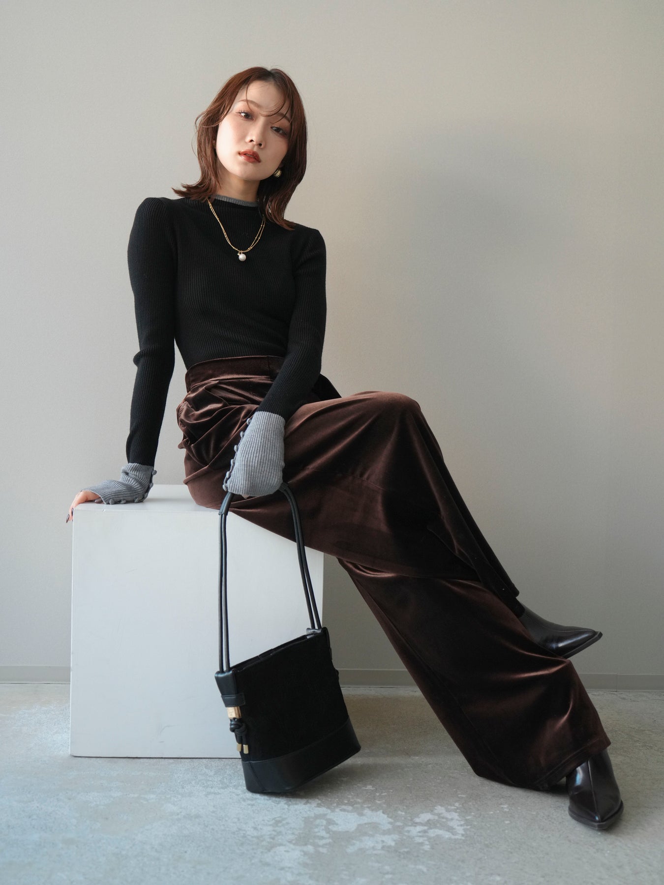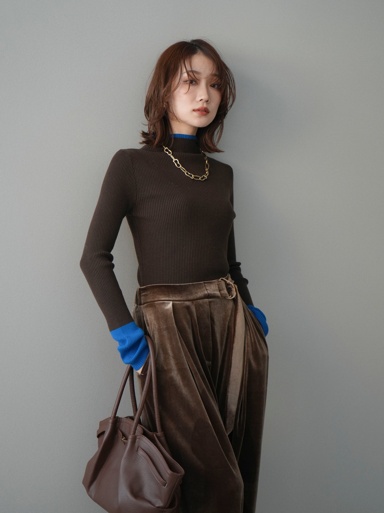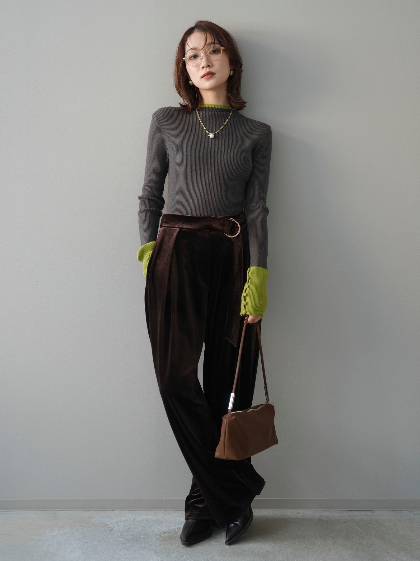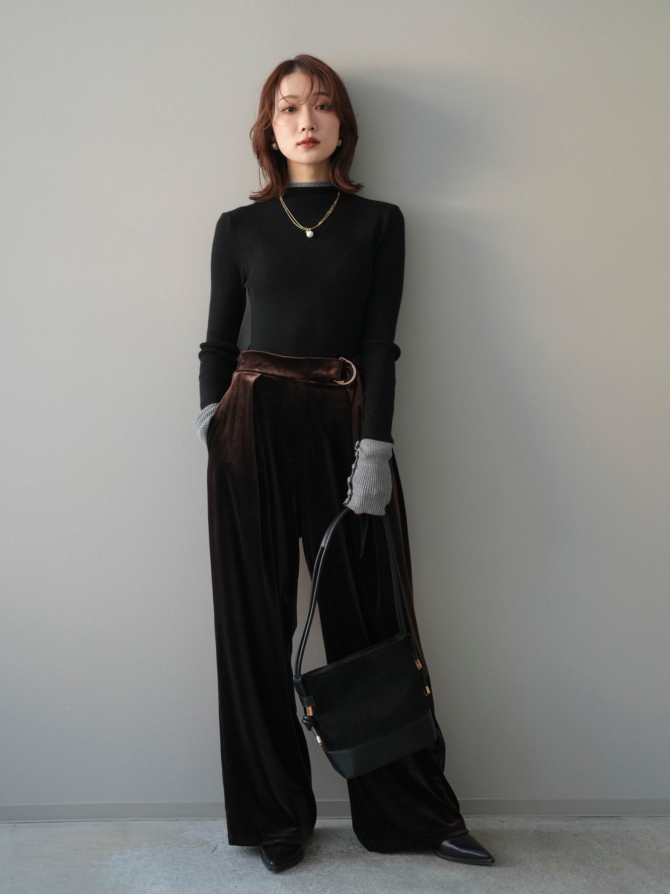 [SET]袖ボタンハイネック配色リブニットトップス+ベロアベルトスリムパンツ(2set)