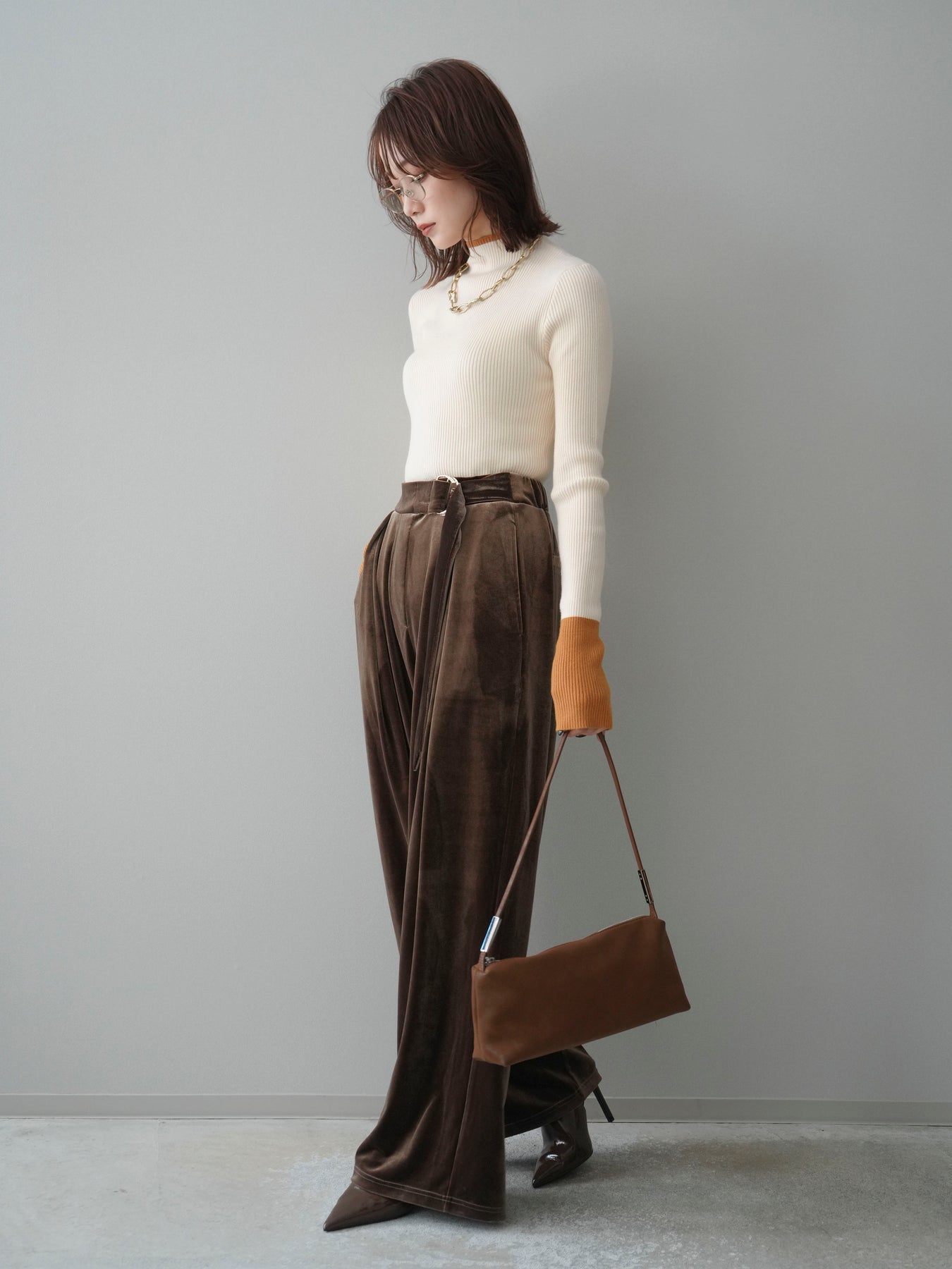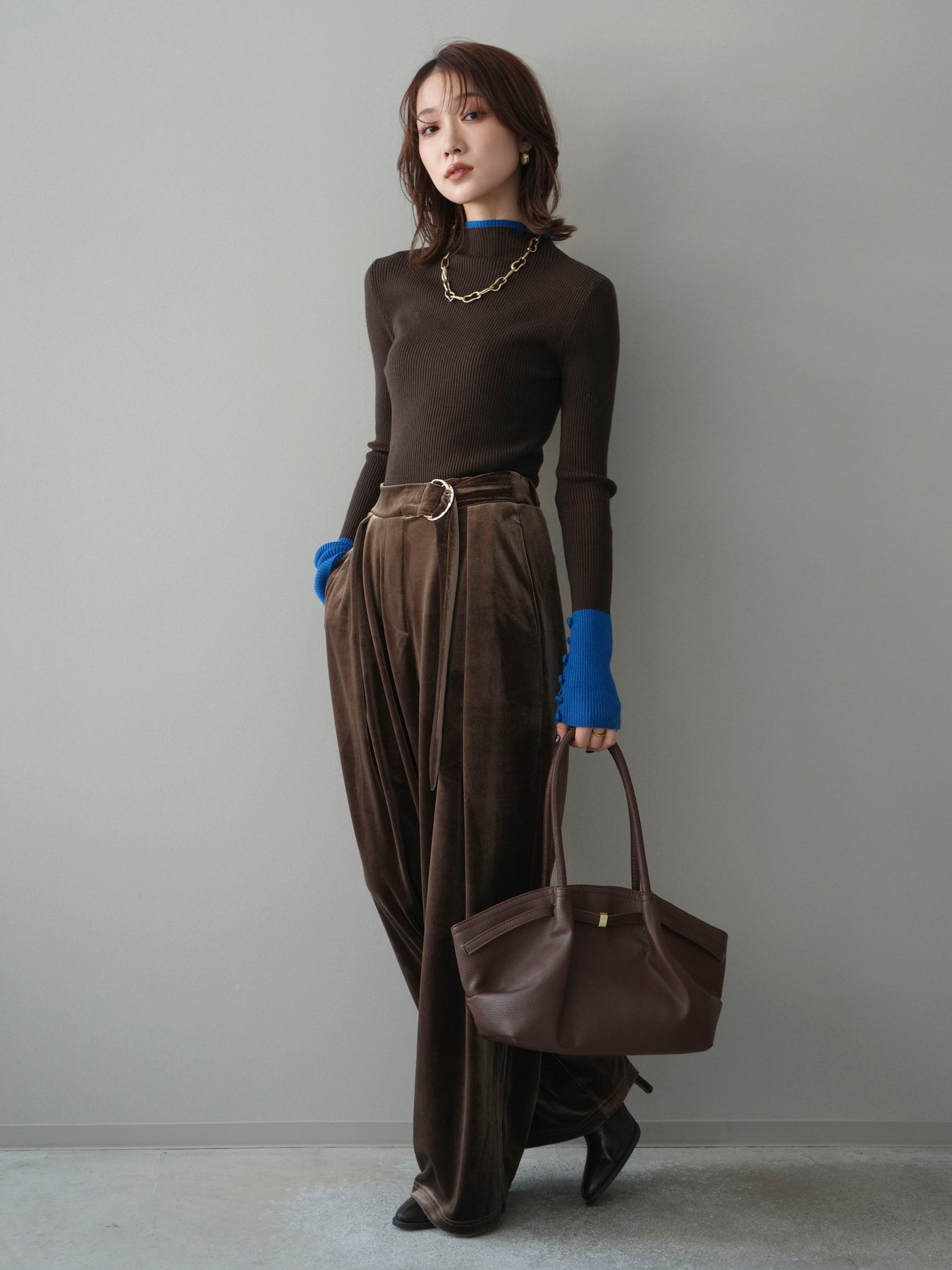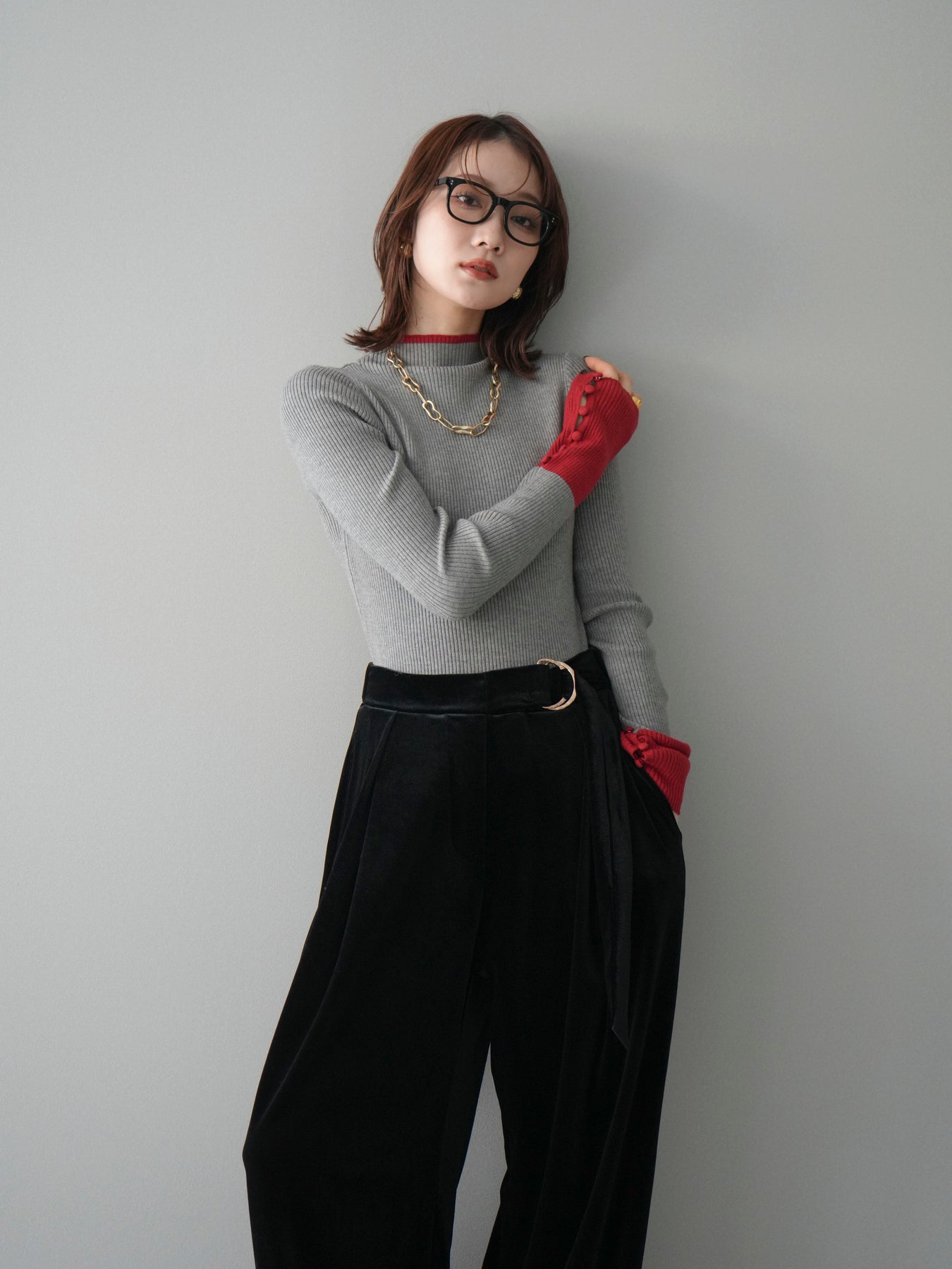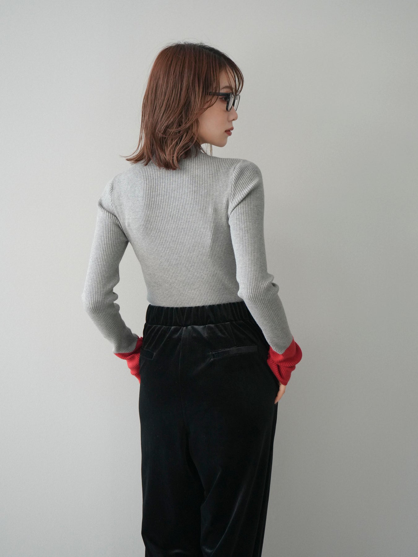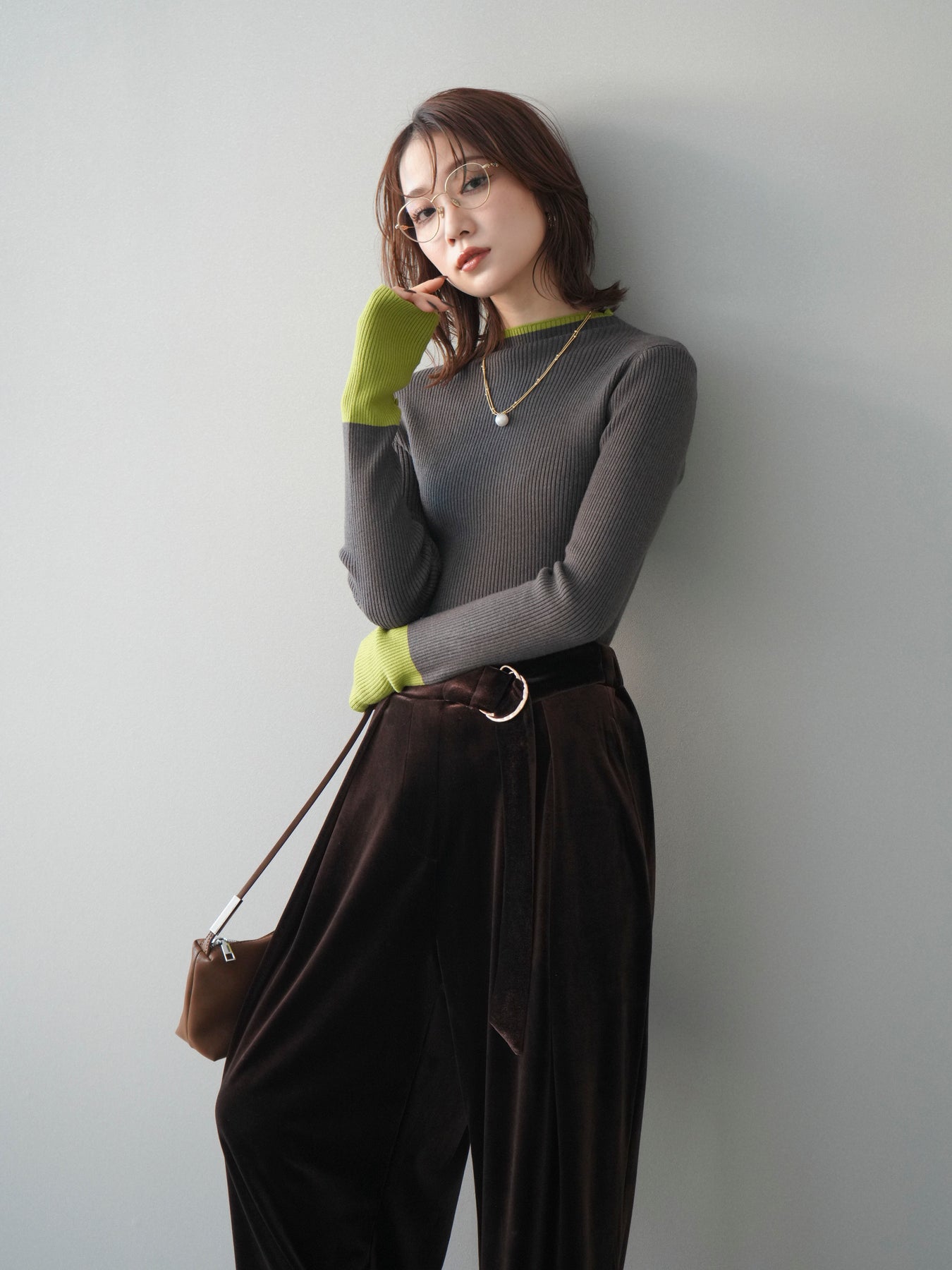 [SET]袖ボタンハイネック配色リブニットトップス+ベロアベルトスリムパンツ(2set)