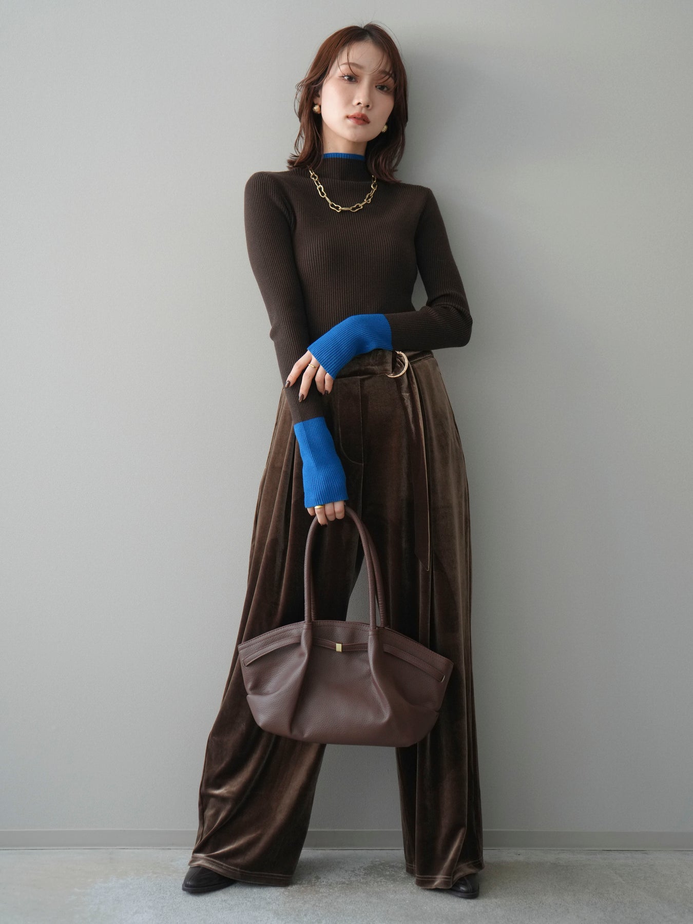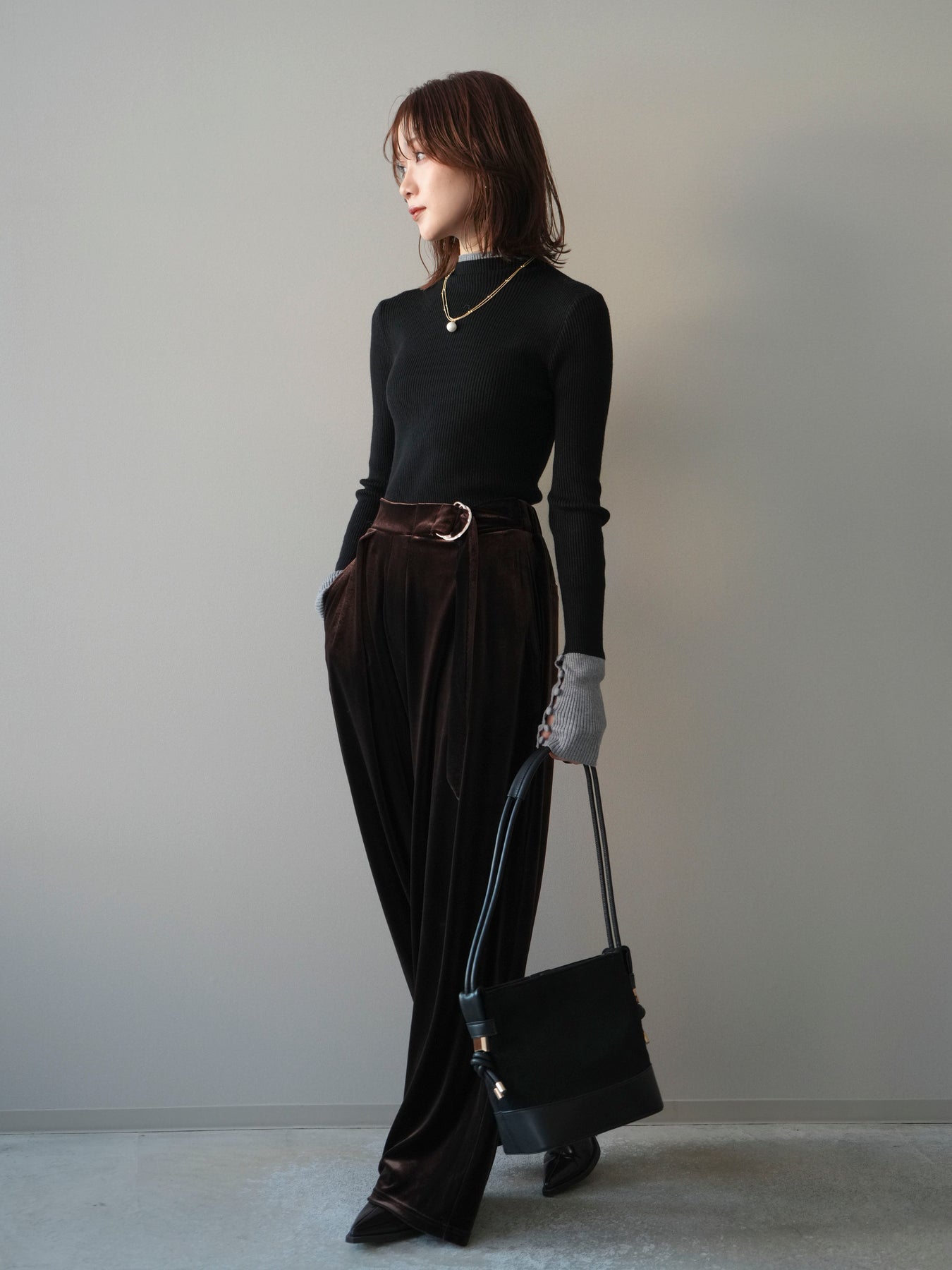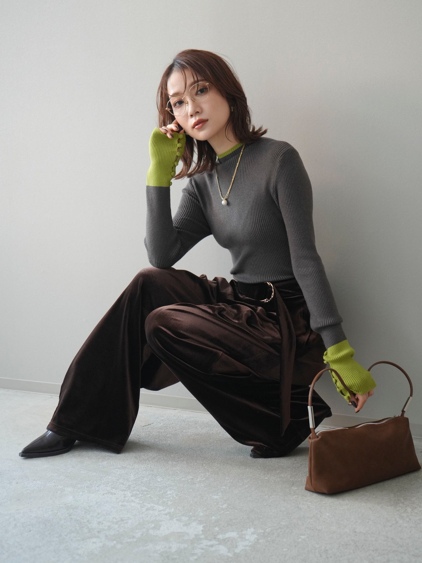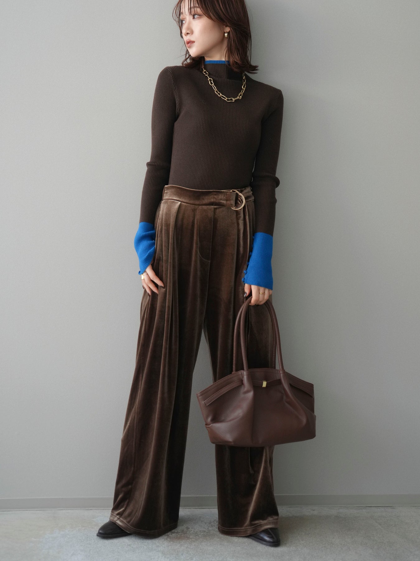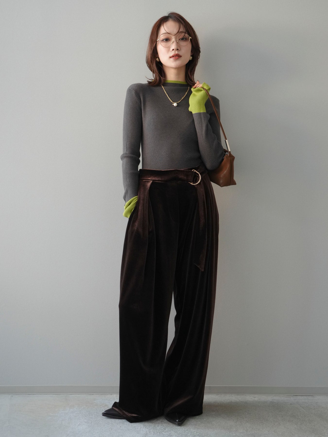 [SET]袖ボタンハイネック配色リブニットトップス+ベロアベルトスリムパンツ(2set)