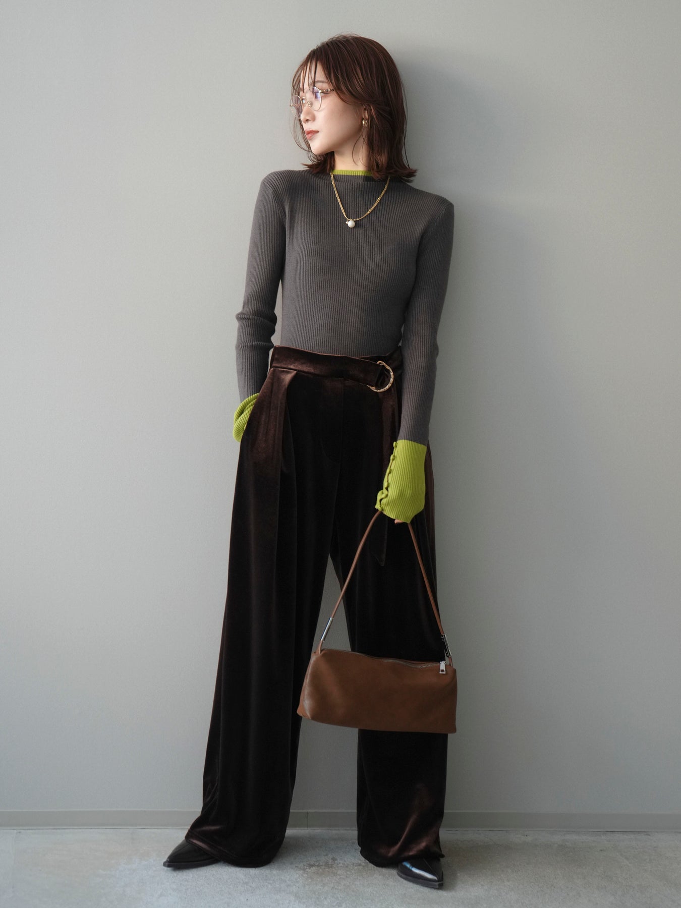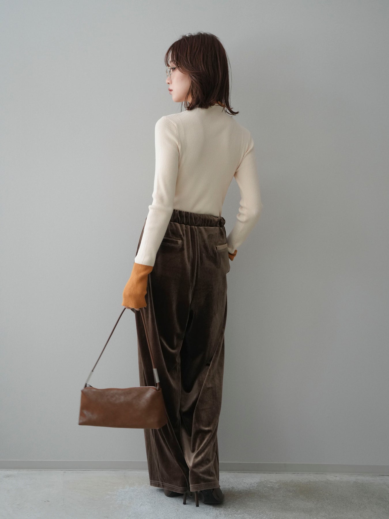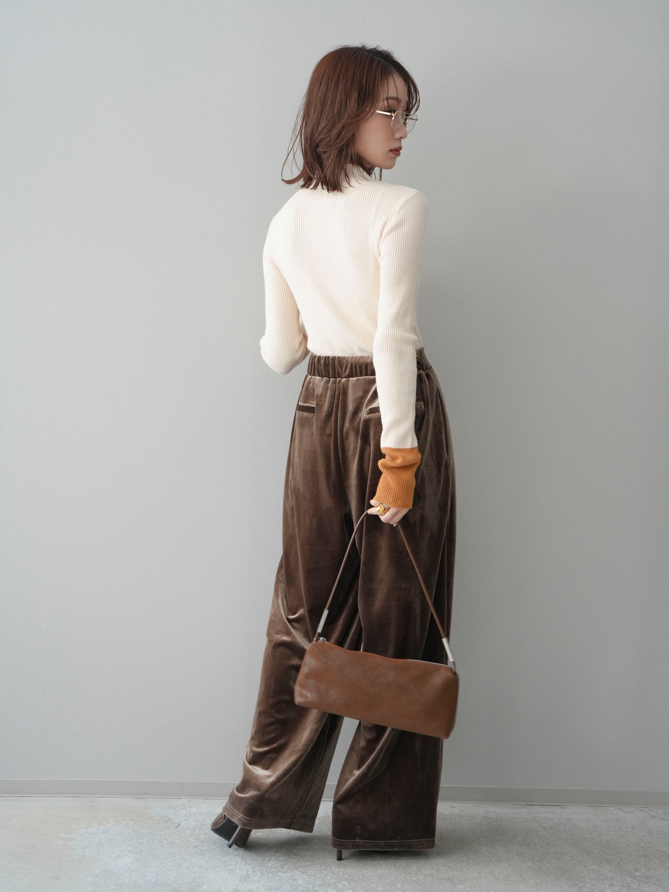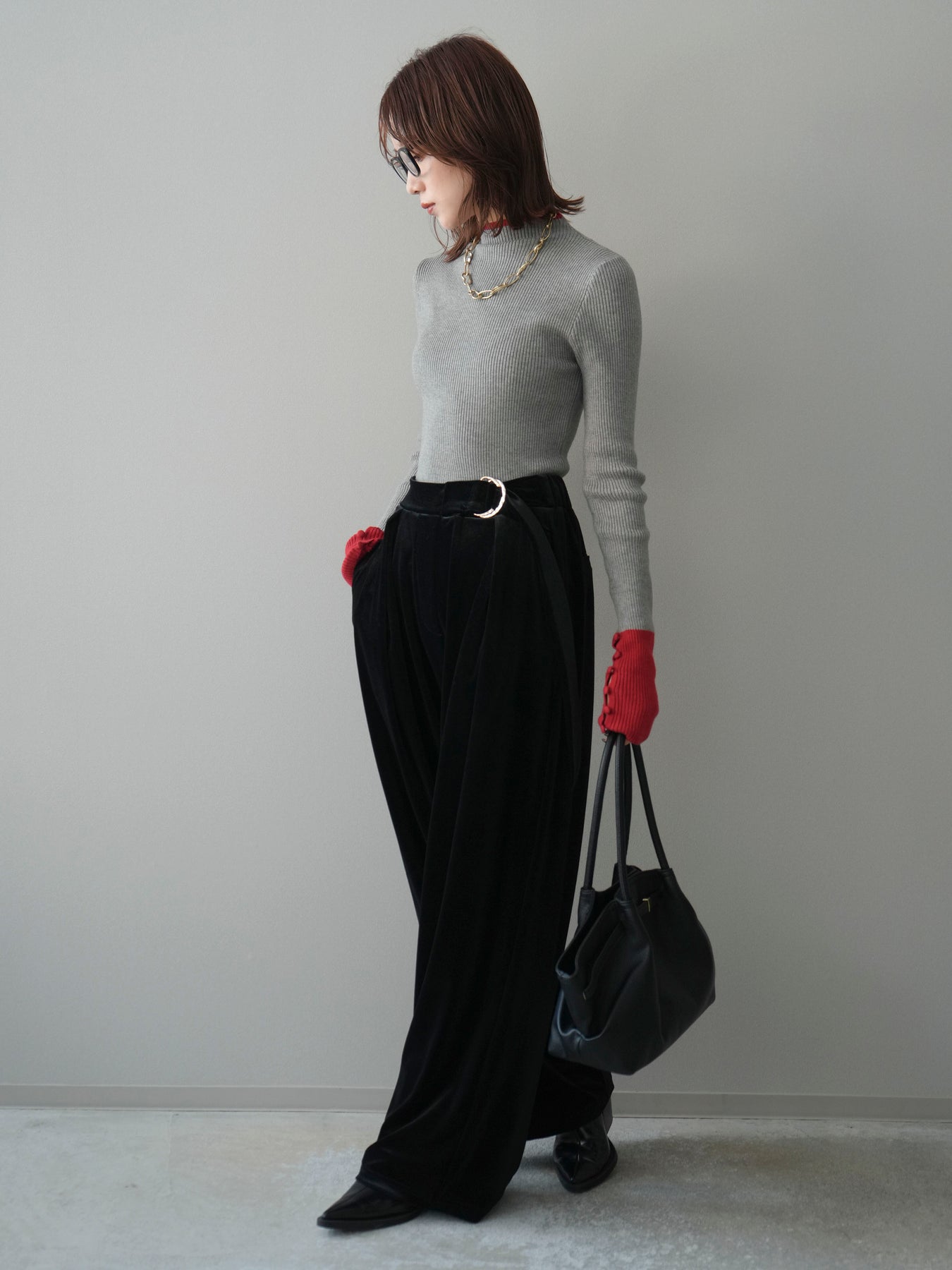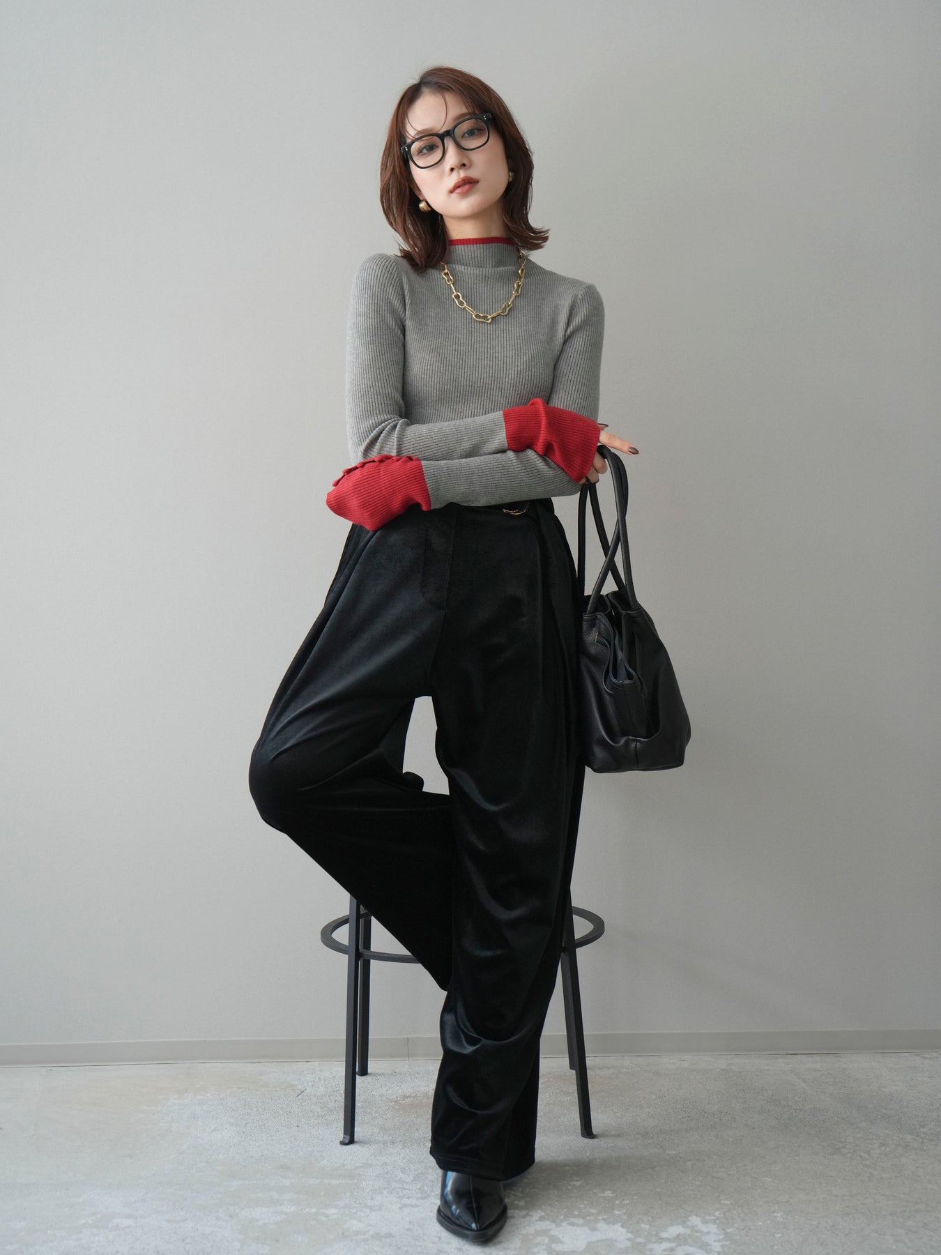 [SET]袖ボタンハイネック配色リブニットトップス+ベロアベルトスリムパンツ(2set)