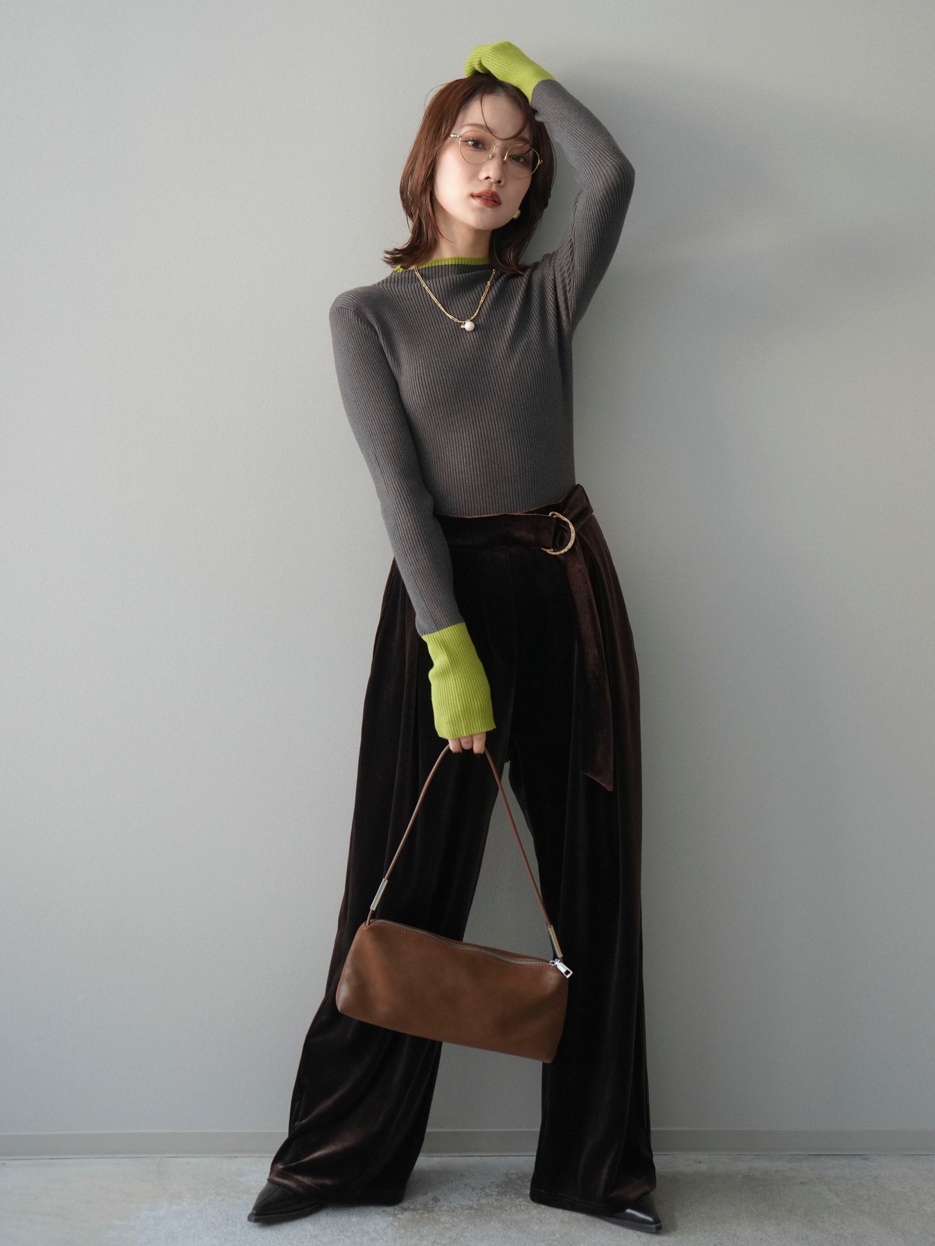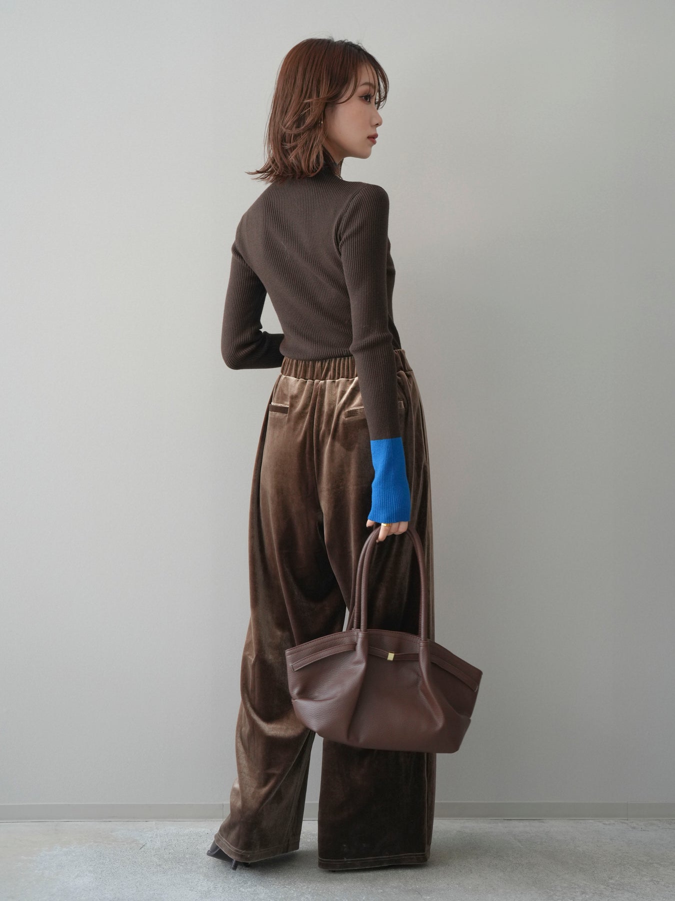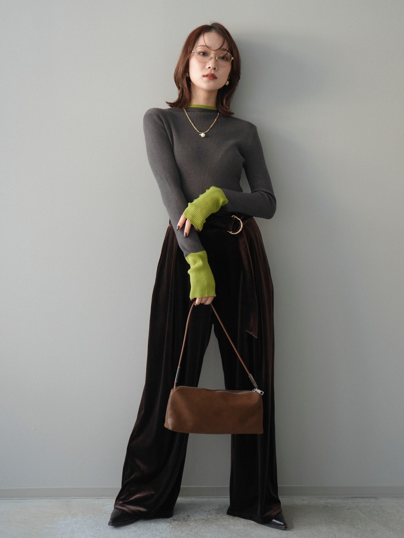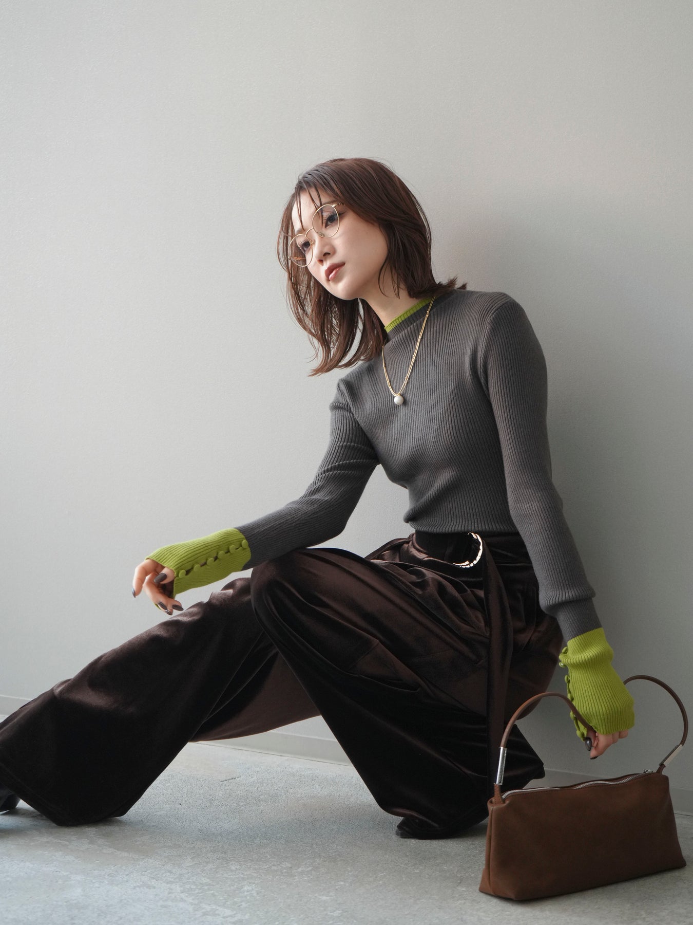 [SET]袖ボタンハイネック配色リブニットトップス+ベロアベルトスリムパンツ(2set)