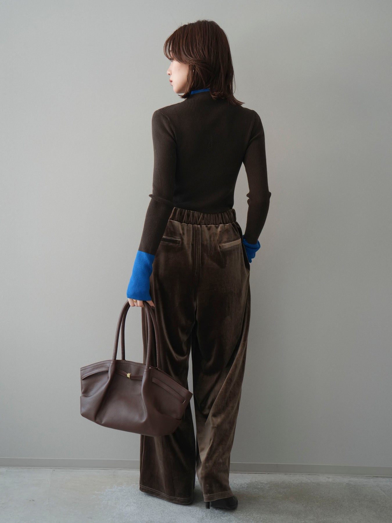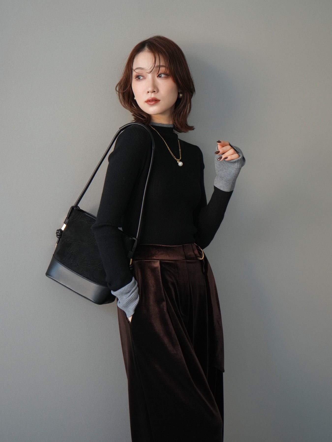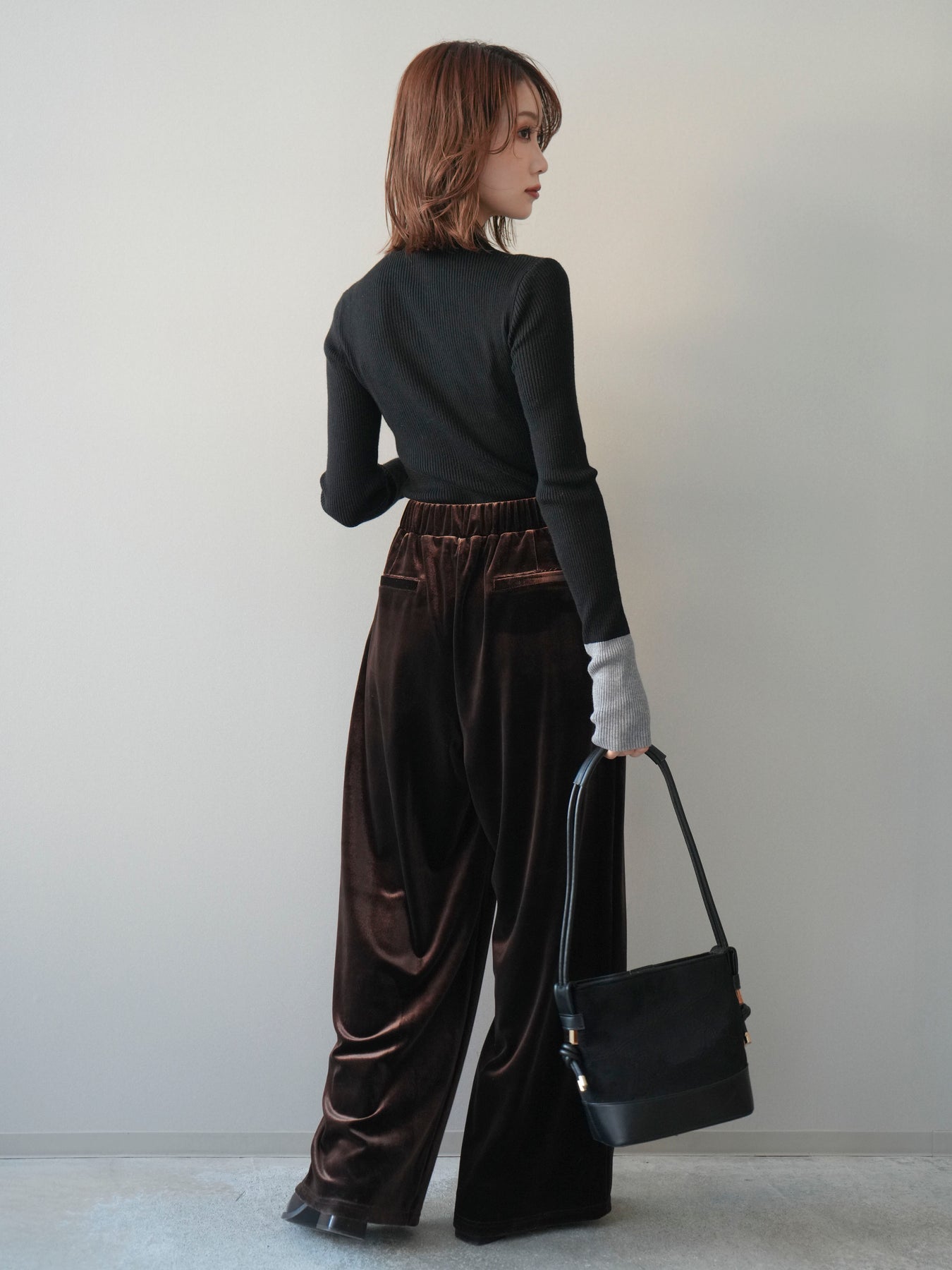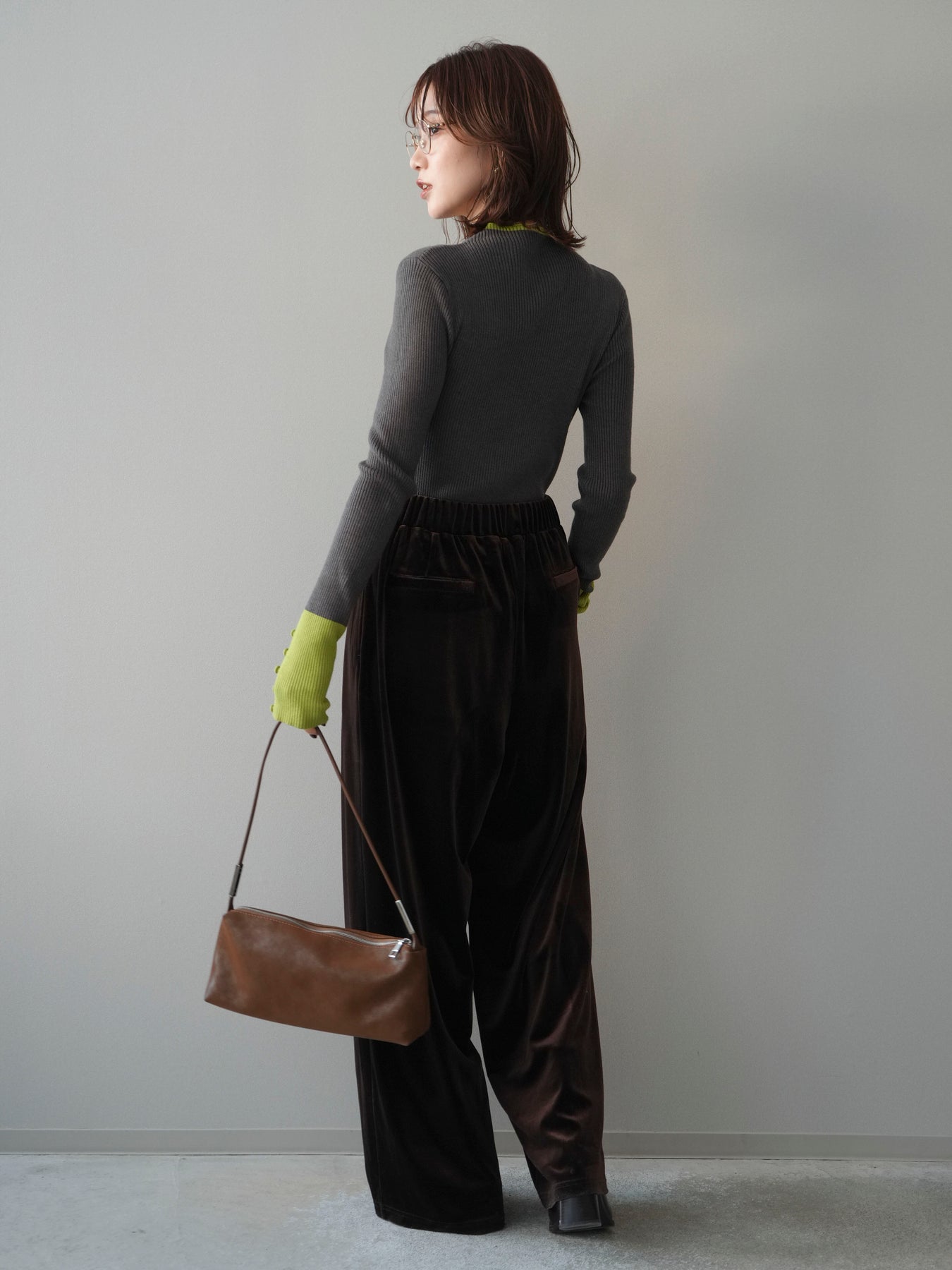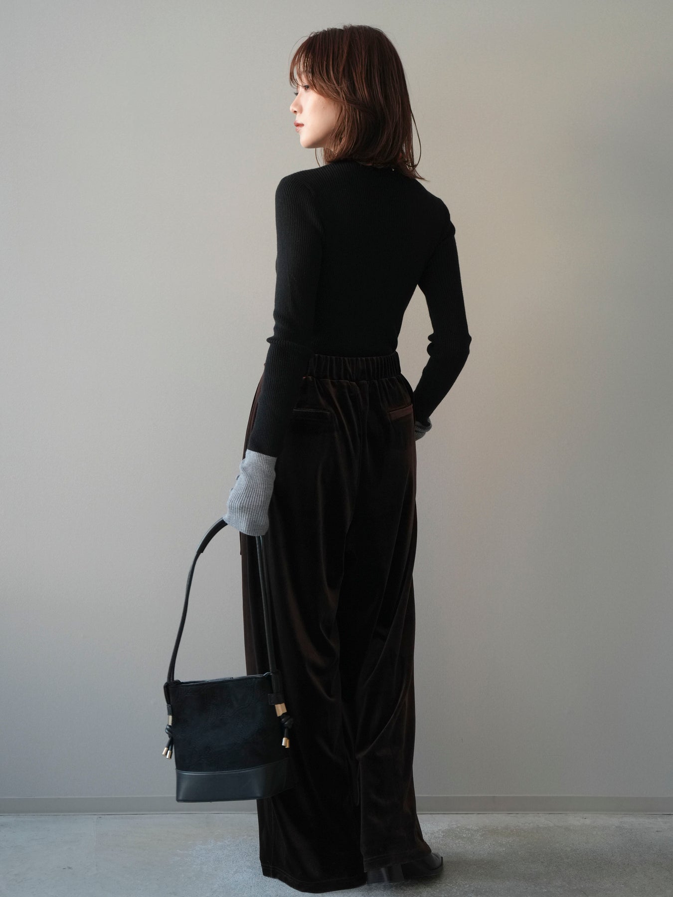 [SET]袖ボタンハイネック配色リブニットトップス+ベロアベルトスリムパンツ(2set)