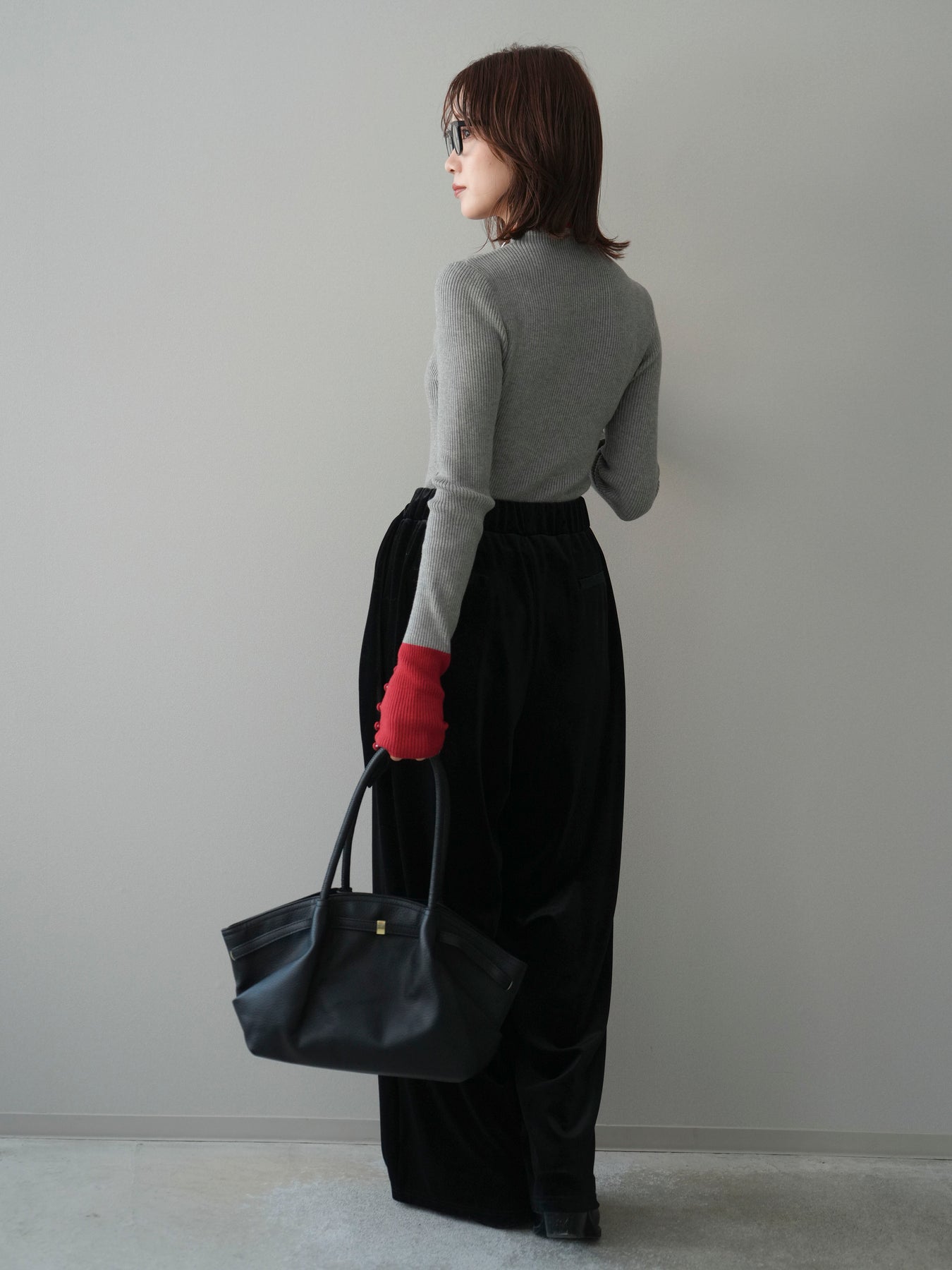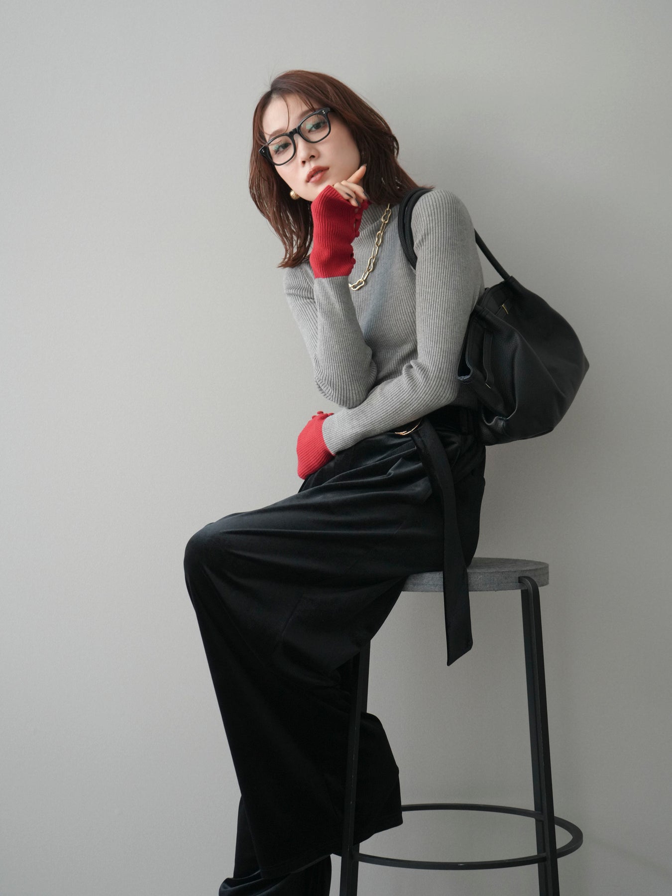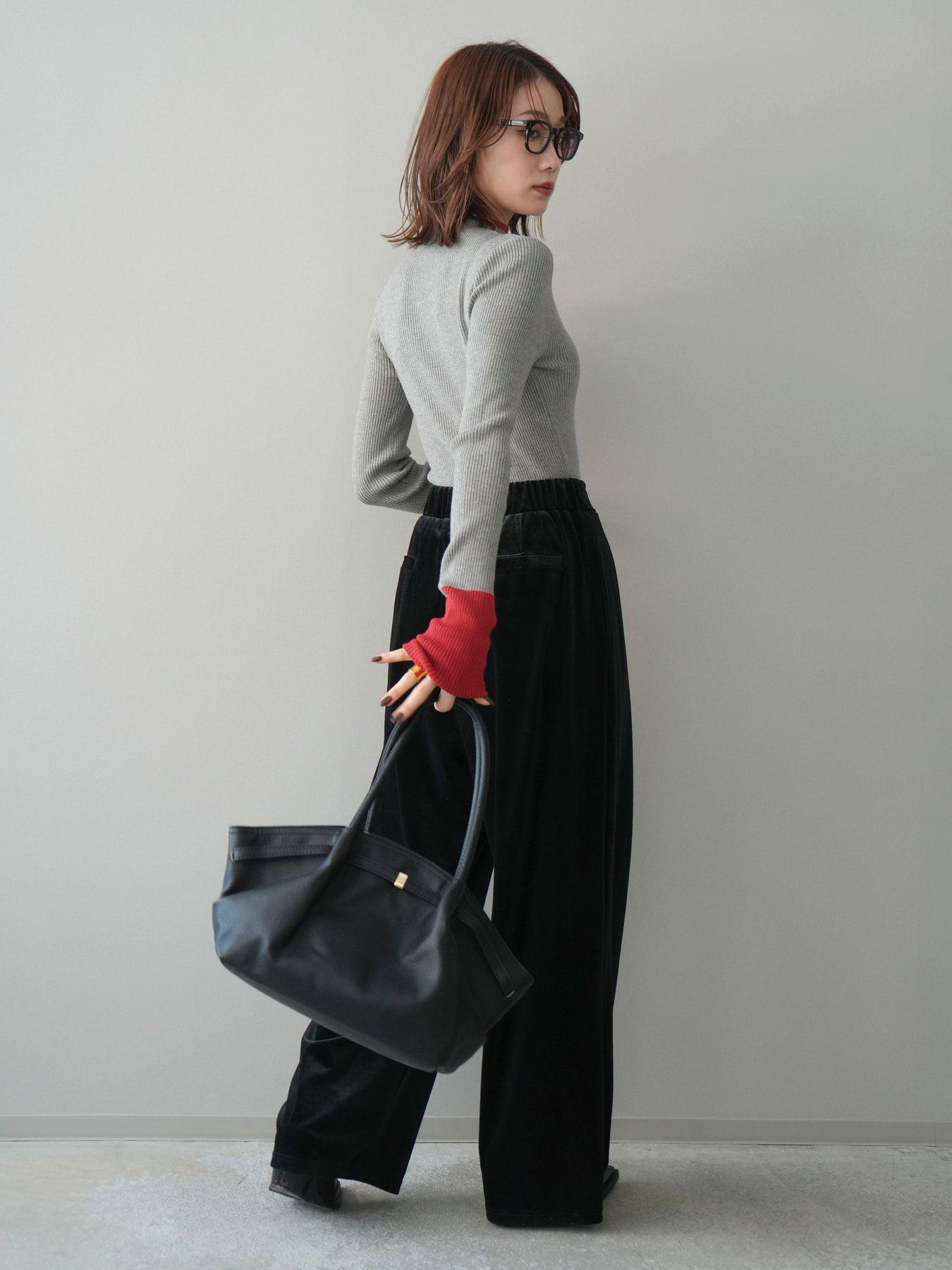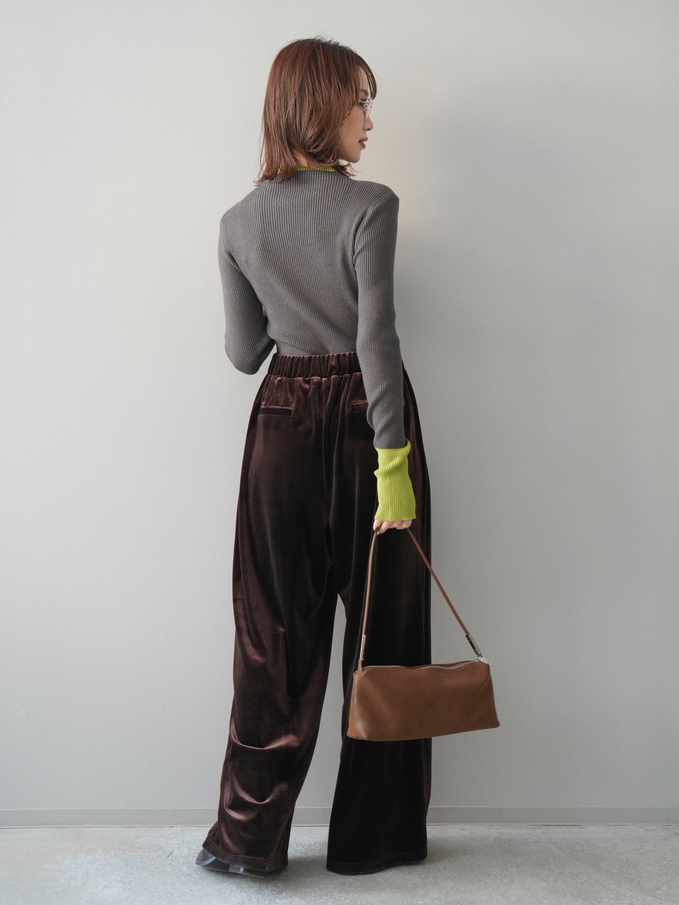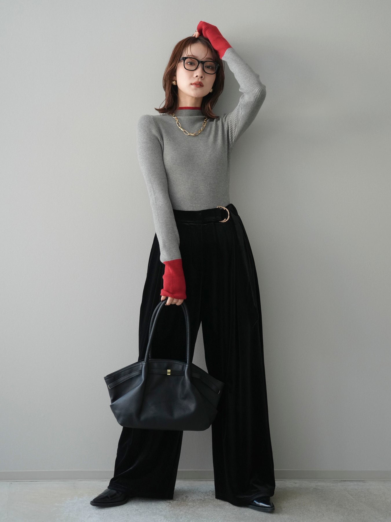 [SET]袖ボタンハイネック配色リブニットトップス+ベロアベルトスリムパンツ(2set)