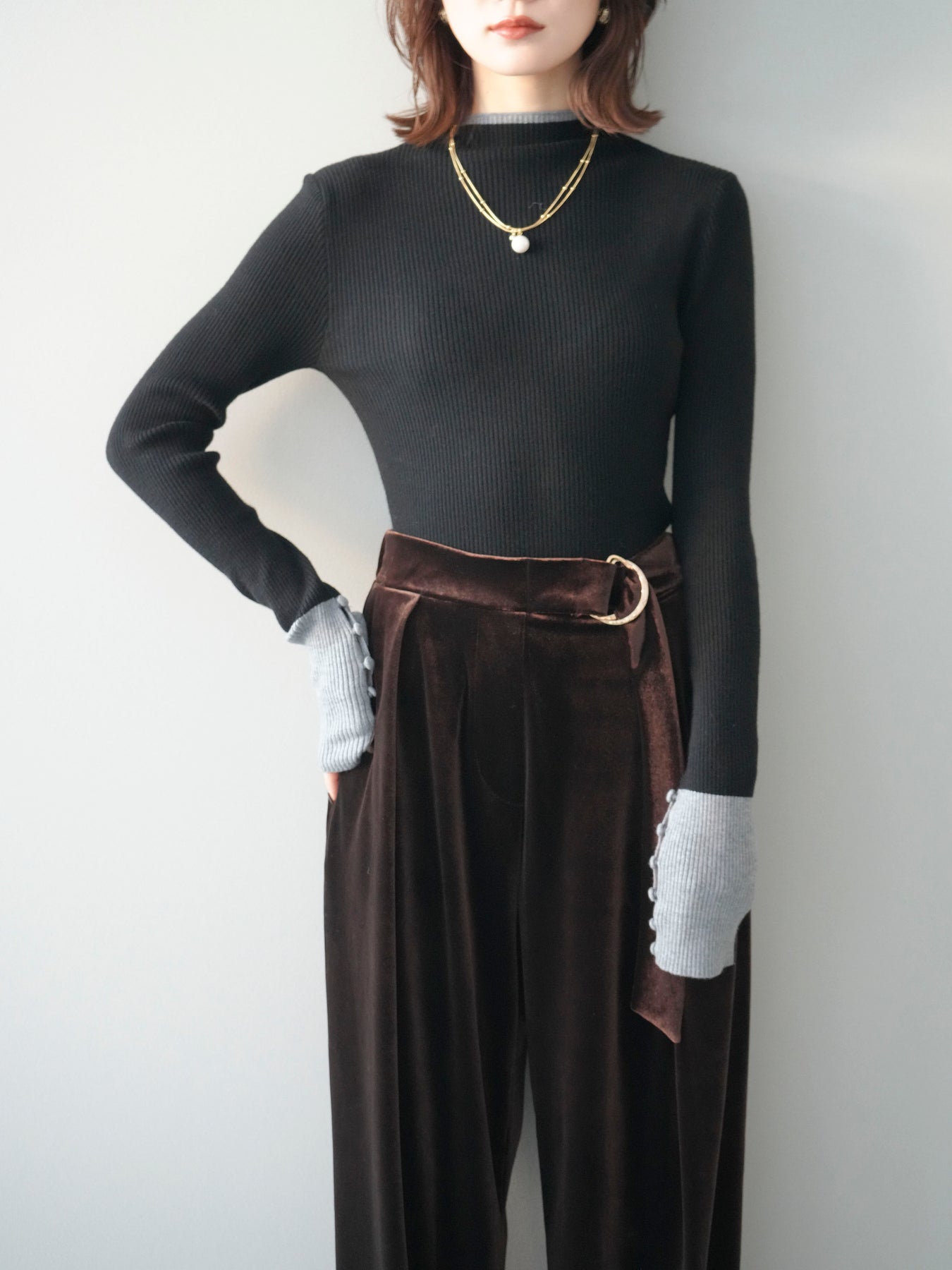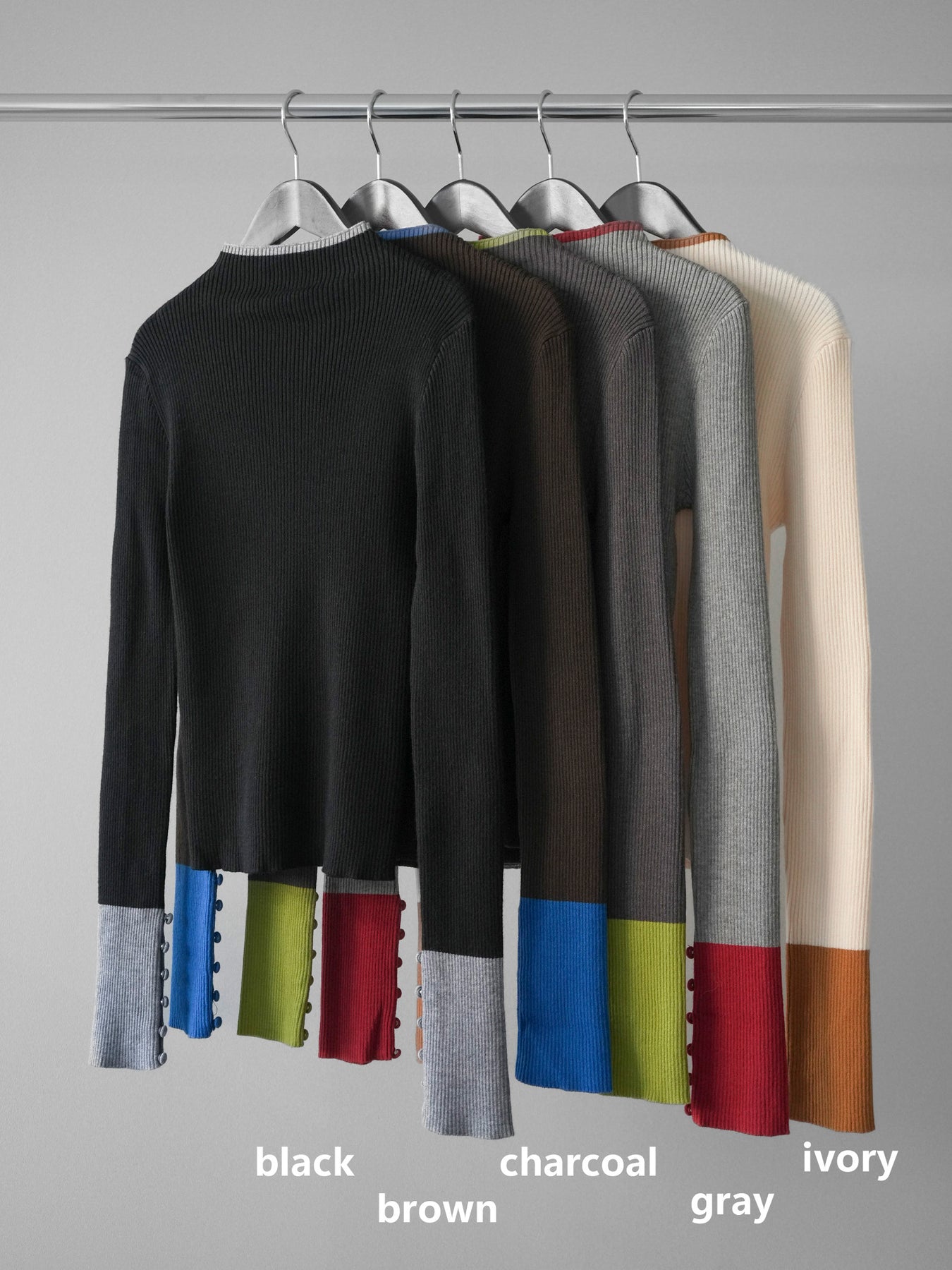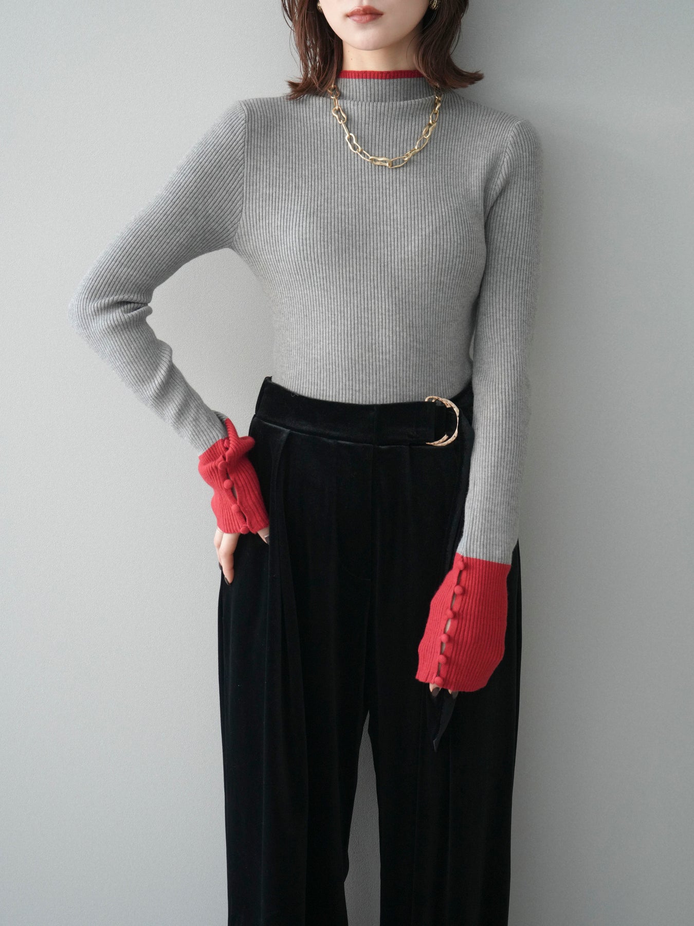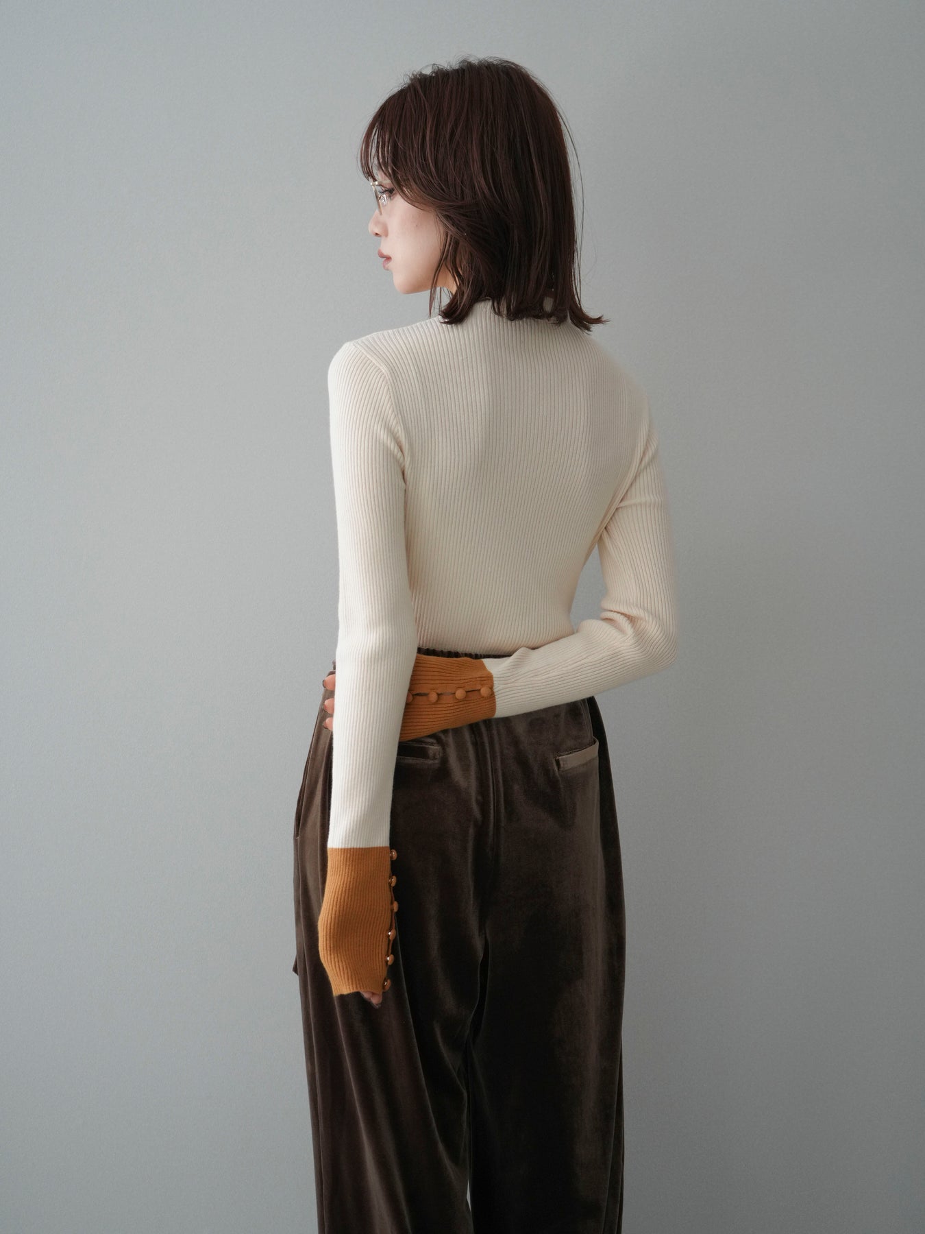 ◆ [予約]袖ボタンハイネック配色リブニットトップス