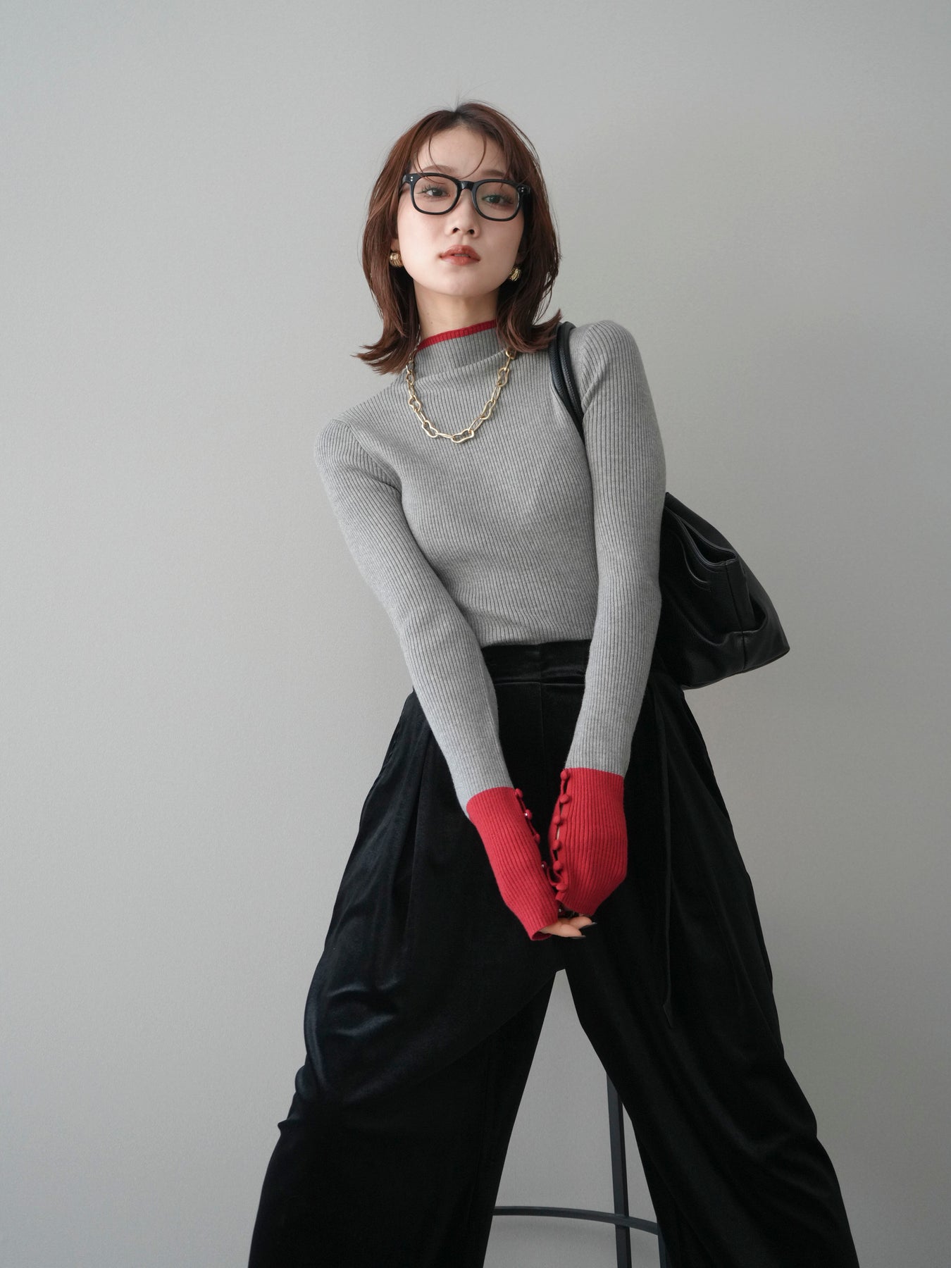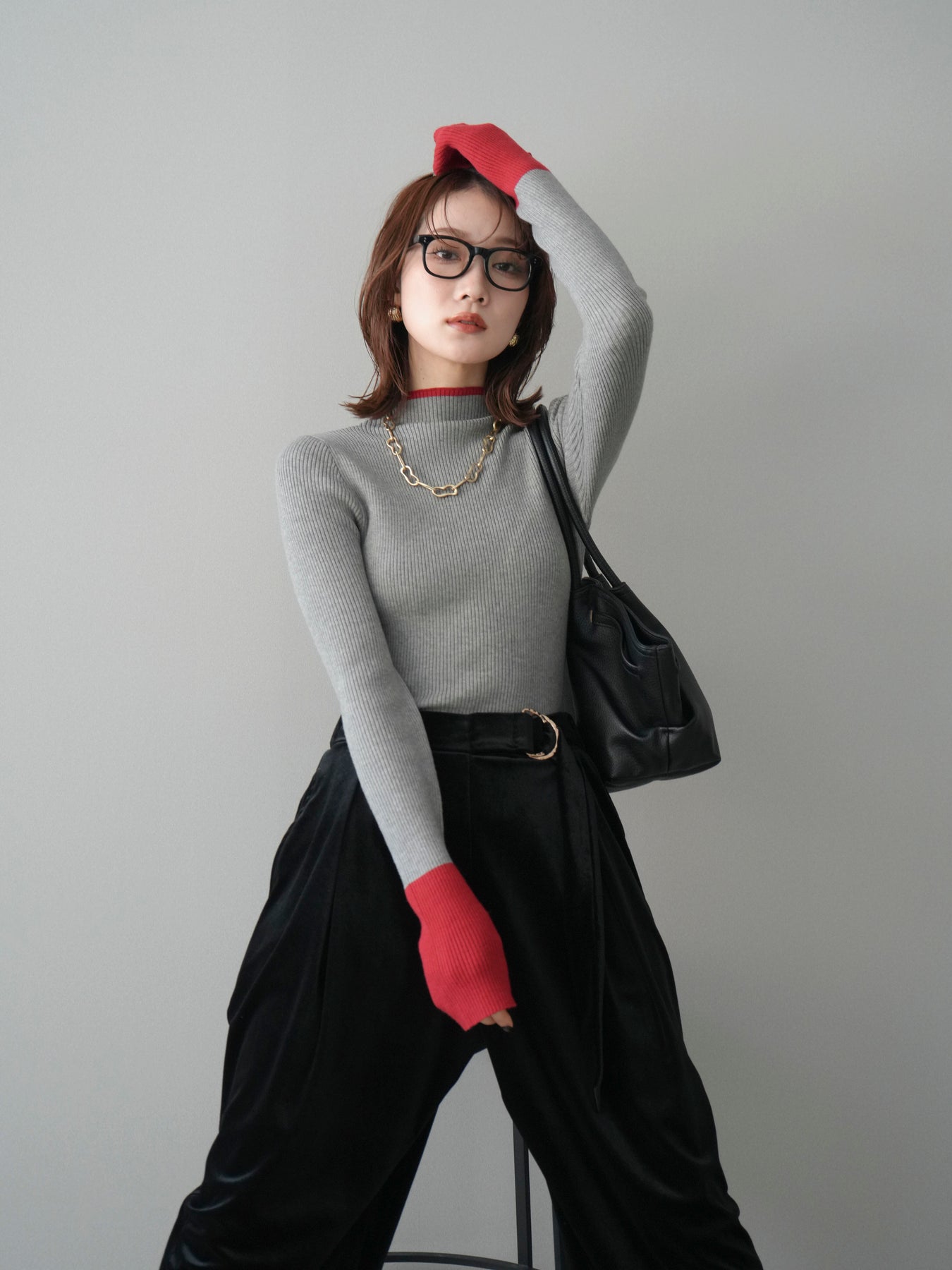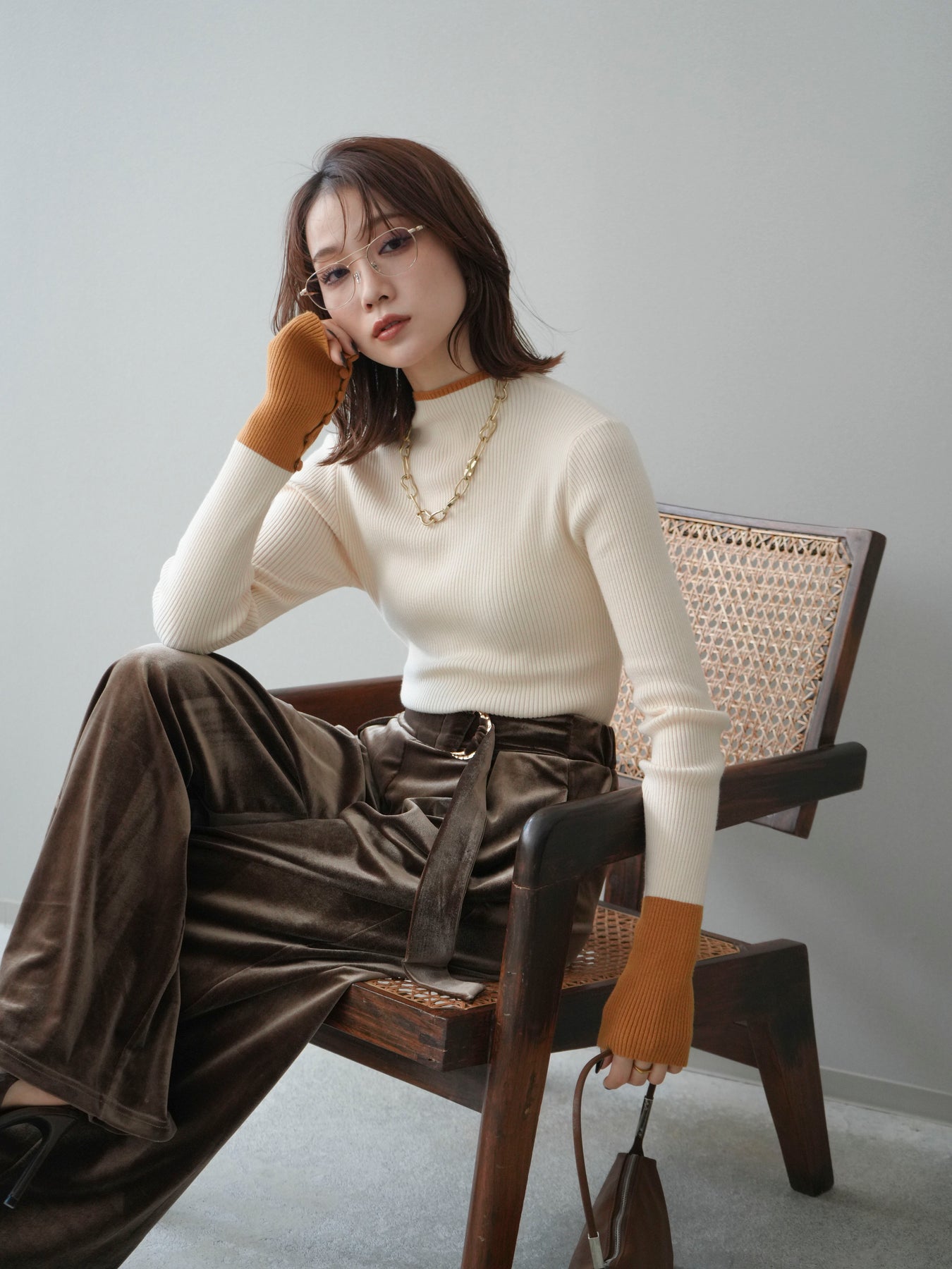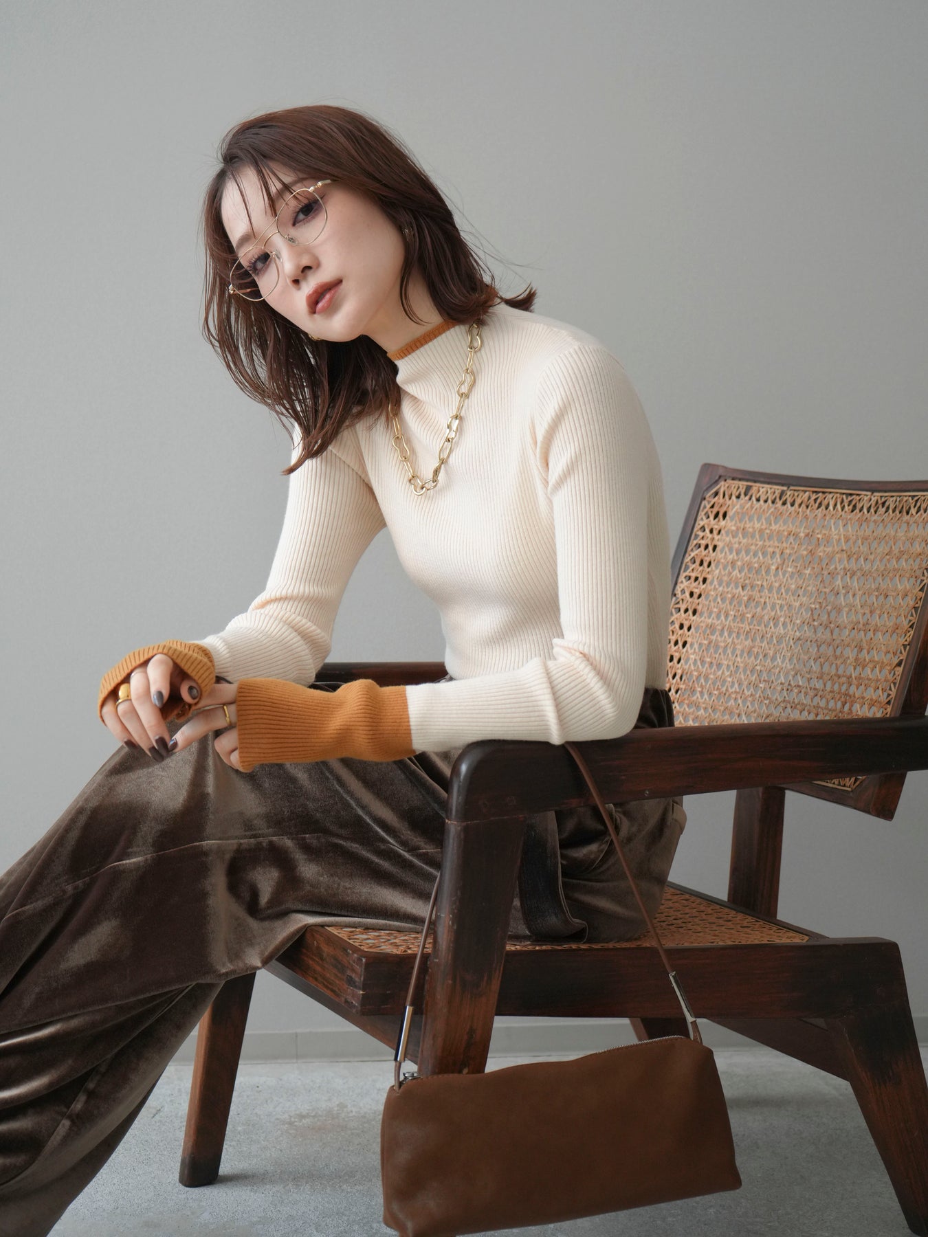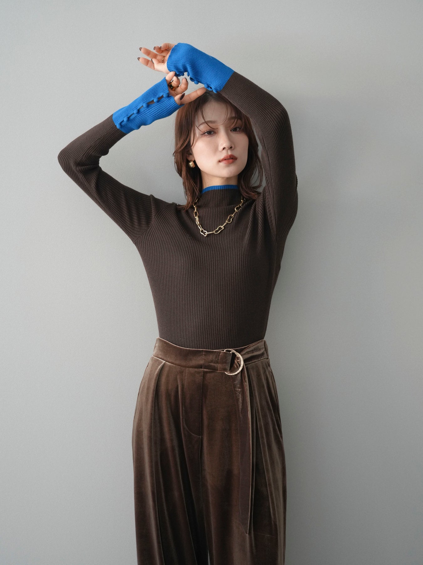 ◆ [予約]袖ボタンハイネック配色リブニットトップス