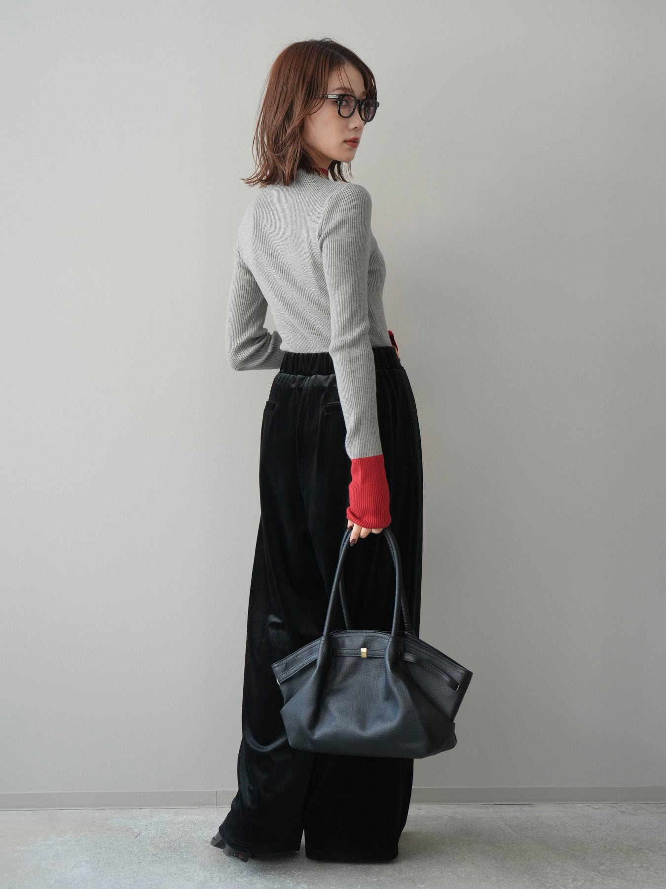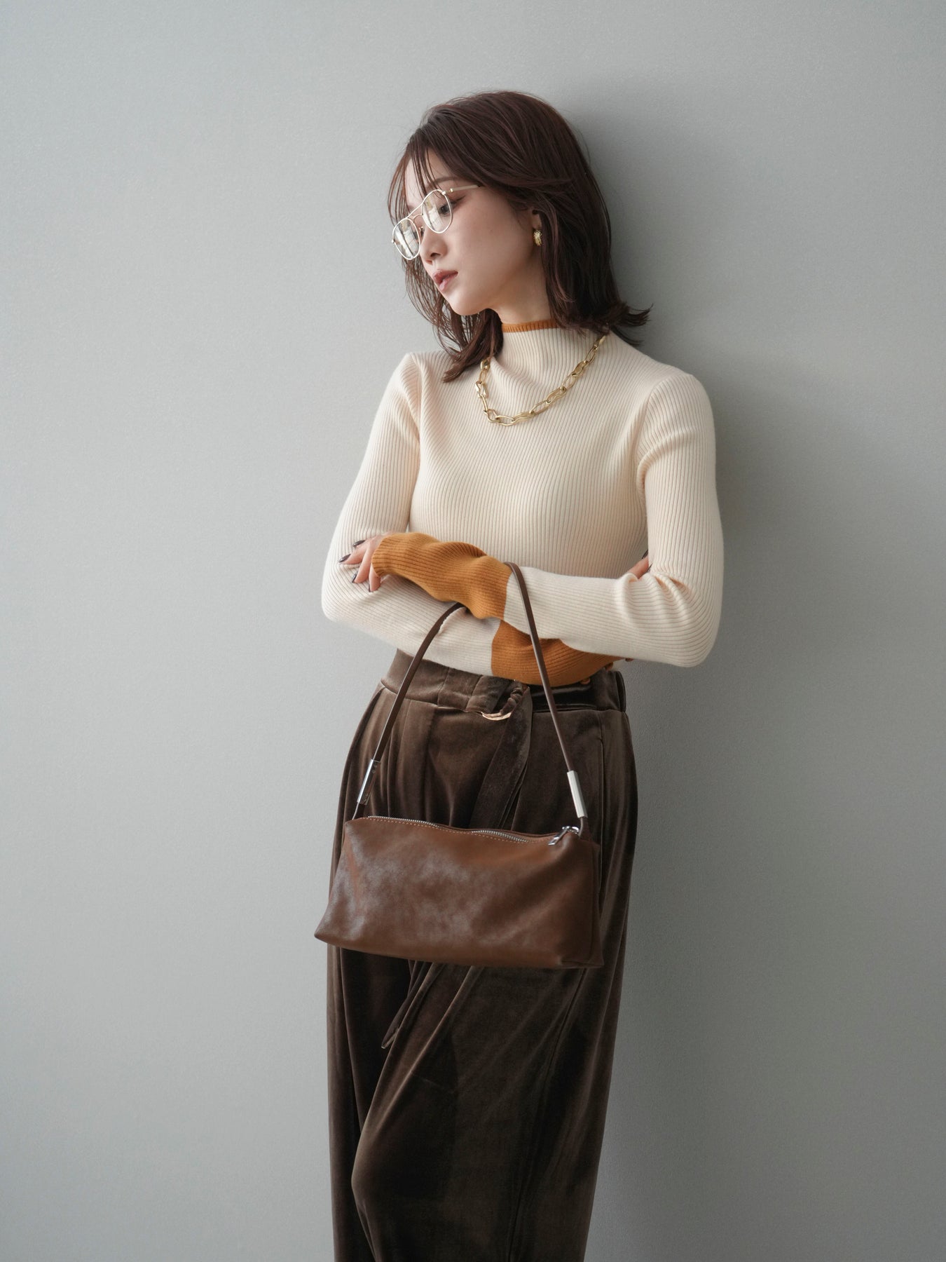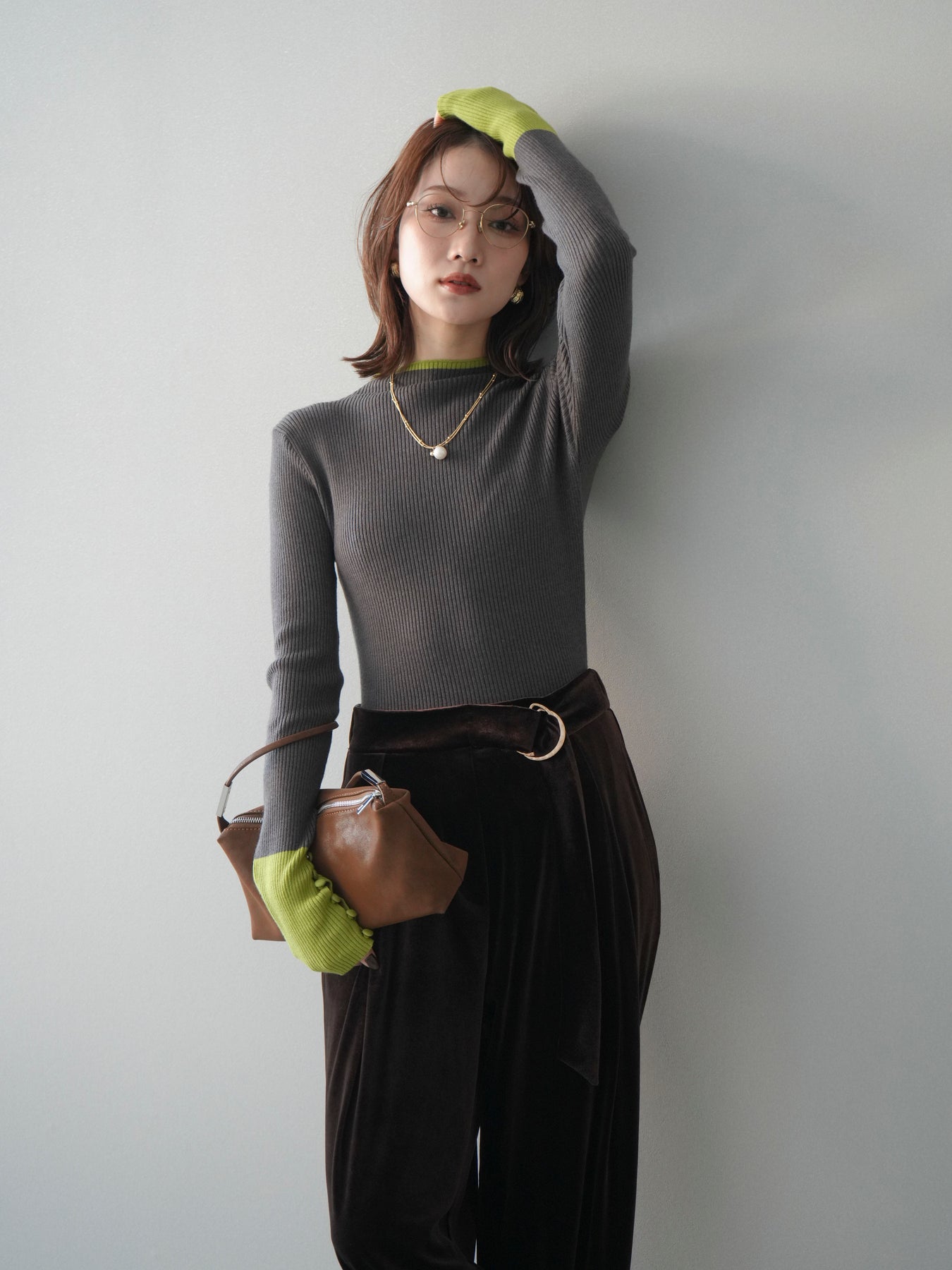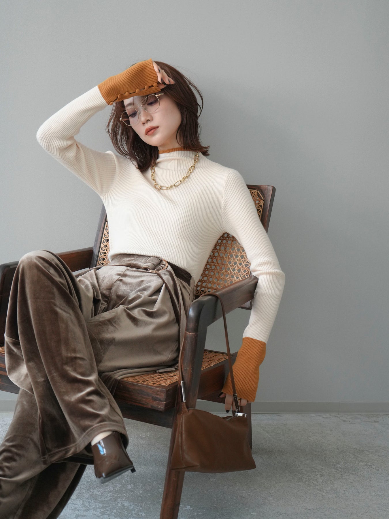 ◆ [予約]袖ボタンハイネック配色リブニットトップス