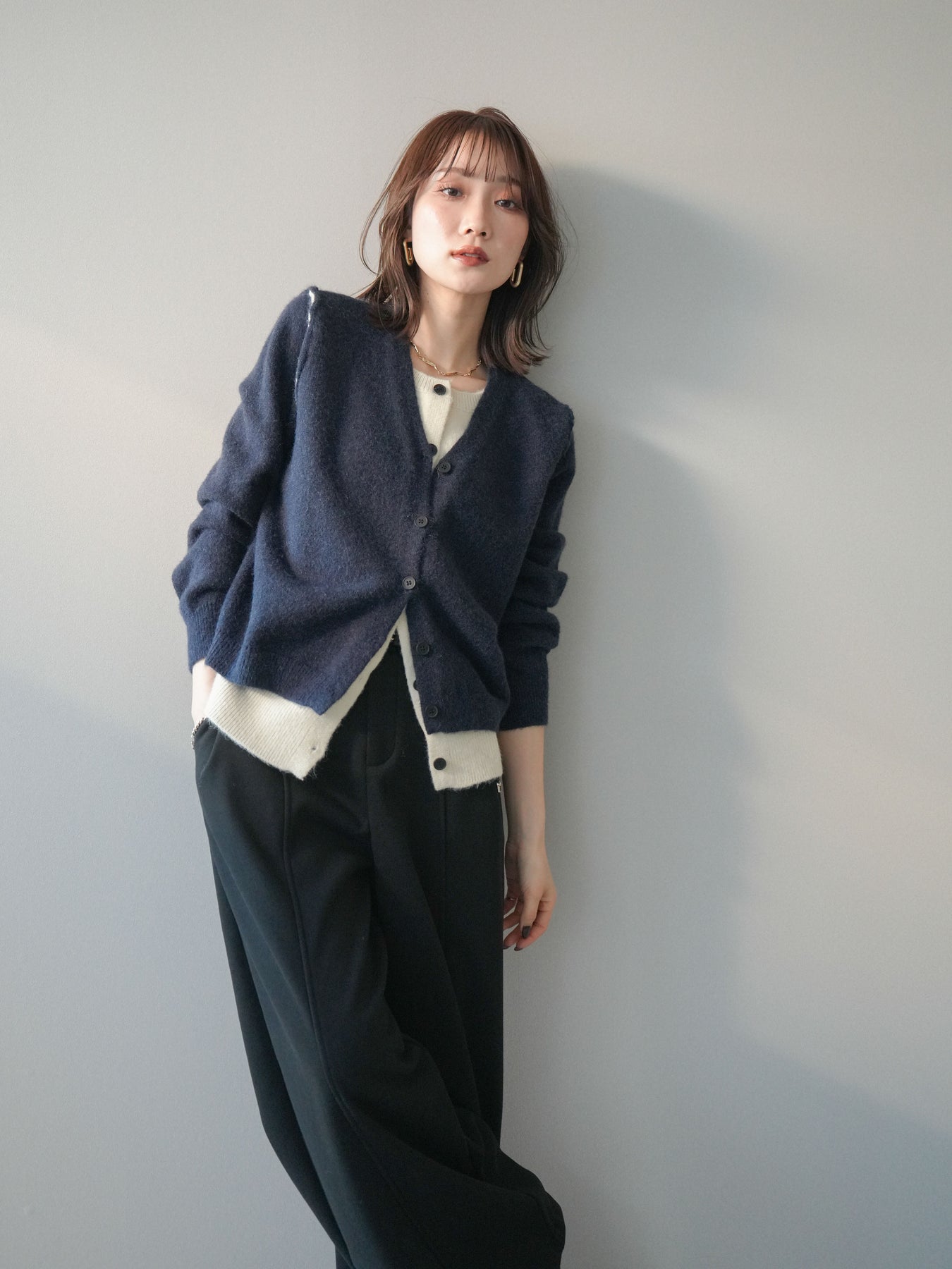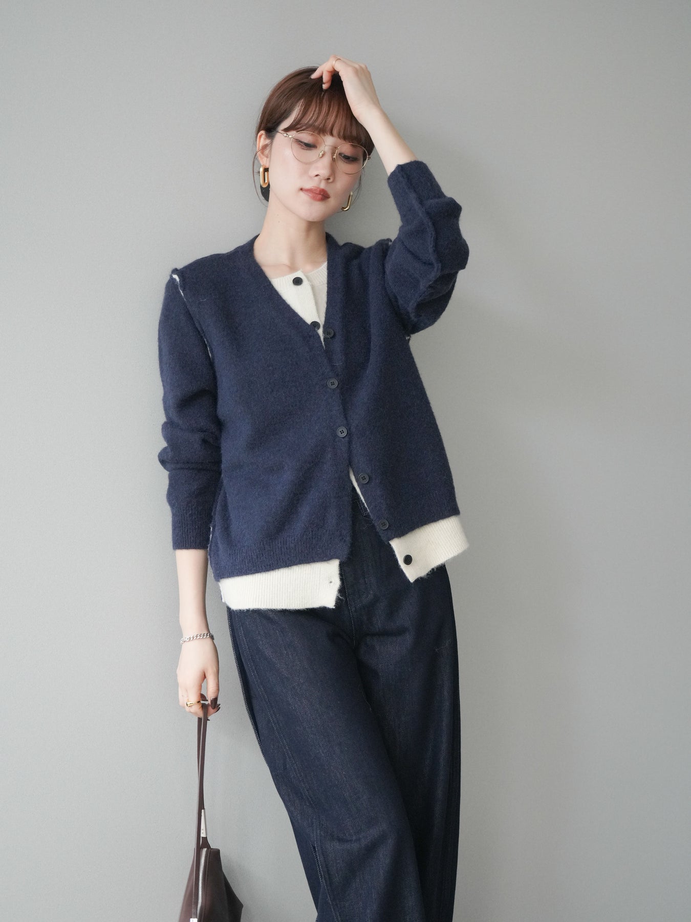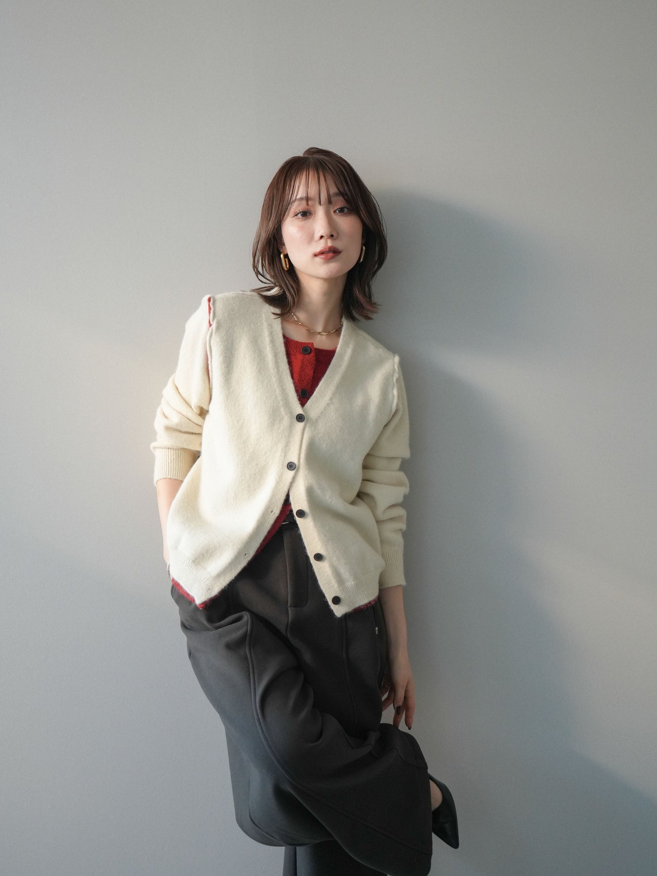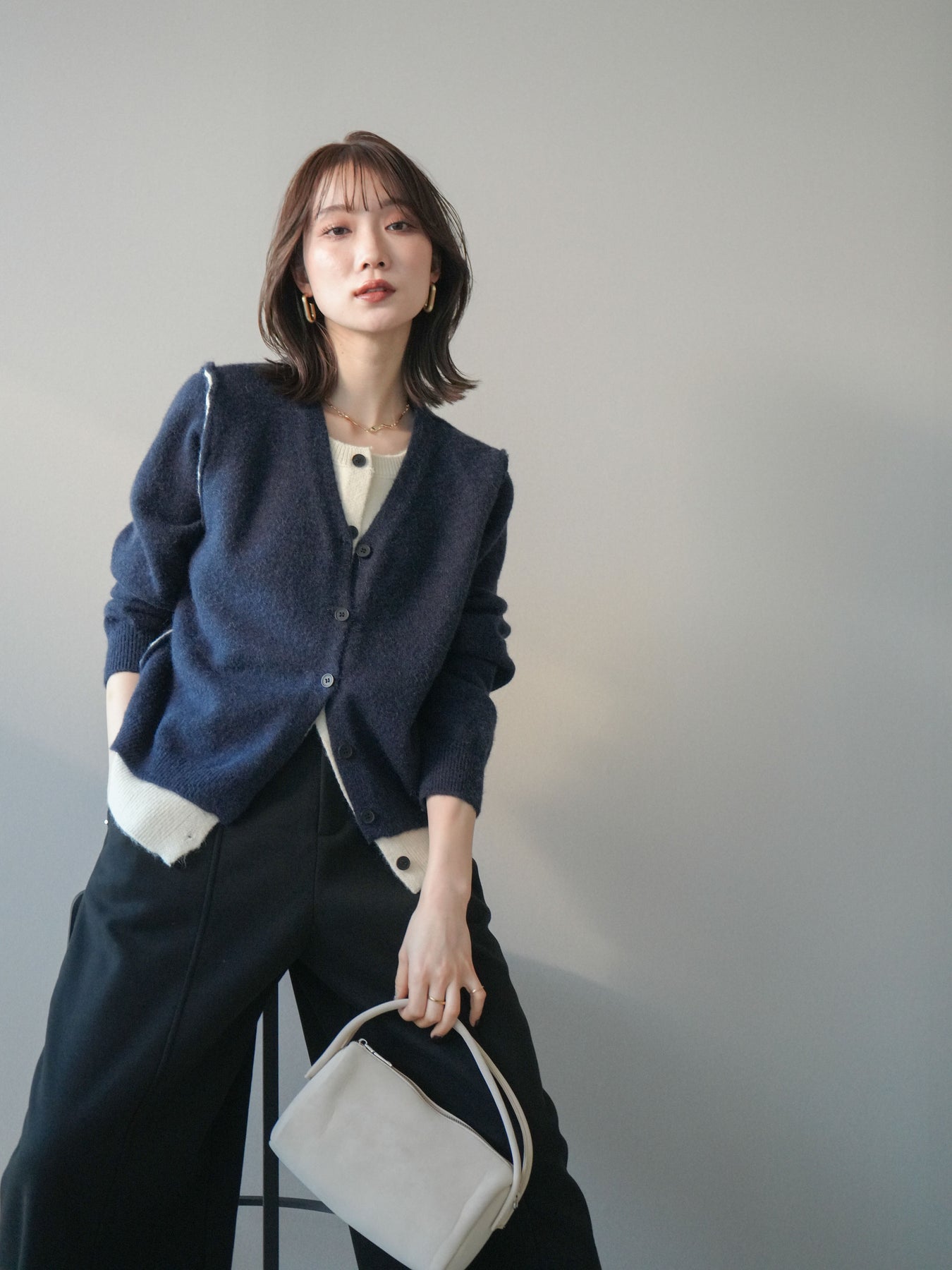 レイヤードしているように見える配色デザインが目を引くニットカーディガン。異なる色味のニットを重ねたようなディテールが立体感を生み、シンプルなボトムスに合わせるだけでスタイリングがぐっと華やぎます。程よい厚みのニット素材は着心地も軽く、ゆとりをもたせたシルエットが抜け感とリラックス感をプラス。ボタンを留めてトップス風にも、羽織としても活躍し、コーデに幅を持たせてくれる万能アイテムです。 ※ボトムス、キャミソール(インナー)以外の商品は一律でインナーは付属していません。