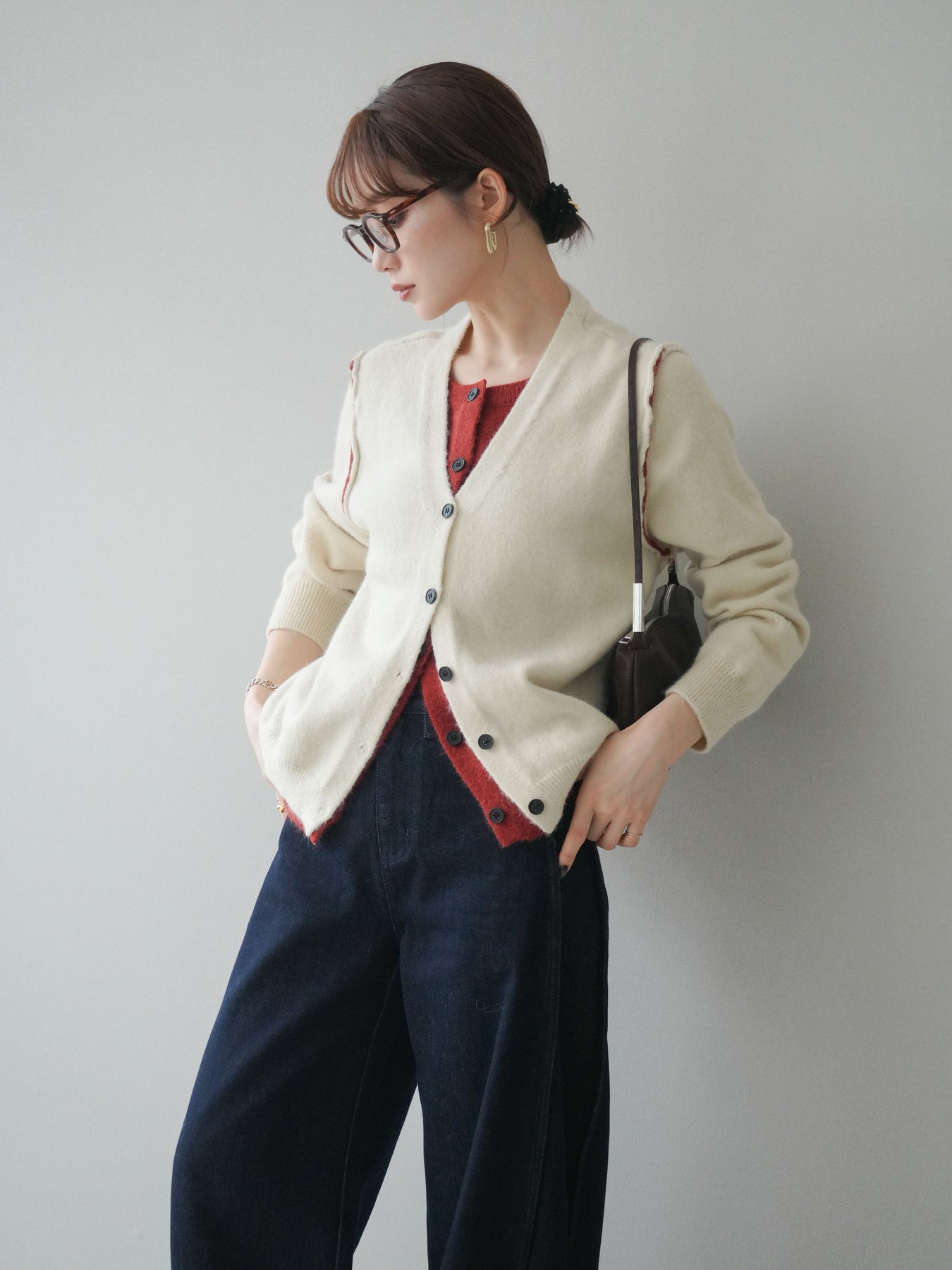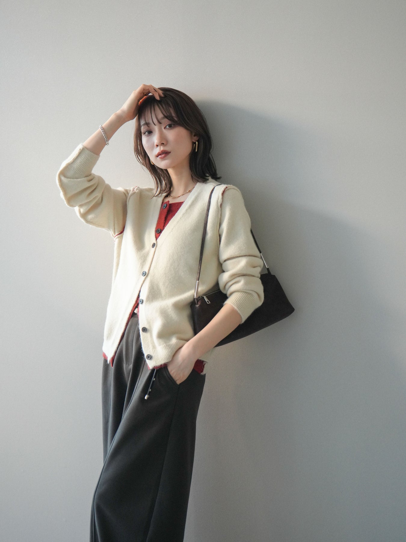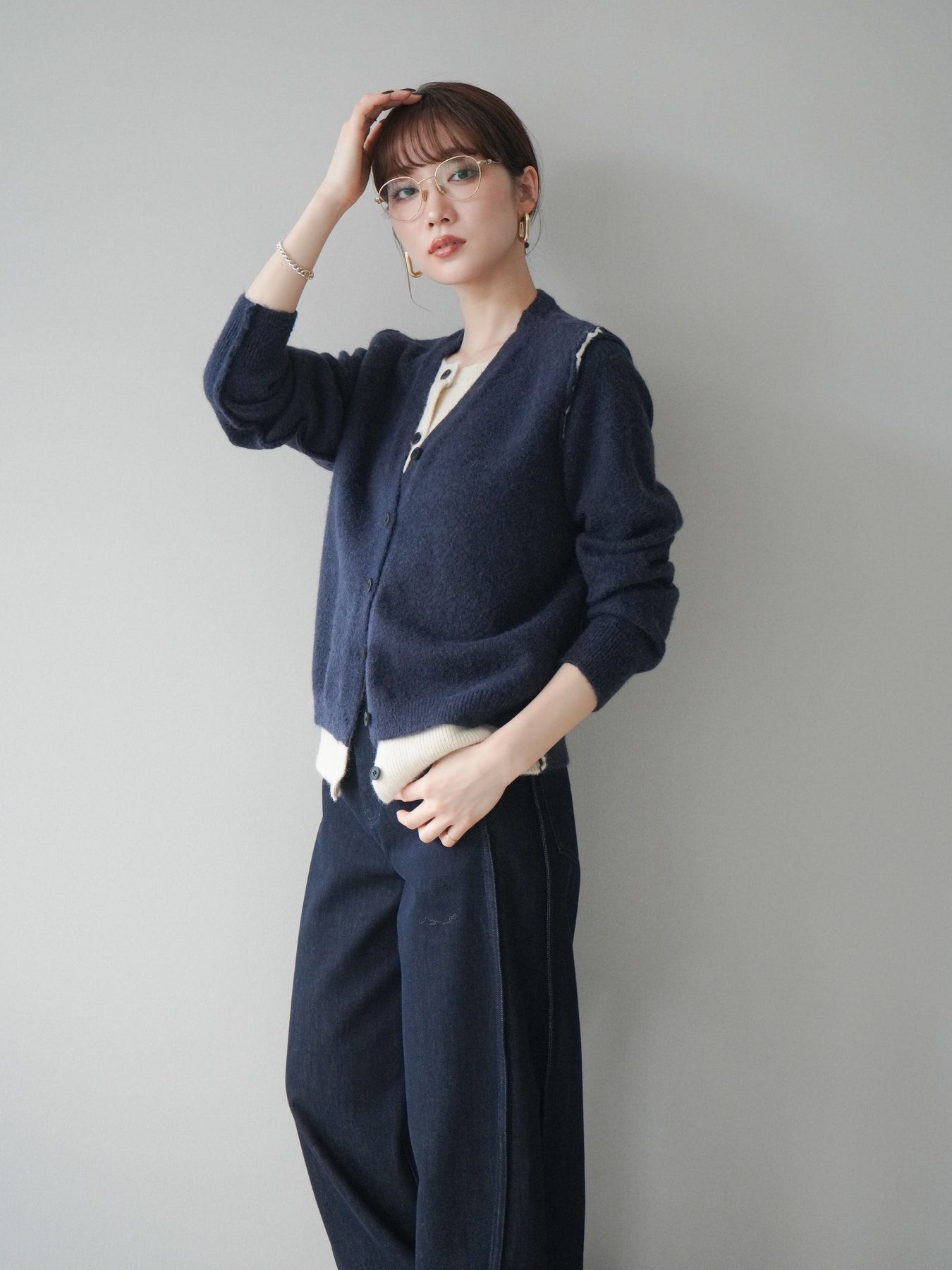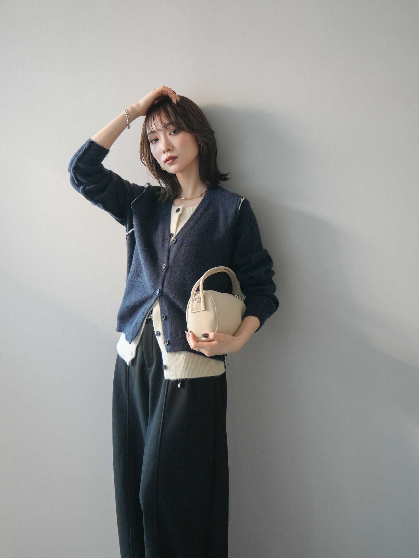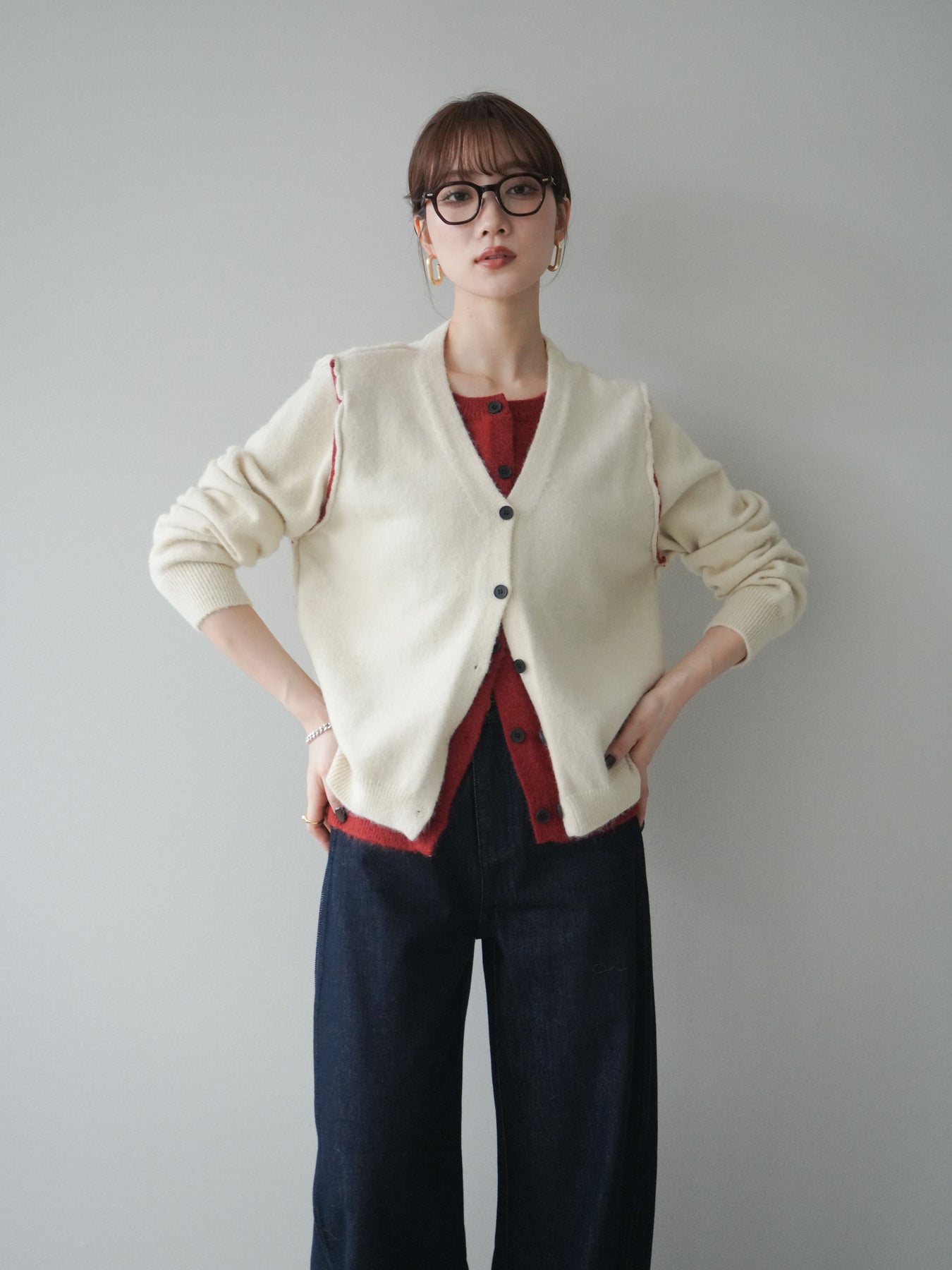 レイヤードしているように見える配色デザインが目を引くニットカーディガン。異なる色味のニットを重ねたようなディテールが立体感を生み、シンプルなボトムスに合わせるだけでスタイリングがぐっと華やぎます。程よい厚みのニット素材は着心地も軽く、ゆとりをもたせたシルエットが抜け感とリラックス感をプラス。ボタンを留めてトップス風にも、羽織としても活躍し、コーデに幅を持たせてくれる万能アイテムです。 ※ボトムス、キャミソール(インナー)以外の商品は一律でインナーは付属していません。
