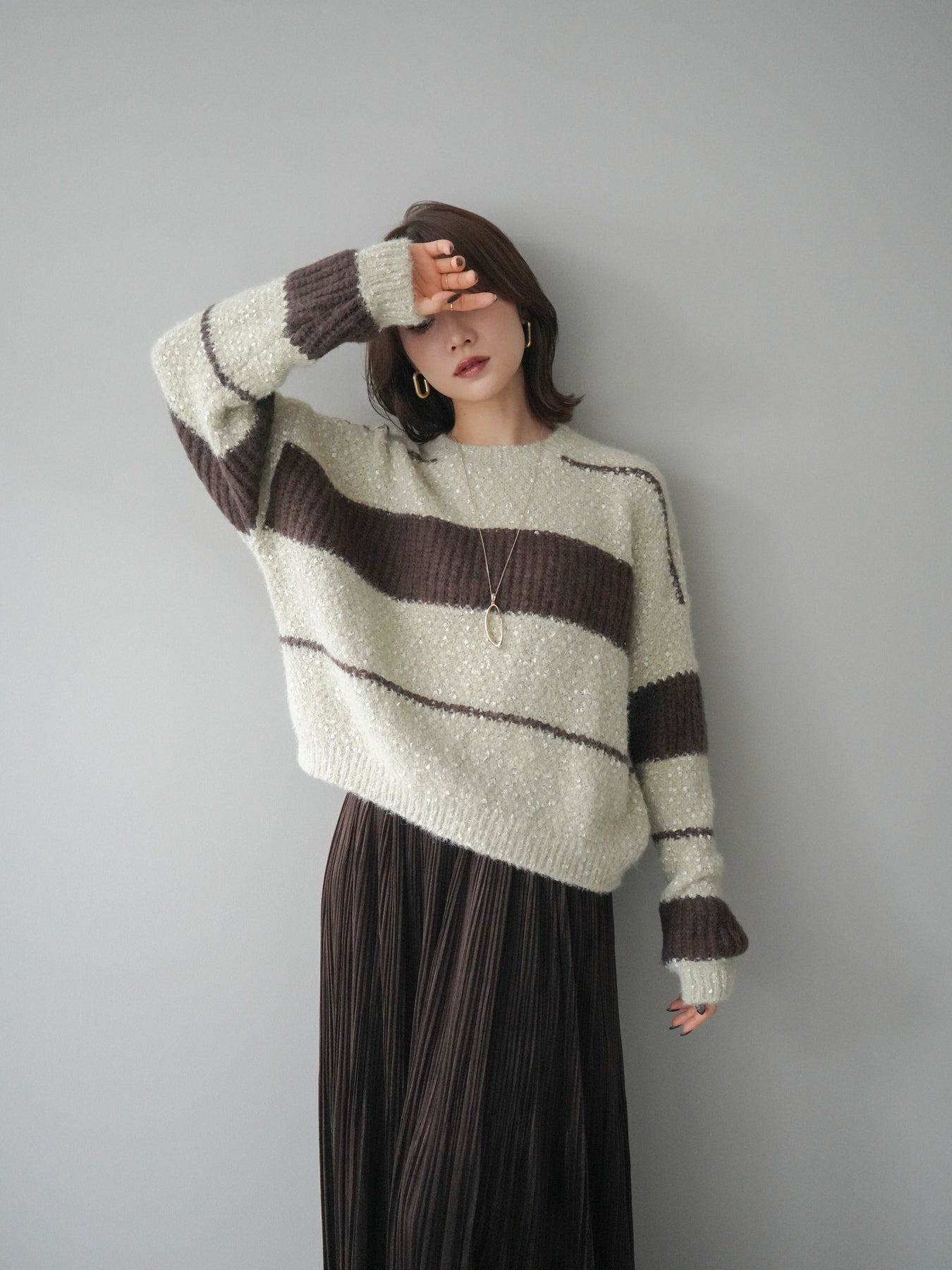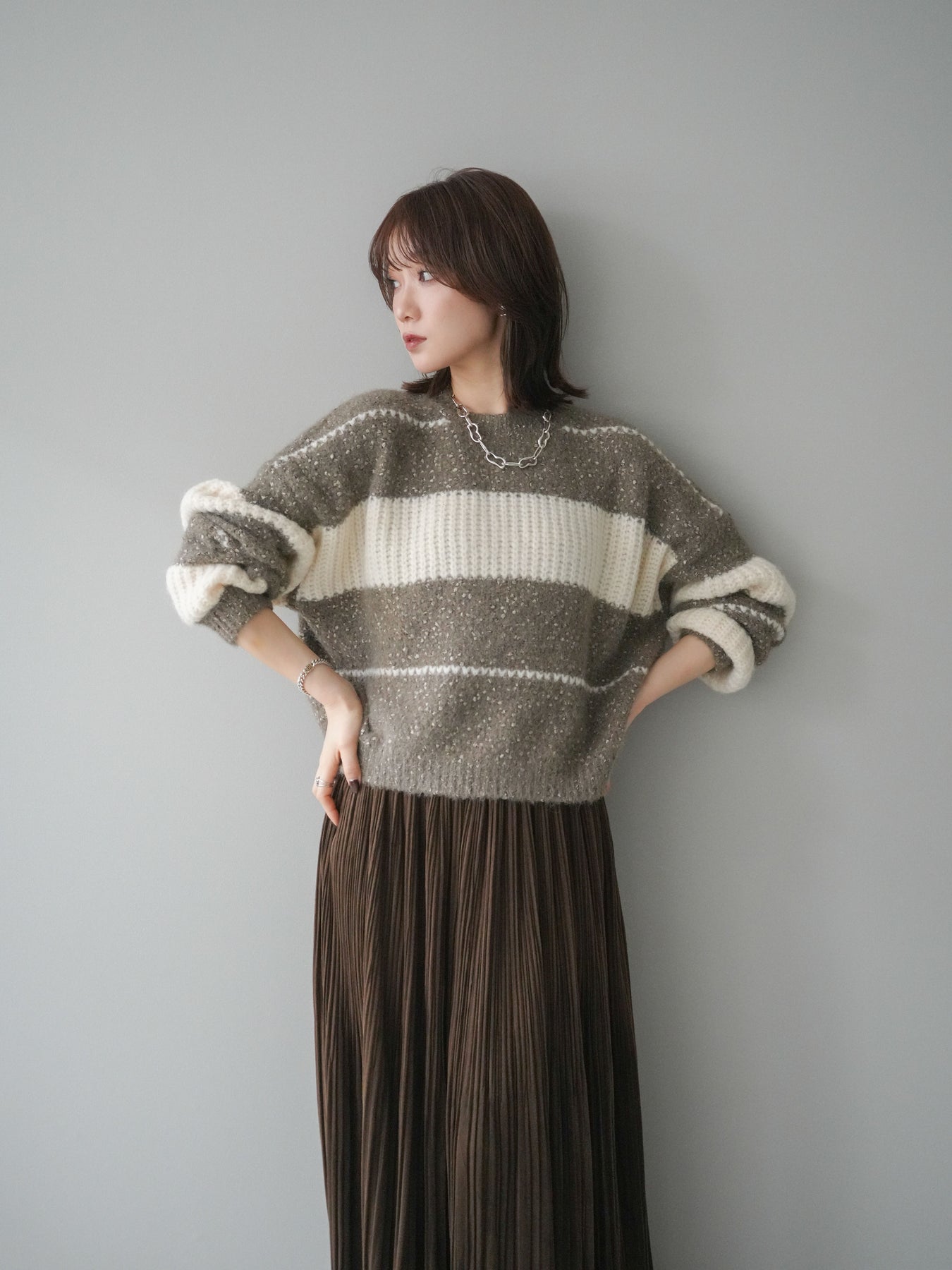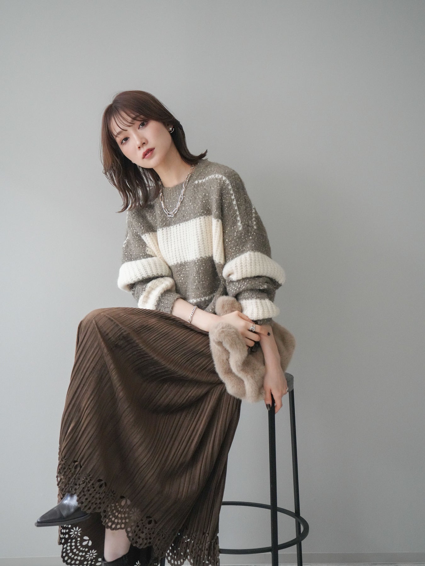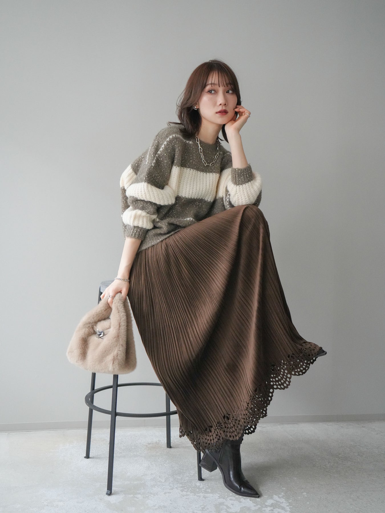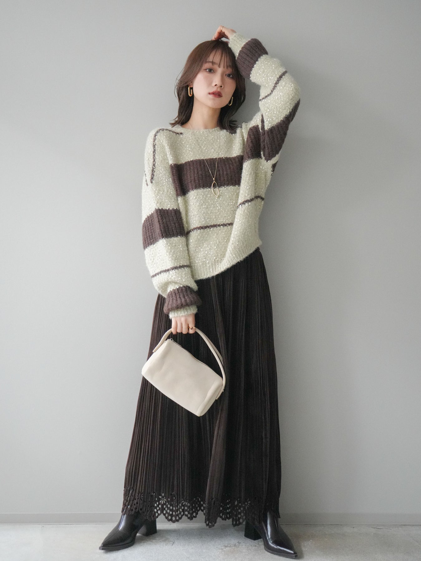 [SET]ネップヤーンボーダーニットプルオーバー+パンチングデザインスエードプリーツスカート(2set)
