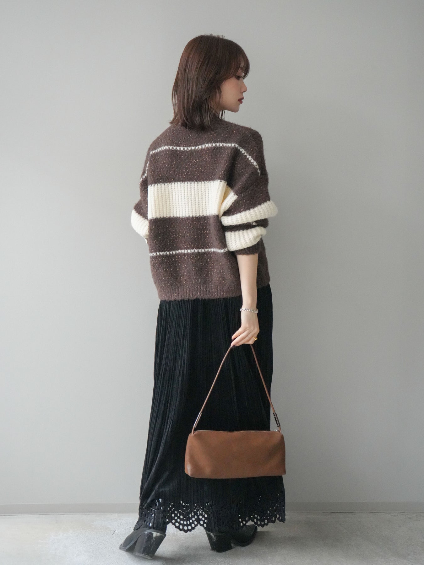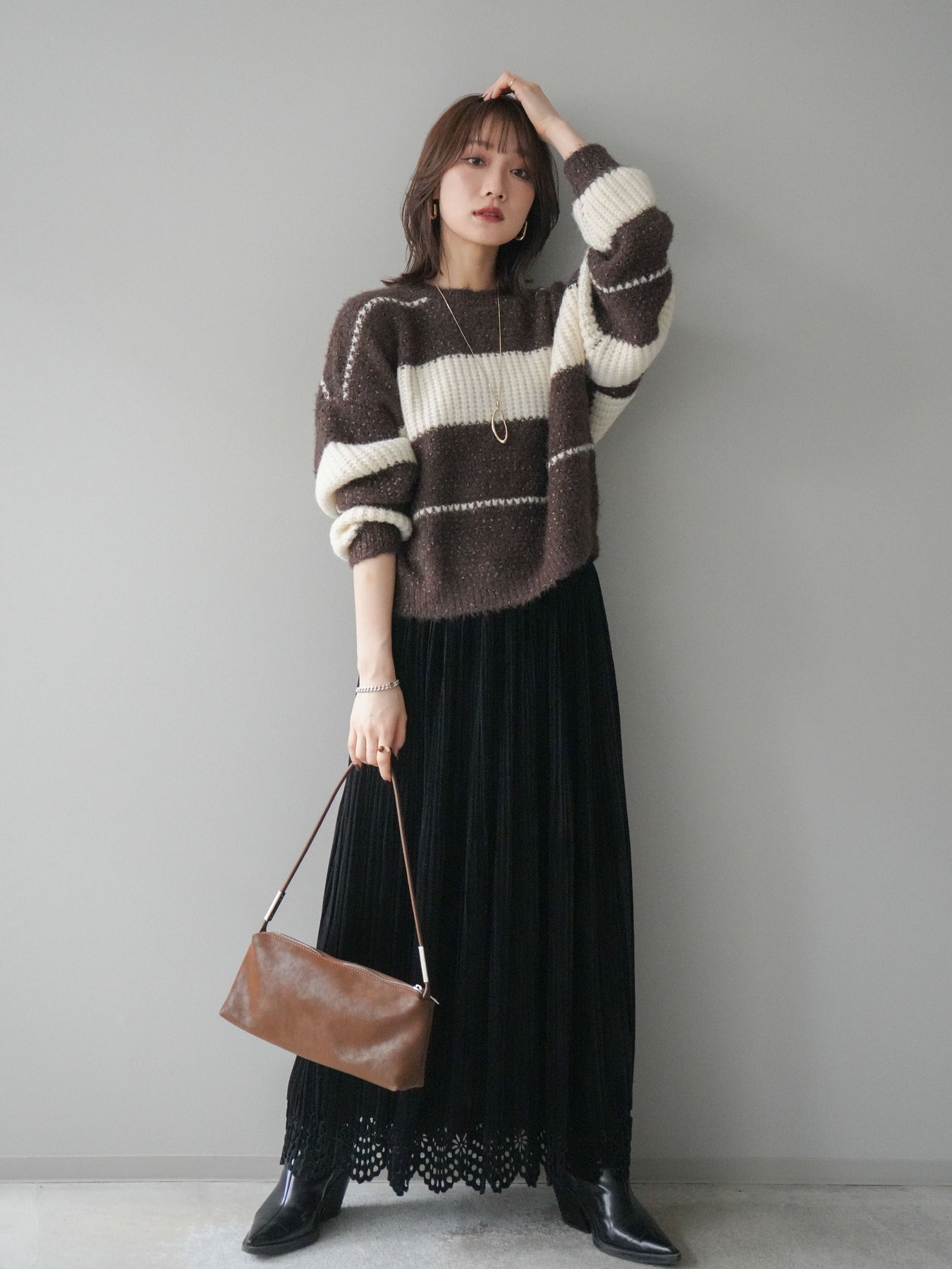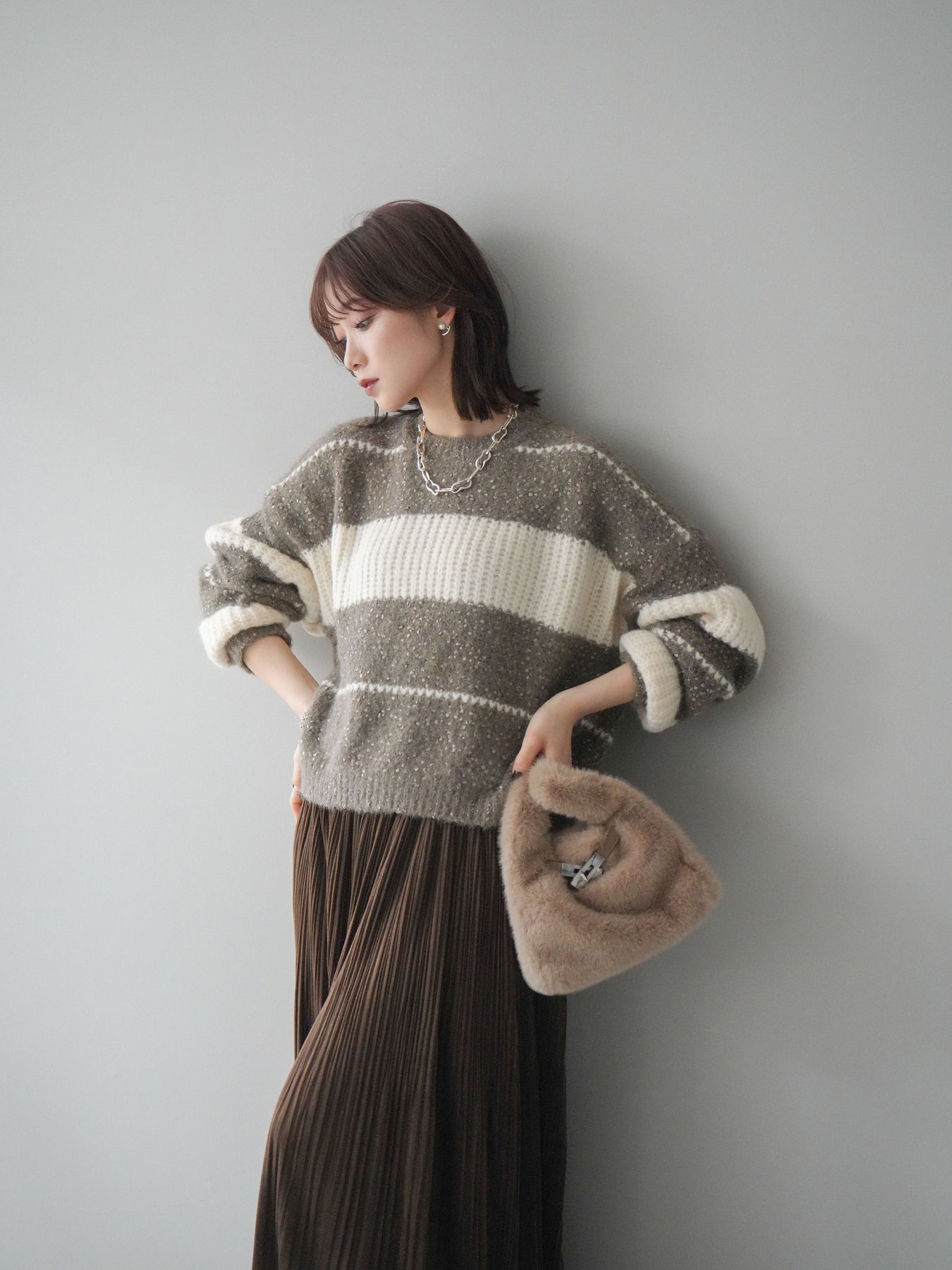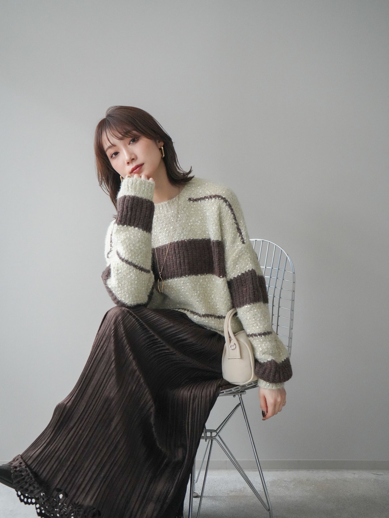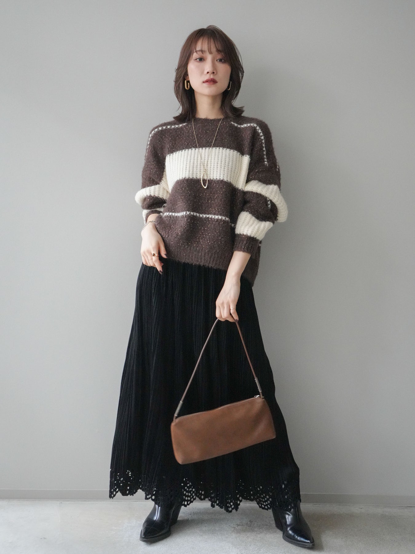 [SET]ネップヤーンボーダーニットプルオーバー+パンチングデザインスエードプリーツスカート(2set)