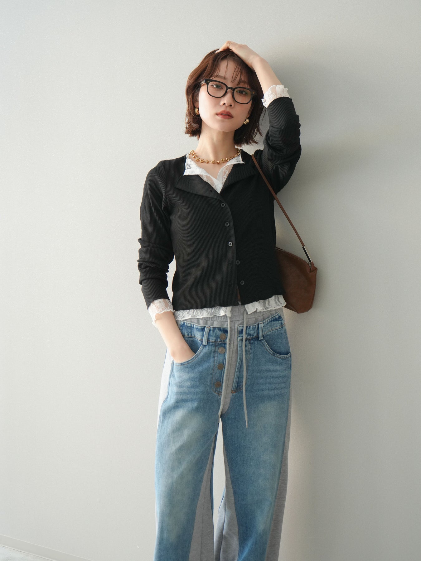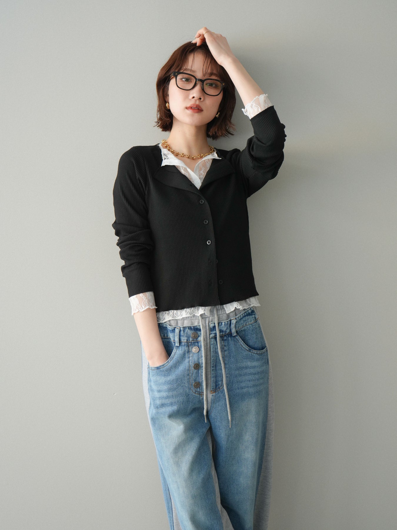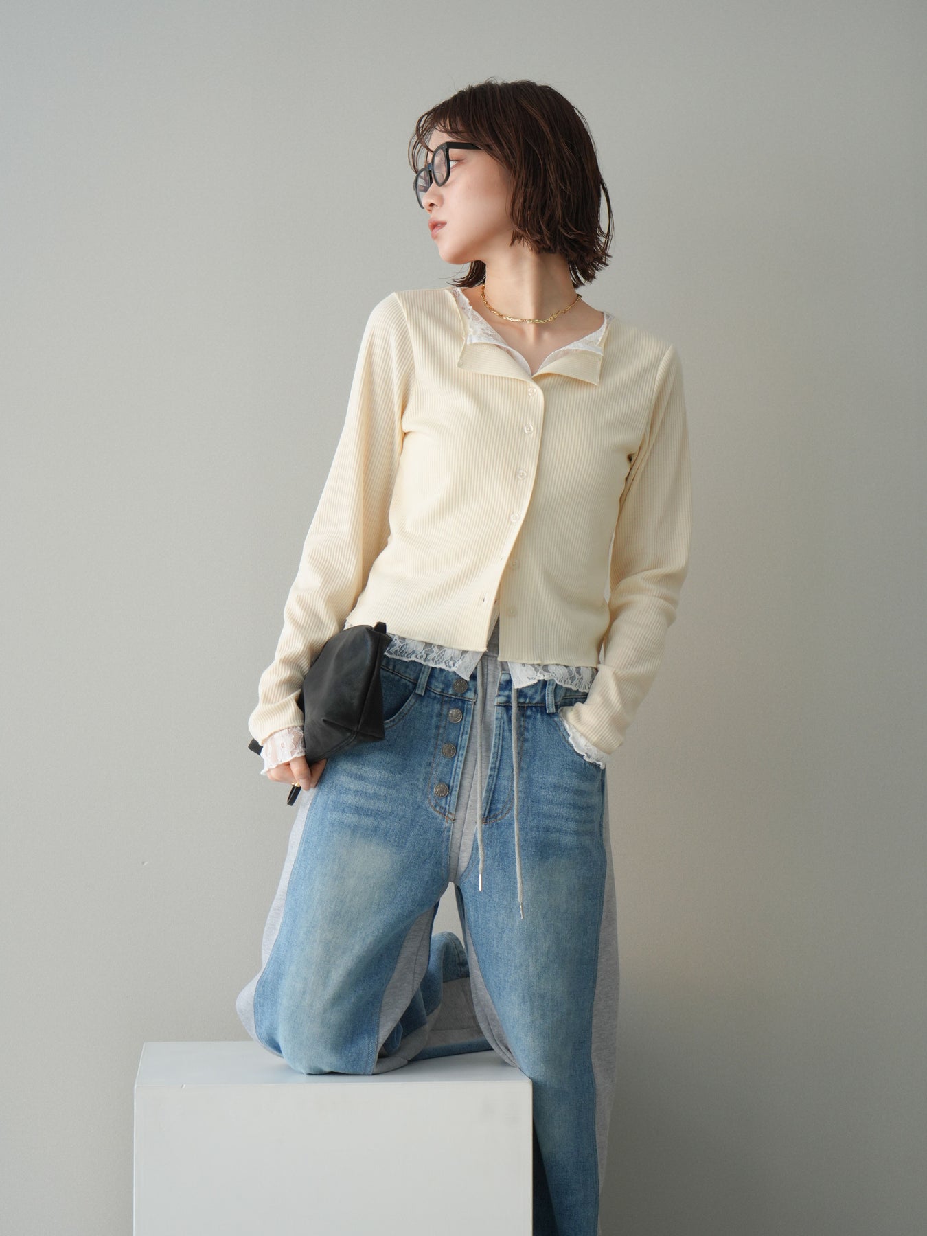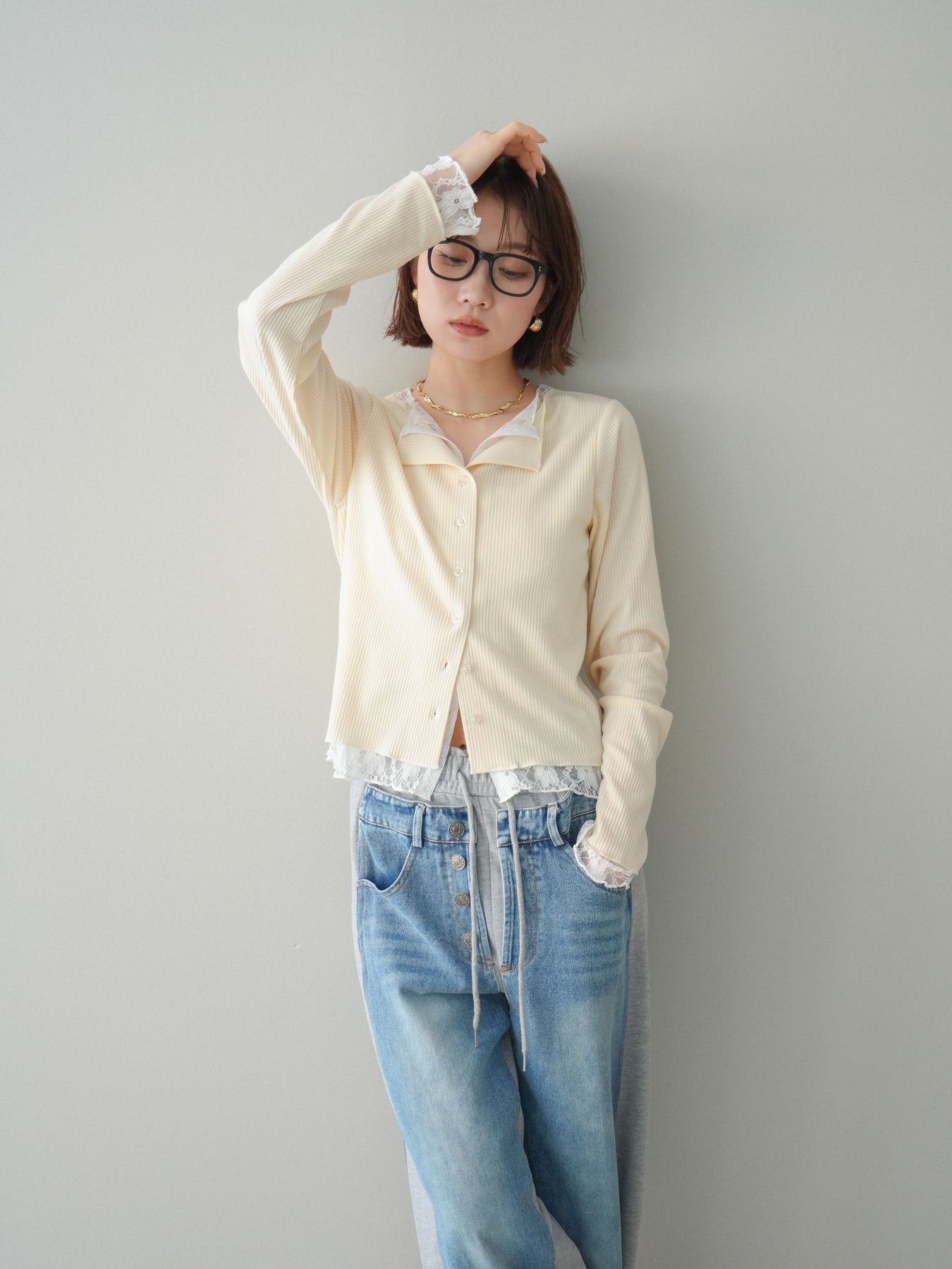 テレコリブ素材に繊細なレースをドッキングし、程よい甘さと大人っぽさを兼ね備えたカーディガン。すっきりとしたリブの縦ラインがシルエットをきれいに見せつつ、襟元・裾・袖口に施したレースが軽やかなアクセントを添えます。前を閉じてトップスとしても、開けて羽織りとしても着用しやすく、レイヤード次第で表情の変化を楽しめる一着。デイリーからきれいめスタイルまで幅広く活躍します。 ※ボトムス、キャミソール(インナー)以外の商品は一律でインナーは付属していません。