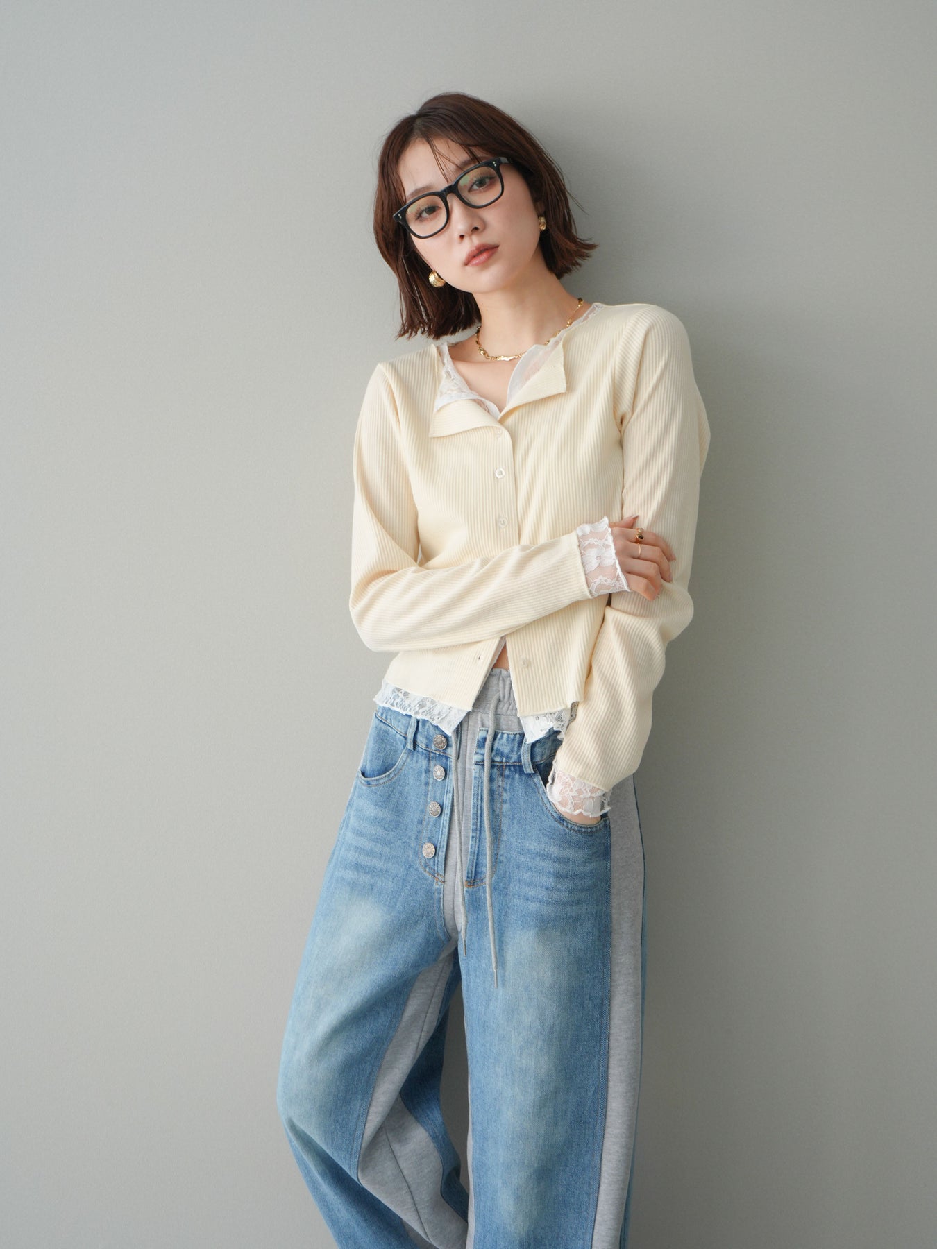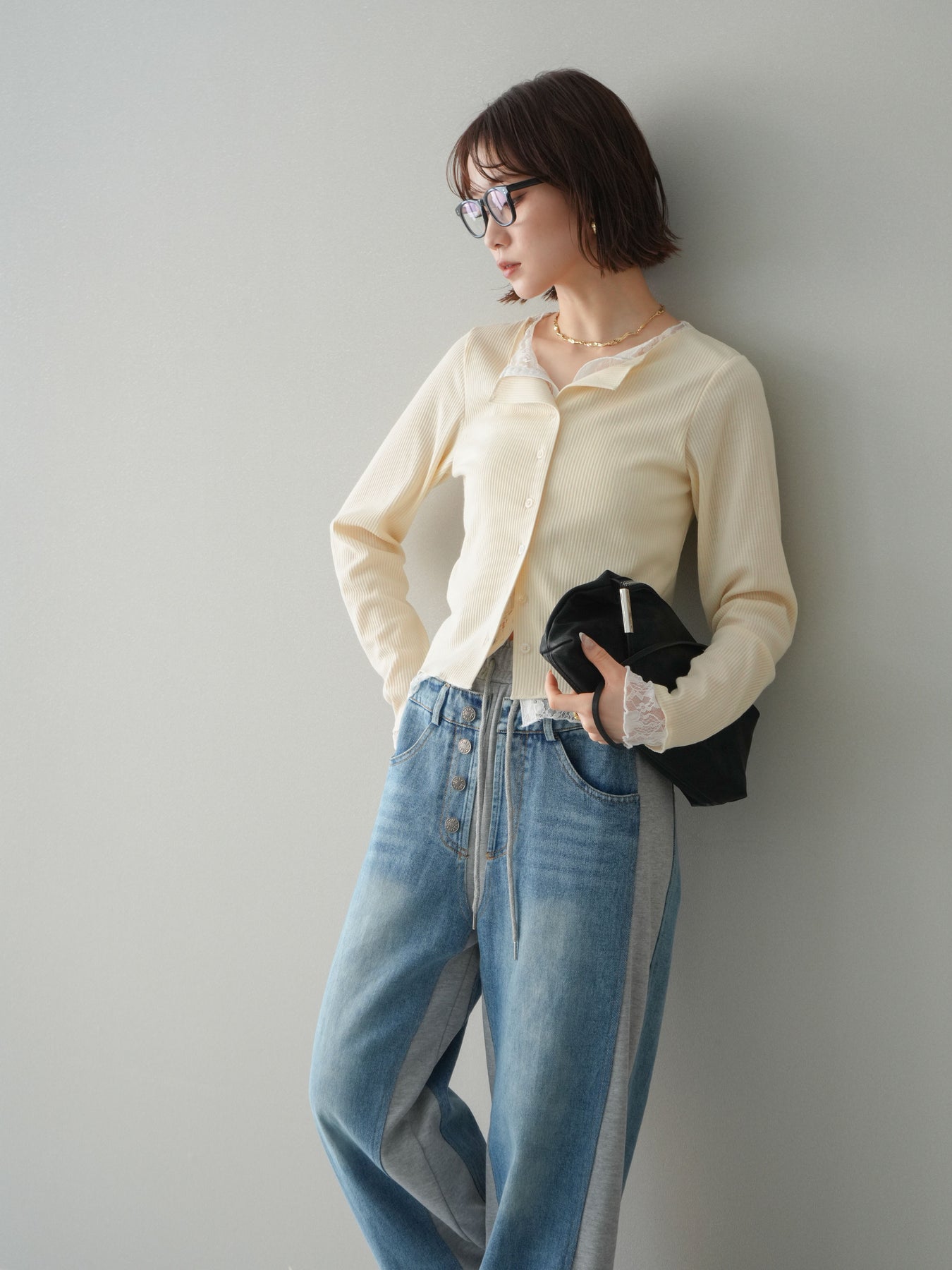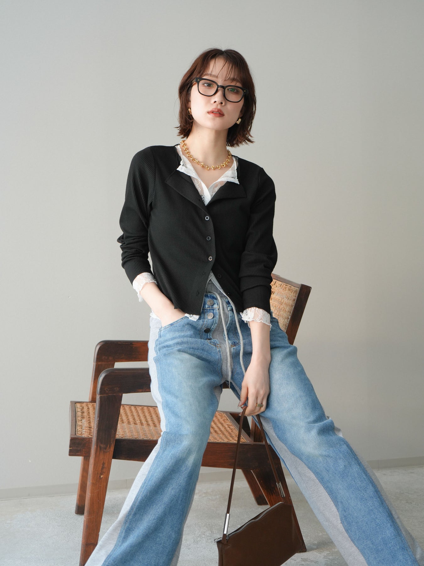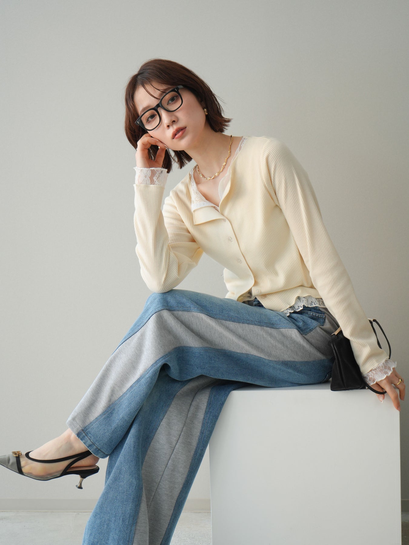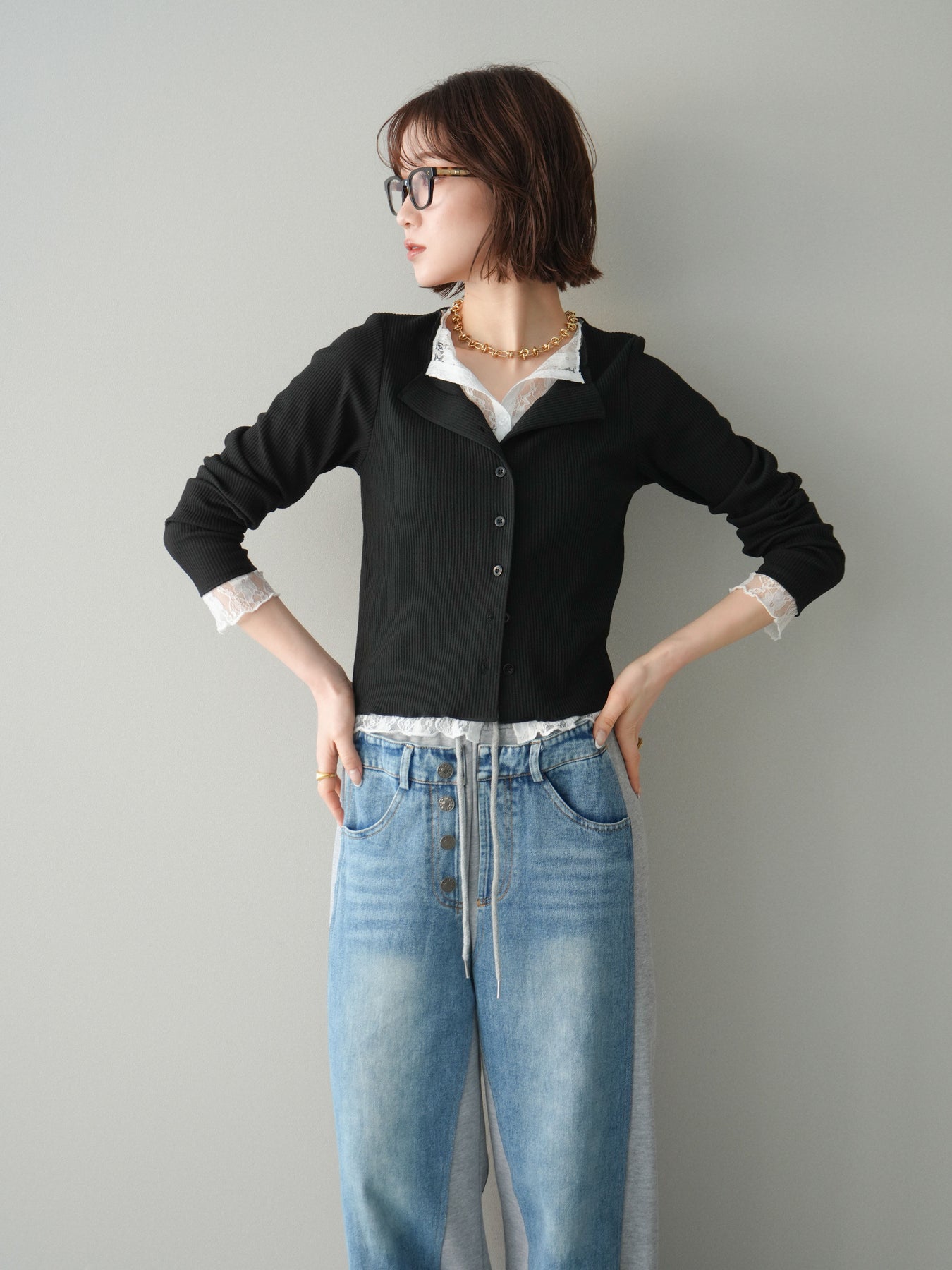 テレコリブ素材に繊細なレースをドッキングし、程よい甘さと大人っぽさを兼ね備えたカーディガン。すっきりとしたリブの縦ラインがシルエットをきれいに見せつつ、襟元・裾・袖口に施したレースが軽やかなアクセントを添えます。前を閉じてトップスとしても、開けて羽織りとしても着用しやすく、レイヤード次第で表情の変化を楽しめる一着。デイリーからきれいめスタイルまで幅広く活躍します。 ※ボトムス、キャミソール(インナー)以外の商品は一律でインナーは付属していません。