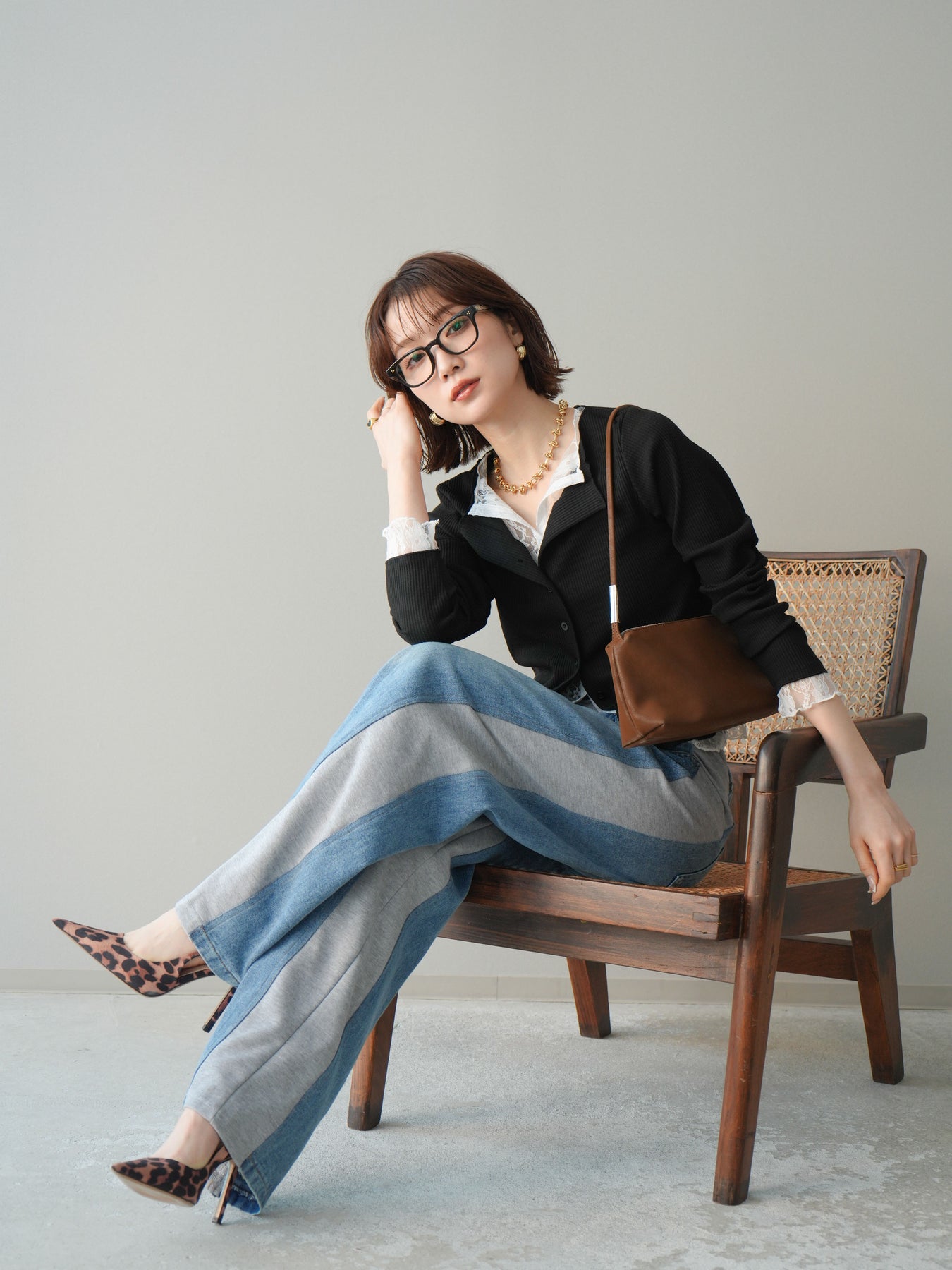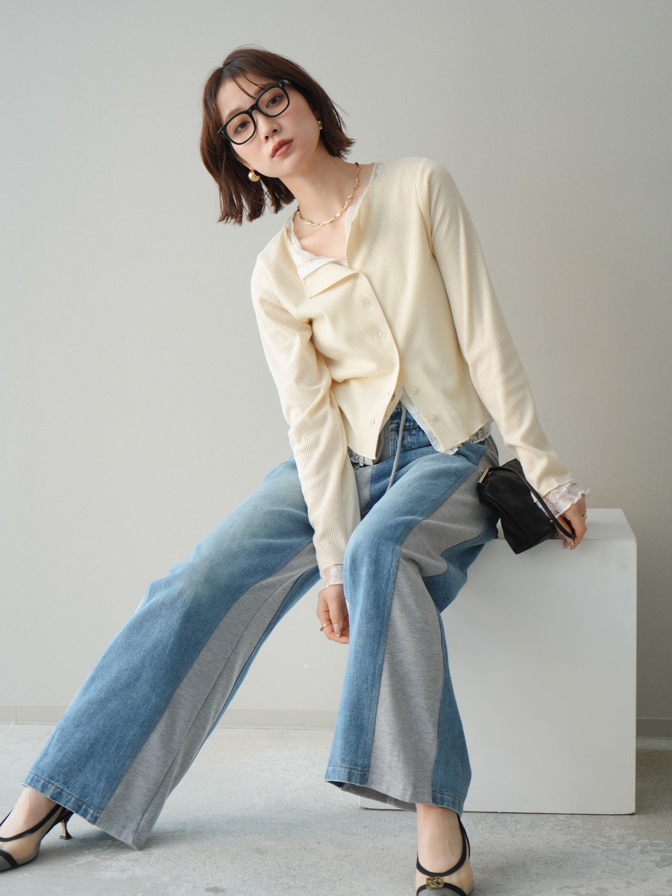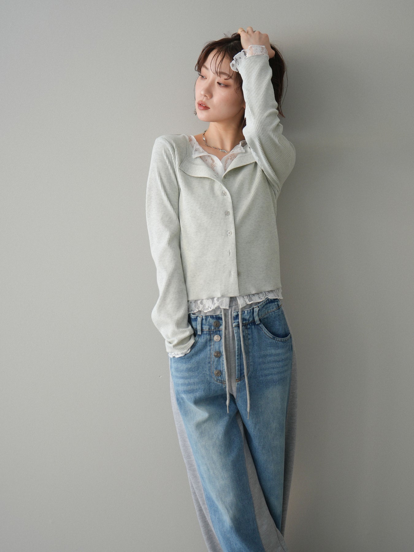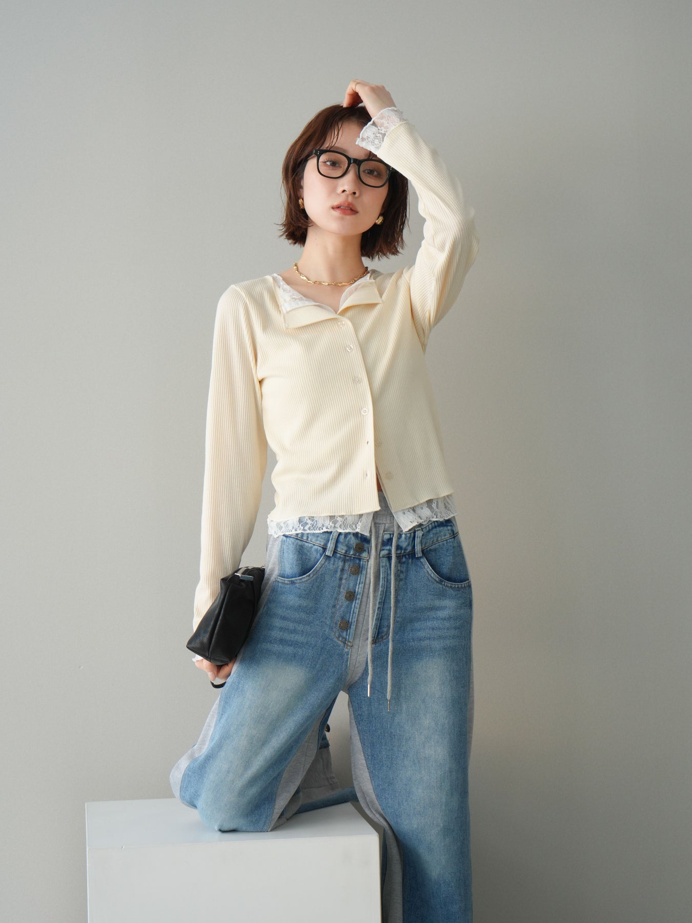 テレコリブ素材に繊細なレースをドッキングし、程よい甘さと大人っぽさを兼ね備えたカーディガン。すっきりとしたリブの縦ラインがシルエットをきれいに見せつつ、襟元・裾・袖口に施したレースが軽やかなアクセントを添えます。前を閉じてトップスとしても、開けて羽織りとしても着用しやすく、レイヤード次第で表情の変化を楽しめる一着。デイリーからきれいめスタイルまで幅広く活躍します。 ※ボトムス、キャミソール(インナー)以外の商品は一律でインナーは付属していません。