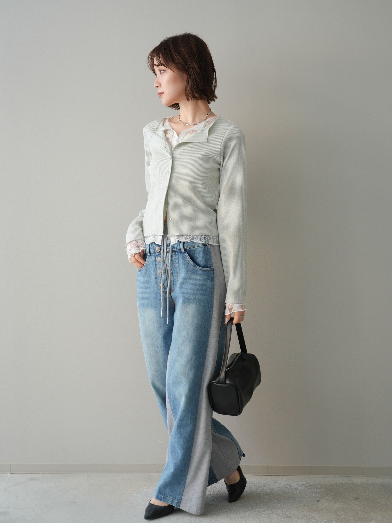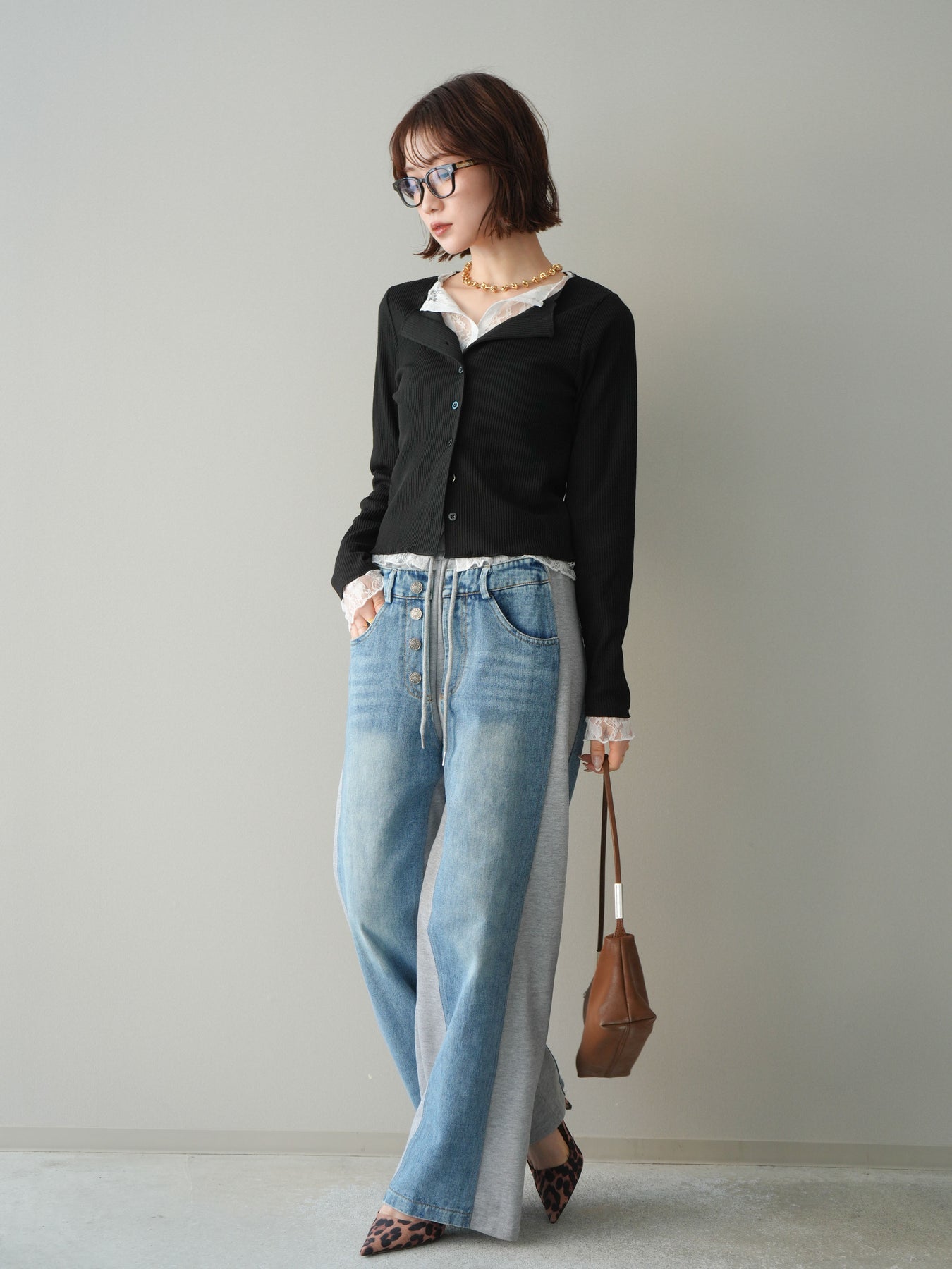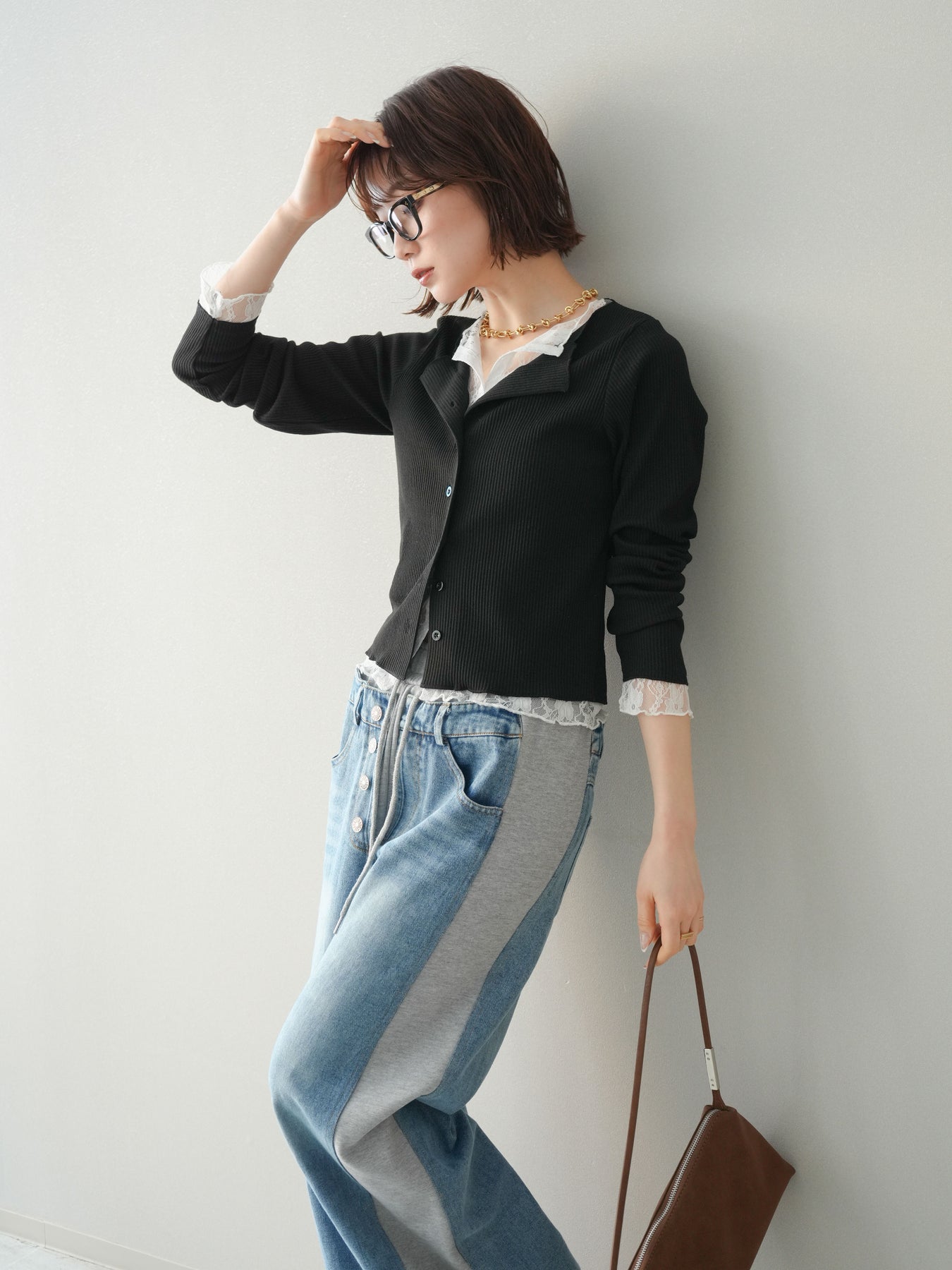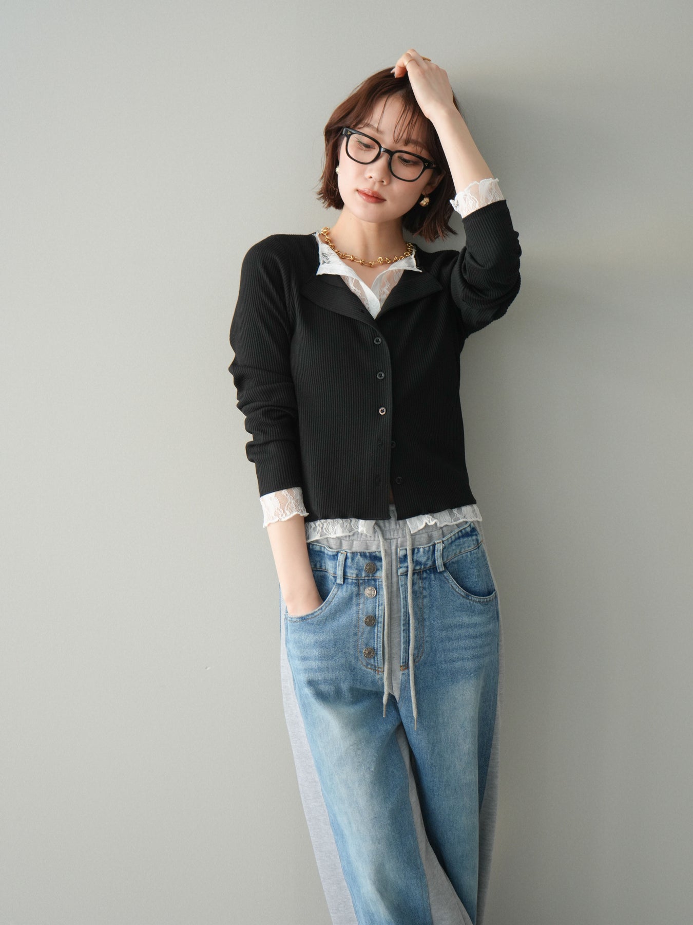 [SET]レースドッキングテレコリブカーディガン+デニム切替スウェットパンツ(2set)
