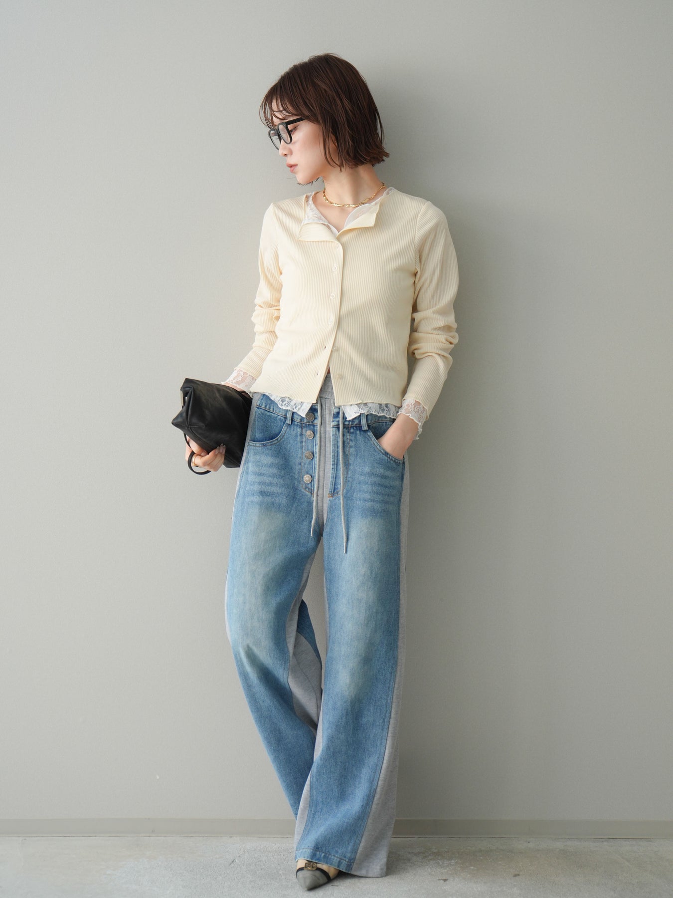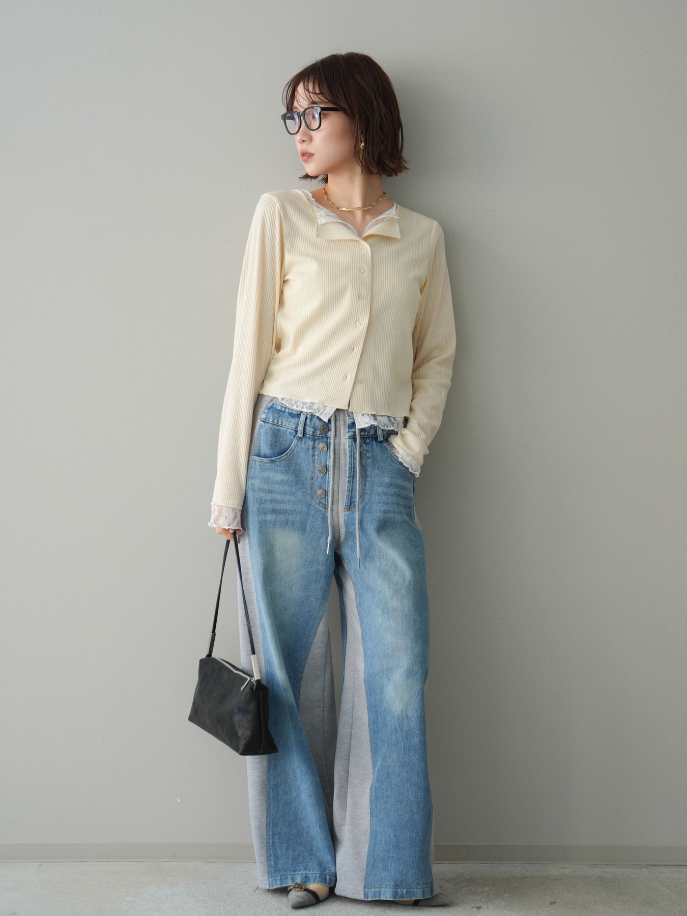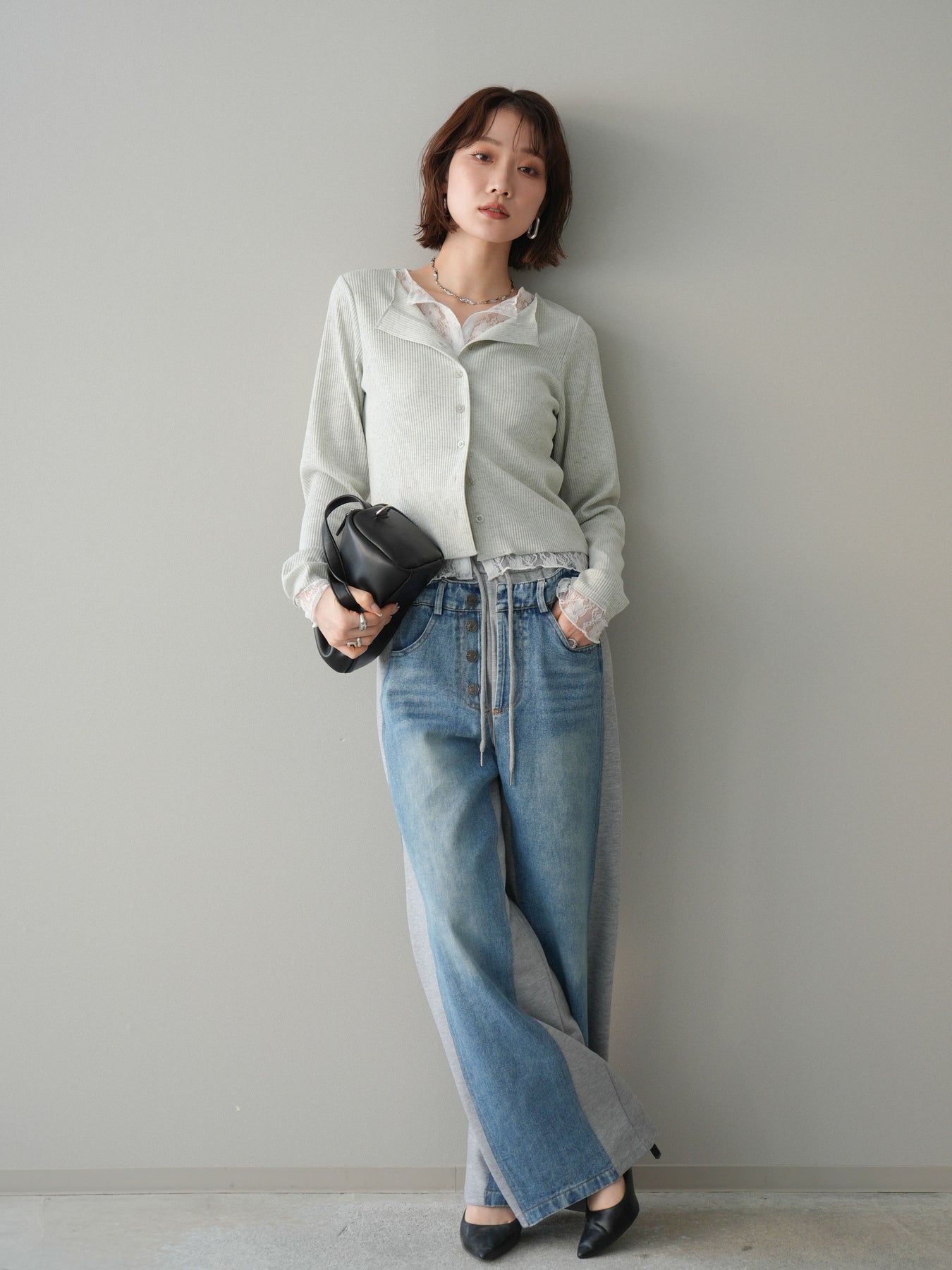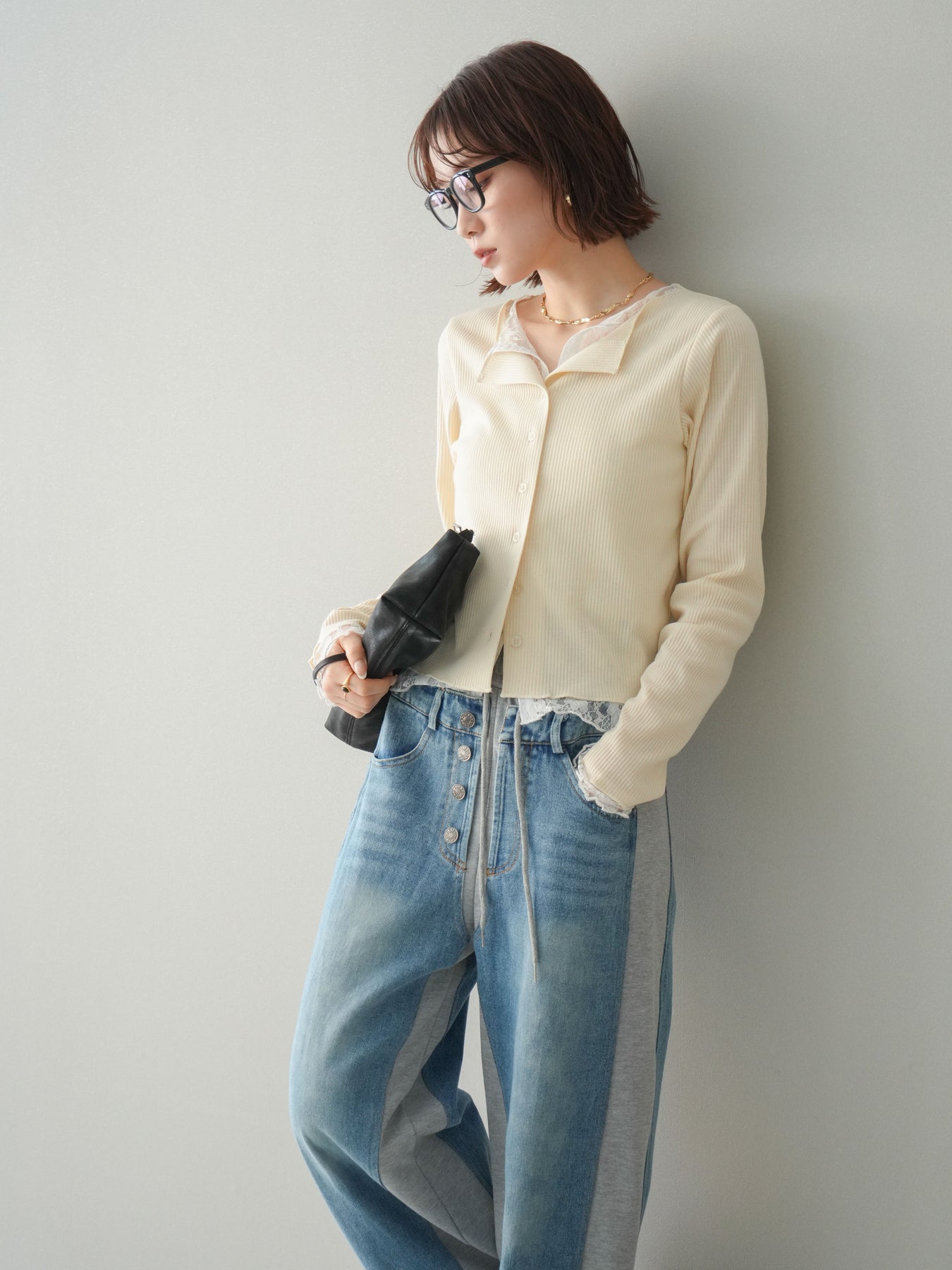 [SET]レースドッキングテレコリブカーディガン+デニム切替スウェットパンツ(2set)