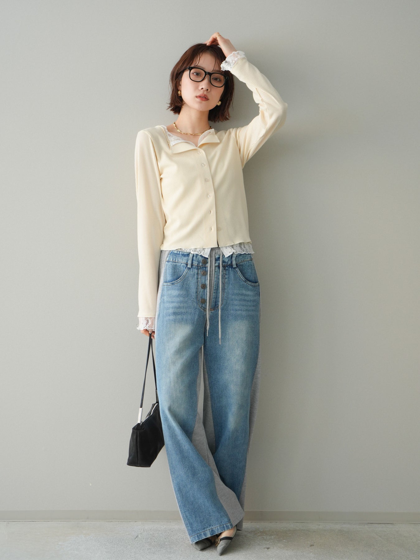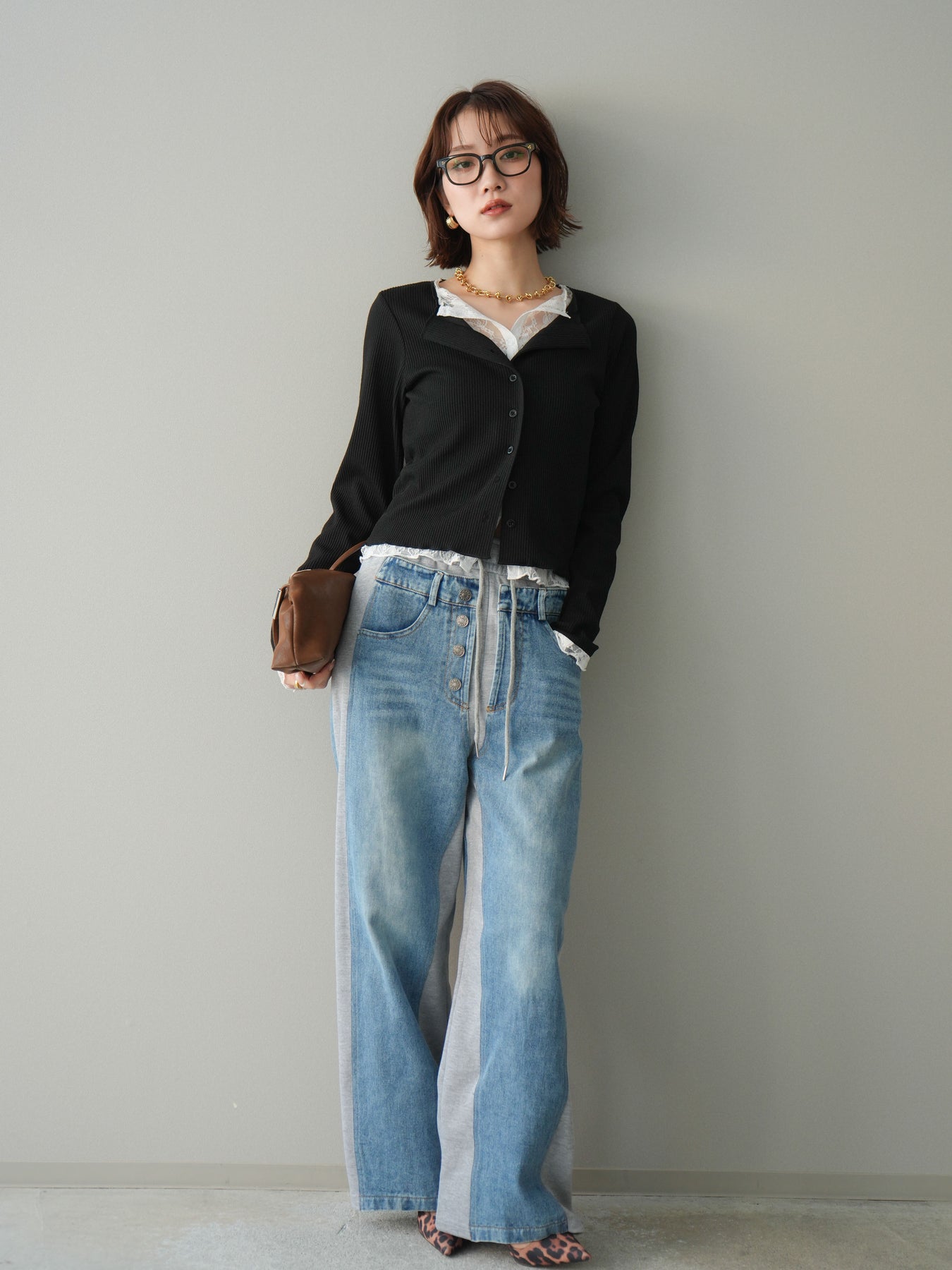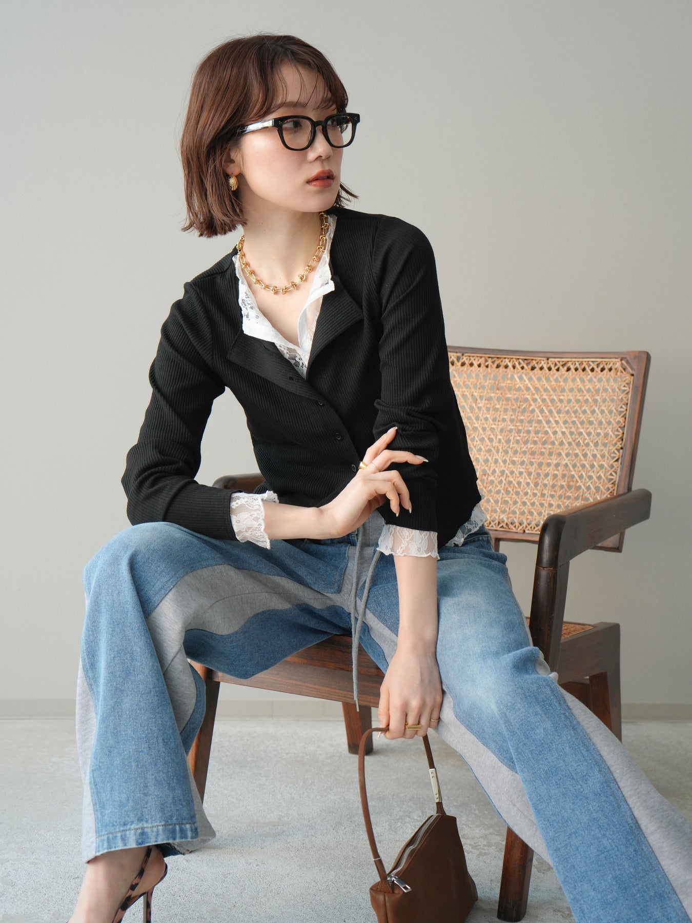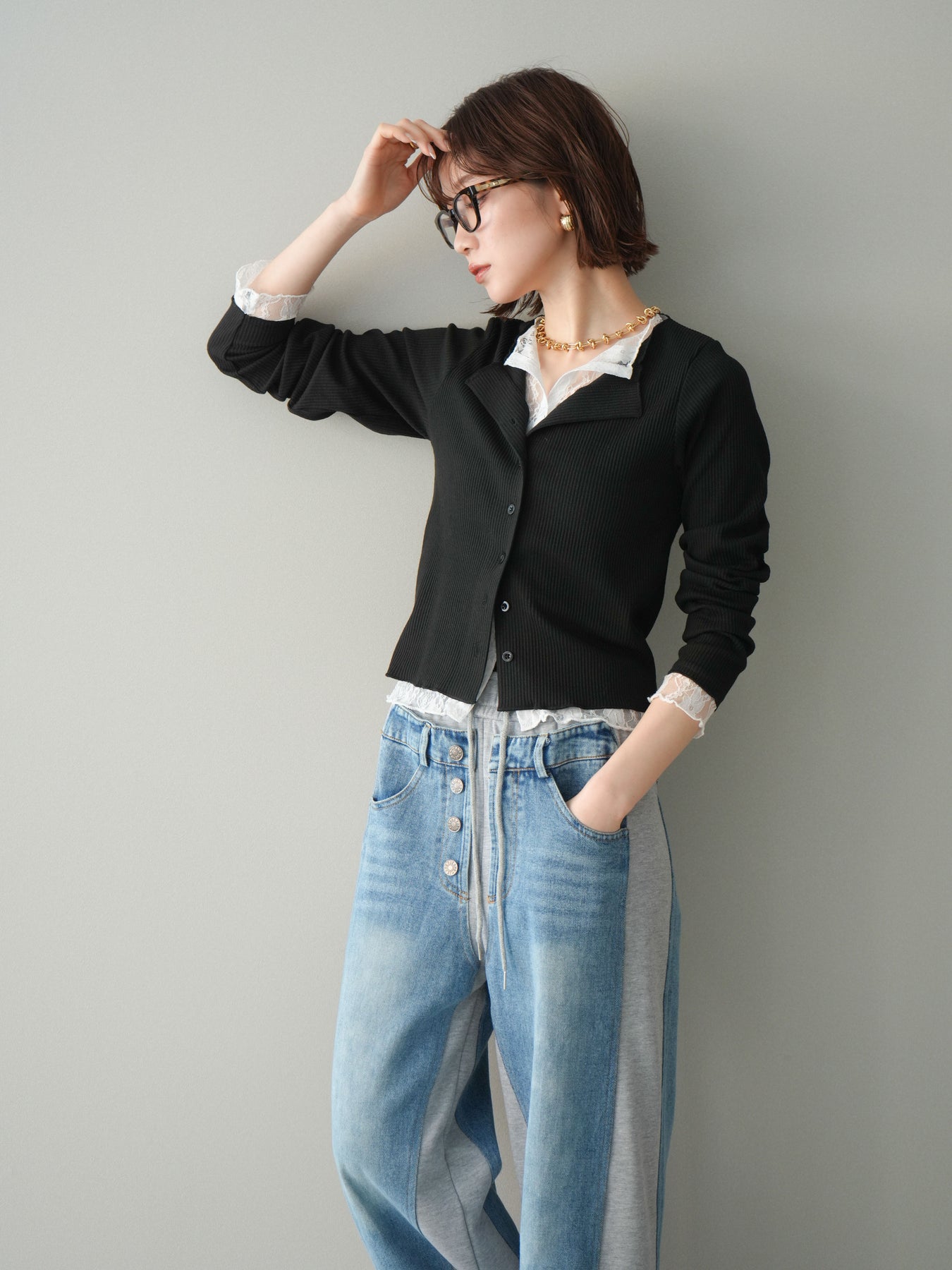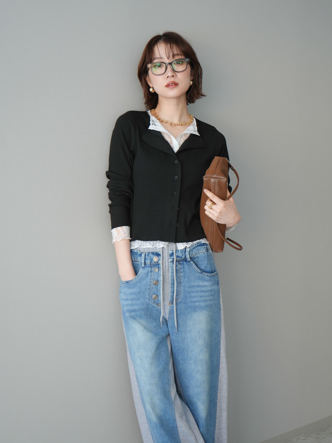 [SET]レースドッキングテレコリブカーディガン+デニム切替スウェットパンツ(2set)