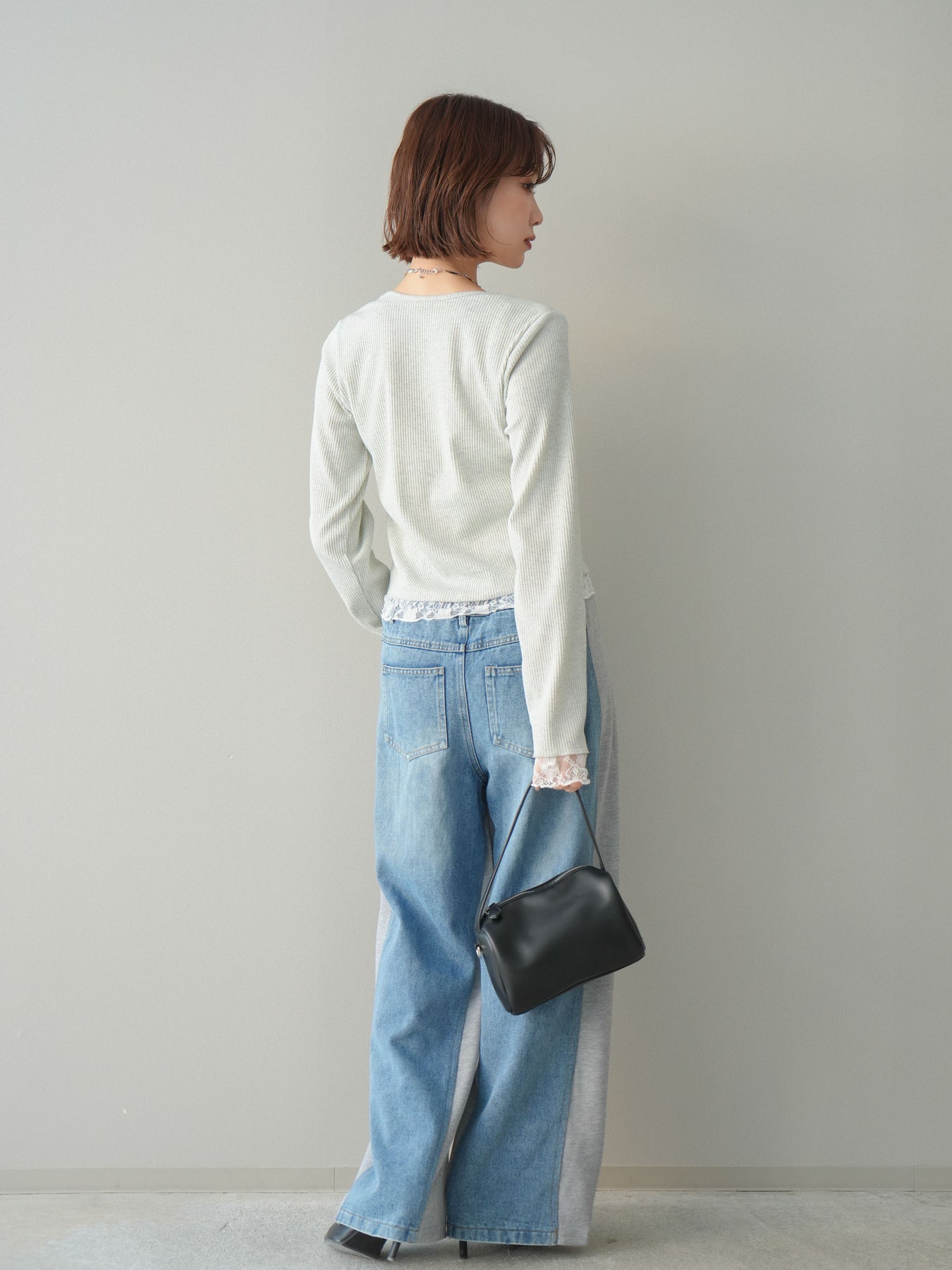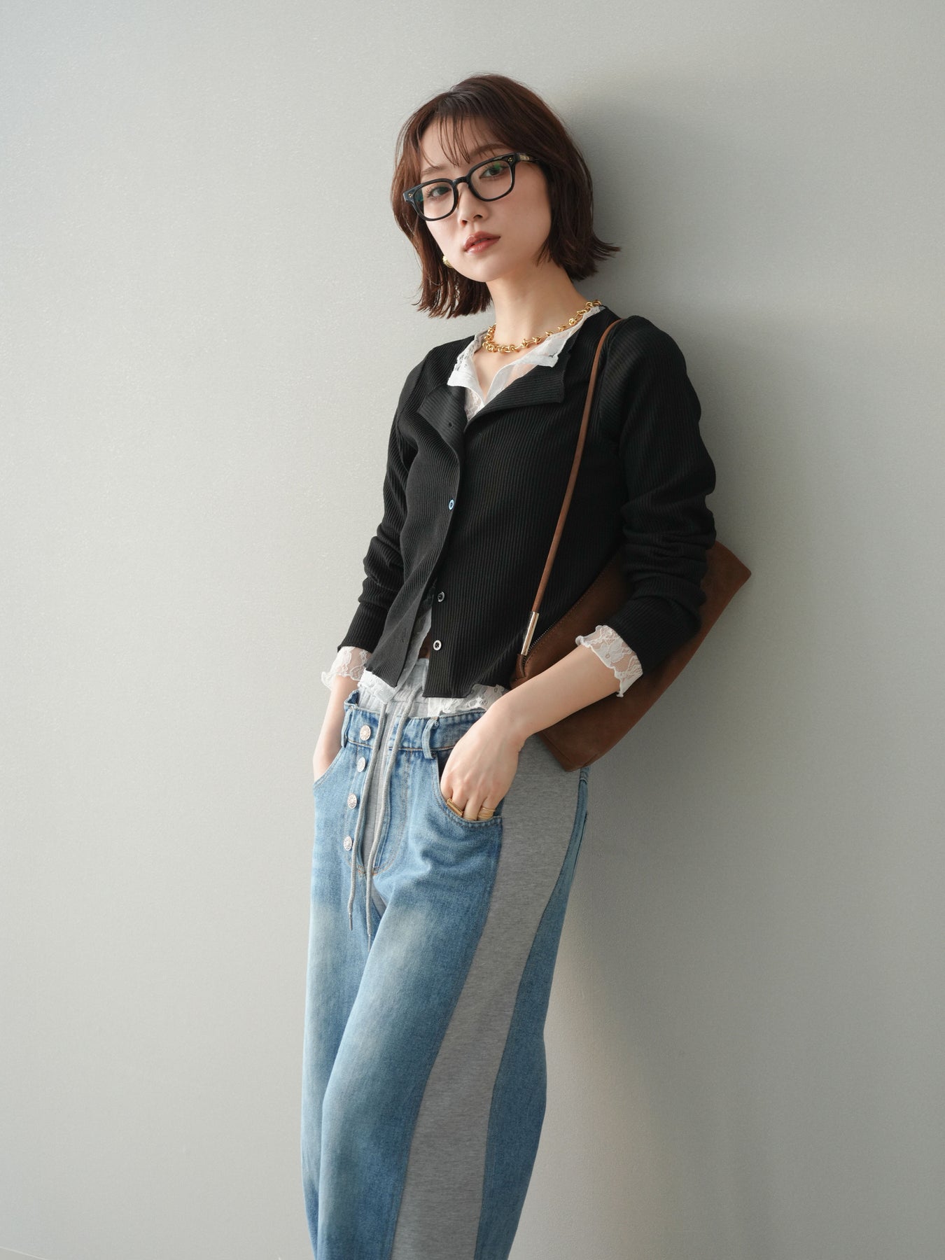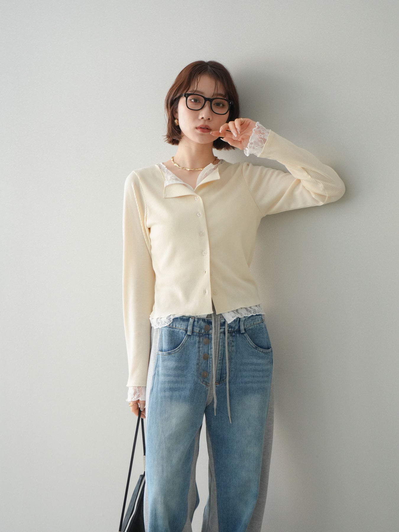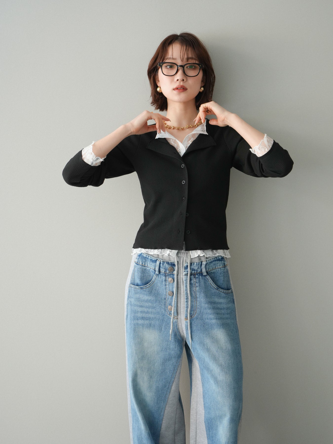 [SET]レースドッキングテレコリブカーディガン+デニム切替スウェットパンツ(2set)