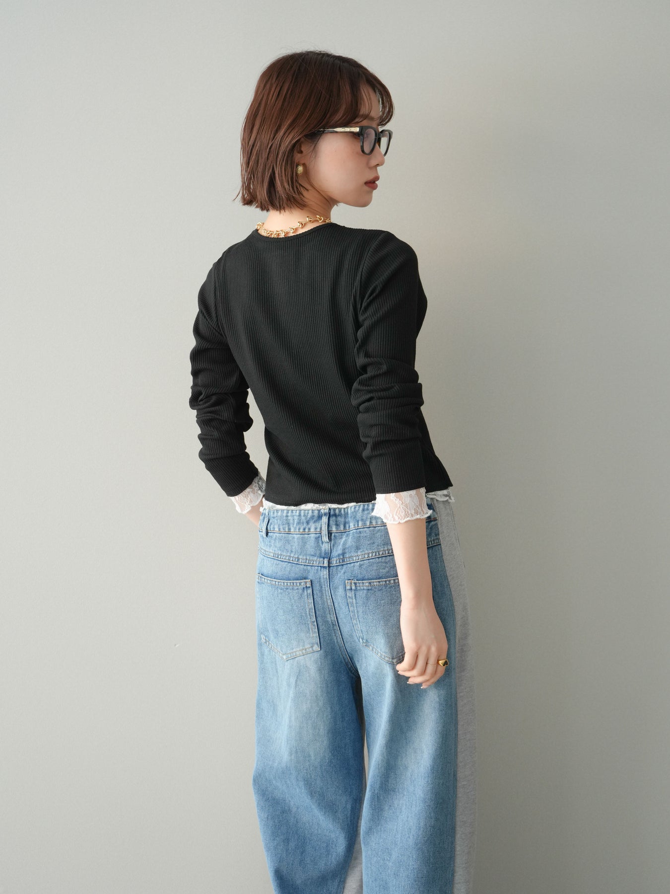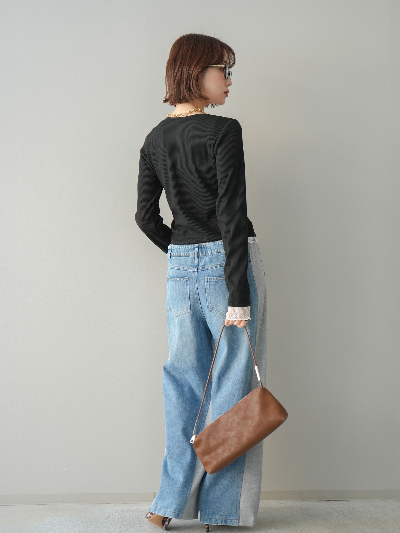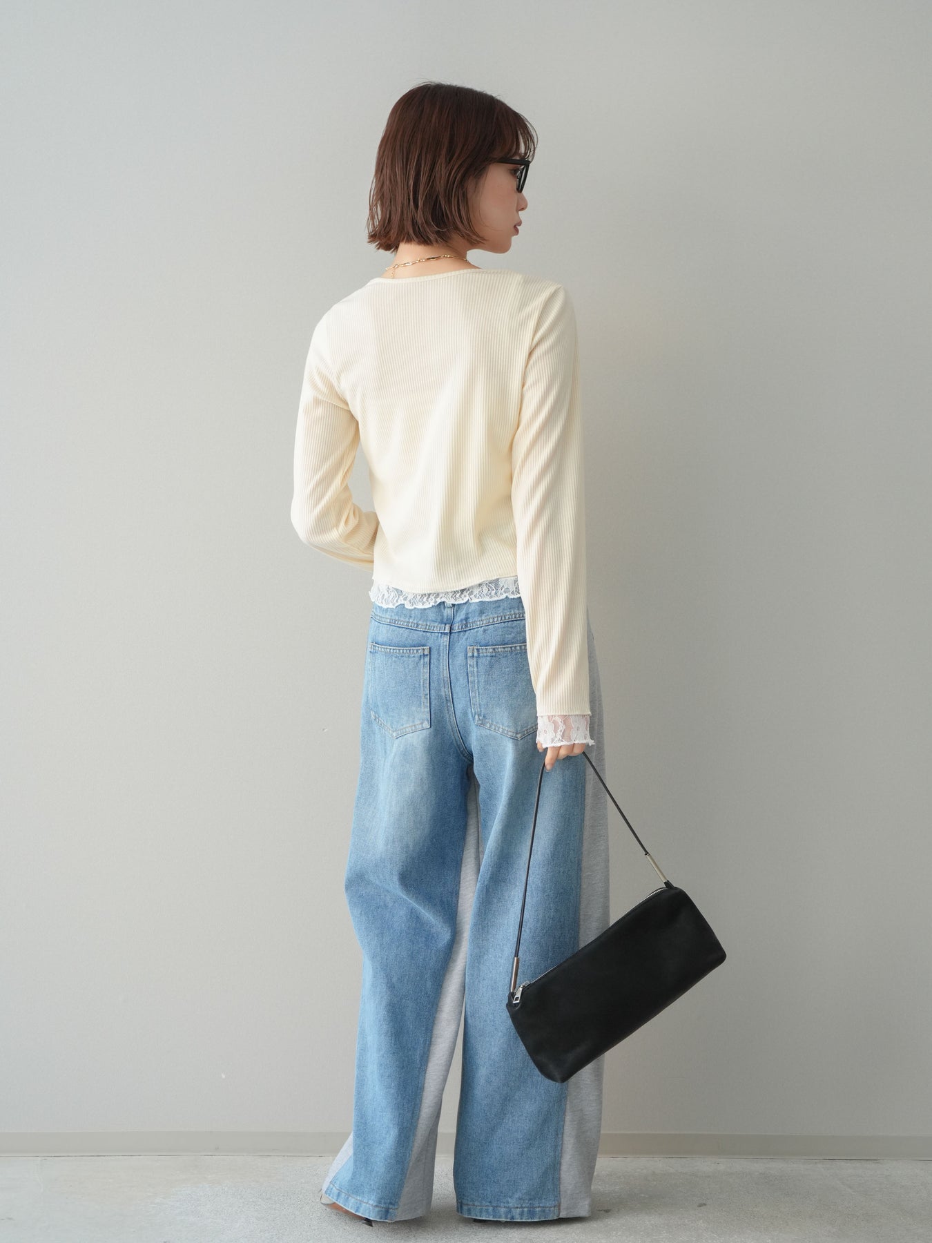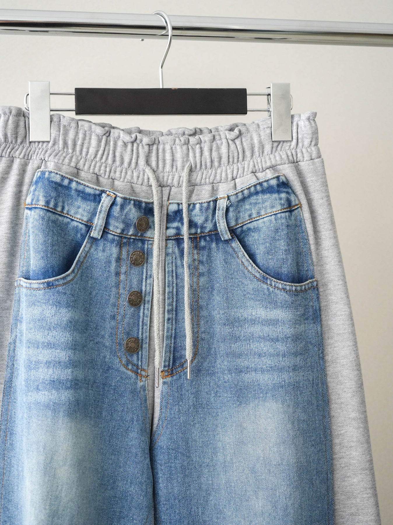 [SET]レースドッキングテレコリブカーディガン+デニム切替スウェットパンツ(2set)