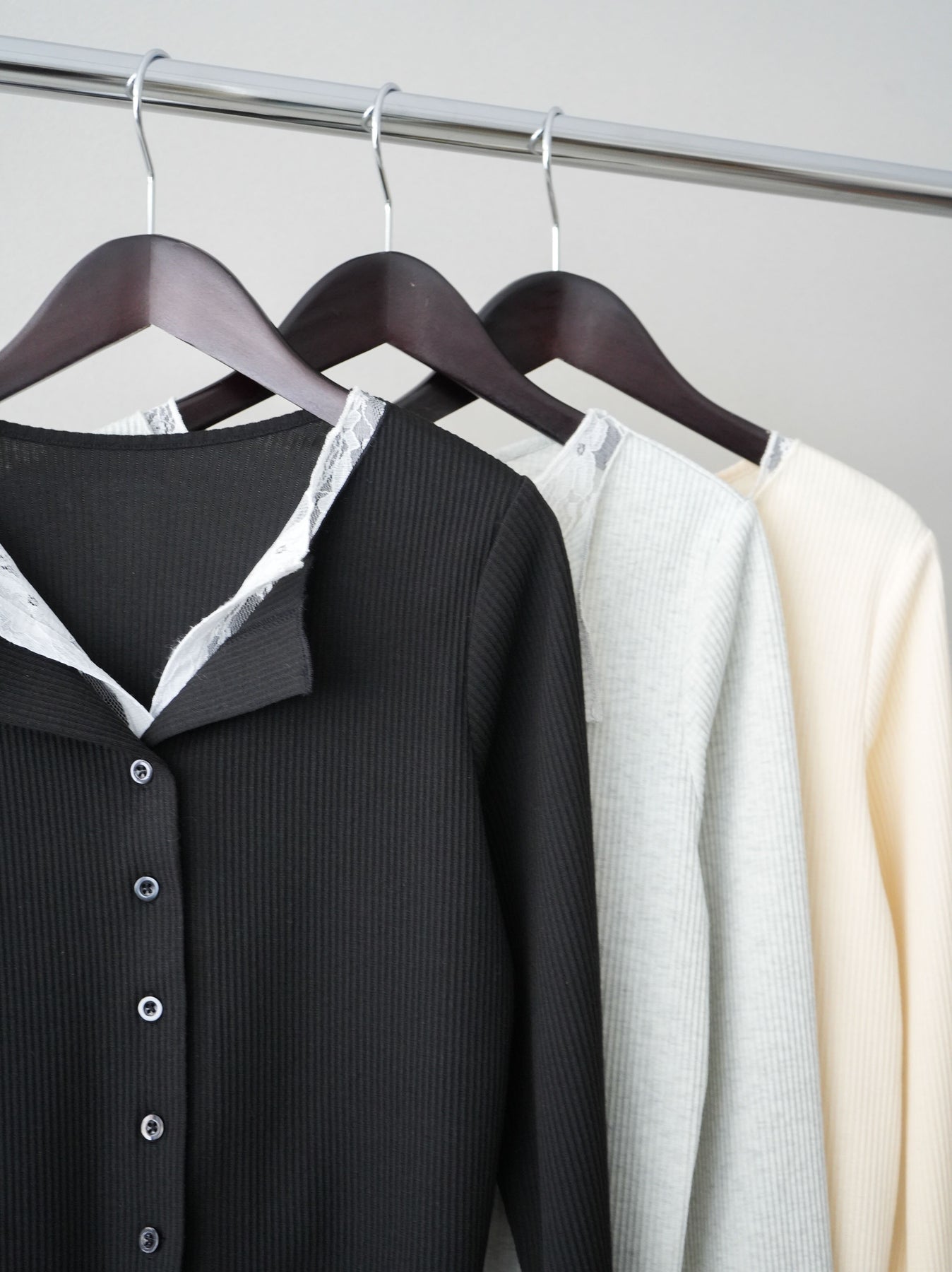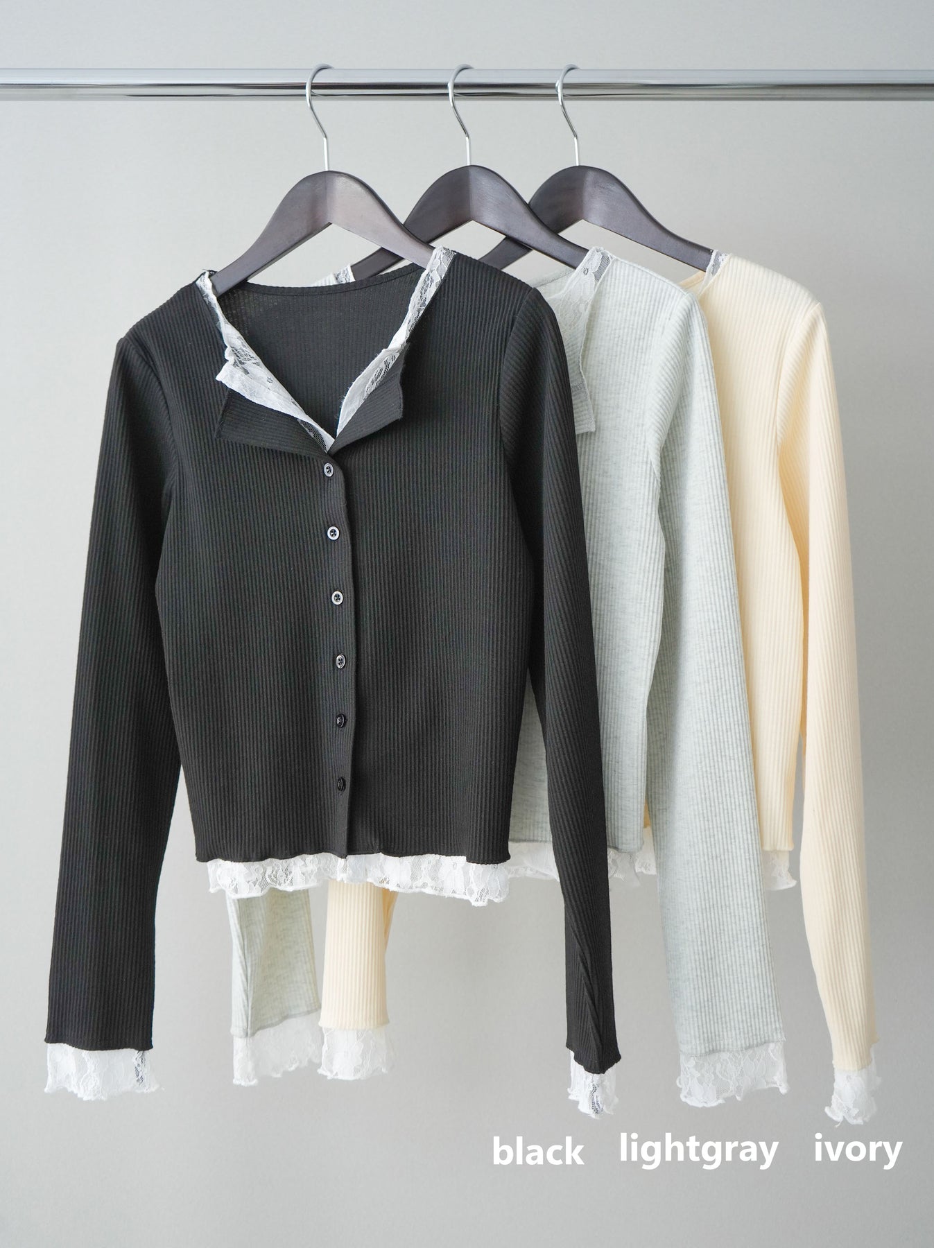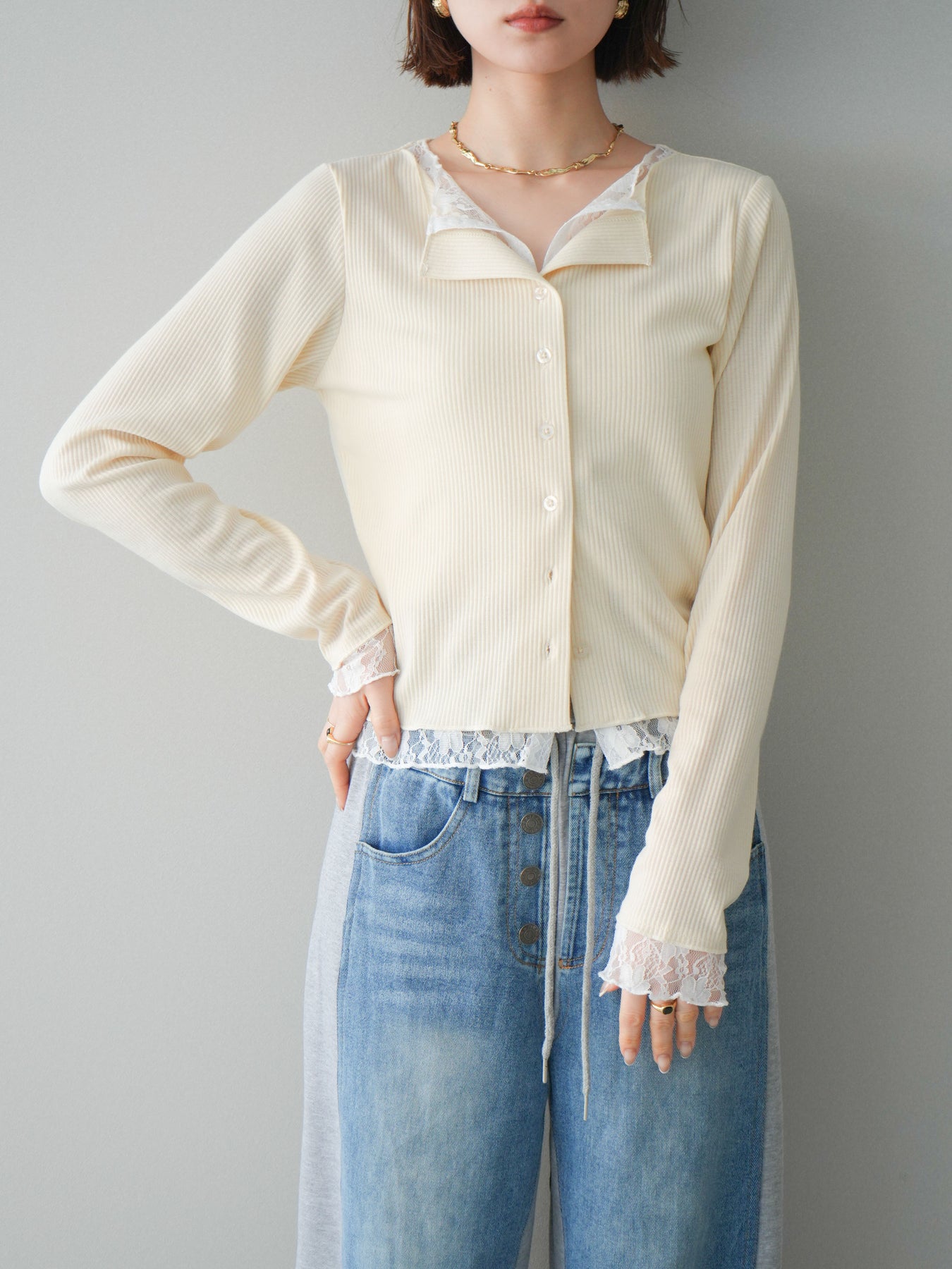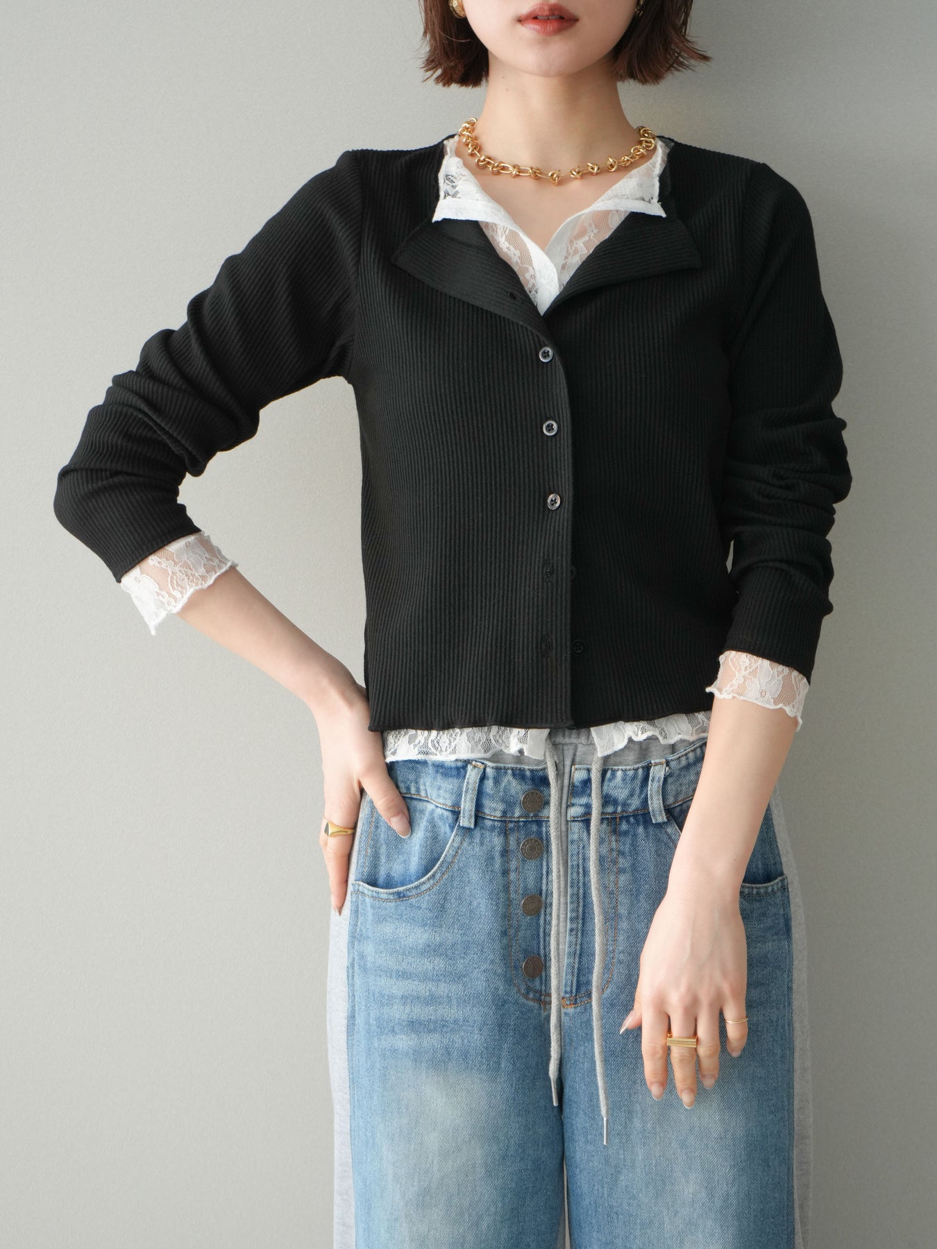 テレコリブ素材に繊細なレースをドッキングし、程よい甘さと大人っぽさを兼ね備えたカーディガン。すっきりとしたリブの縦ラインがシルエットをきれいに見せつつ、襟元・裾・袖口に施したレースが軽やかなアクセントを添えます。前を閉じてトップスとしても、開けて羽織りとしても着用しやすく、レイヤード次第で表情の変化を楽しめる一着。デイリーからきれいめスタイルまで幅広く活躍します。 ※ボトムス、キャミソール(インナー)以外の商品は一律でインナーは付属していません。