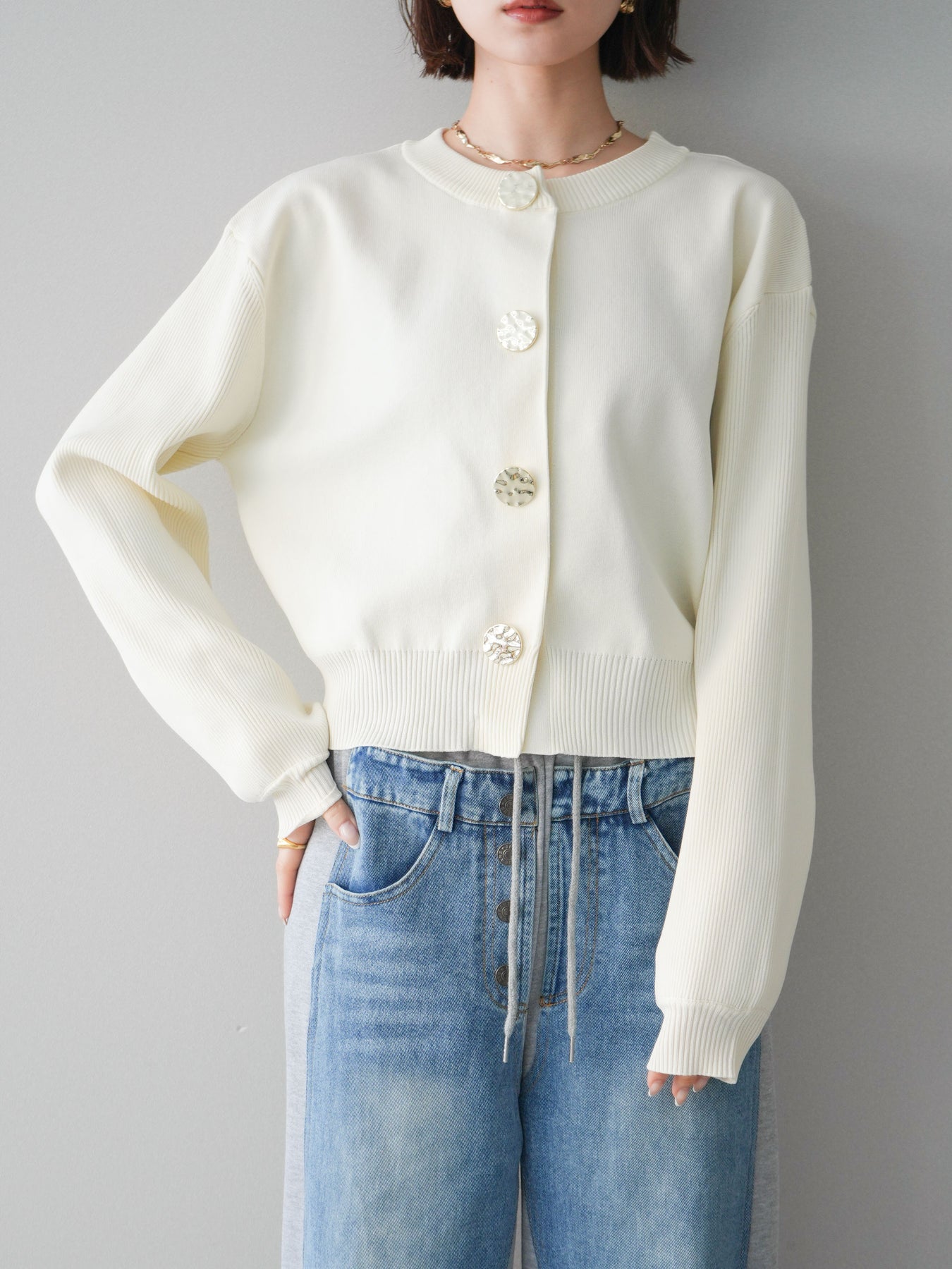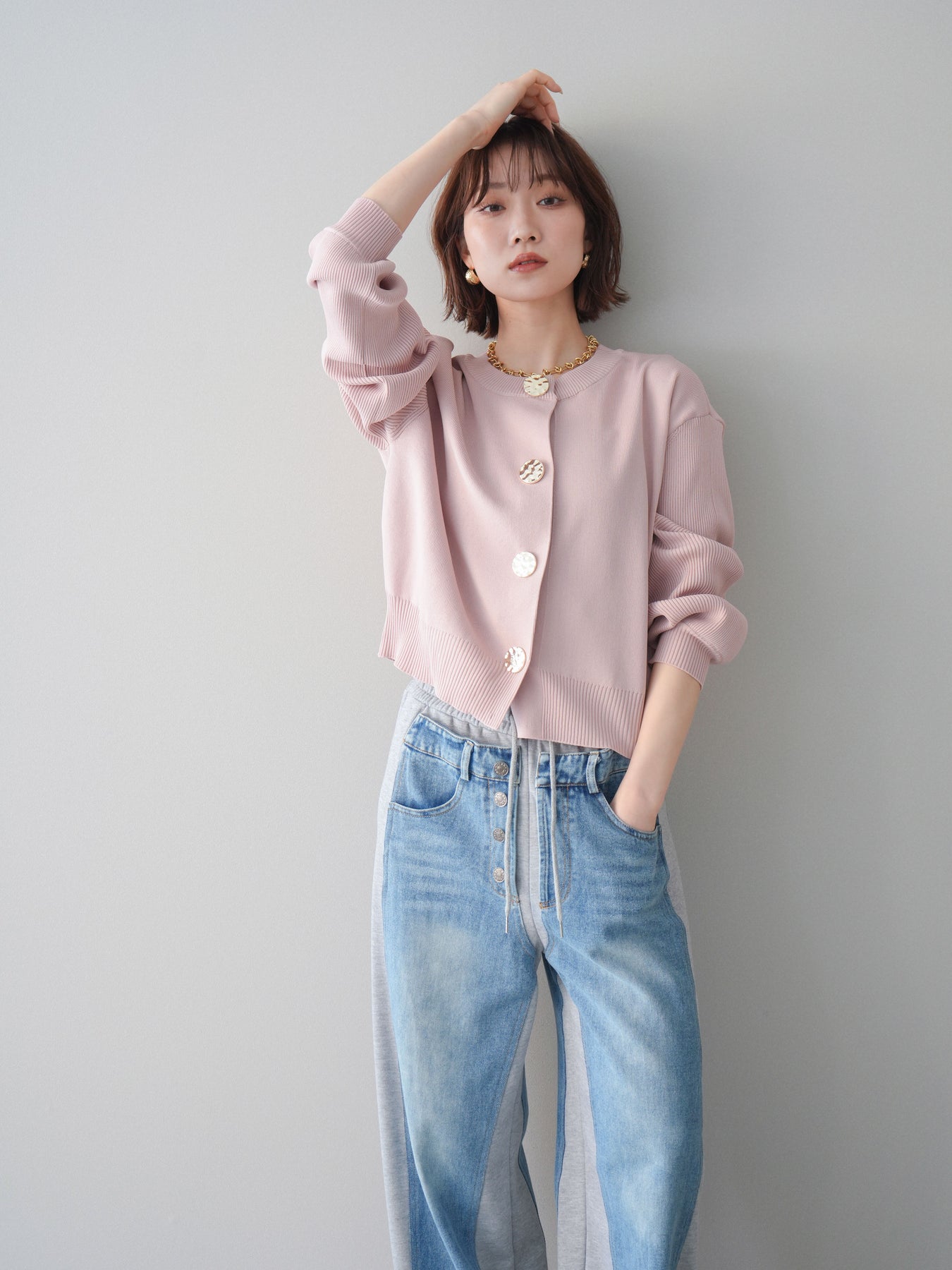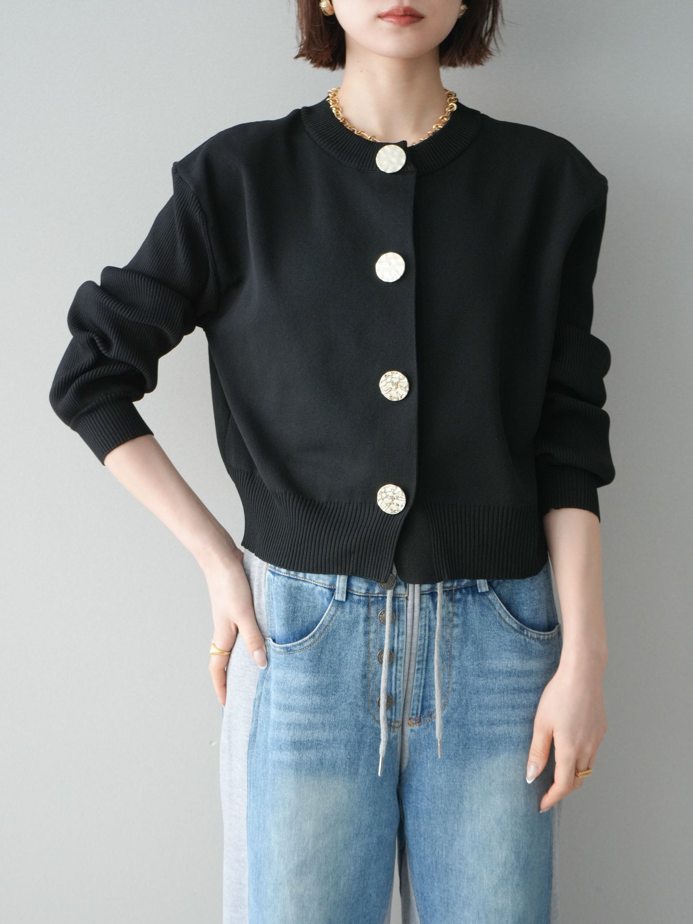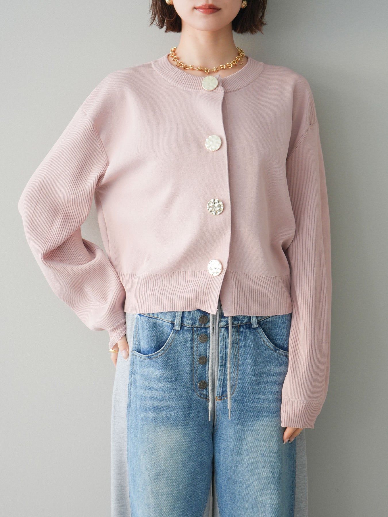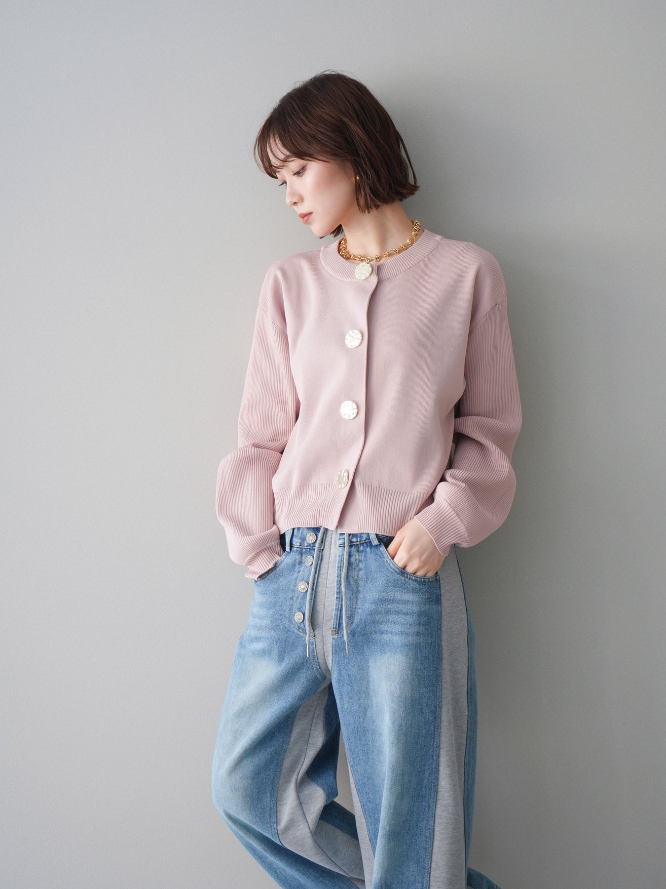 [SET]メタルボタンクルーネックニットカーディガン+デニム切替スウェットパンツ(2set)