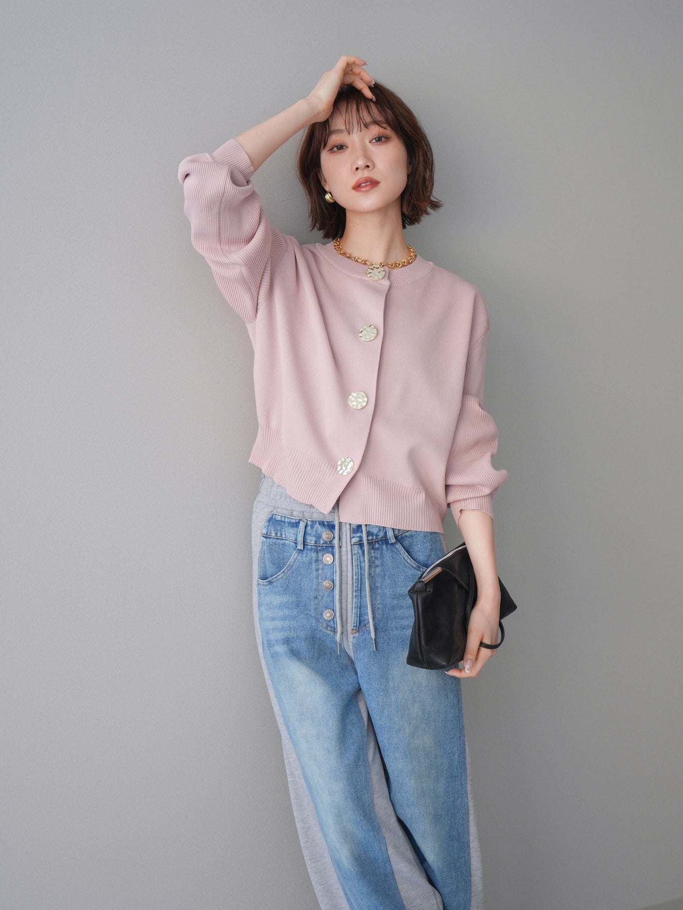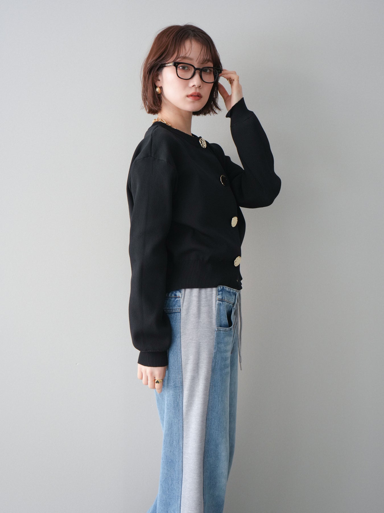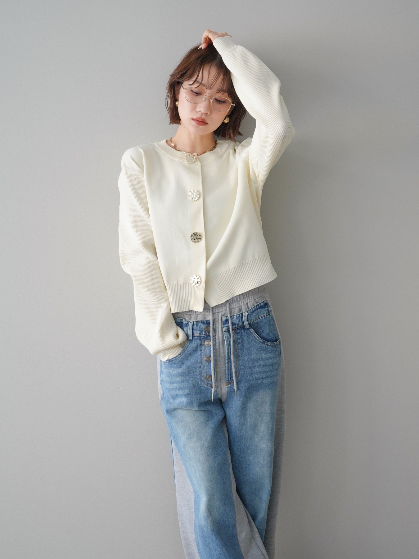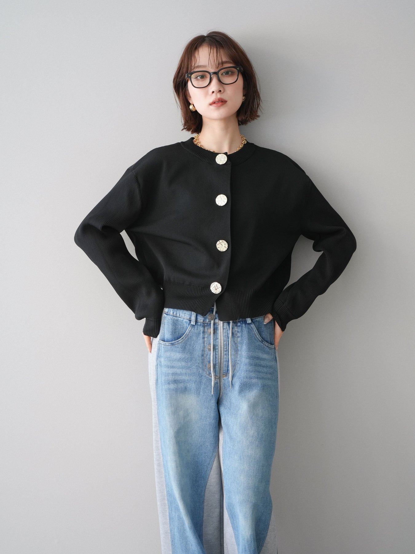 [SET]メタルボタンクルーネックニットカーディガン+デニム切替スウェットパンツ(2set)