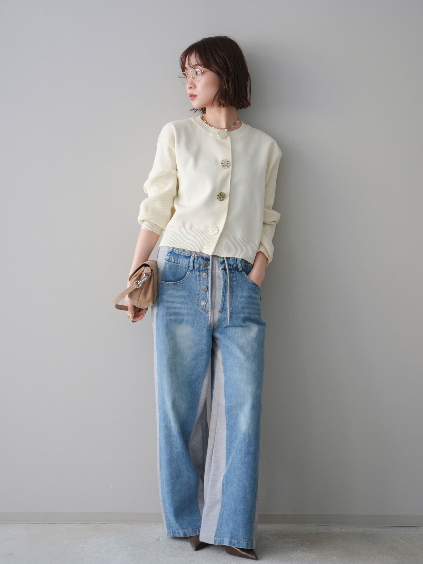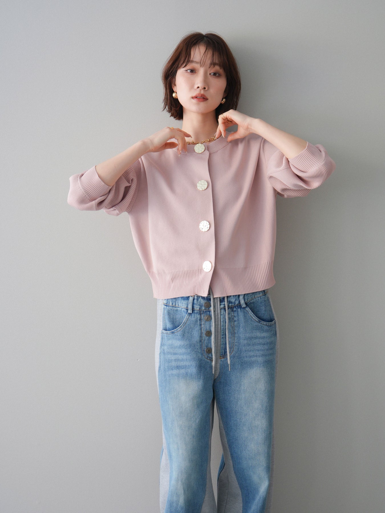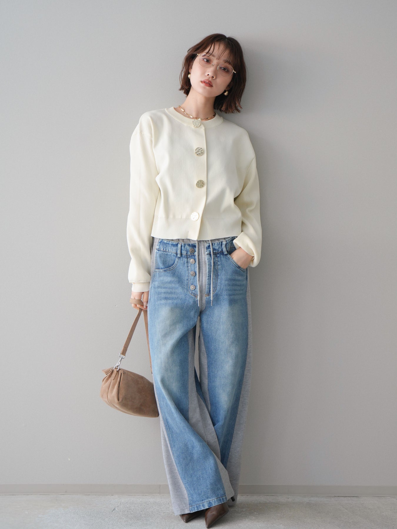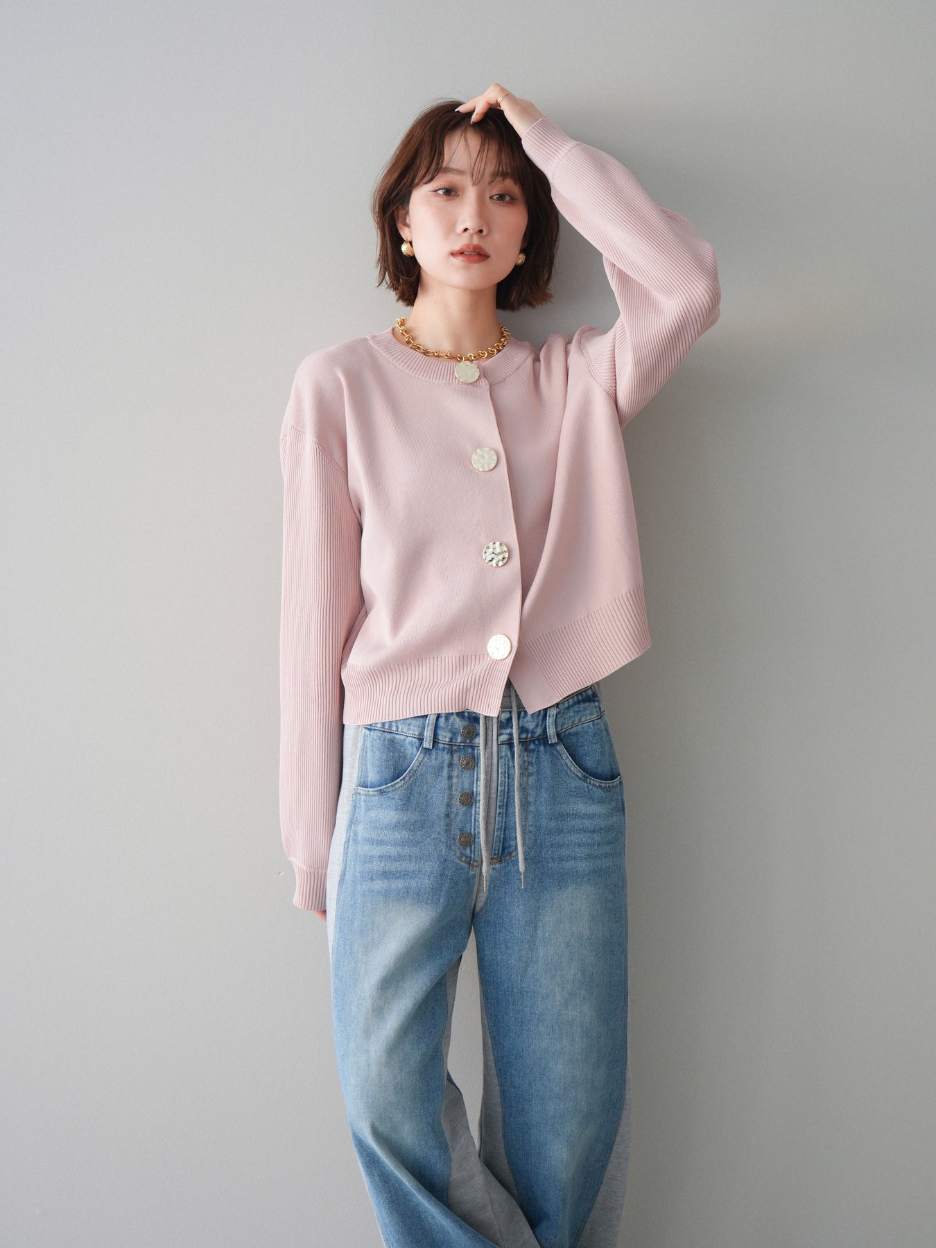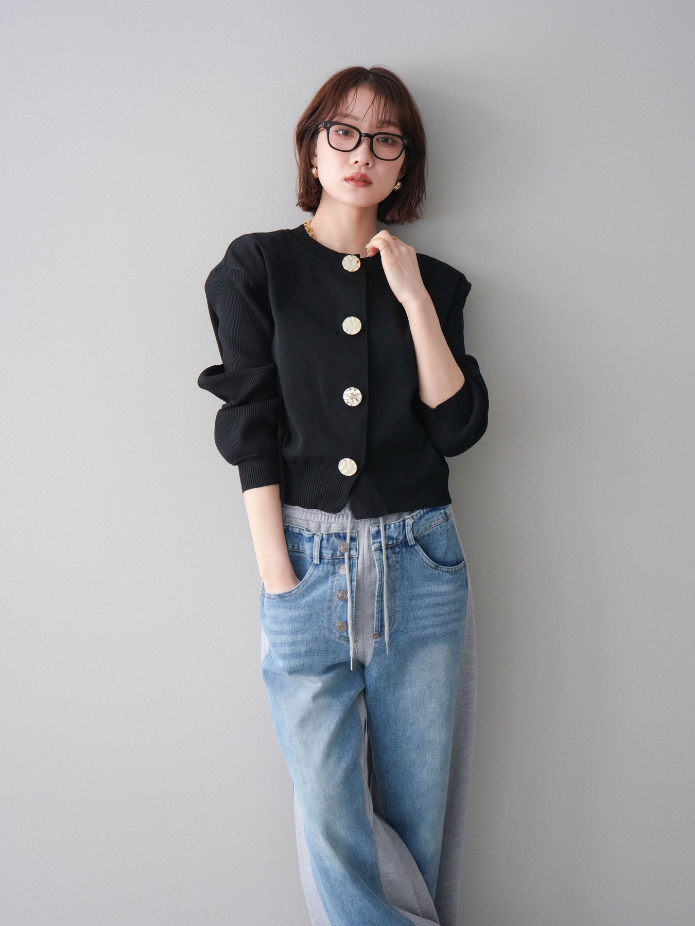 [SET]メタルボタンクルーネックニットカーディガン+デニム切替スウェットパンツ(2set)