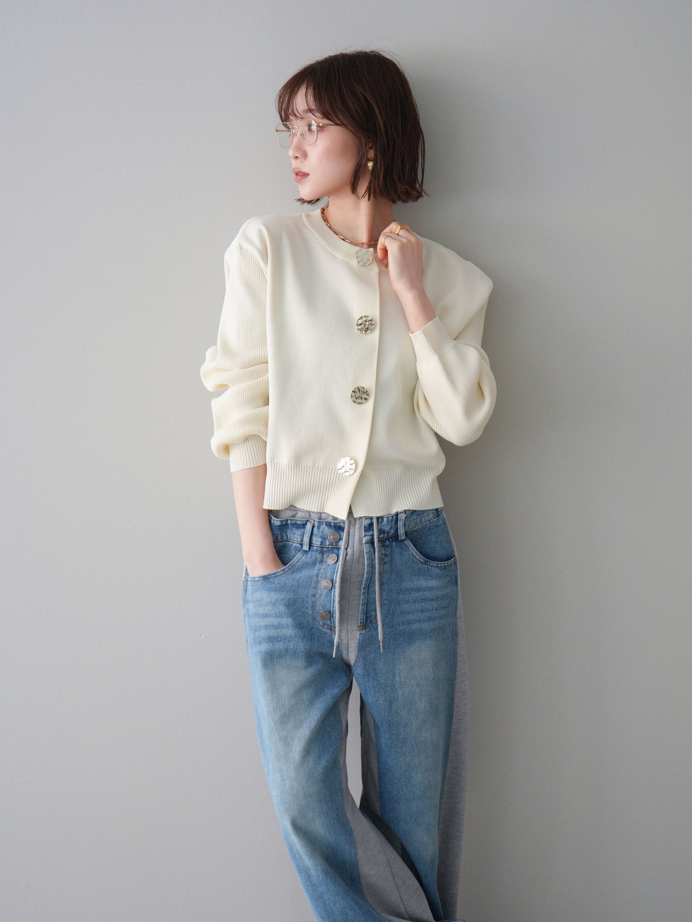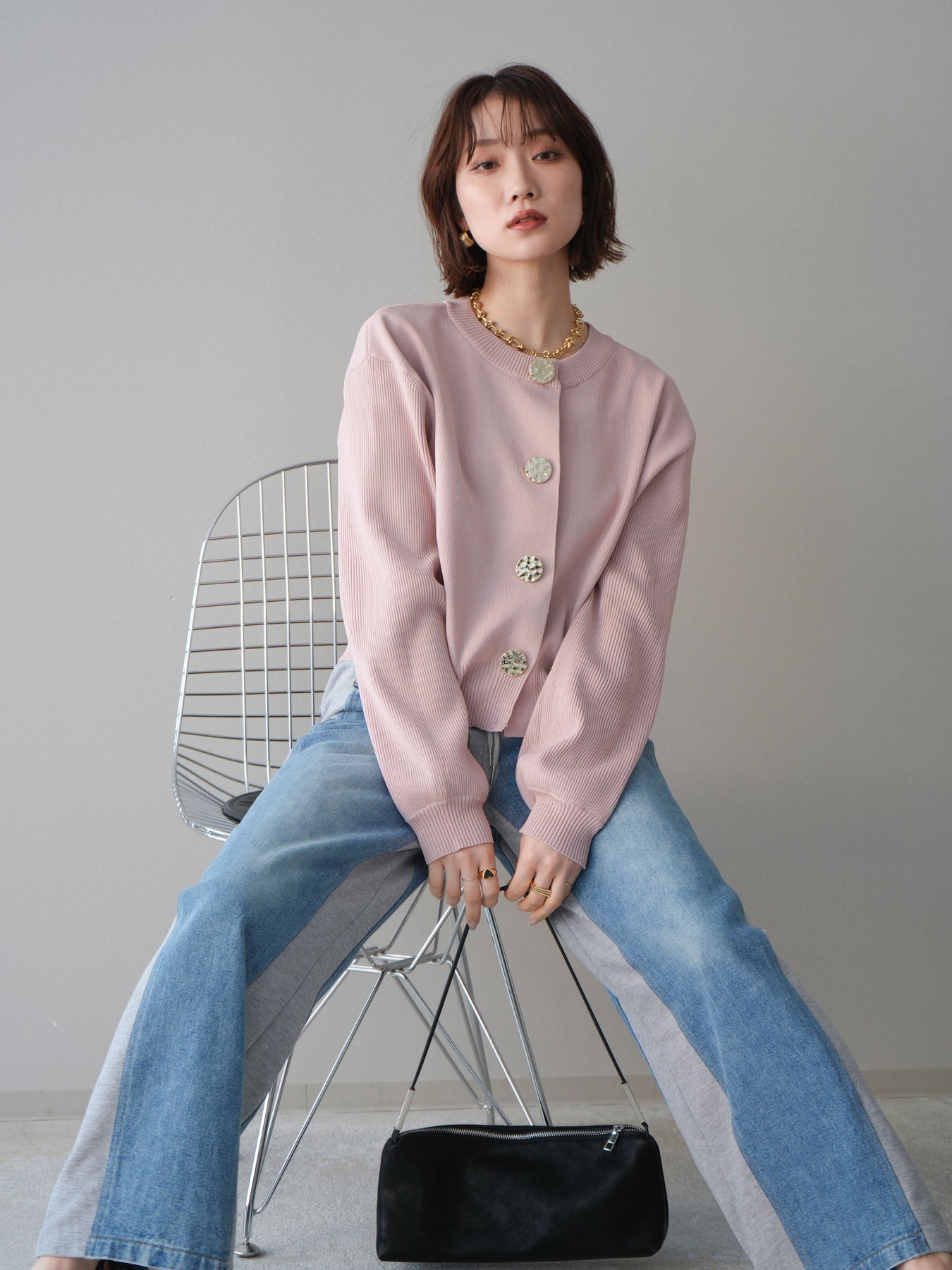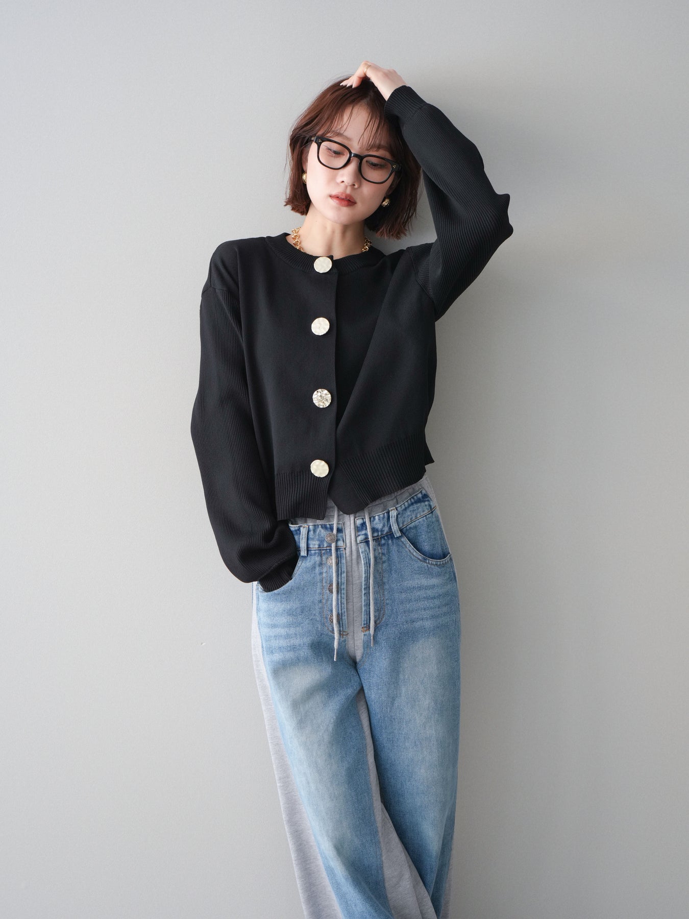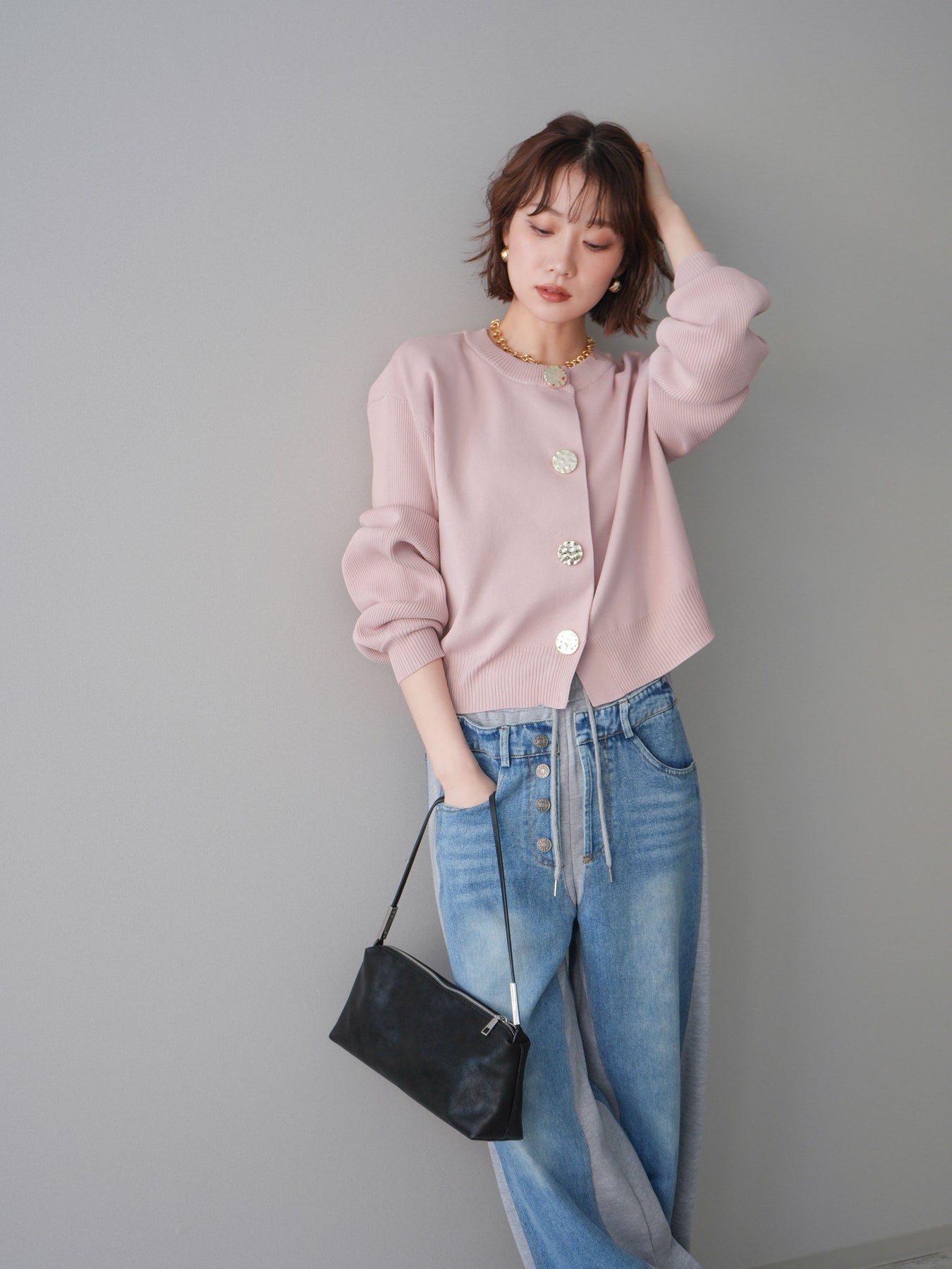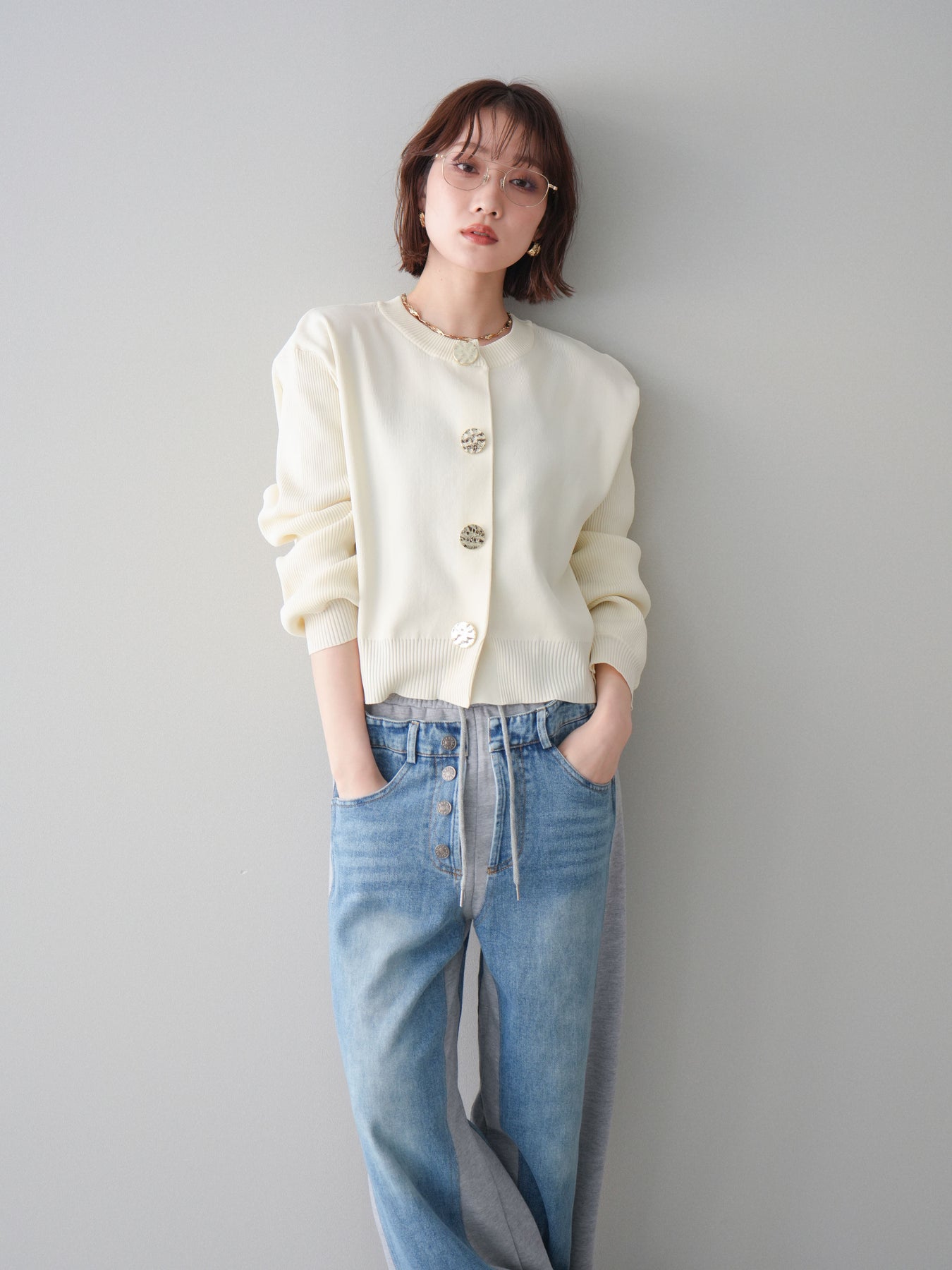 [SET]メタルボタンクルーネックニットカーディガン+デニム切替スウェットパンツ(2set)