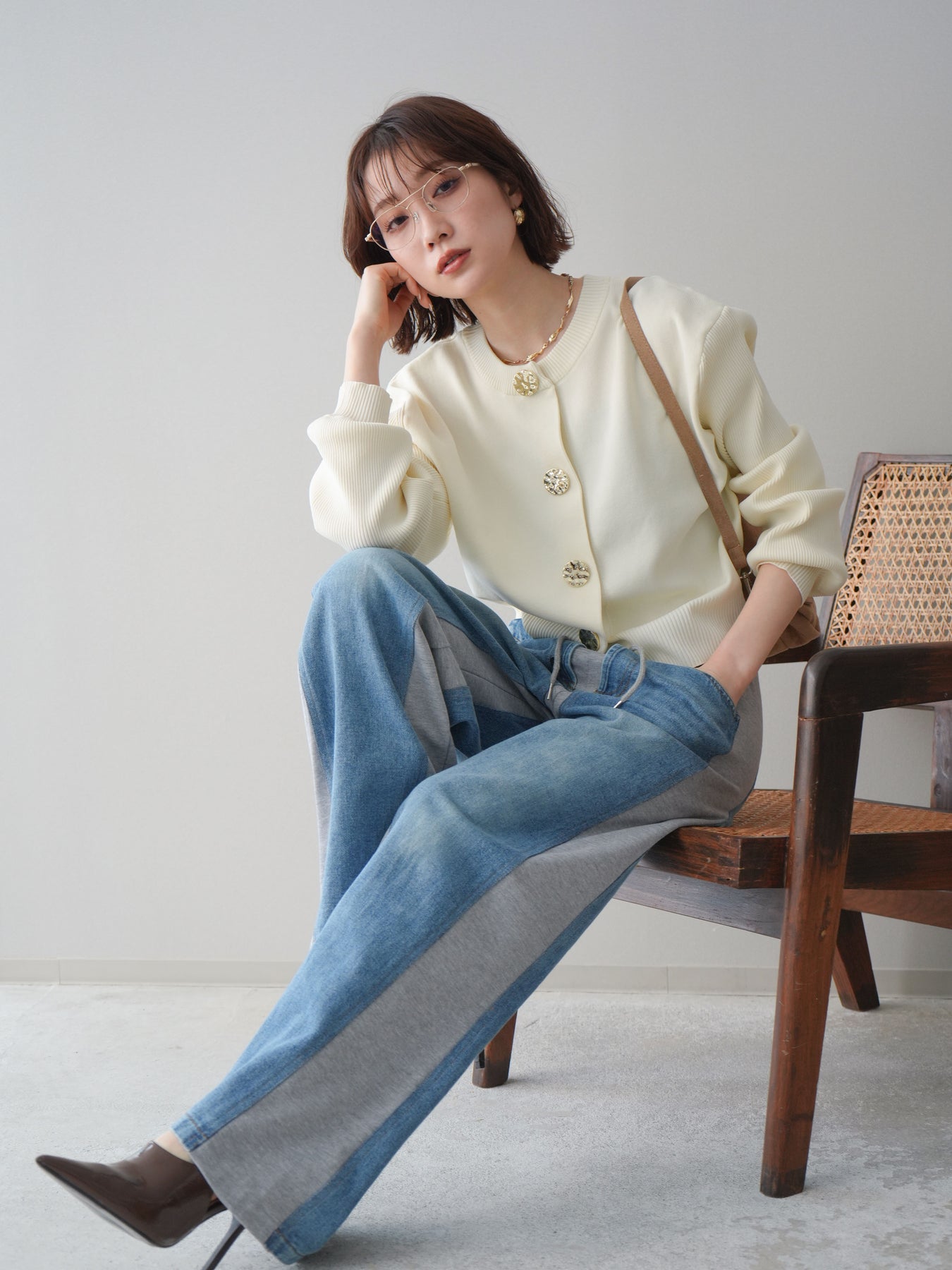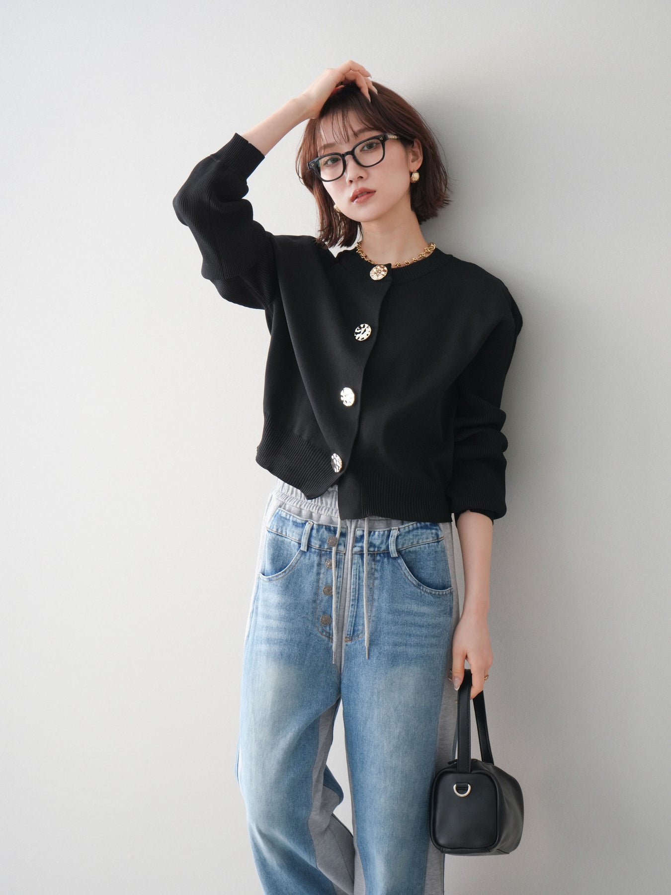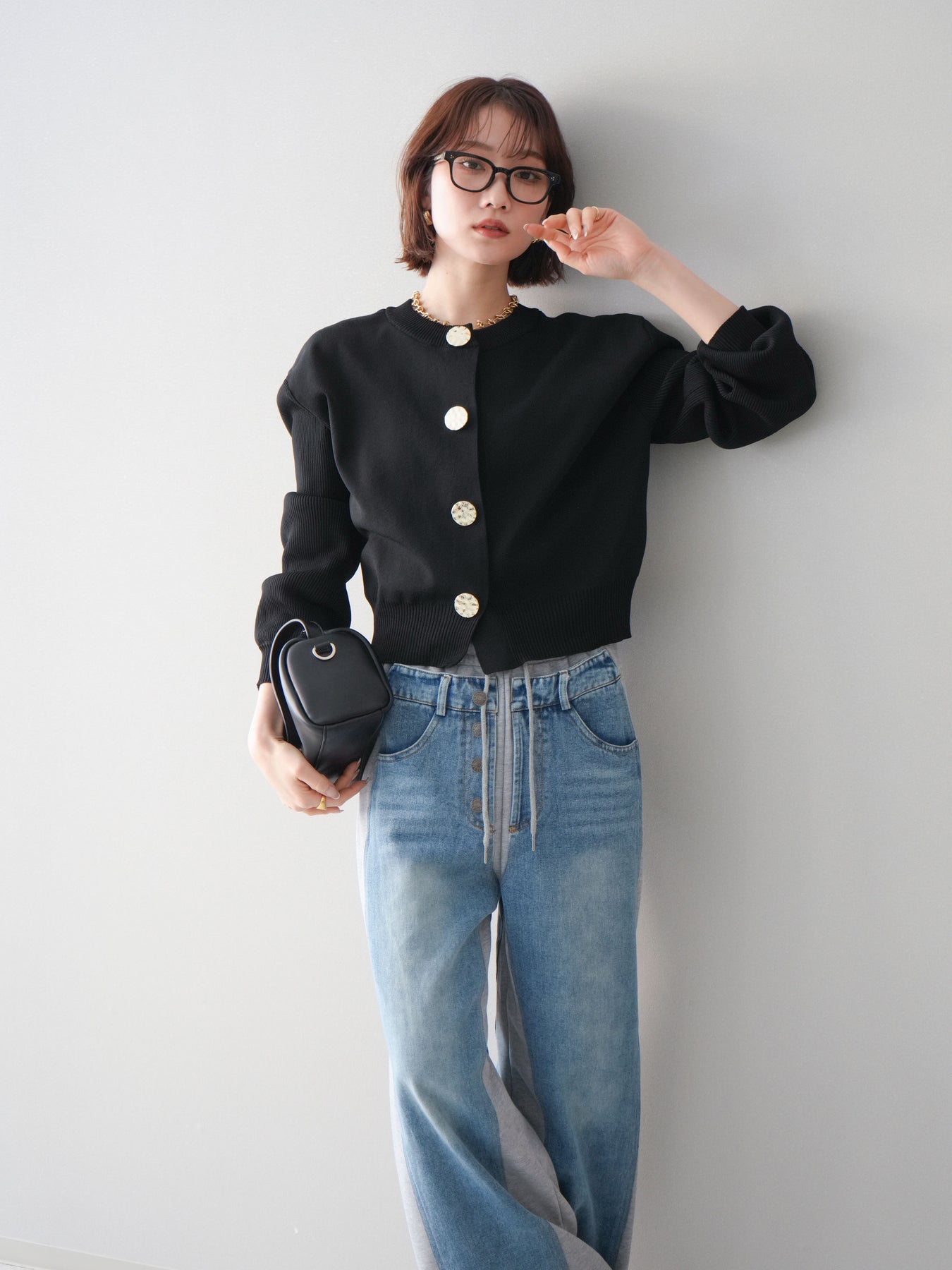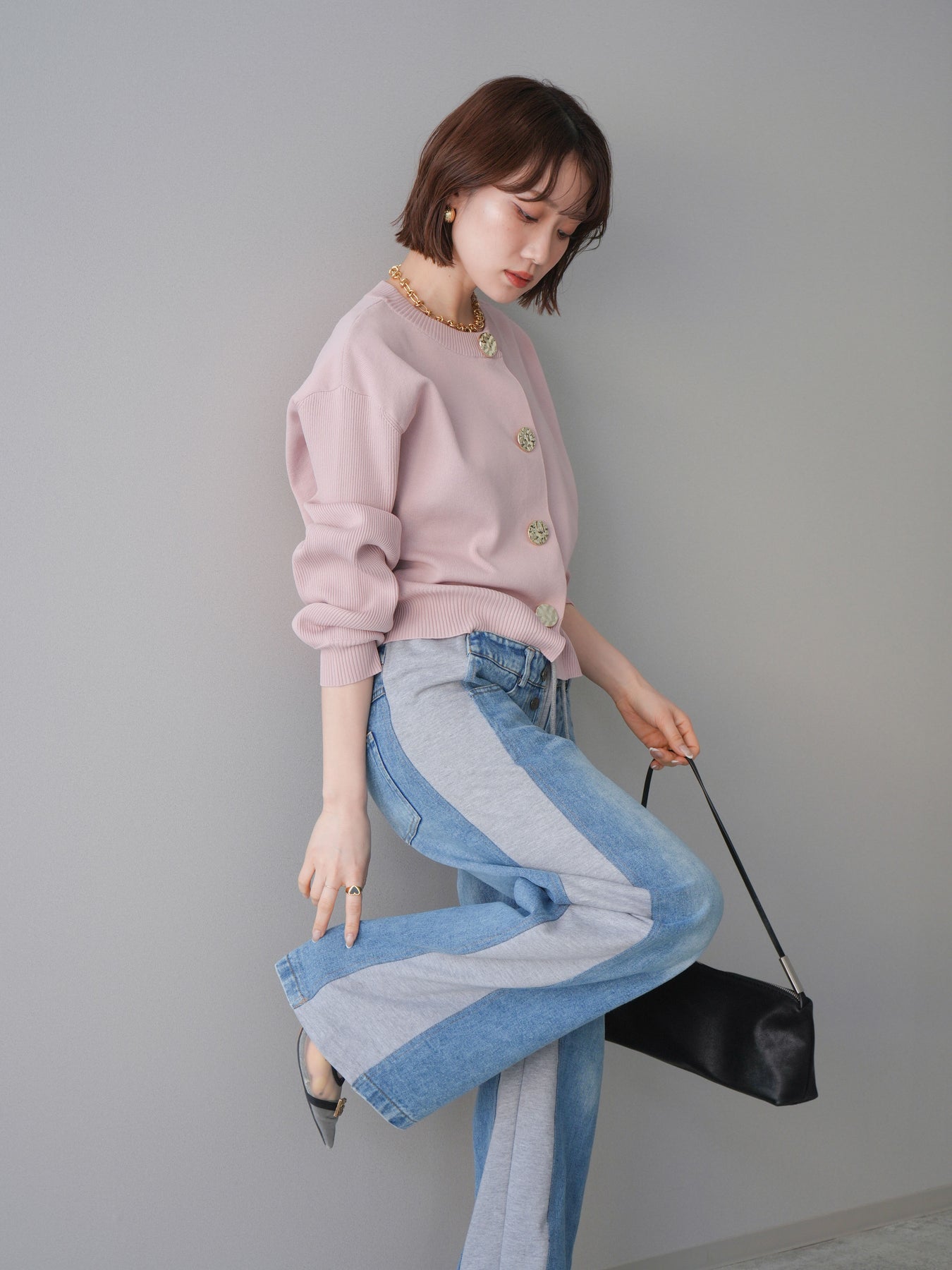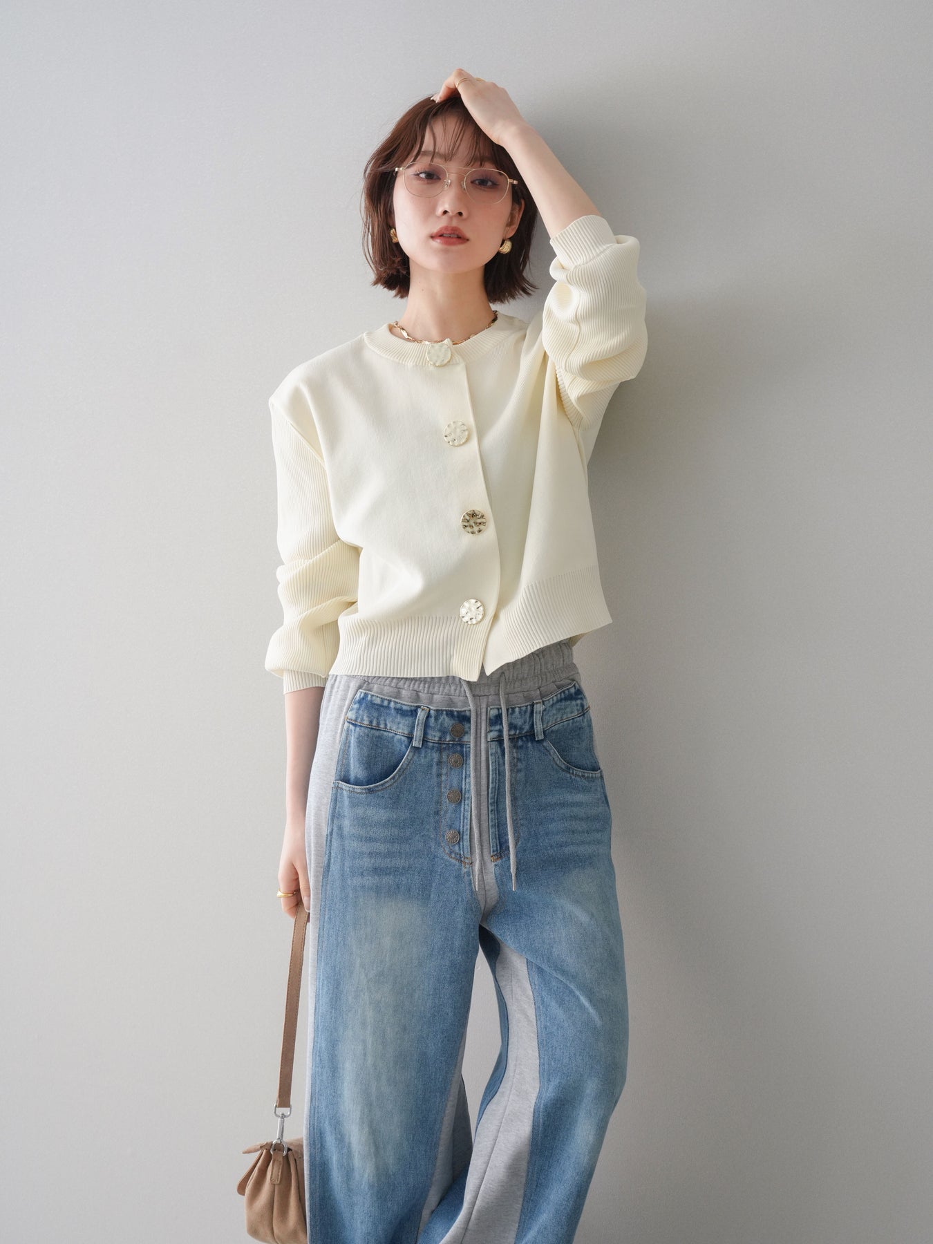 [SET]メタルボタンクルーネックニットカーディガン+デニム切替スウェットパンツ(2set)