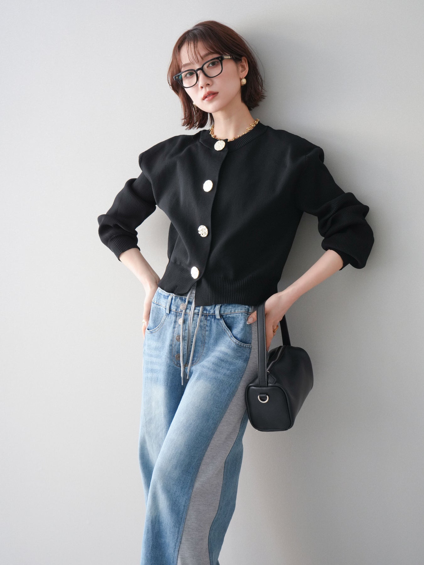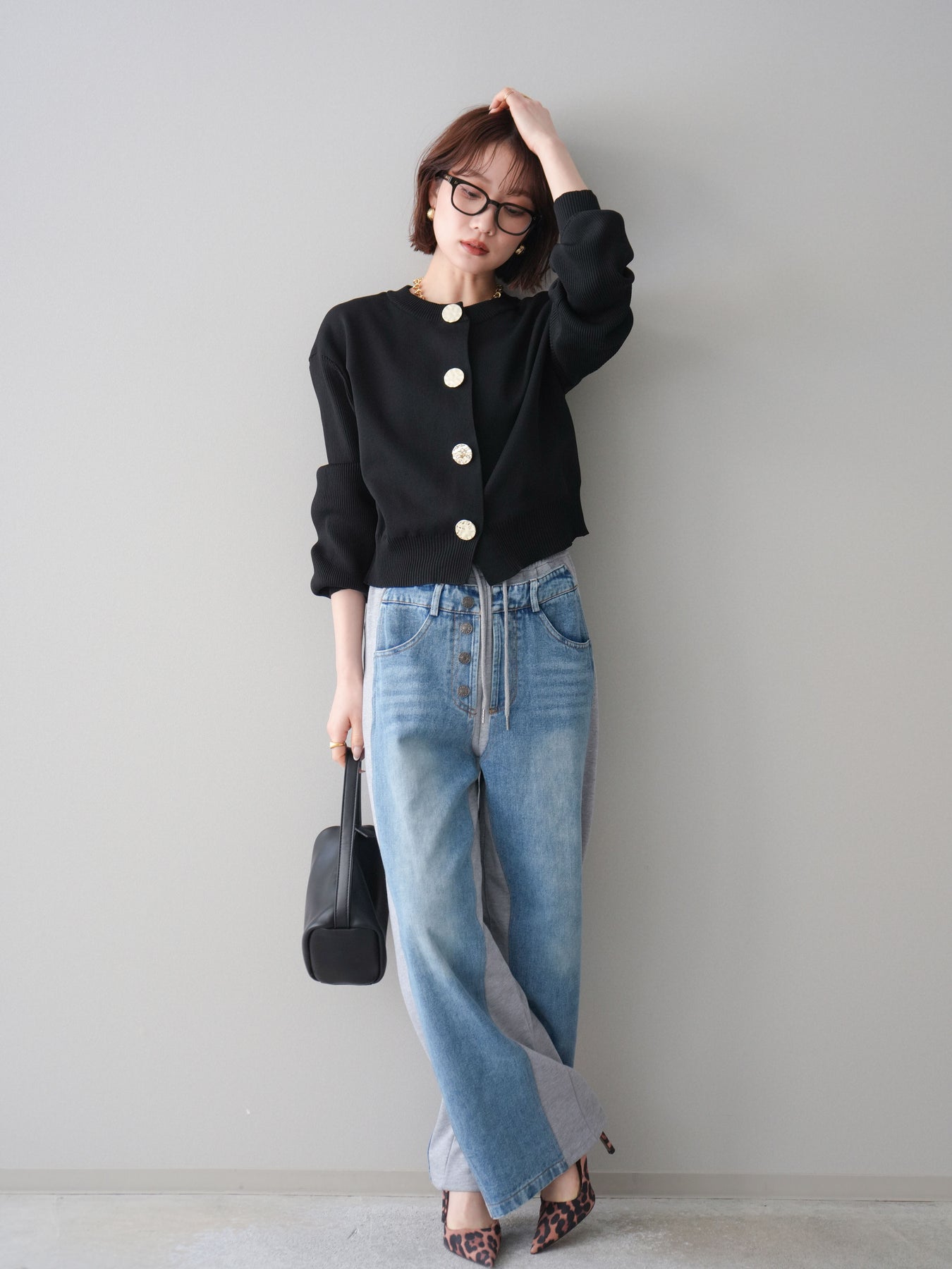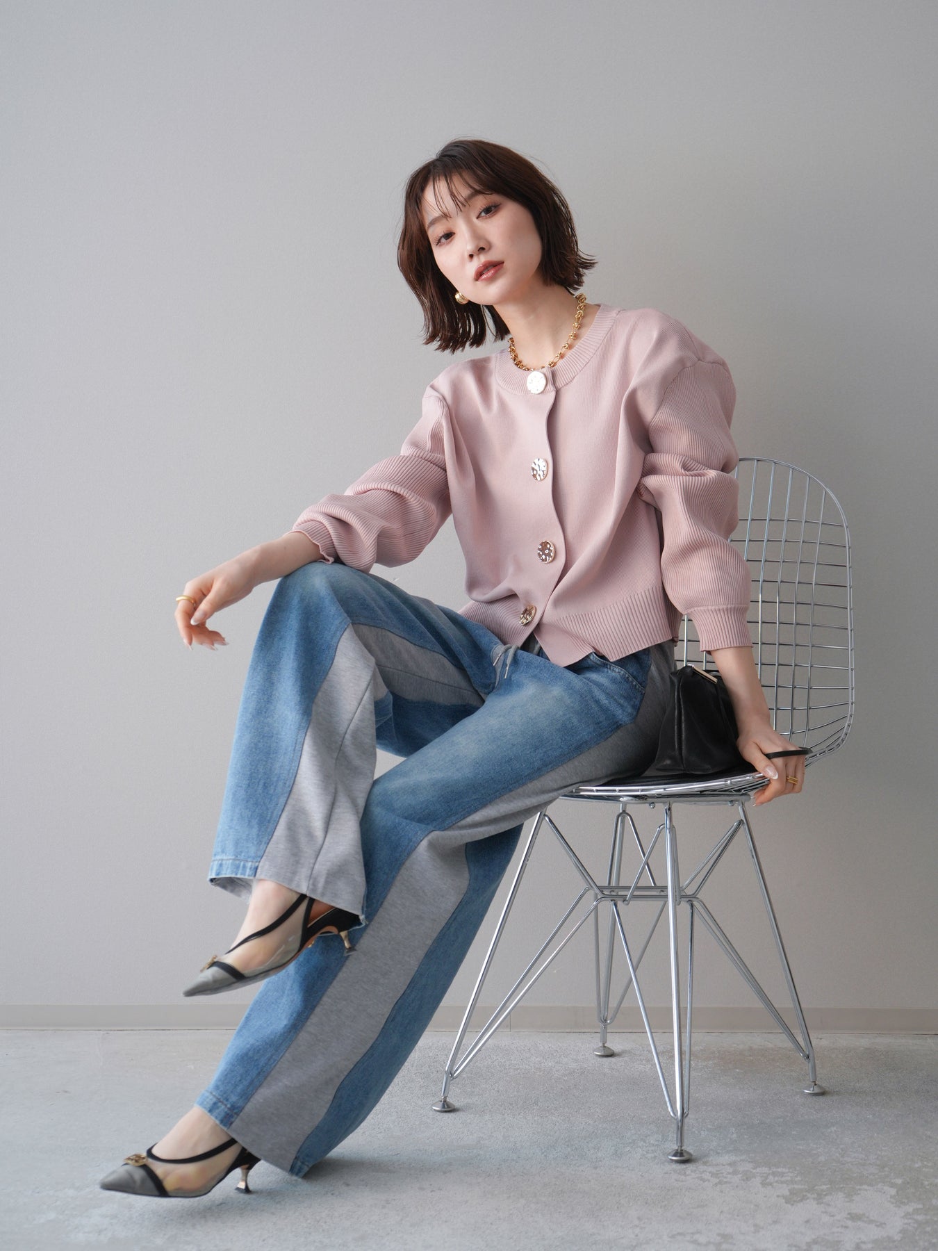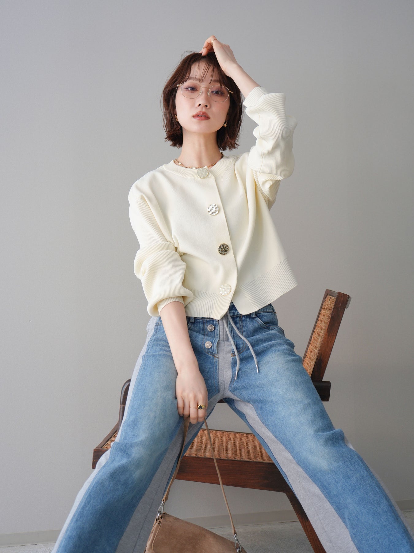 [SET]メタルボタンクルーネックニットカーディガン+デニム切替スウェットパンツ(2set)
