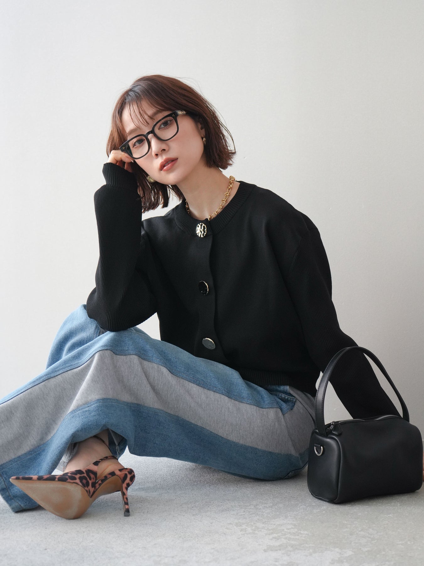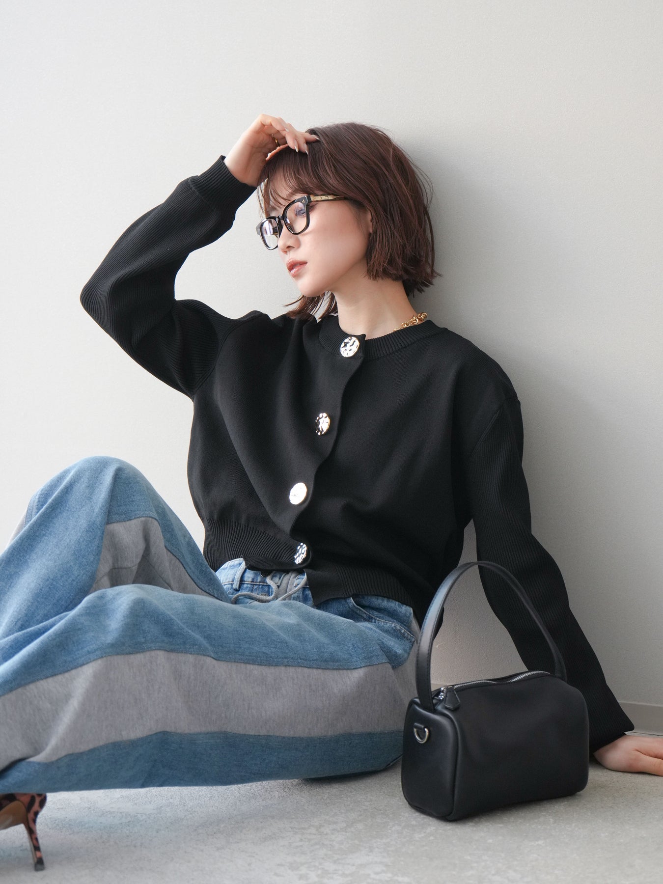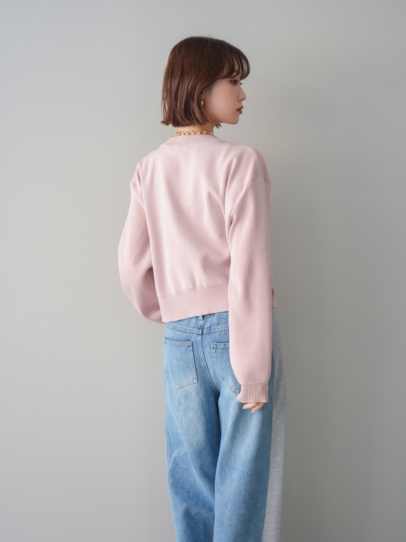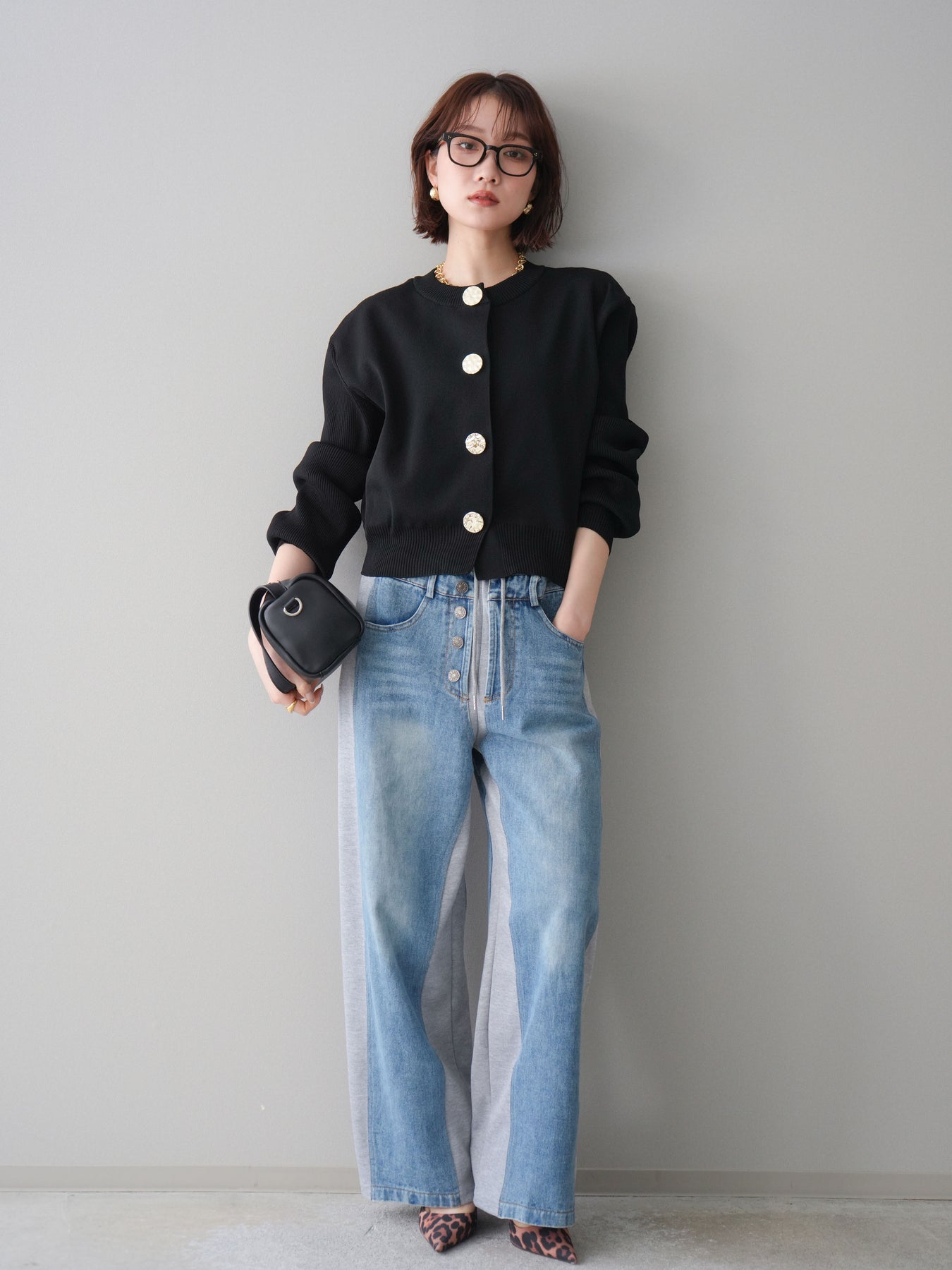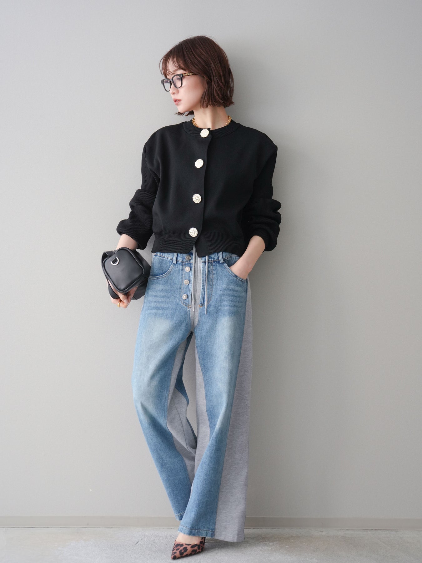 [SET]メタルボタンクルーネックニットカーディガン+デニム切替スウェットパンツ(2set)