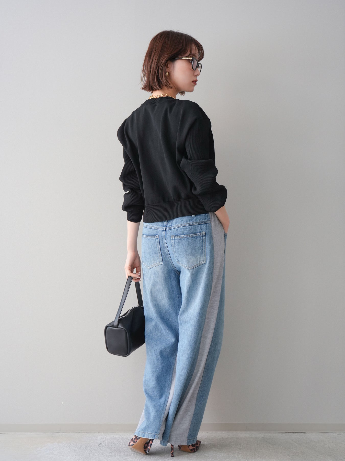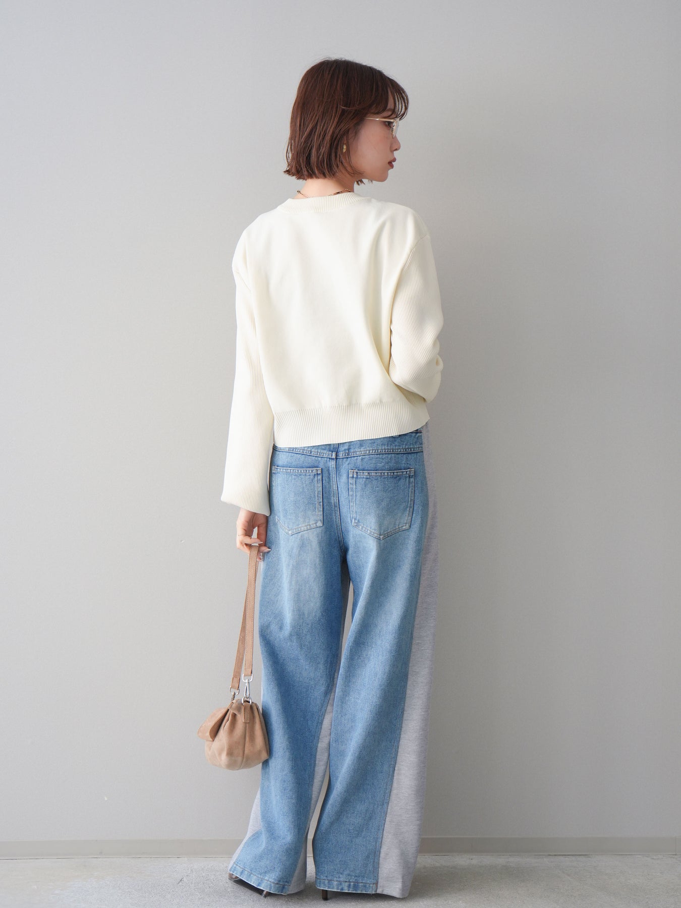 デニムとスウェット素材を切り替えた、カジュアルながらもデザイン性の高いスウェットパンツ。フロントはデニムライクな表情で程よくメリハリを持たせつつ、ウエストやサイドには柔らかなスウェット素材を使用し、リラックス感のある穿き心地に仕上げています。ウエストはイージー仕様でストレスフリーながら、シルエットはすっきりと見えるバランスに。ラフになりすぎず、トップス次第でカジュアルからきれいめまで幅広いスタイリングに対応する一本です。 ※ボトムス、キャミソール(インナー)以外の商品は一律でインナーは付属していません。