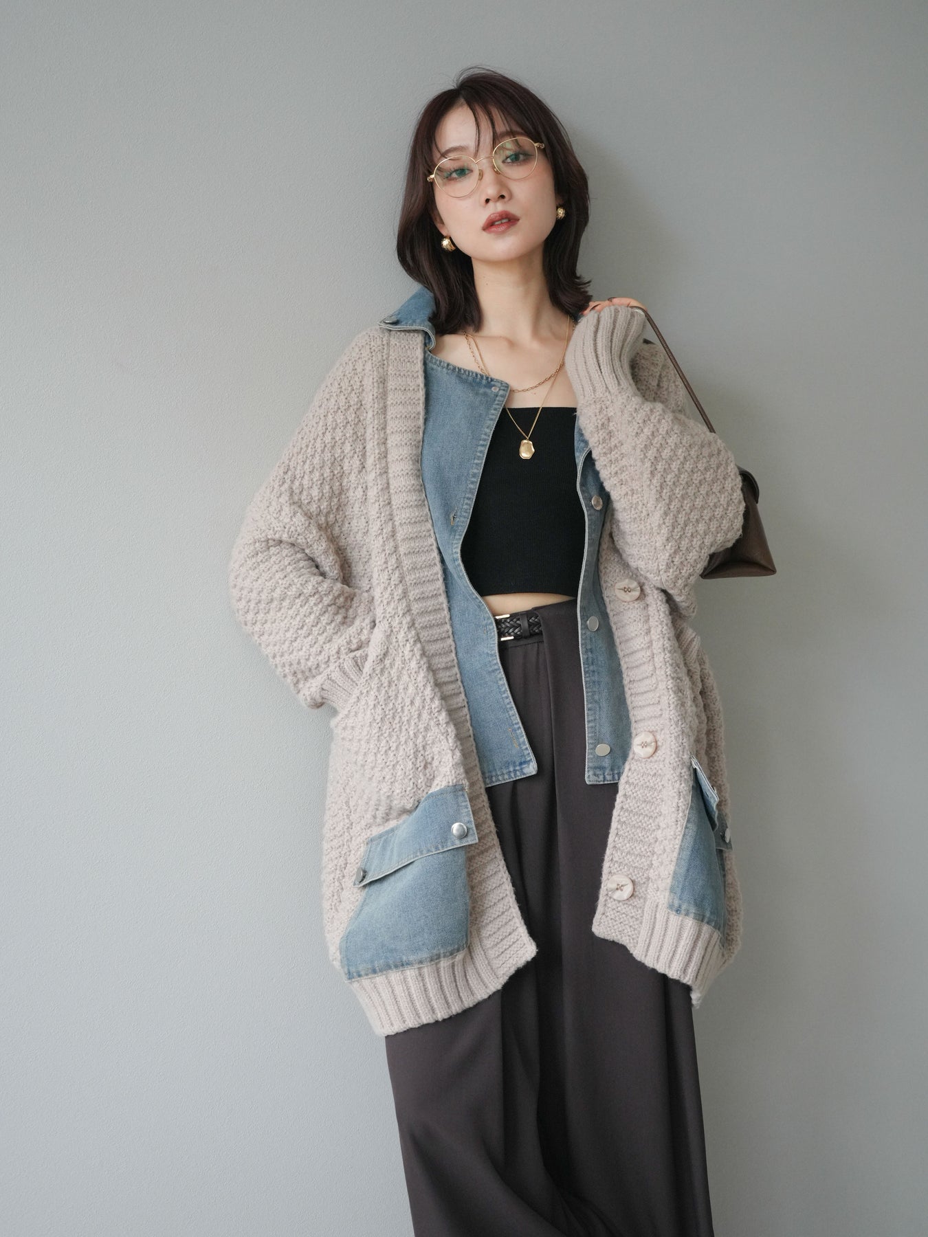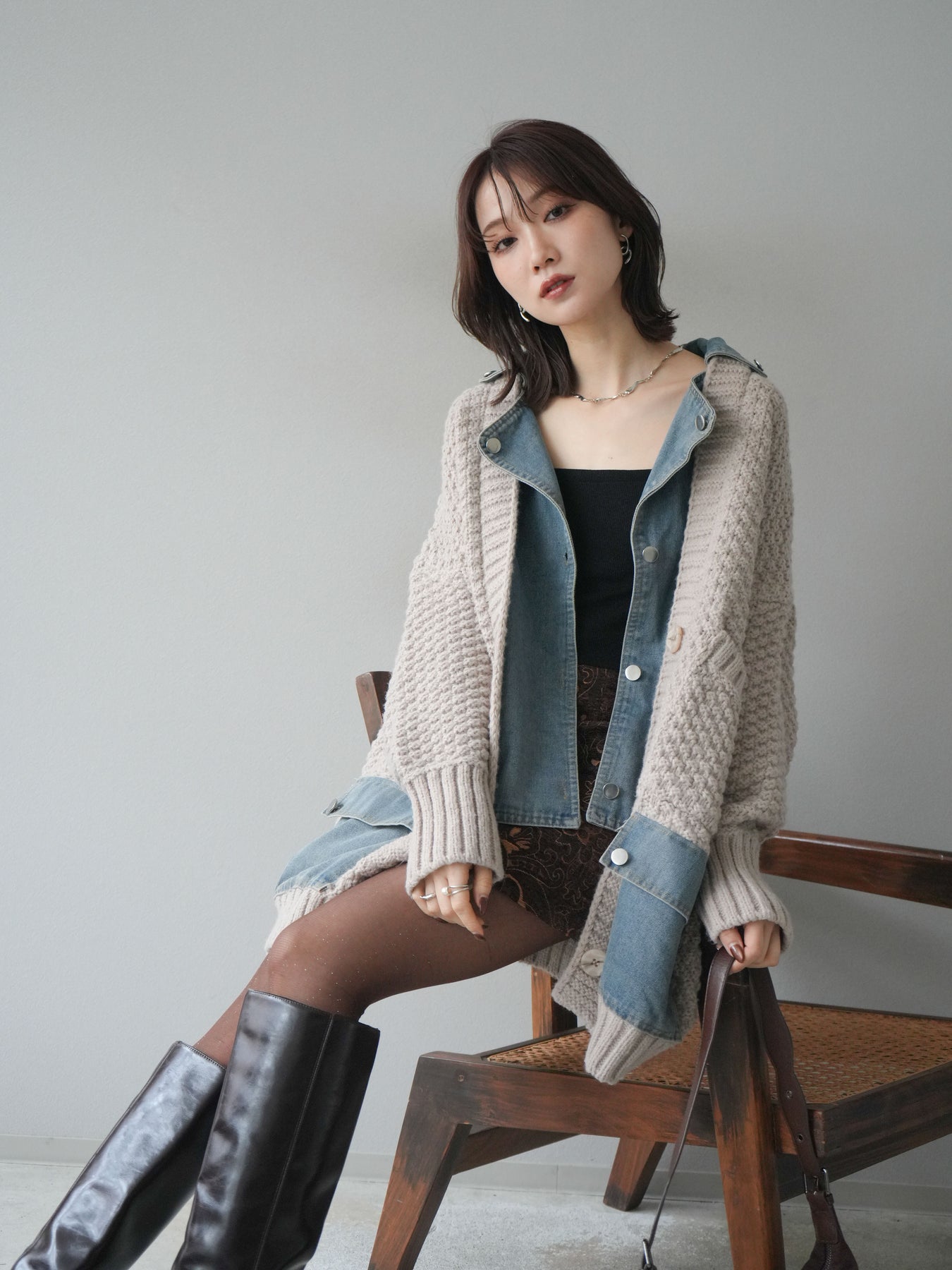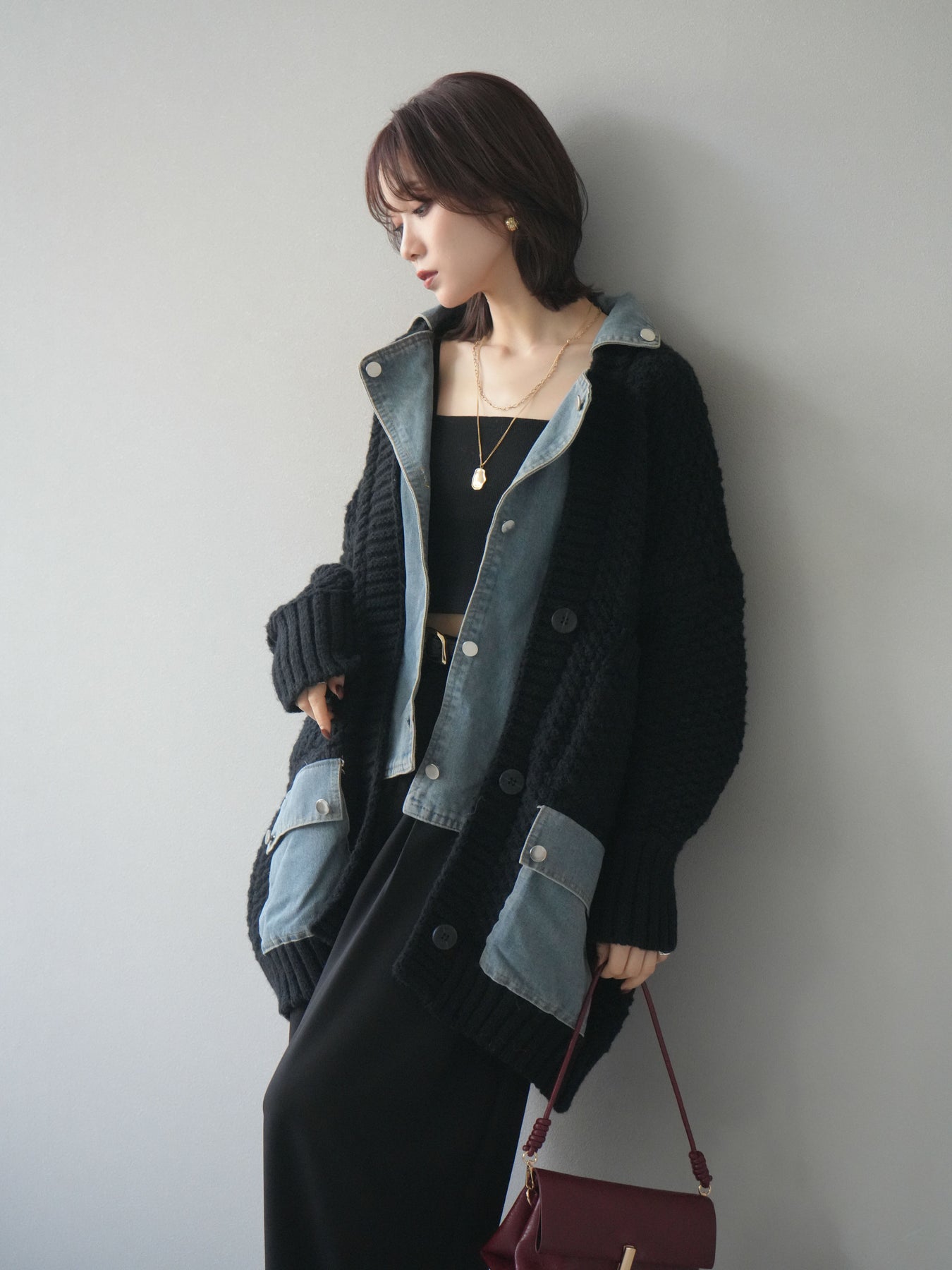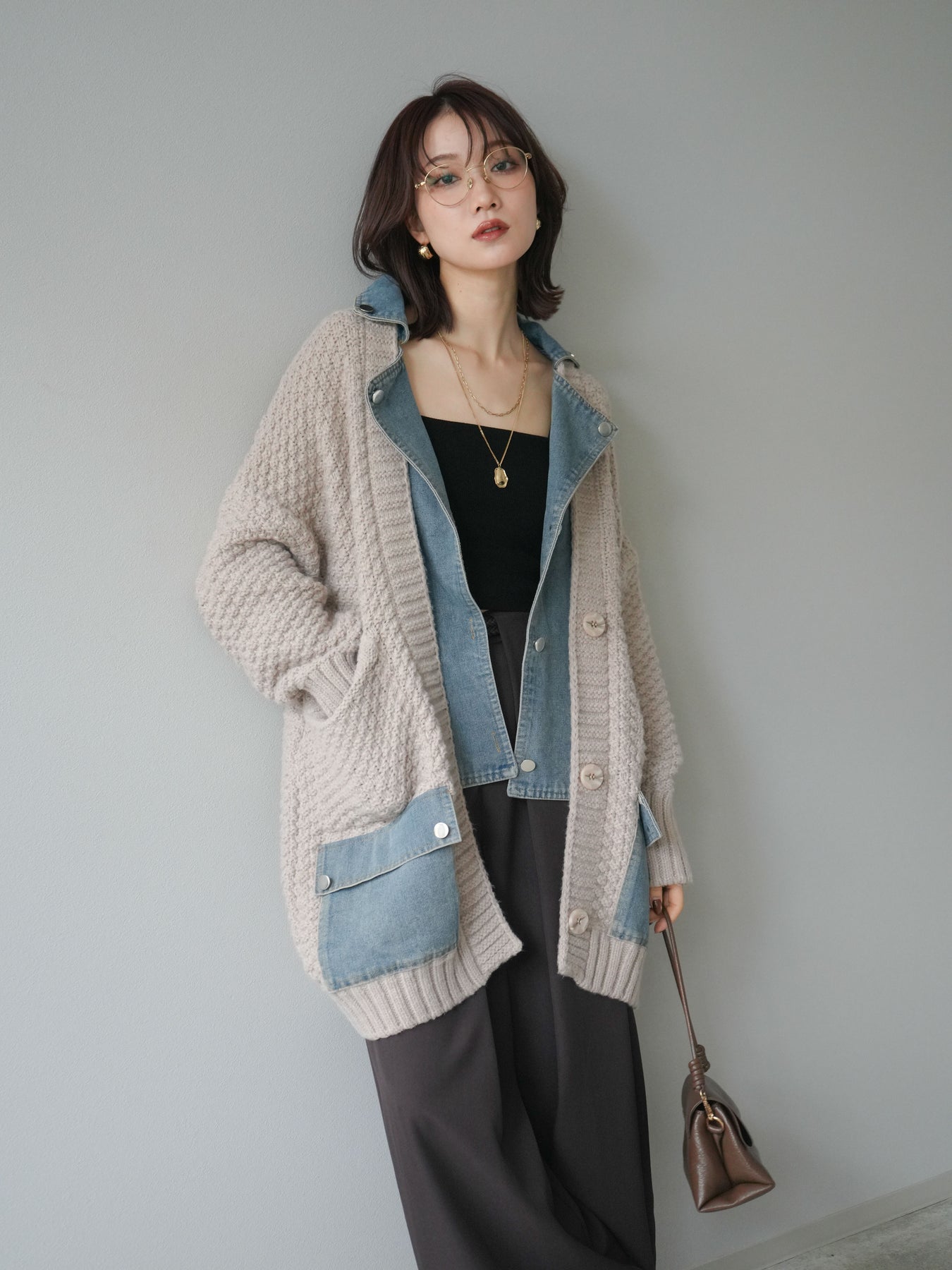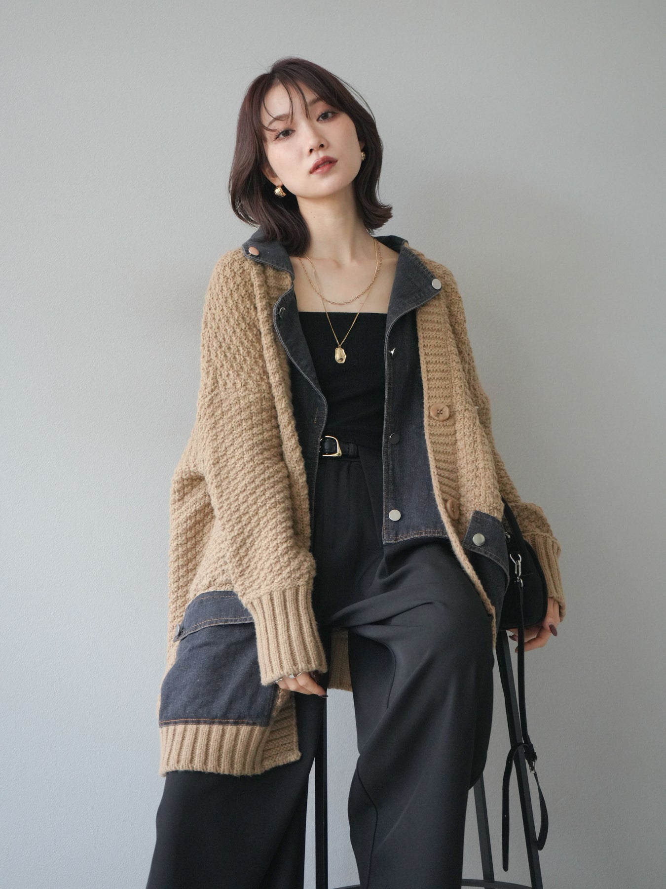 デニムとニットをドッキングした、存在感抜群のケーブルカーディガン。 ざっくりとしたケーブル編みと、デニムの切り替えが絶妙なバランスで、羽織るだけでこなれた印象を演出します。 ボリュームのあるシルエットながら軽やかな着心地で、アウターライクに使える一枚。 デニムの襟やポケットディテールがカジュアルさをプラスし、シンプルなコーディネートにも映えるデザインです。 季節の変わり目にさっと羽織れる、トレンド感のある万能アイテム。 ※ボトムス、キャミソール(インナー)以外の商品は一律でインナーは付属していません。