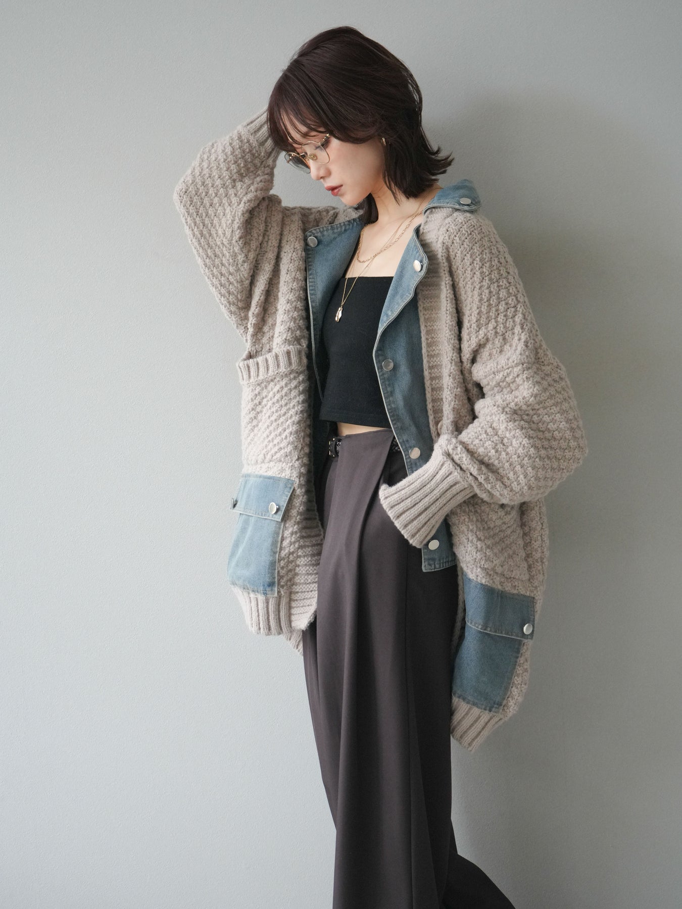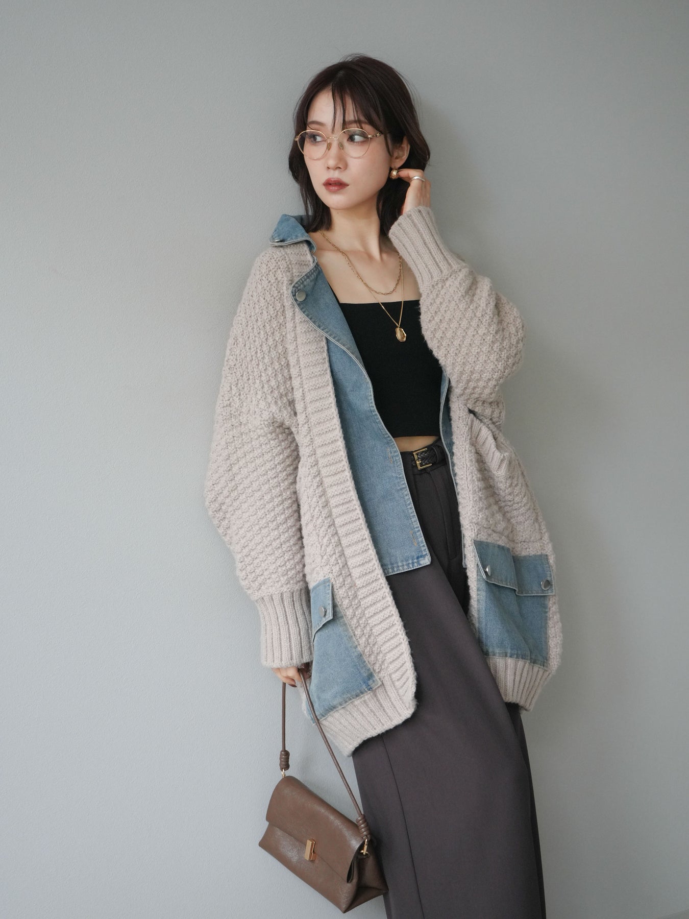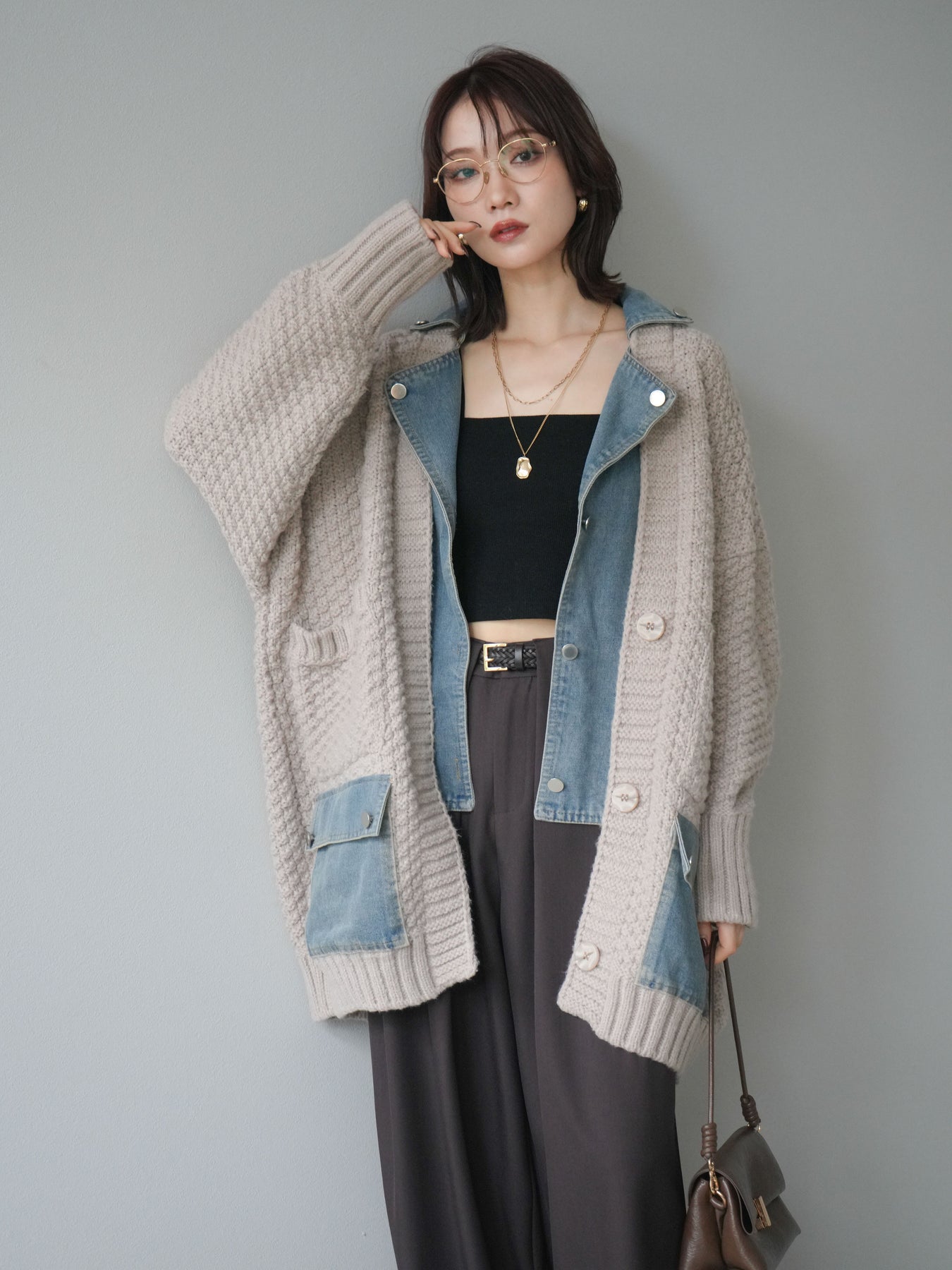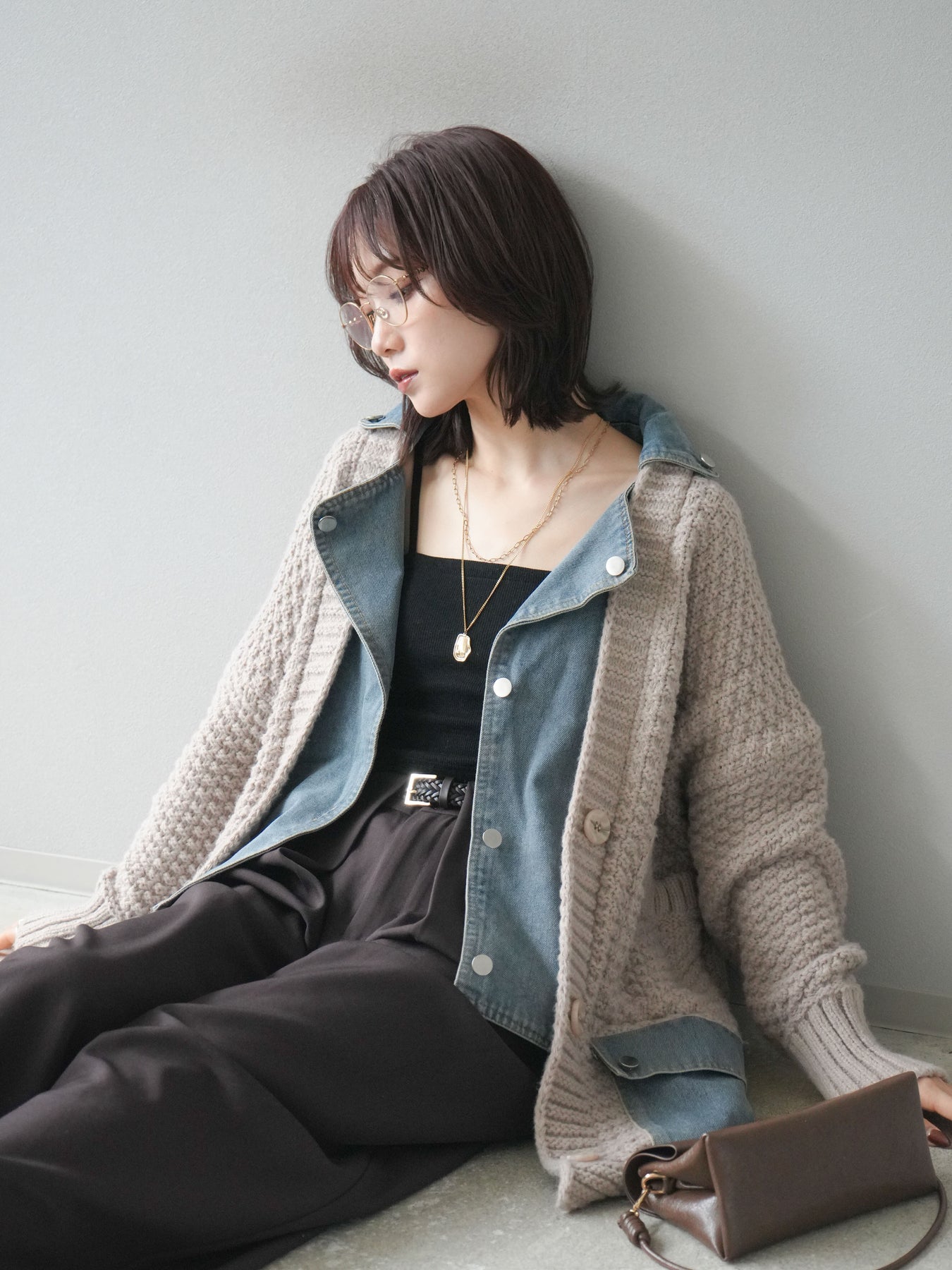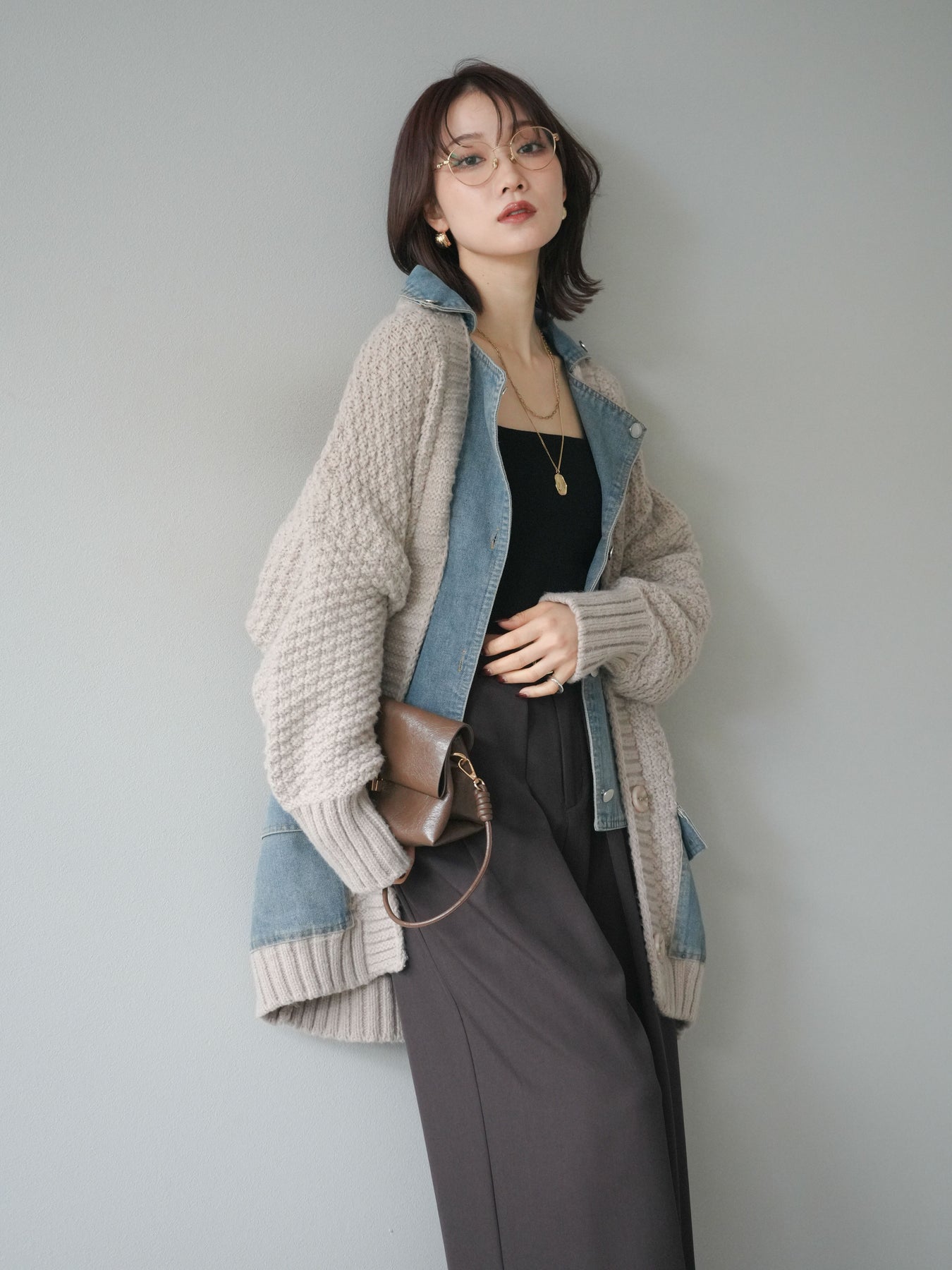 デニムとニットをドッキングした、存在感抜群のケーブルカーディガン。 ざっくりとしたケーブル編みと、デニムの切り替えが絶妙なバランスで、羽織るだけでこなれた印象を演出します。 ボリュームのあるシルエットながら軽やかな着心地で、アウターライクに使える一枚。 デニムの襟やポケットディテールがカジュアルさをプラスし、シンプルなコーディネートにも映えるデザインです。 季節の変わり目にさっと羽織れる、トレンド感のある万能アイテム。 ※ボトムス、キャミソール(インナー)以外の商品は一律でインナーは付属していません。