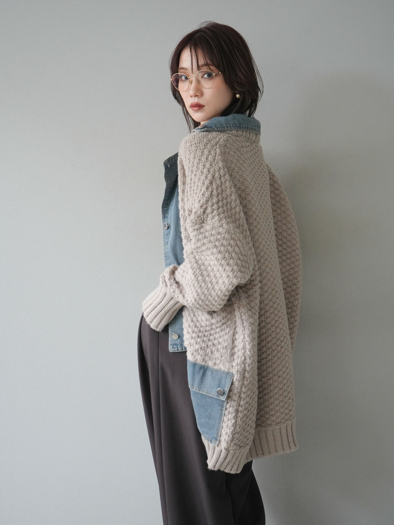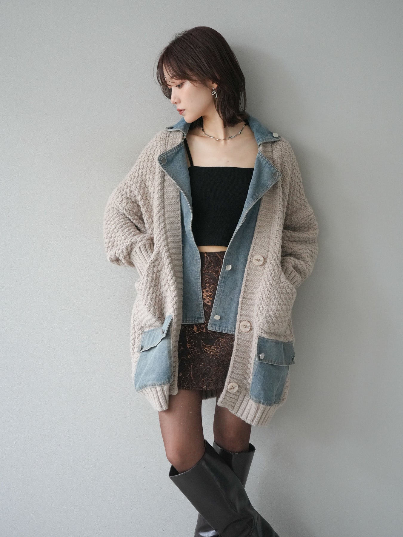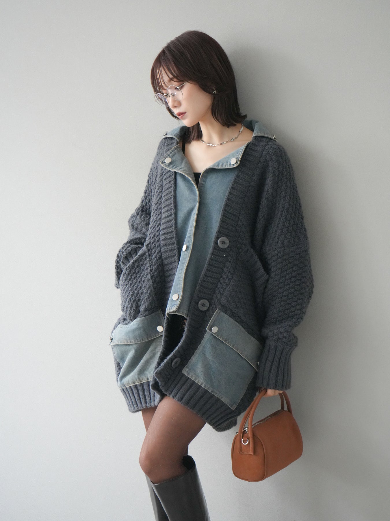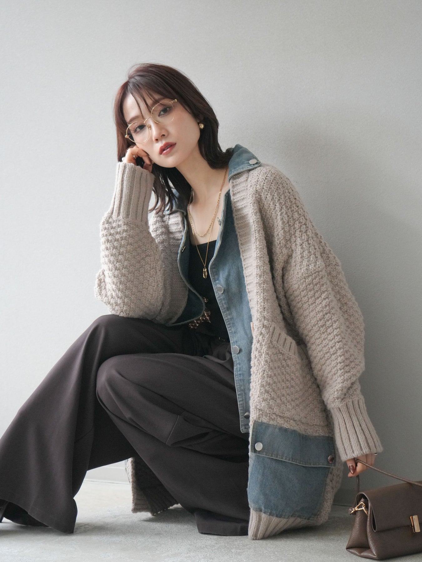 デニムとニットをドッキングした、存在感抜群のケーブルカーディガン。 ざっくりとしたケーブル編みと、デニムの切り替えが絶妙なバランスで、羽織るだけでこなれた印象を演出します。 ボリュームのあるシルエットながら軽やかな着心地で、アウターライクに使える一枚。 デニムの襟やポケットディテールがカジュアルさをプラスし、シンプルなコーディネートにも映えるデザインです。 季節の変わり目にさっと羽織れる、トレンド感のある万能アイテム。 ※ボトムス、キャミソール(インナー)以外の商品は一律でインナーは付属していません。