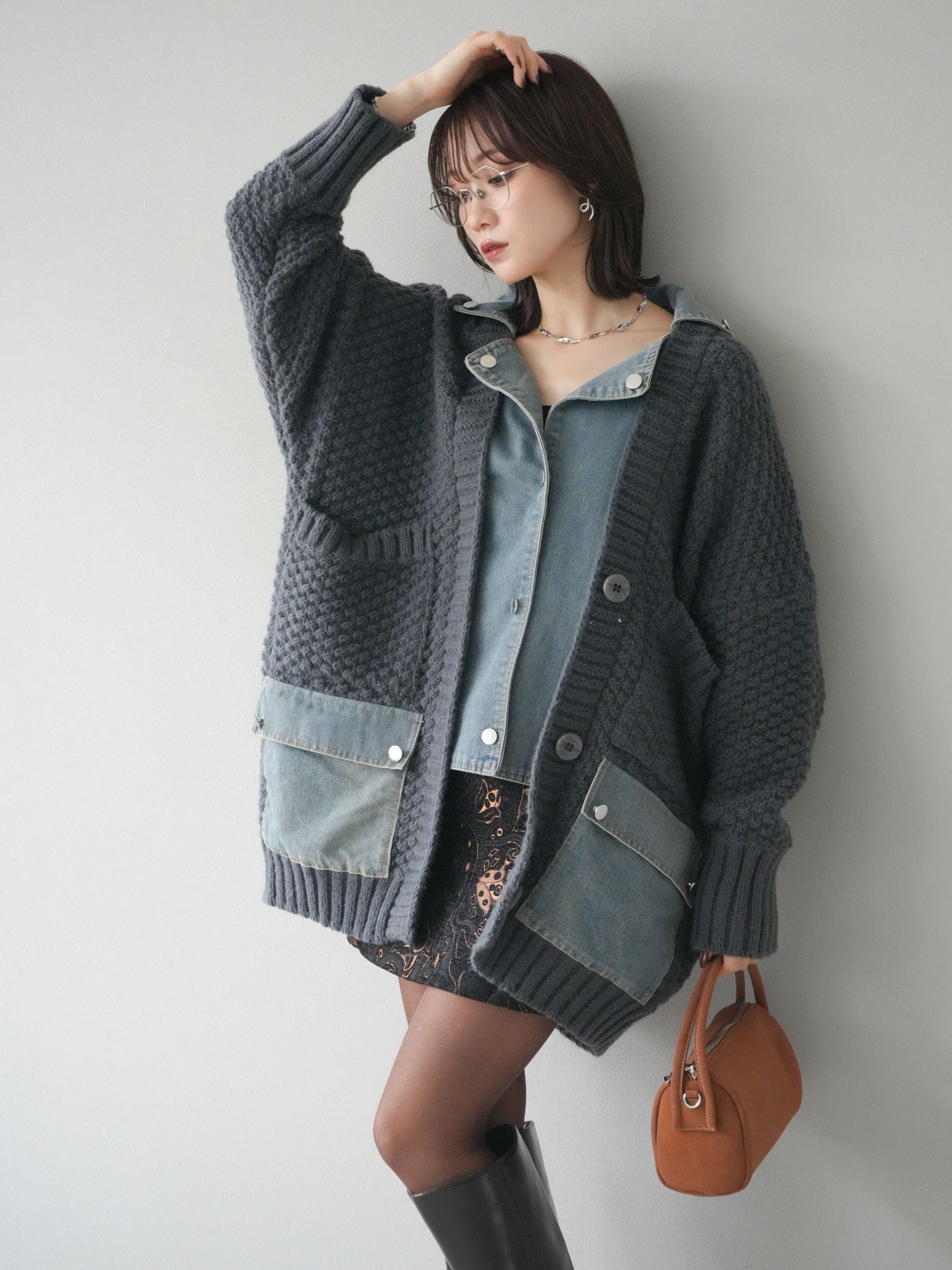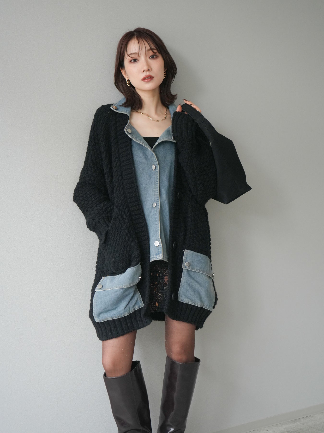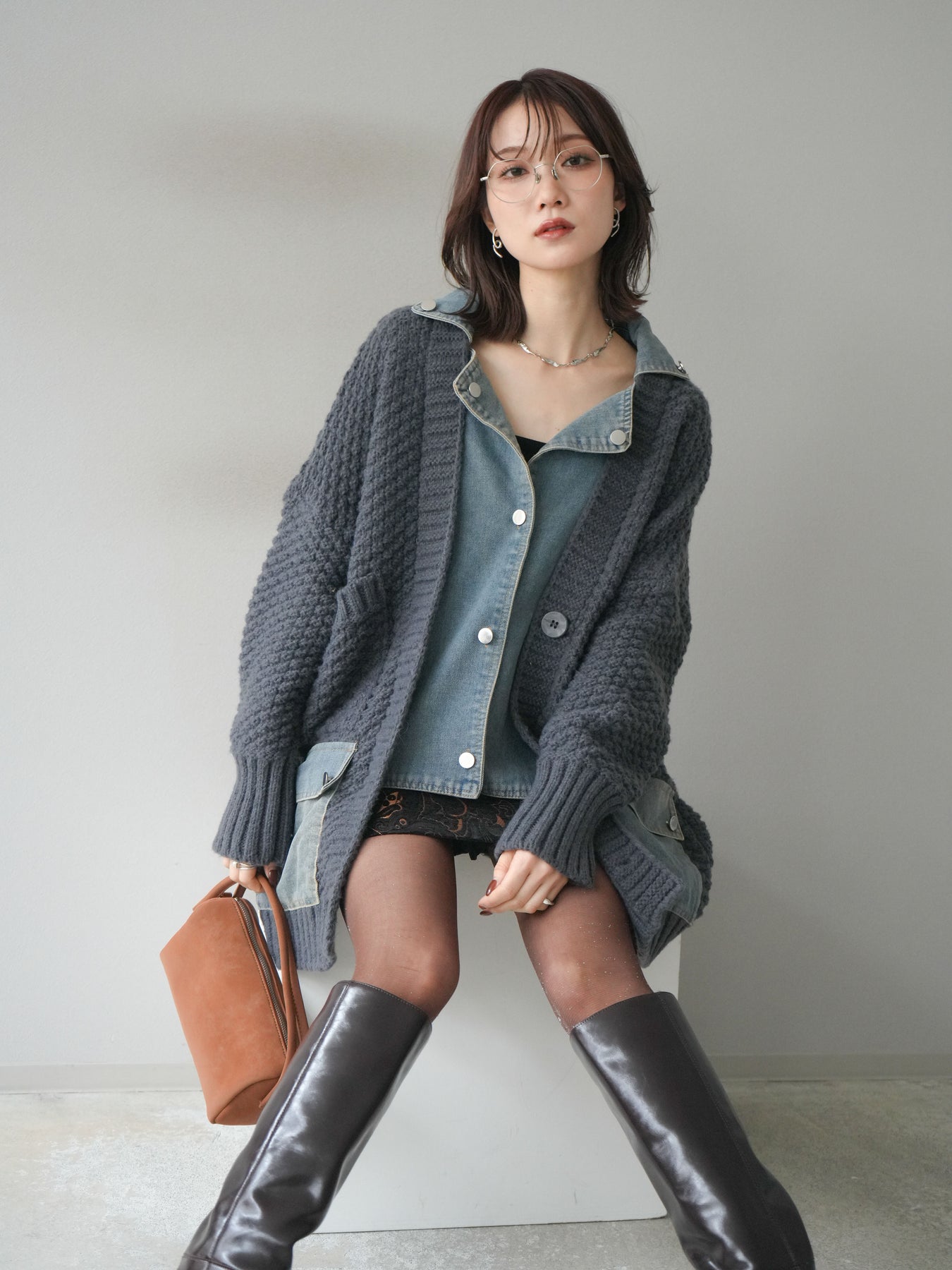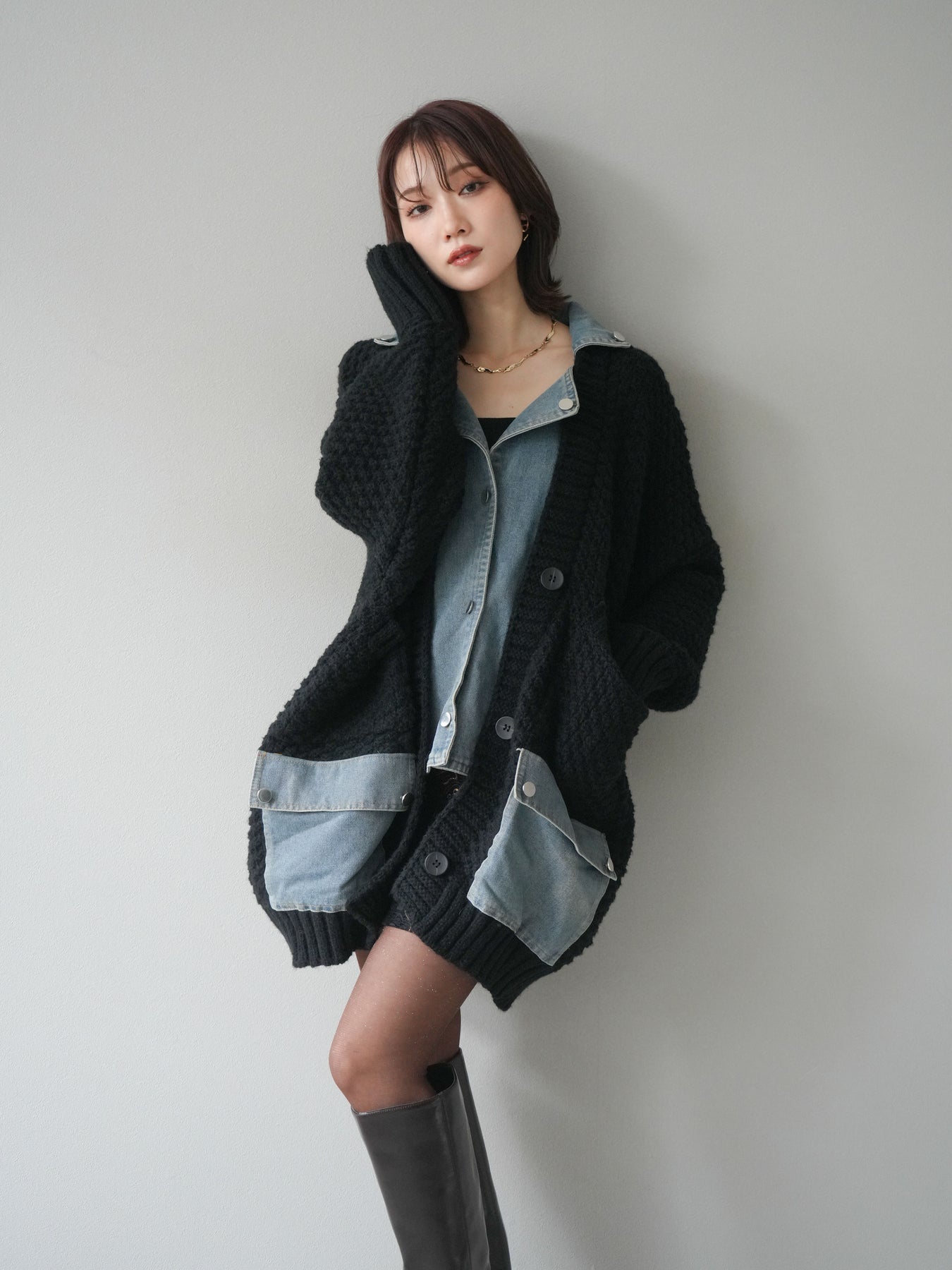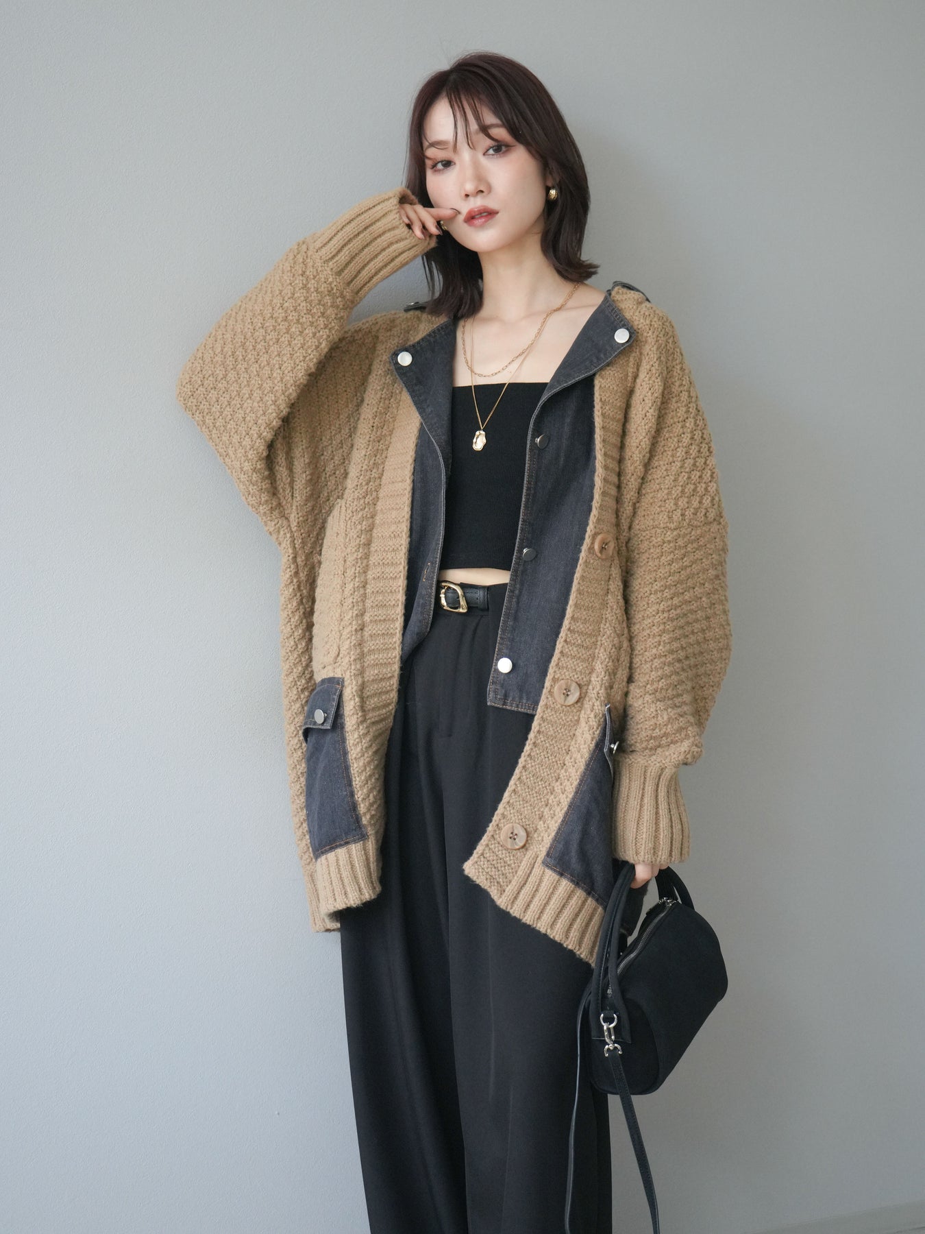 デニムとニットをドッキングした、存在感抜群のケーブルカーディガン。 ざっくりとしたケーブル編みと、デニムの切り替えが絶妙なバランスで、羽織るだけでこなれた印象を演出します。 ボリュームのあるシルエットながら軽やかな着心地で、アウターライクに使える一枚。 デニムの襟やポケットディテールがカジュアルさをプラスし、シンプルなコーディネートにも映えるデザインです。 季節の変わり目にさっと羽織れる、トレンド感のある万能アイテム。 ※ボトムス、キャミソール(インナー)以外の商品は一律でインナーは付属していません。