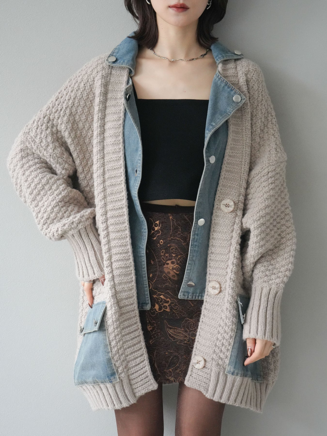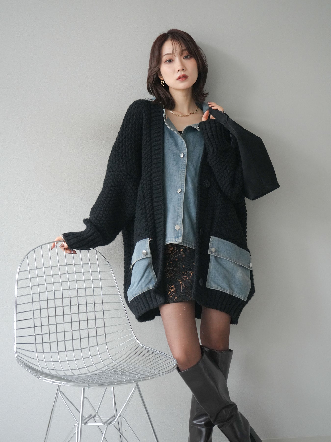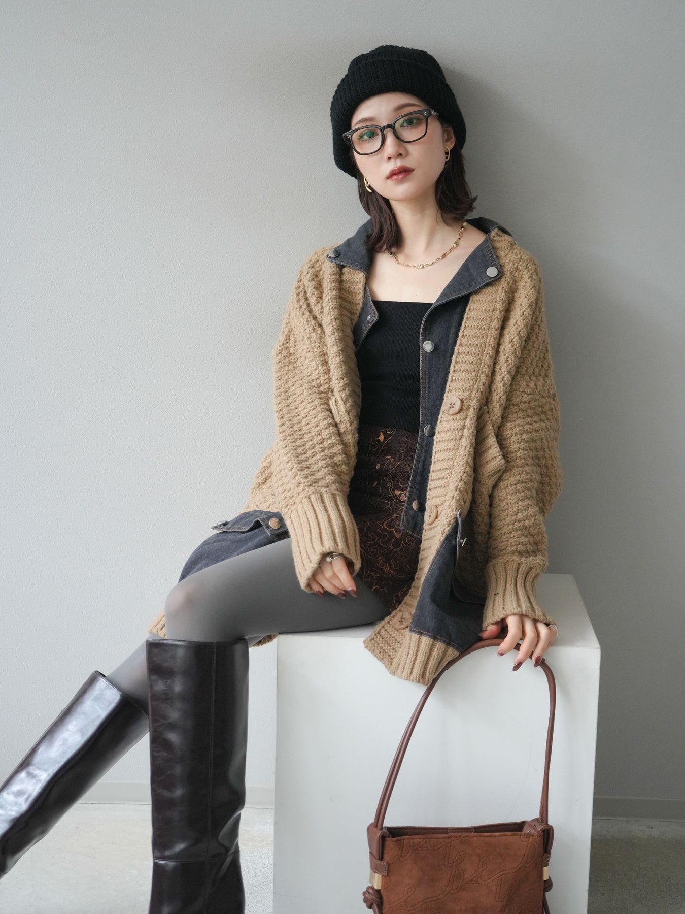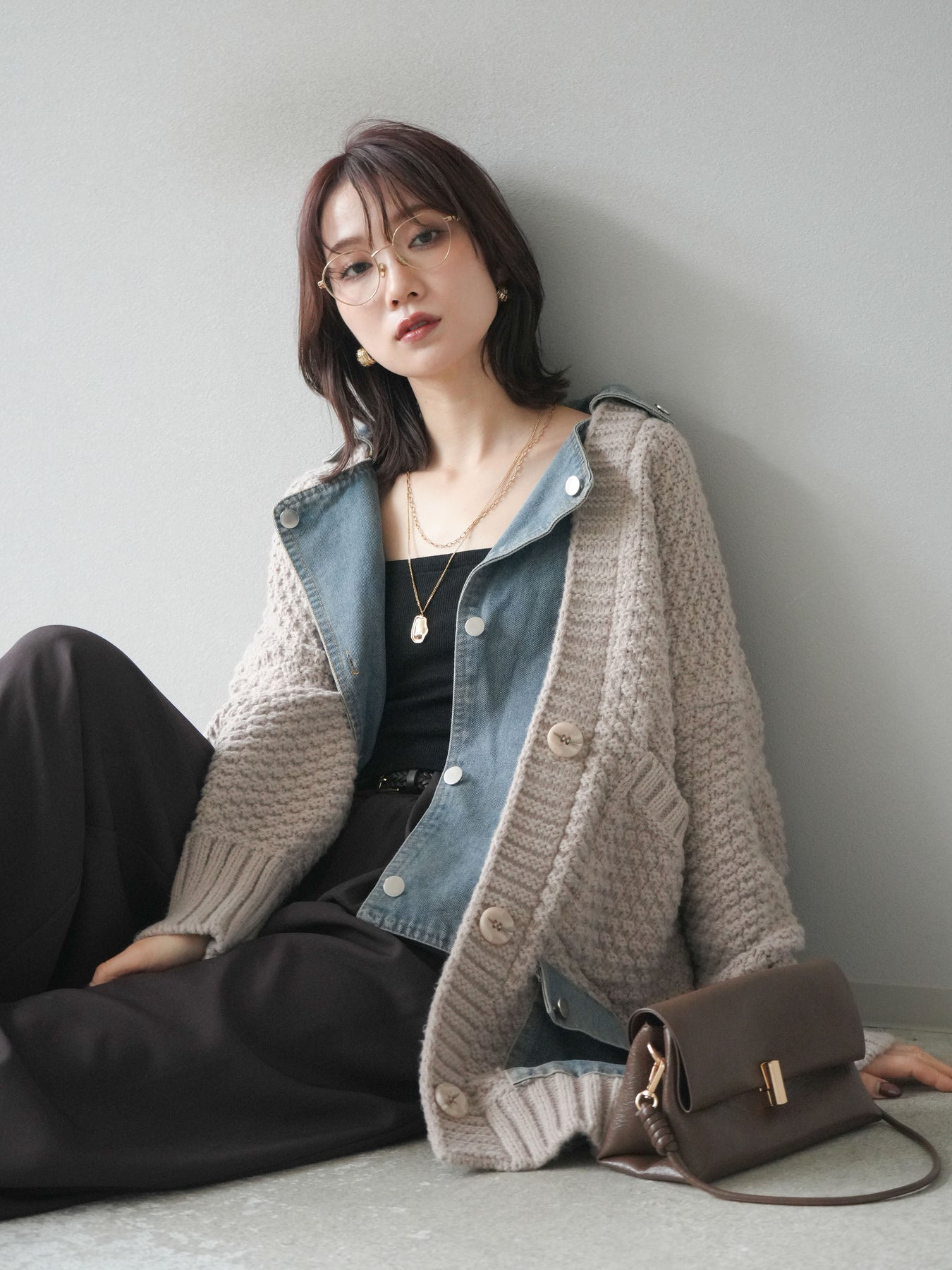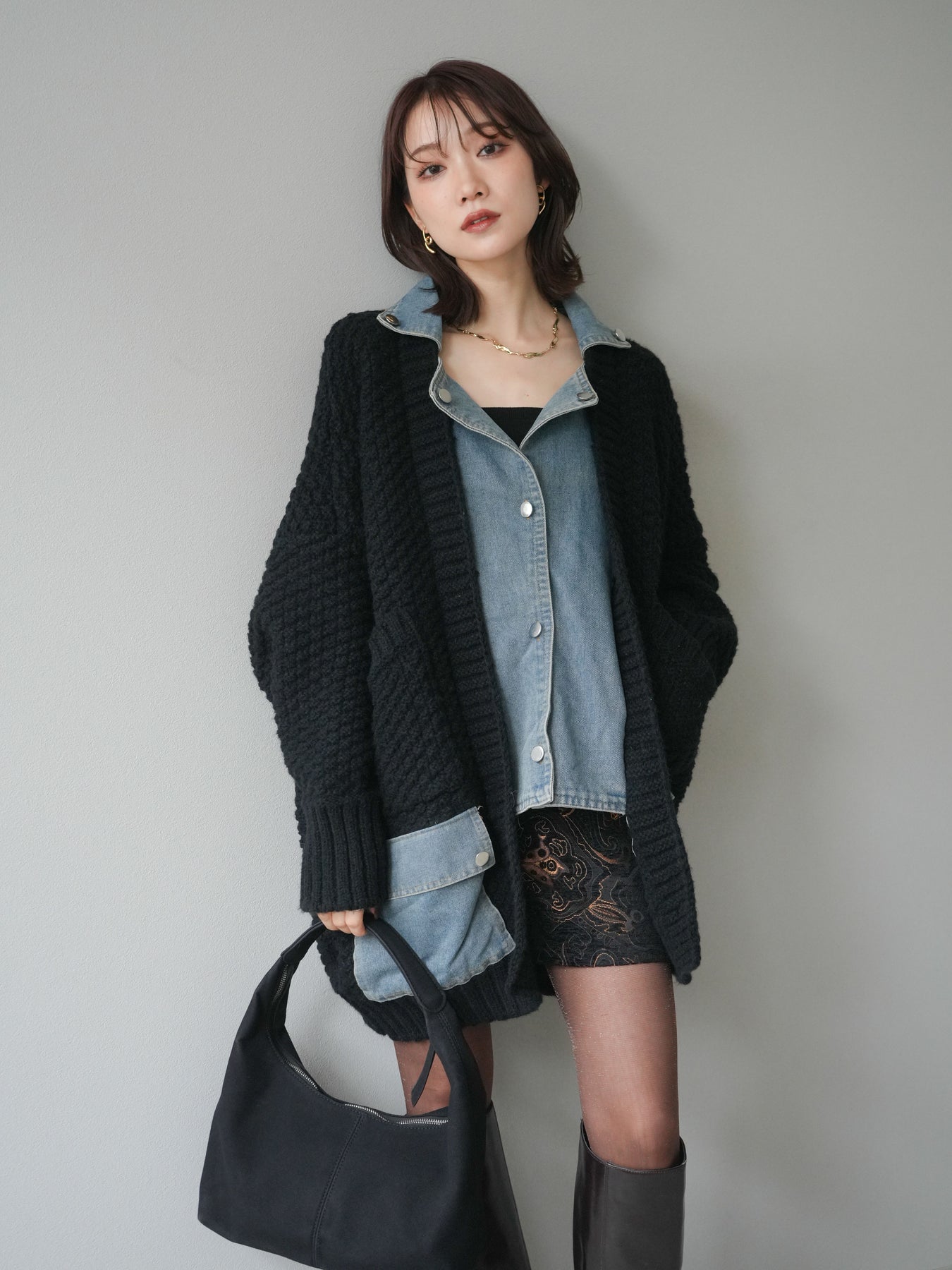 デニムとニットをドッキングした、存在感抜群のケーブルカーディガン。 ざっくりとしたケーブル編みと、デニムの切り替えが絶妙なバランスで、羽織るだけでこなれた印象を演出します。 ボリュームのあるシルエットながら軽やかな着心地で、アウターライクに使える一枚。 デニムの襟やポケットディテールがカジュアルさをプラスし、シンプルなコーディネートにも映えるデザインです。 季節の変わり目にさっと羽織れる、トレンド感のある万能アイテム。 ※ボトムス、キャミソール(インナー)以外の商品は一律でインナーは付属していません。