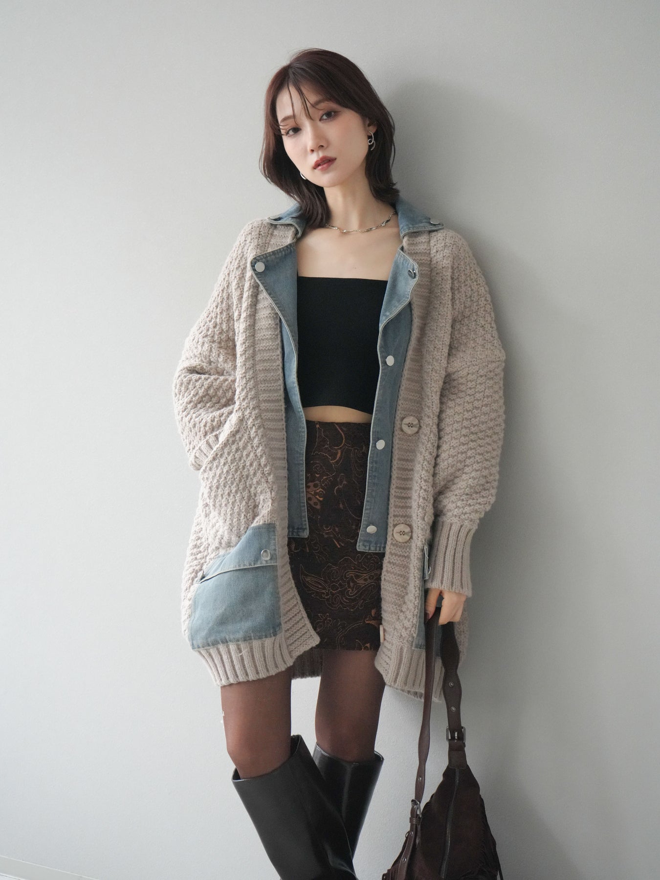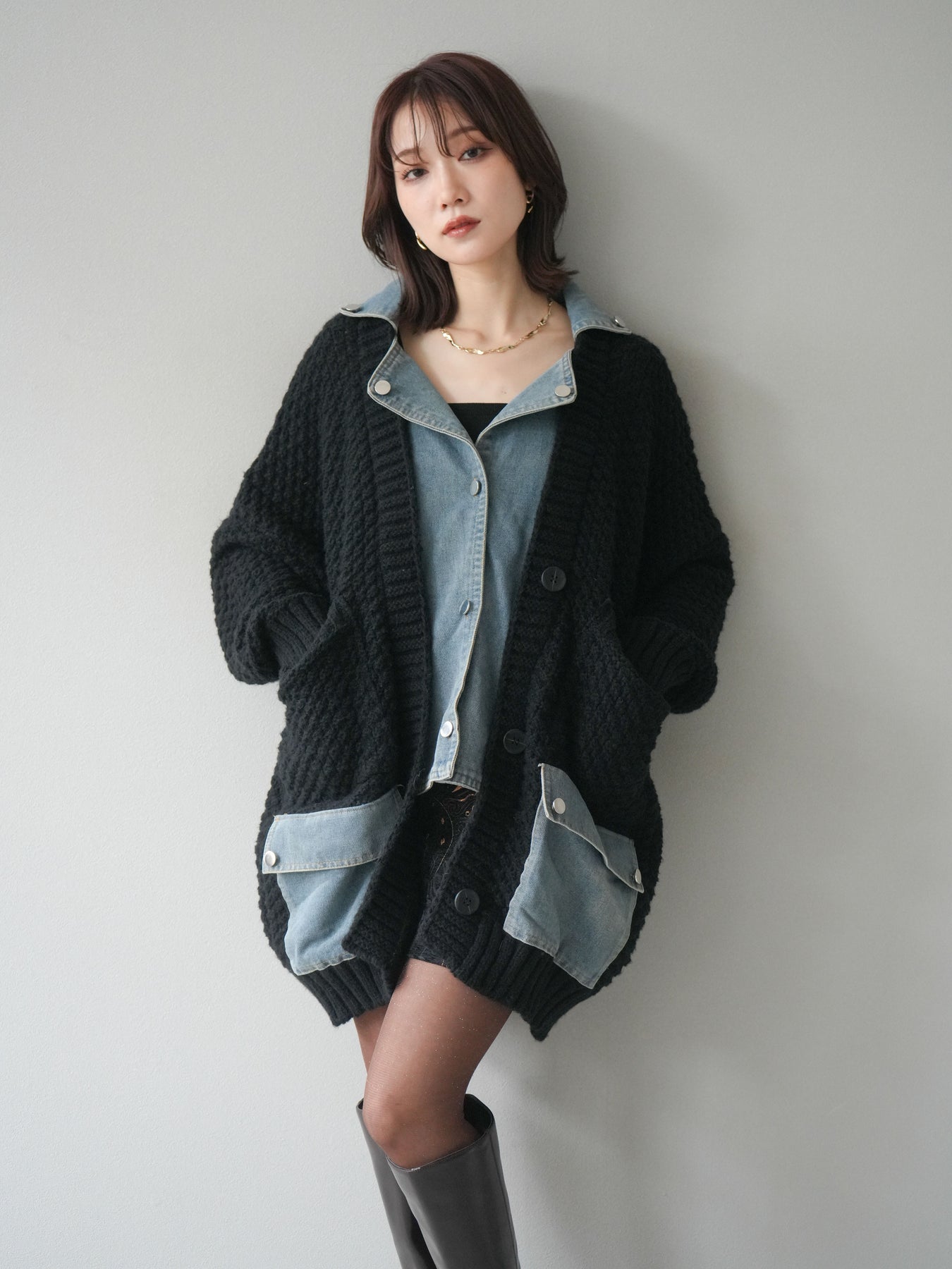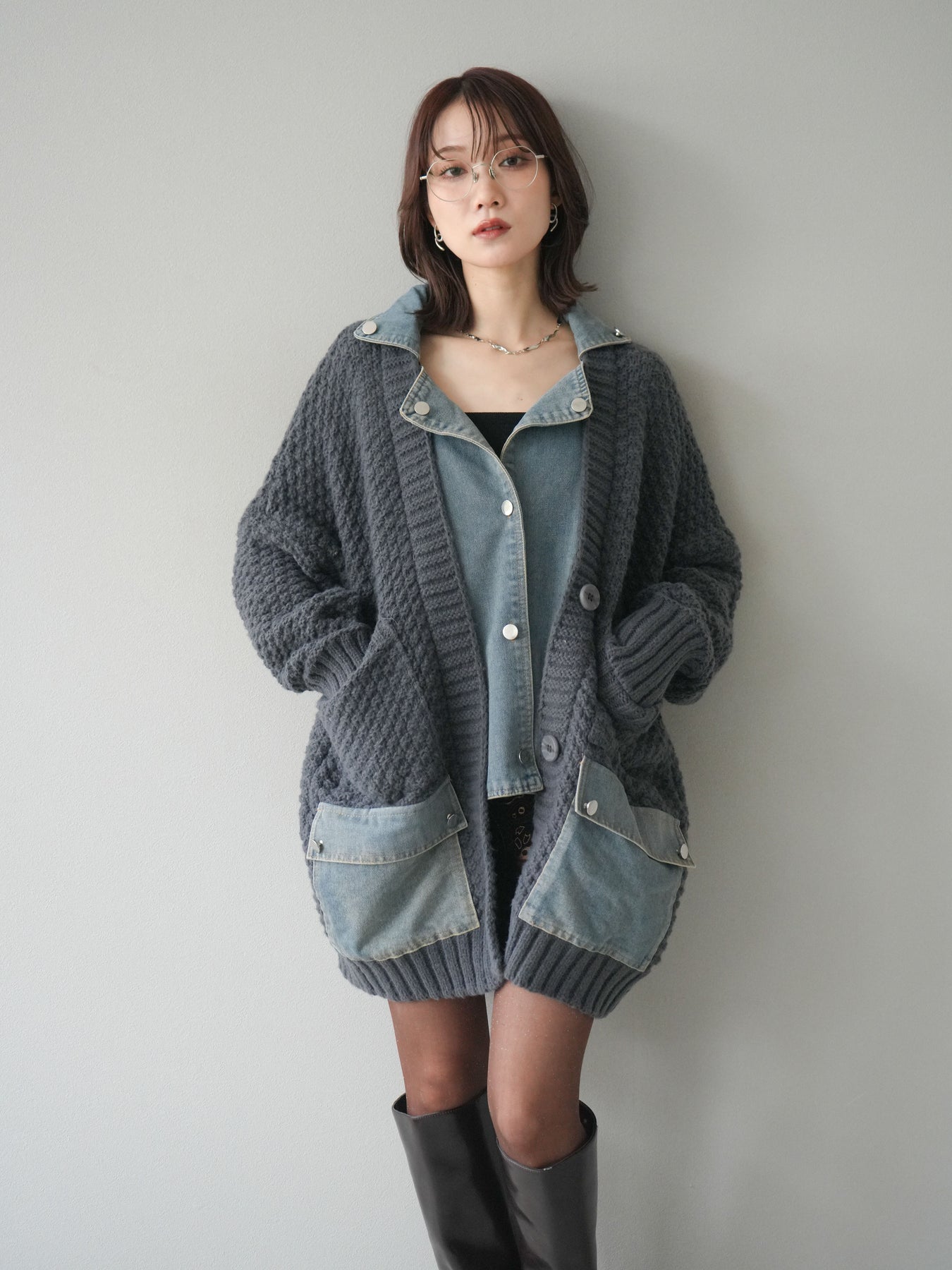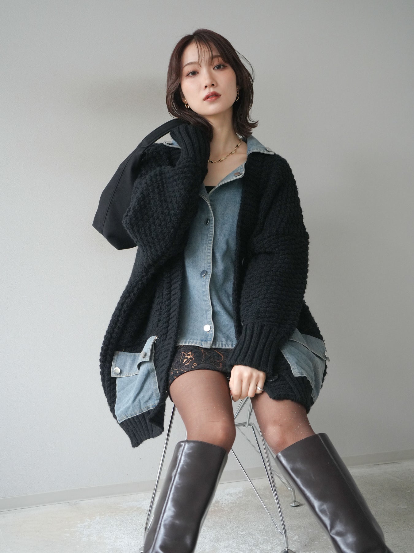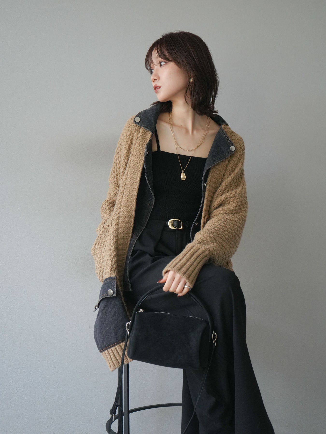 デニムとニットをドッキングした、存在感抜群のケーブルカーディガン。 ざっくりとしたケーブル編みと、デニムの切り替えが絶妙なバランスで、羽織るだけでこなれた印象を演出します。 ボリュームのあるシルエットながら軽やかな着心地で、アウターライクに使える一枚。 デニムの襟やポケットディテールがカジュアルさをプラスし、シンプルなコーディネートにも映えるデザインです。 季節の変わり目にさっと羽織れる、トレンド感のある万能アイテム。 ※ボトムス、キャミソール(インナー)以外の商品は一律でインナーは付属していません。