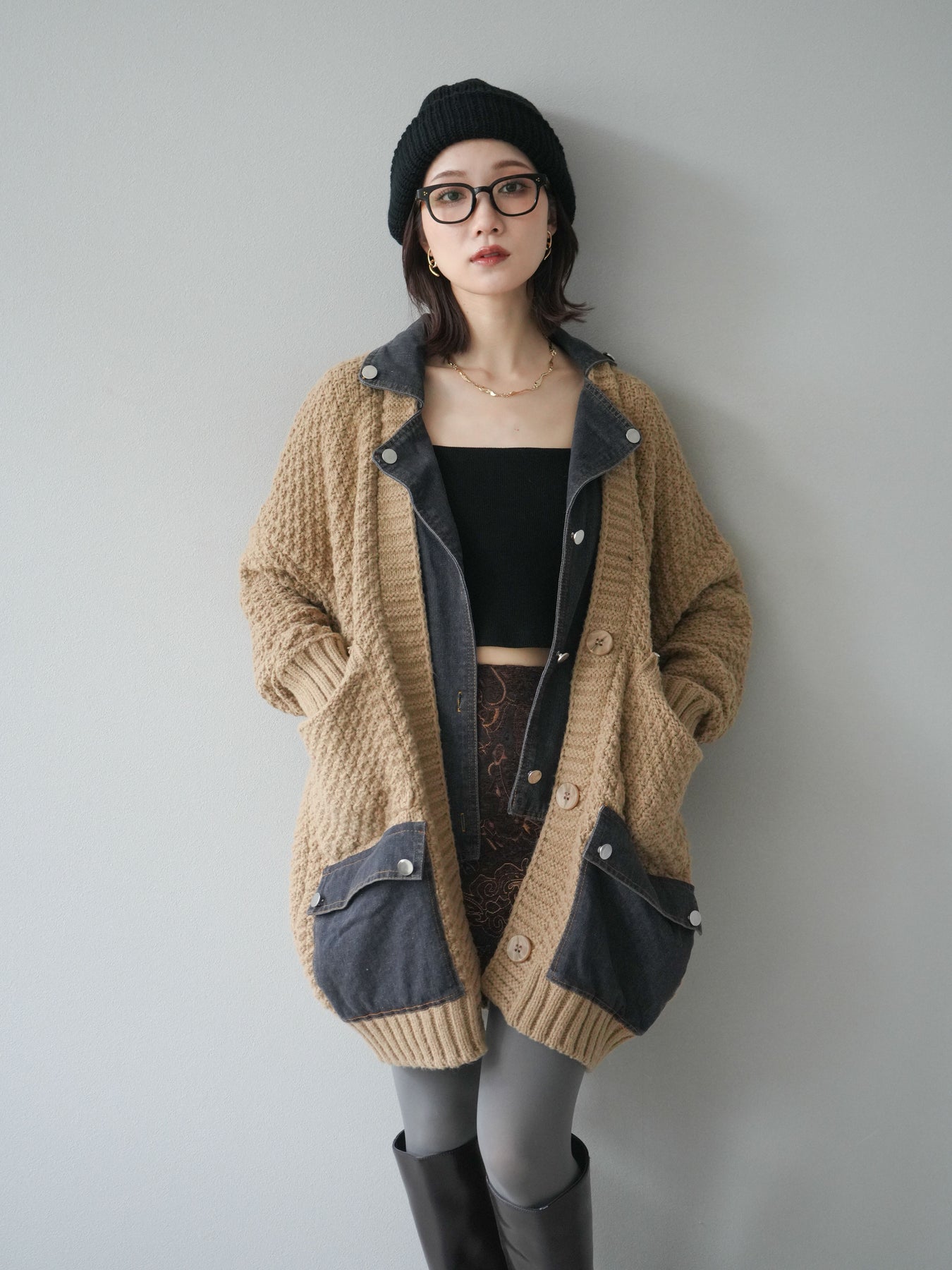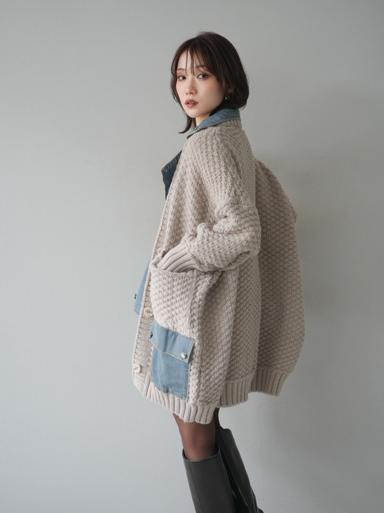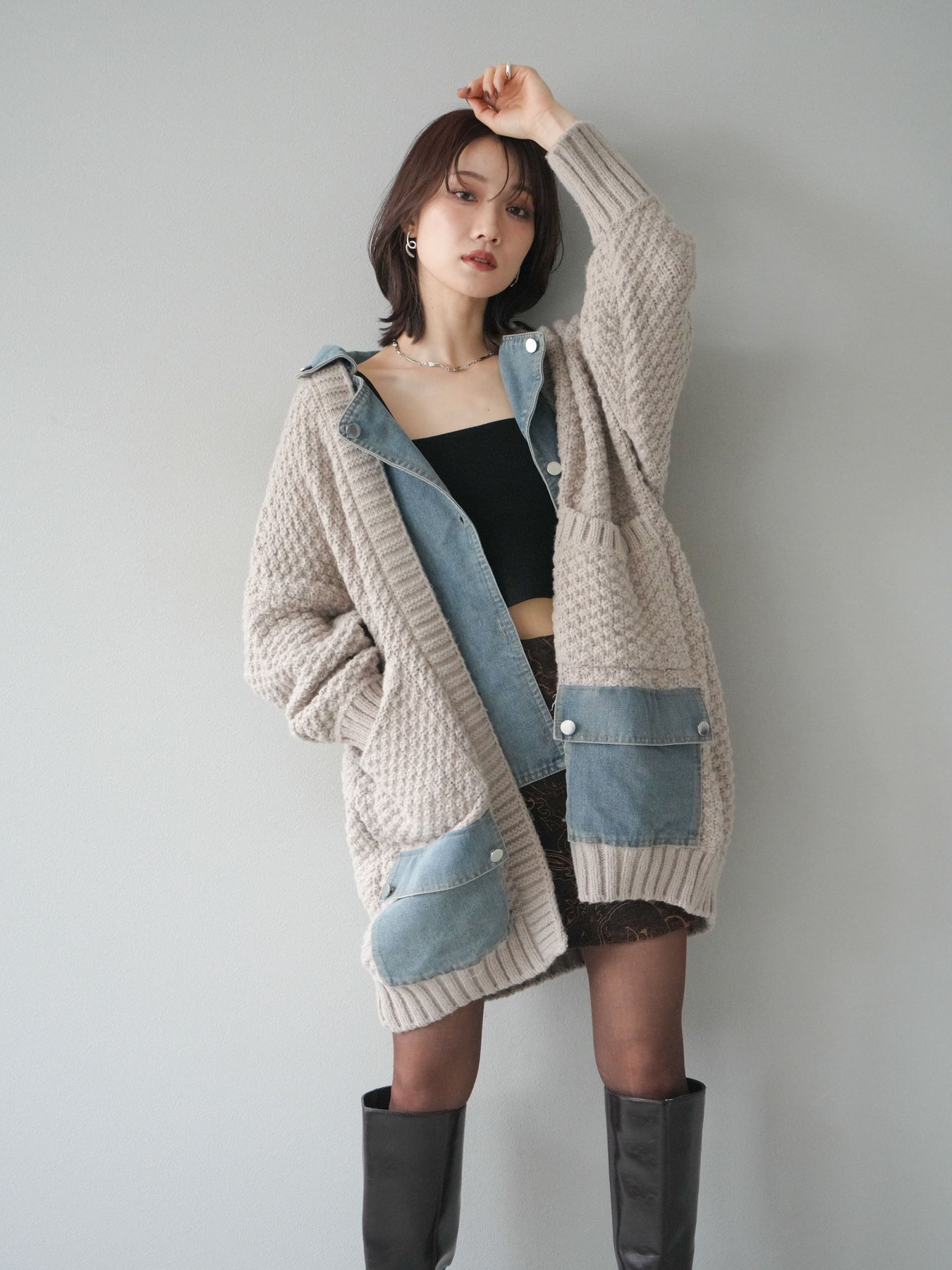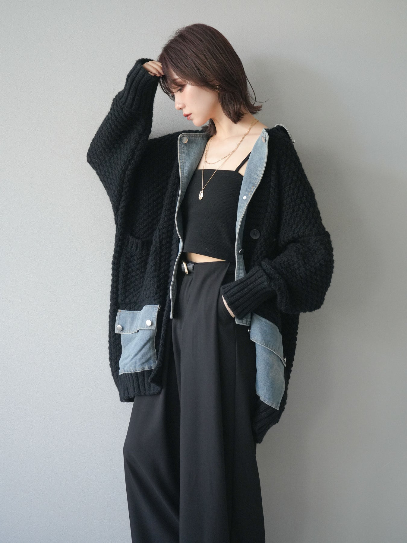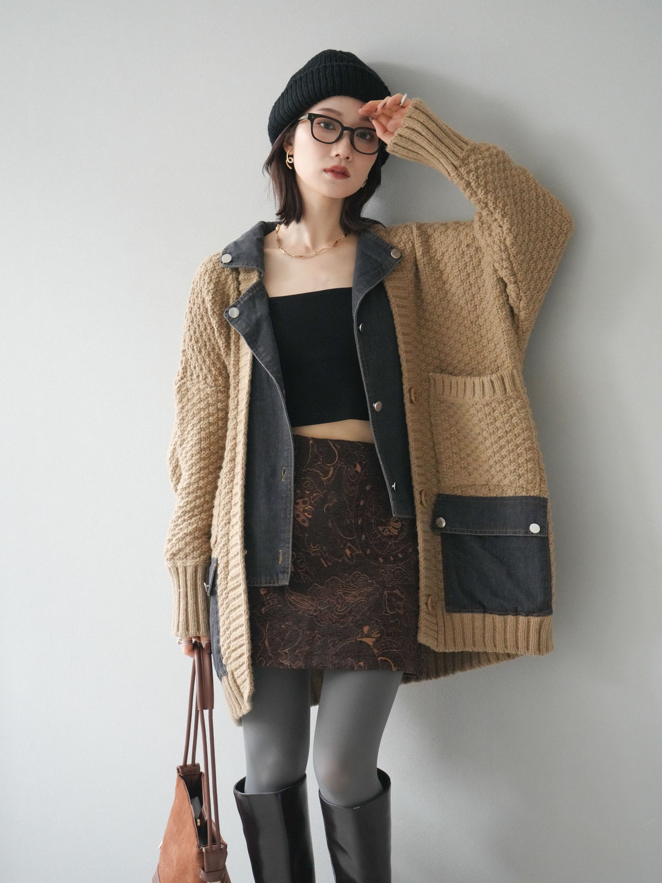 デニムとニットをドッキングした、存在感抜群のケーブルカーディガン。 ざっくりとしたケーブル編みと、デニムの切り替えが絶妙なバランスで、羽織るだけでこなれた印象を演出します。 ボリュームのあるシルエットながら軽やかな着心地で、アウターライクに使える一枚。 デニムの襟やポケットディテールがカジュアルさをプラスし、シンプルなコーディネートにも映えるデザインです。 季節の変わり目にさっと羽織れる、トレンド感のある万能アイテム。 ※ボトムス、キャミソール(インナー)以外の商品は一律でインナーは付属していません。