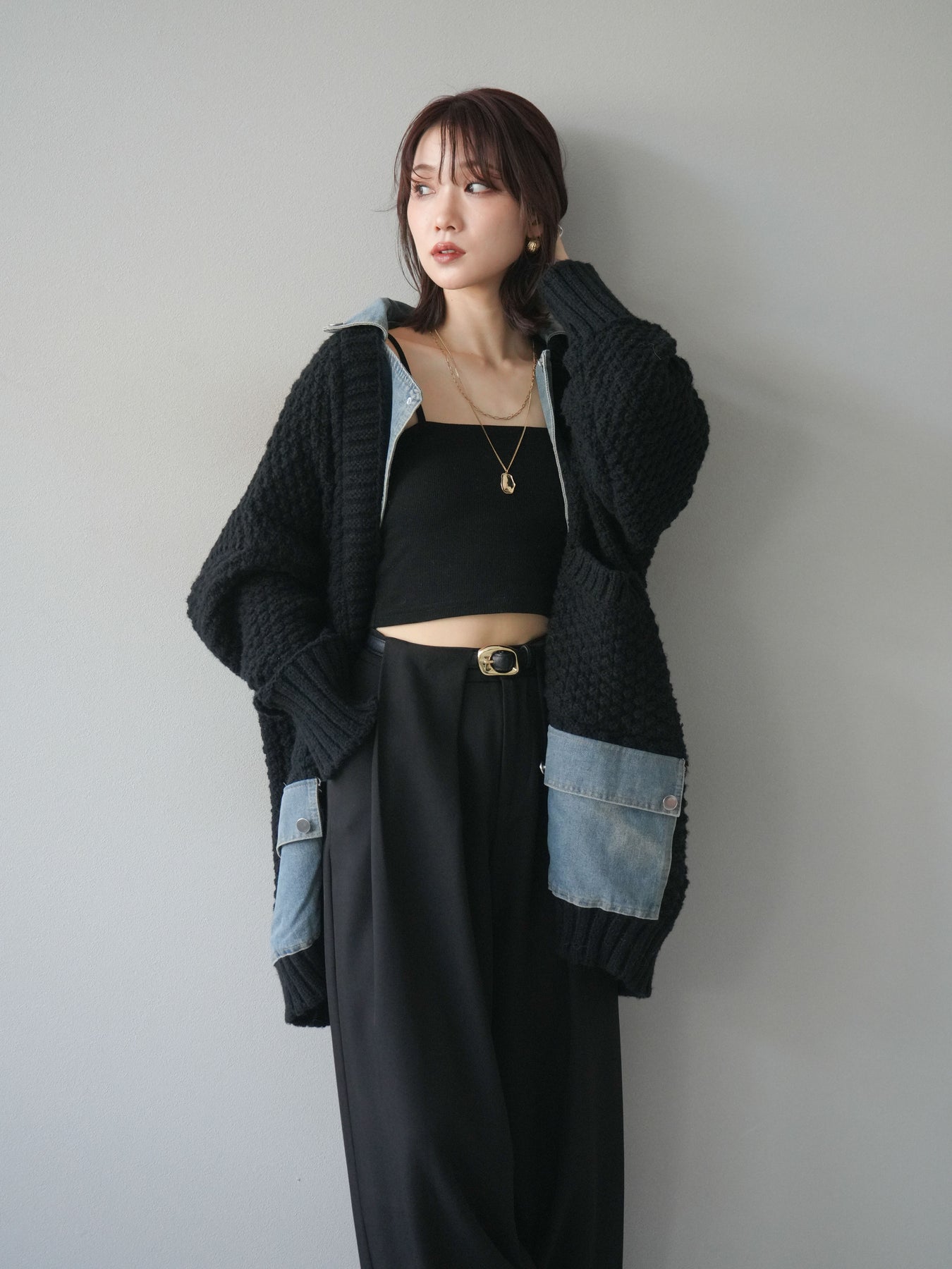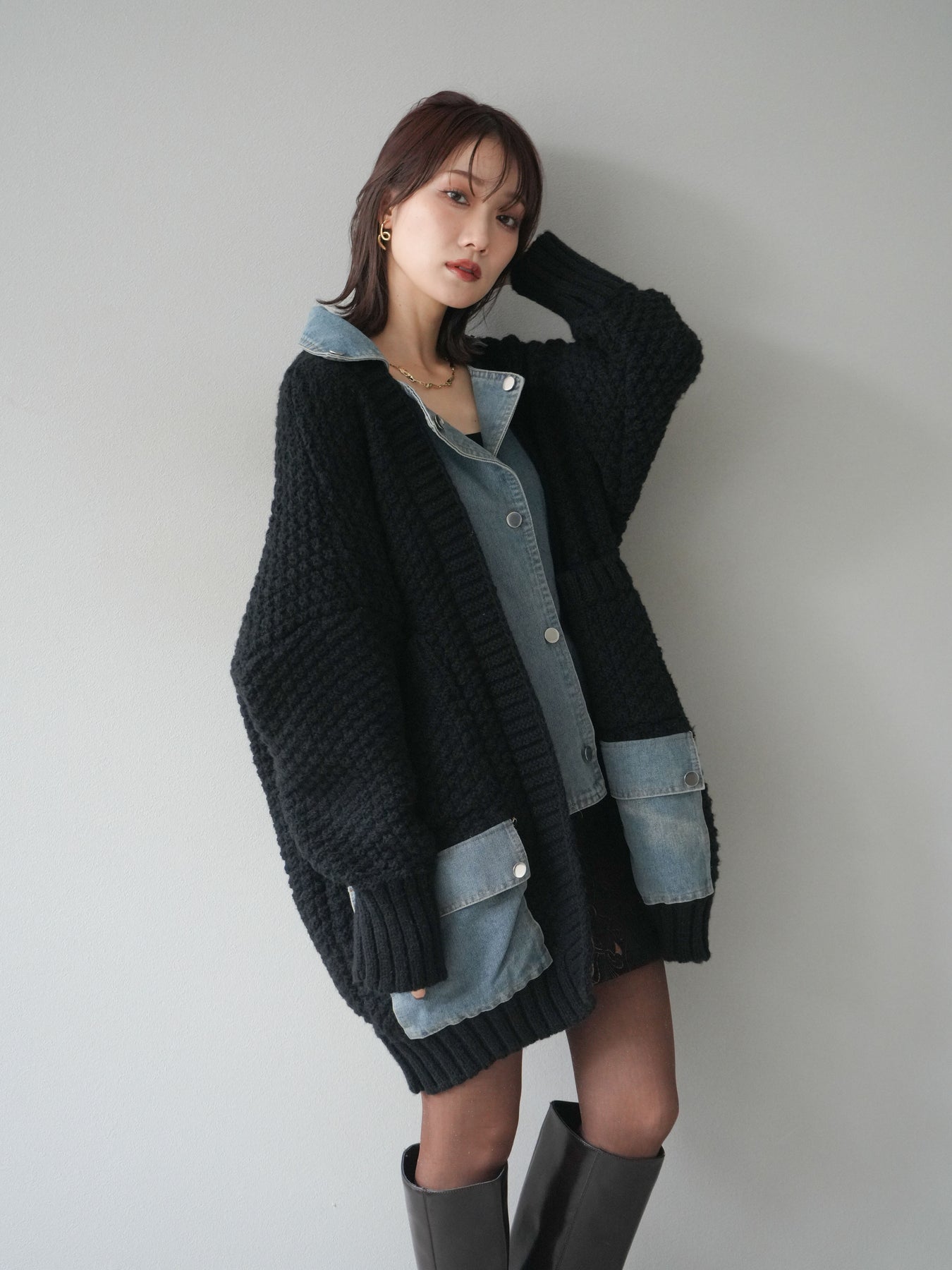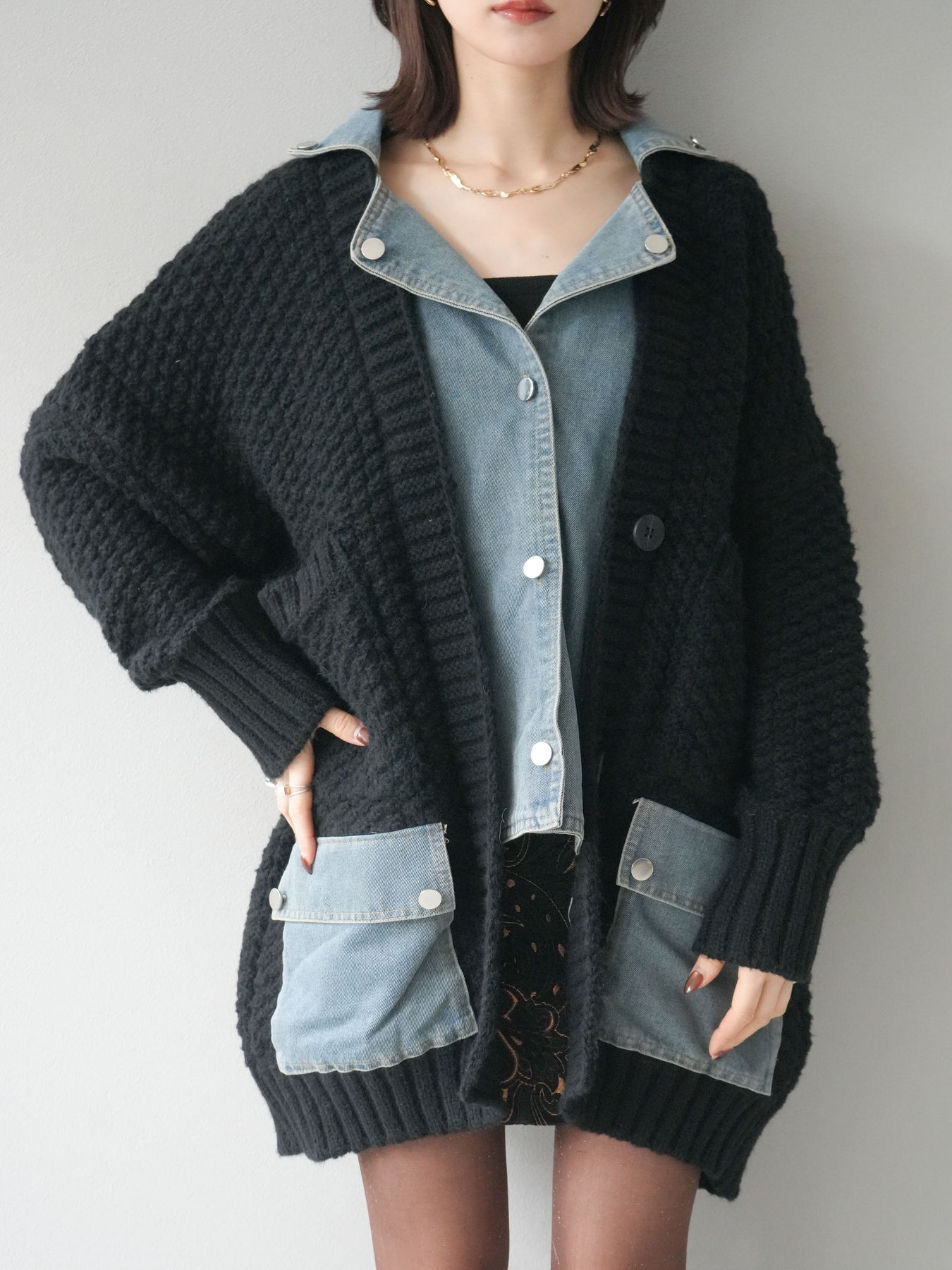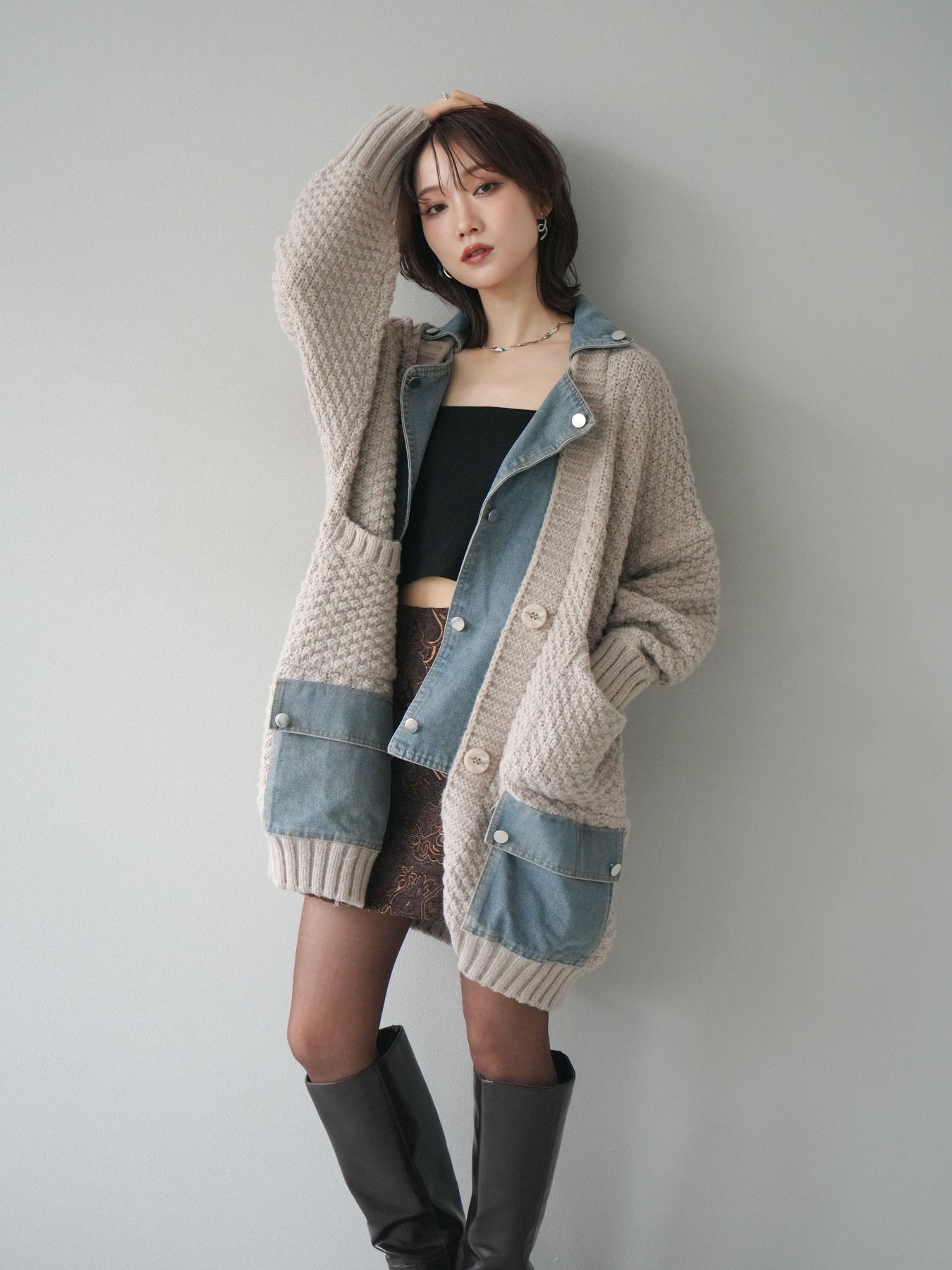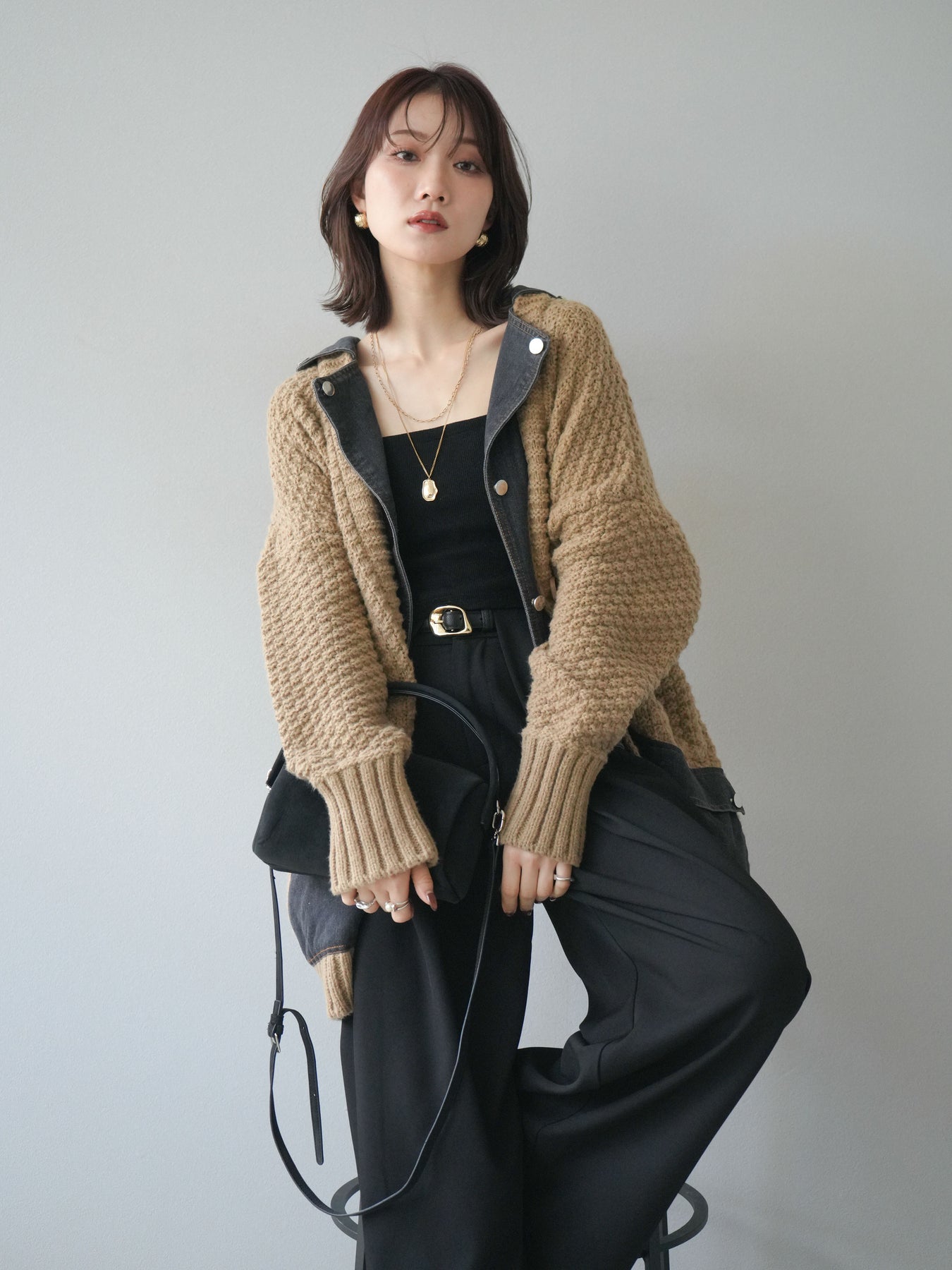 デニムとニットをドッキングした、存在感抜群のケーブルカーディガン。 ざっくりとしたケーブル編みと、デニムの切り替えが絶妙なバランスで、羽織るだけでこなれた印象を演出します。 ボリュームのあるシルエットながら軽やかな着心地で、アウターライクに使える一枚。 デニムの襟やポケットディテールがカジュアルさをプラスし、シンプルなコーディネートにも映えるデザインです。 季節の変わり目にさっと羽織れる、トレンド感のある万能アイテム。 ※ボトムス、キャミソール(インナー)以外の商品は一律でインナーは付属していません。
