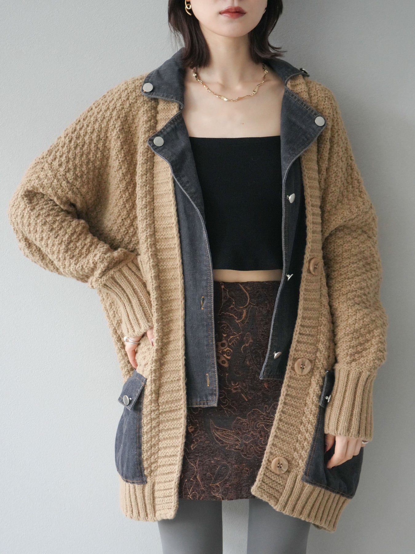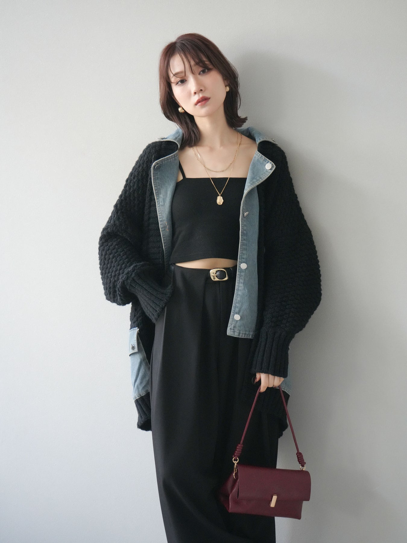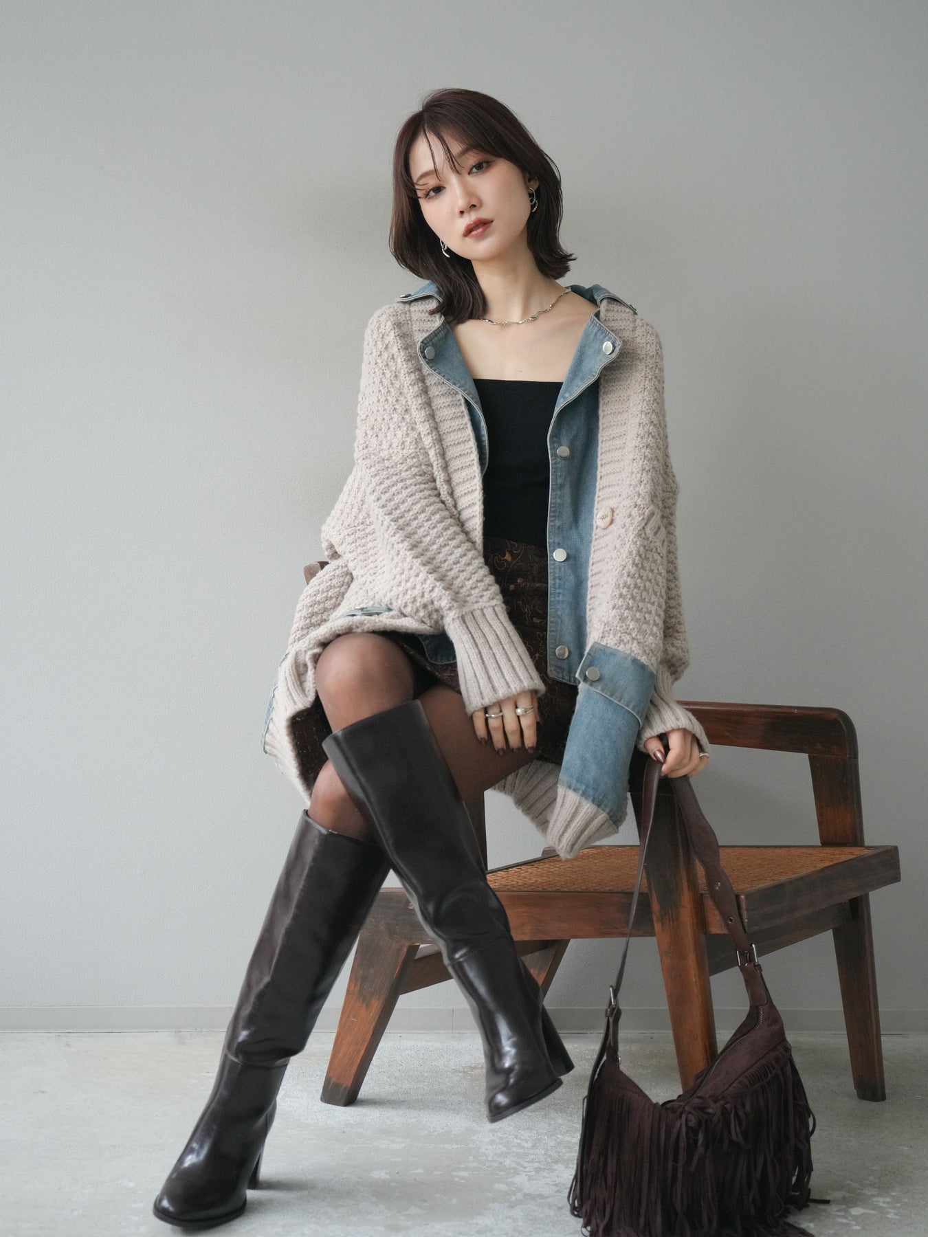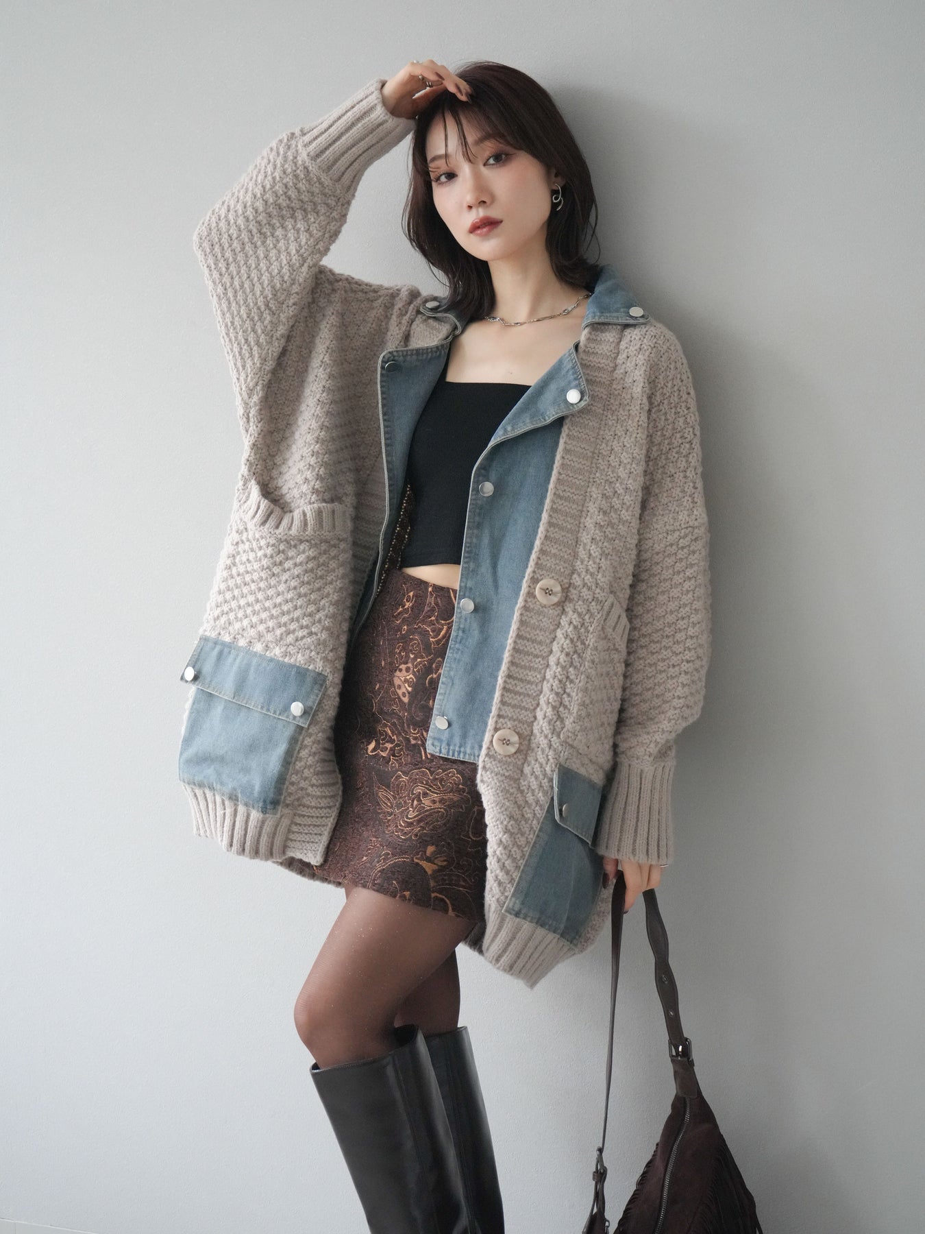 デニムとニットをドッキングした、存在感抜群のケーブルカーディガン。 ざっくりとしたケーブル編みと、デニムの切り替えが絶妙なバランスで、羽織るだけでこなれた印象を演出します。 ボリュームのあるシルエットながら軽やかな着心地で、アウターライクに使える一枚。 デニムの襟やポケットディテールがカジュアルさをプラスし、シンプルなコーディネートにも映えるデザインです。 季節の変わり目にさっと羽織れる、トレンド感のある万能アイテム。 ※ボトムス、キャミソール(インナー)以外の商品は一律でインナーは付属していません。