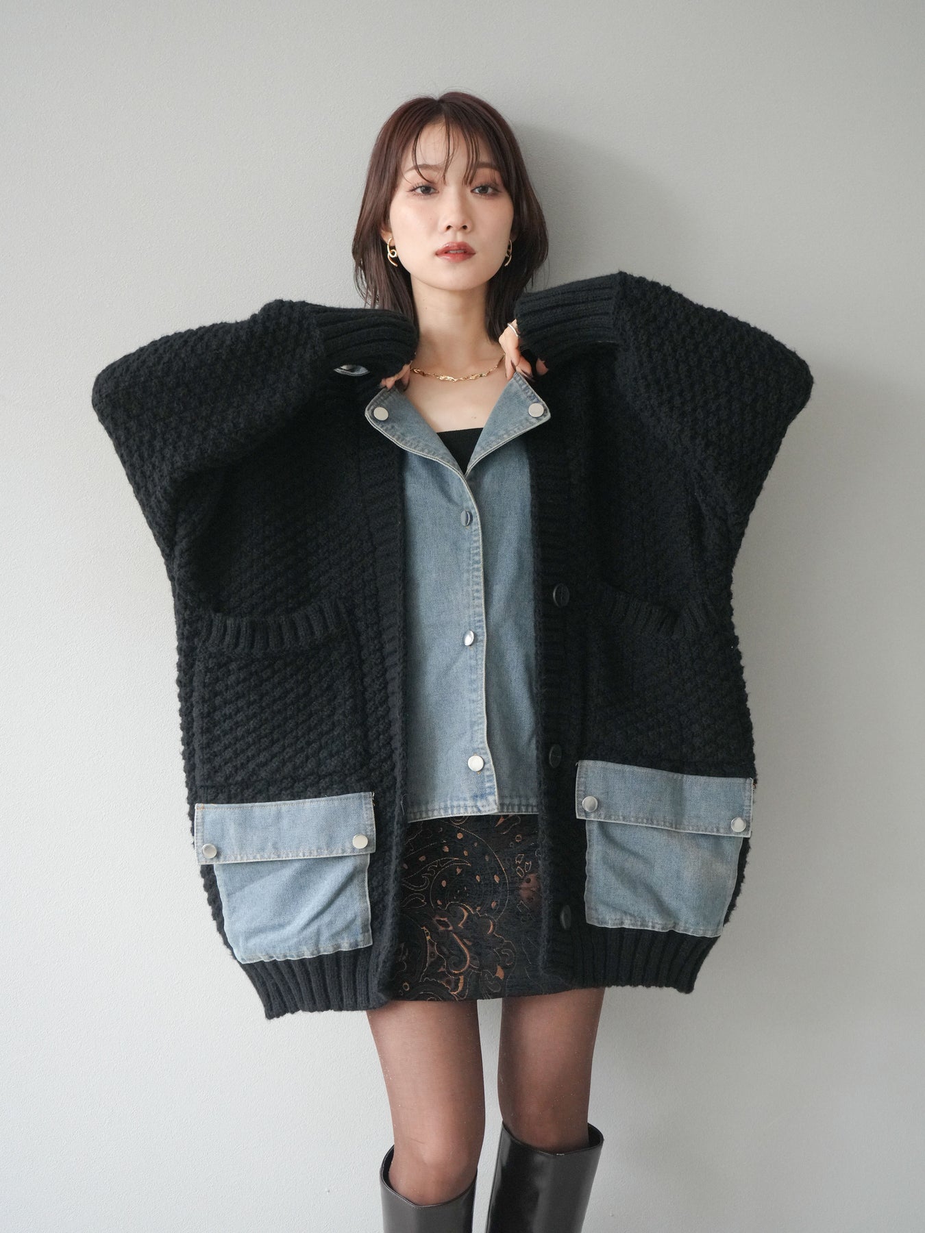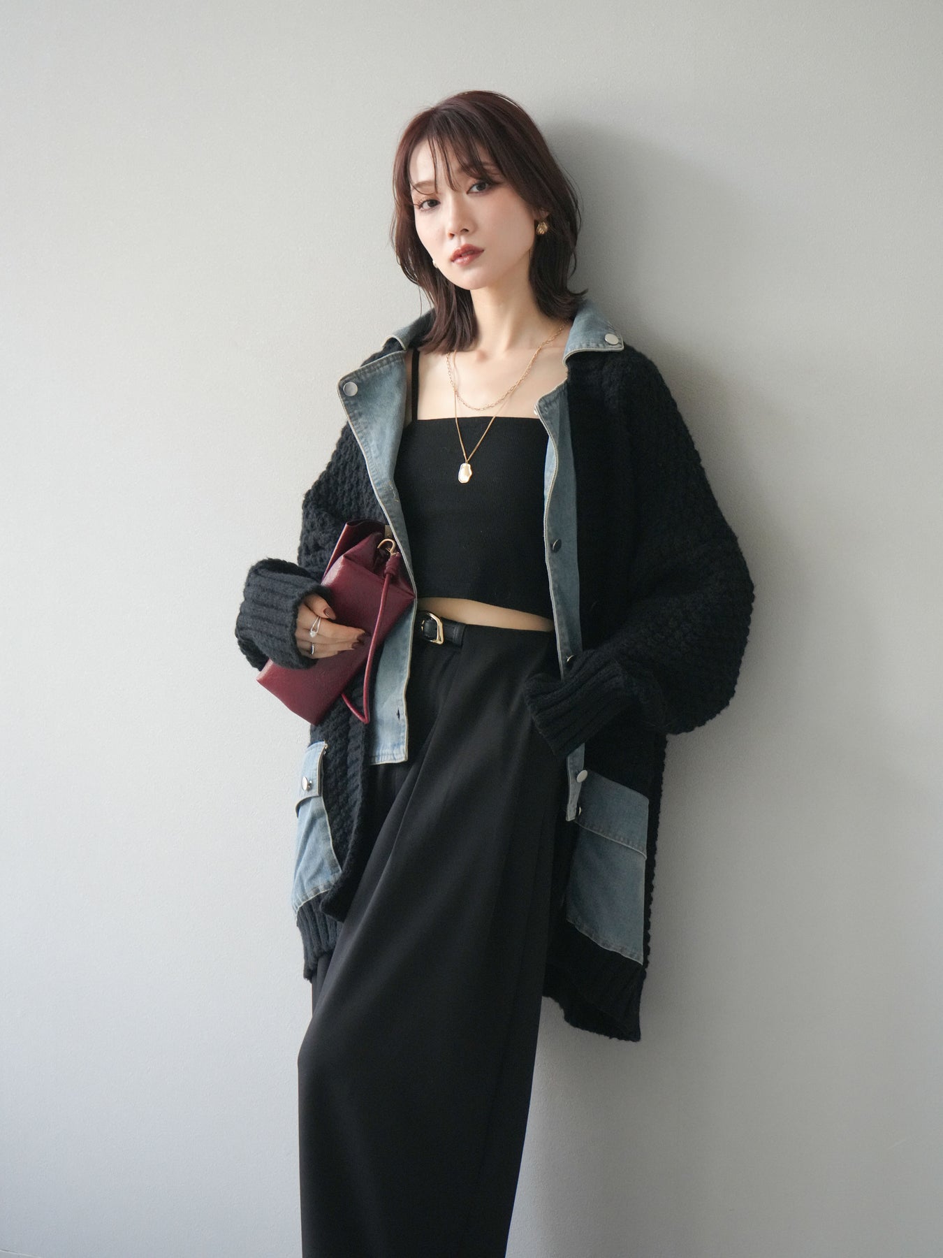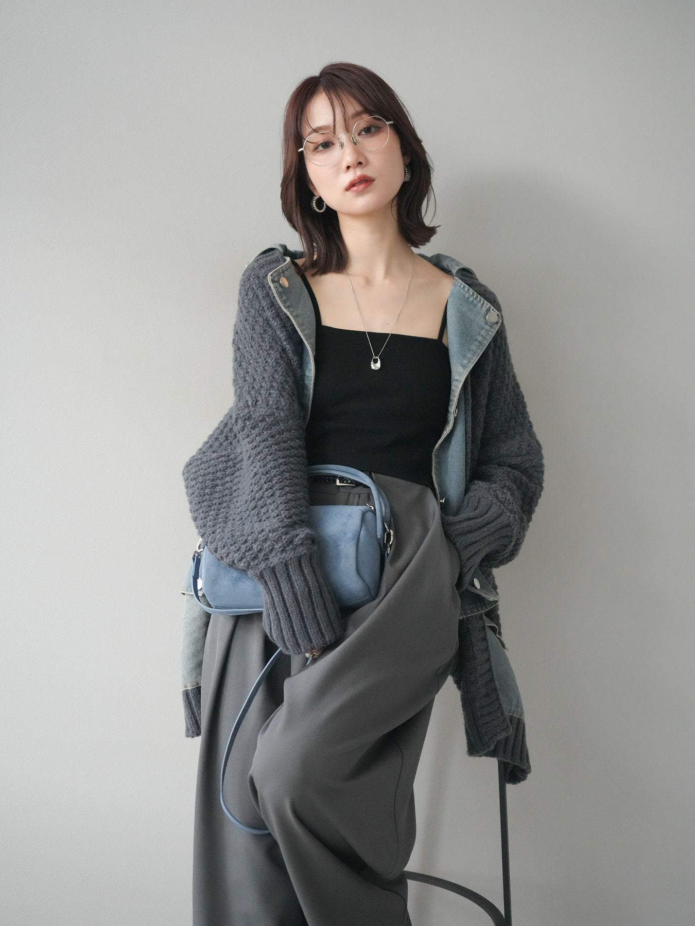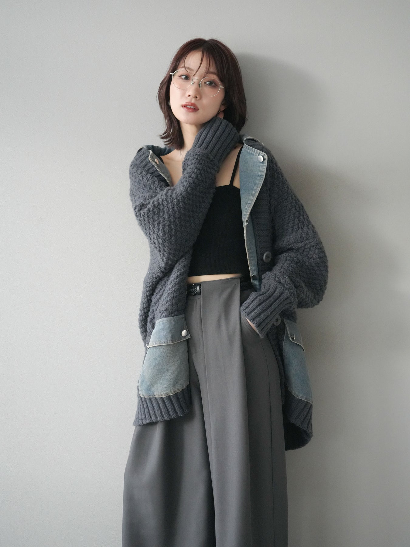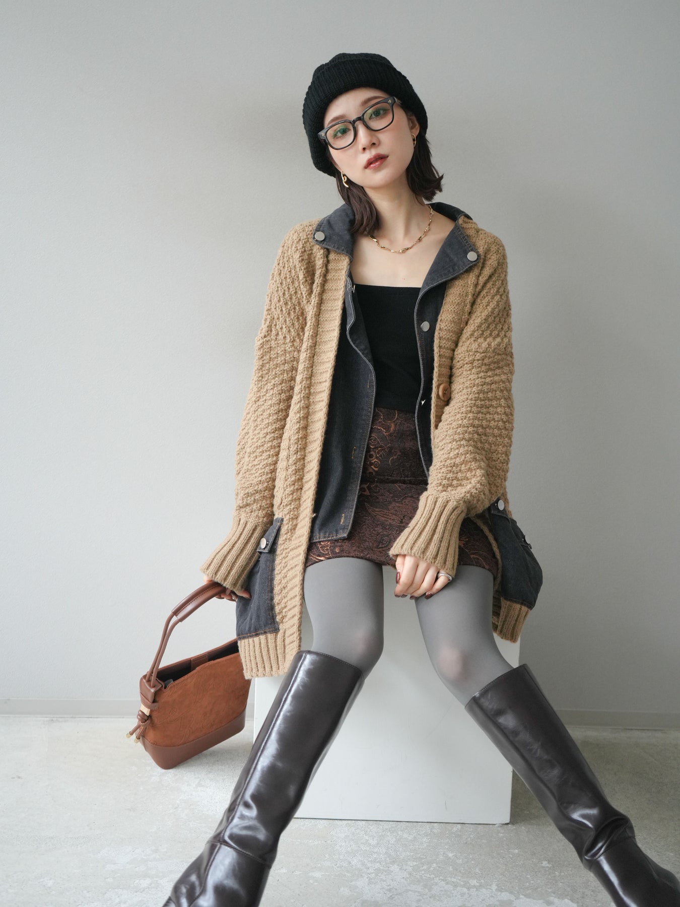 デニムとニットをドッキングした、存在感抜群のケーブルカーディガン。 ざっくりとしたケーブル編みと、デニムの切り替えが絶妙なバランスで、羽織るだけでこなれた印象を演出します。 ボリュームのあるシルエットながら軽やかな着心地で、アウターライクに使える一枚。 デニムの襟やポケットディテールがカジュアルさをプラスし、シンプルなコーディネートにも映えるデザインです。 季節の変わり目にさっと羽織れる、トレンド感のある万能アイテム。 ※ボトムス、キャミソール(インナー)以外の商品は一律でインナーは付属していません。