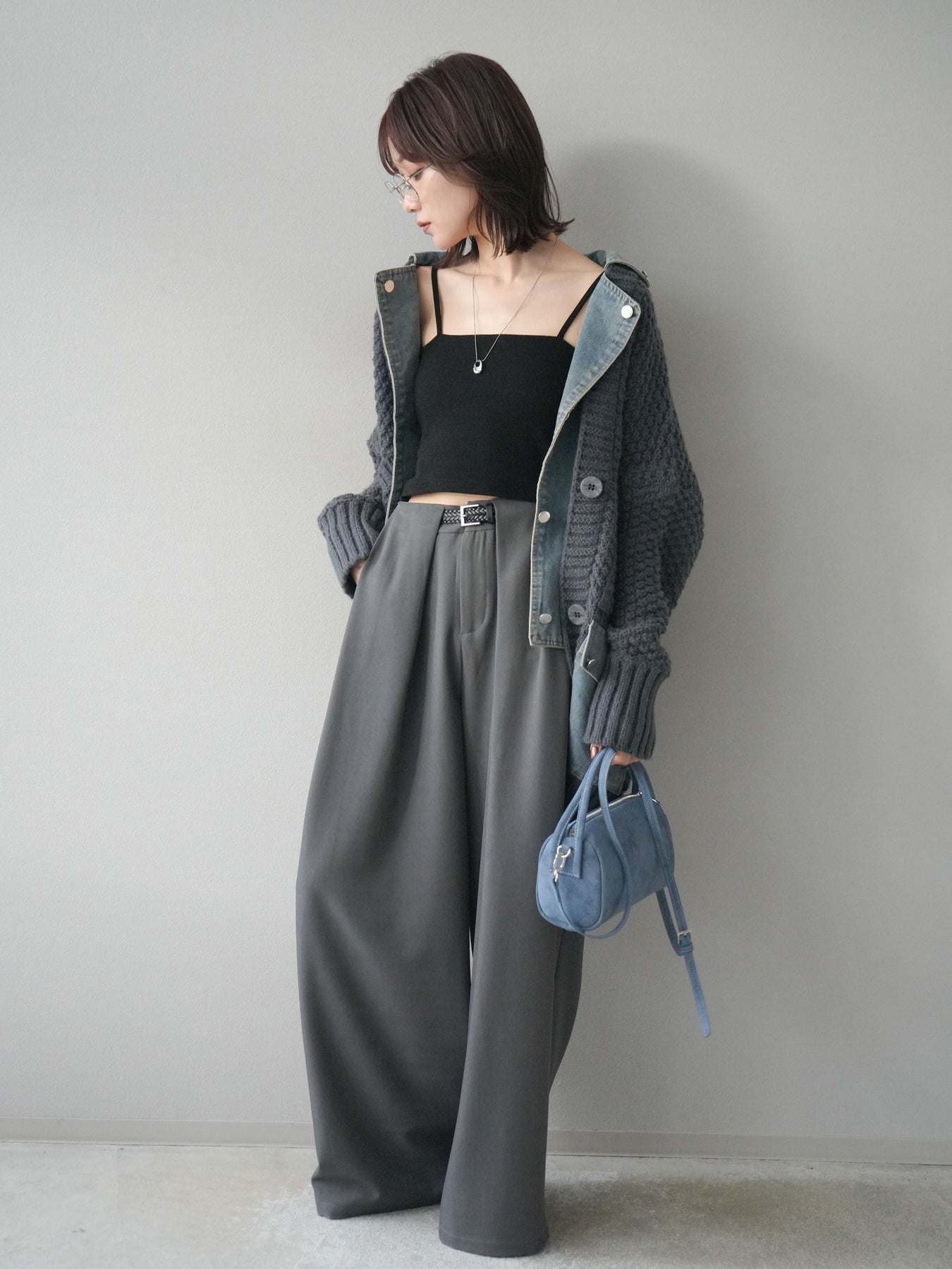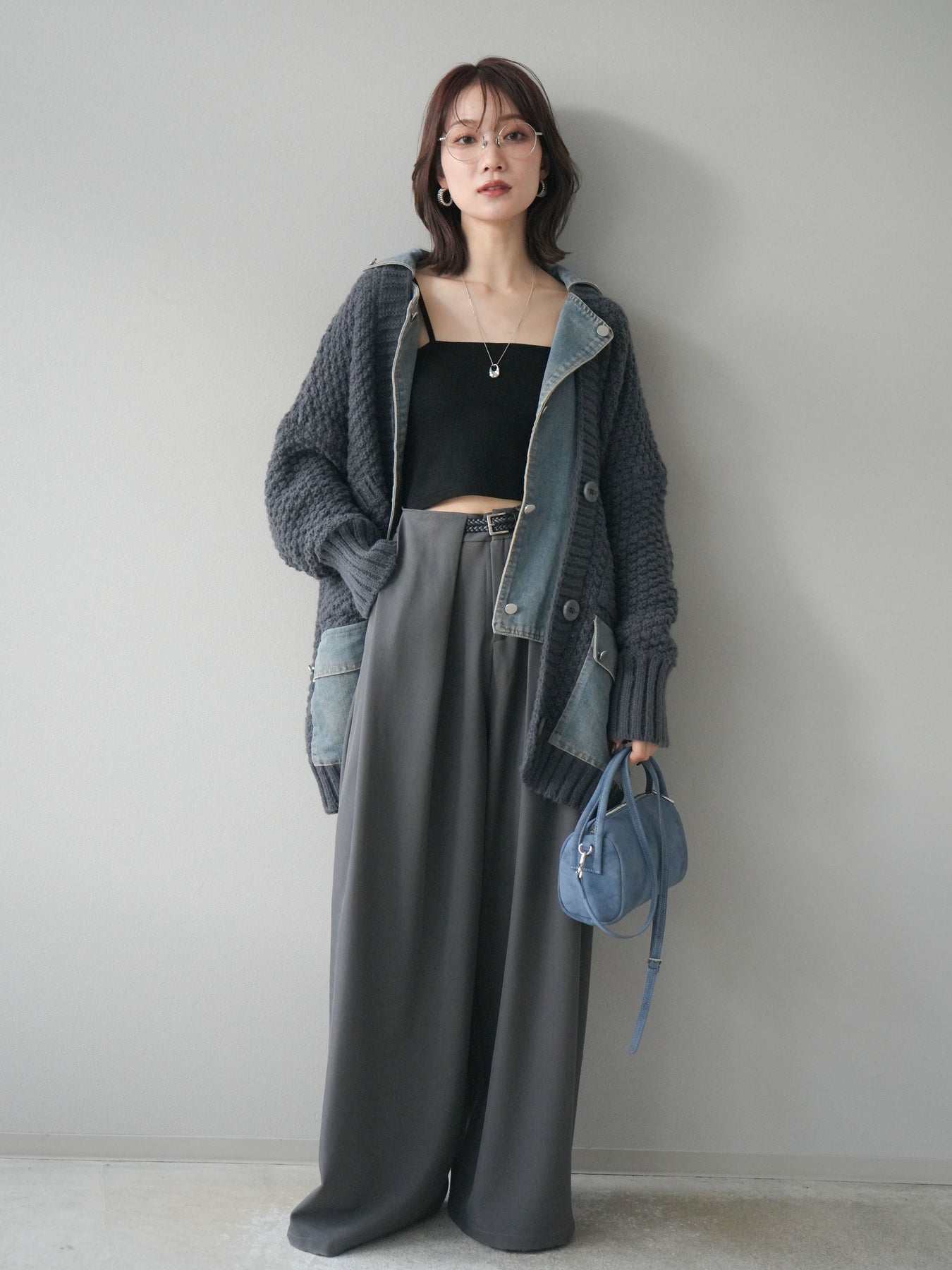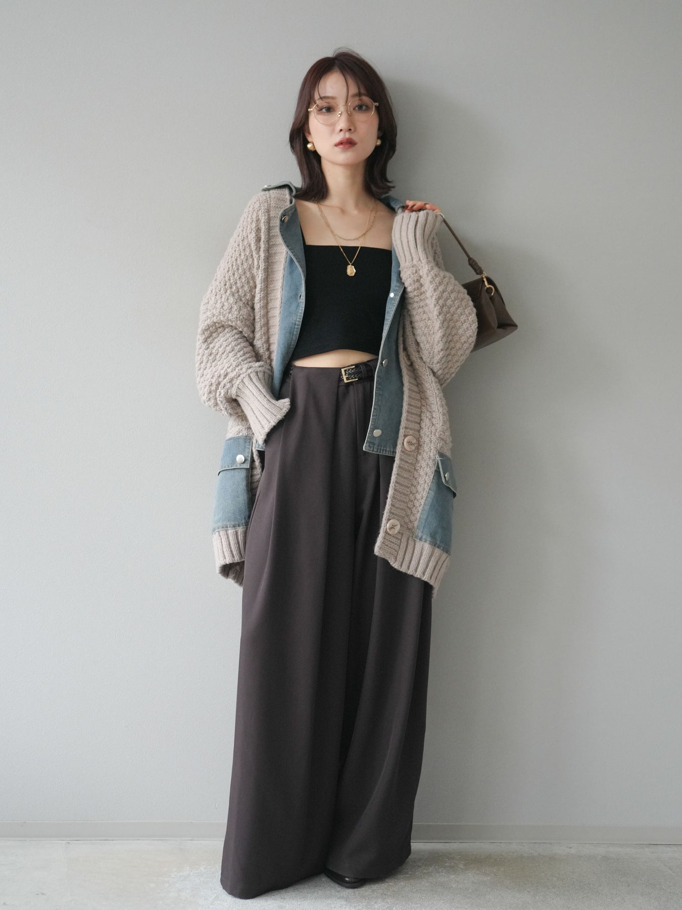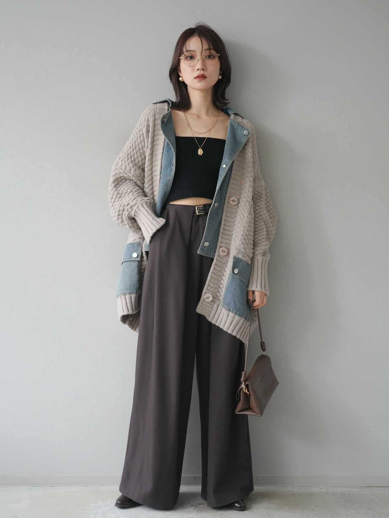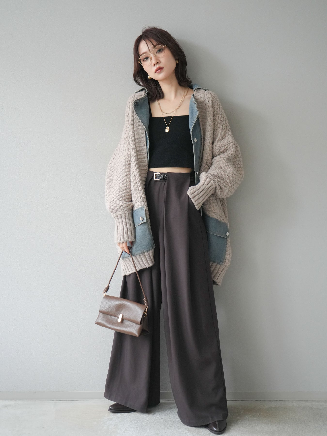 [SET]デニム襟レイヤードニットジャケット+ベルトループデザインワイドパンツ(2set)