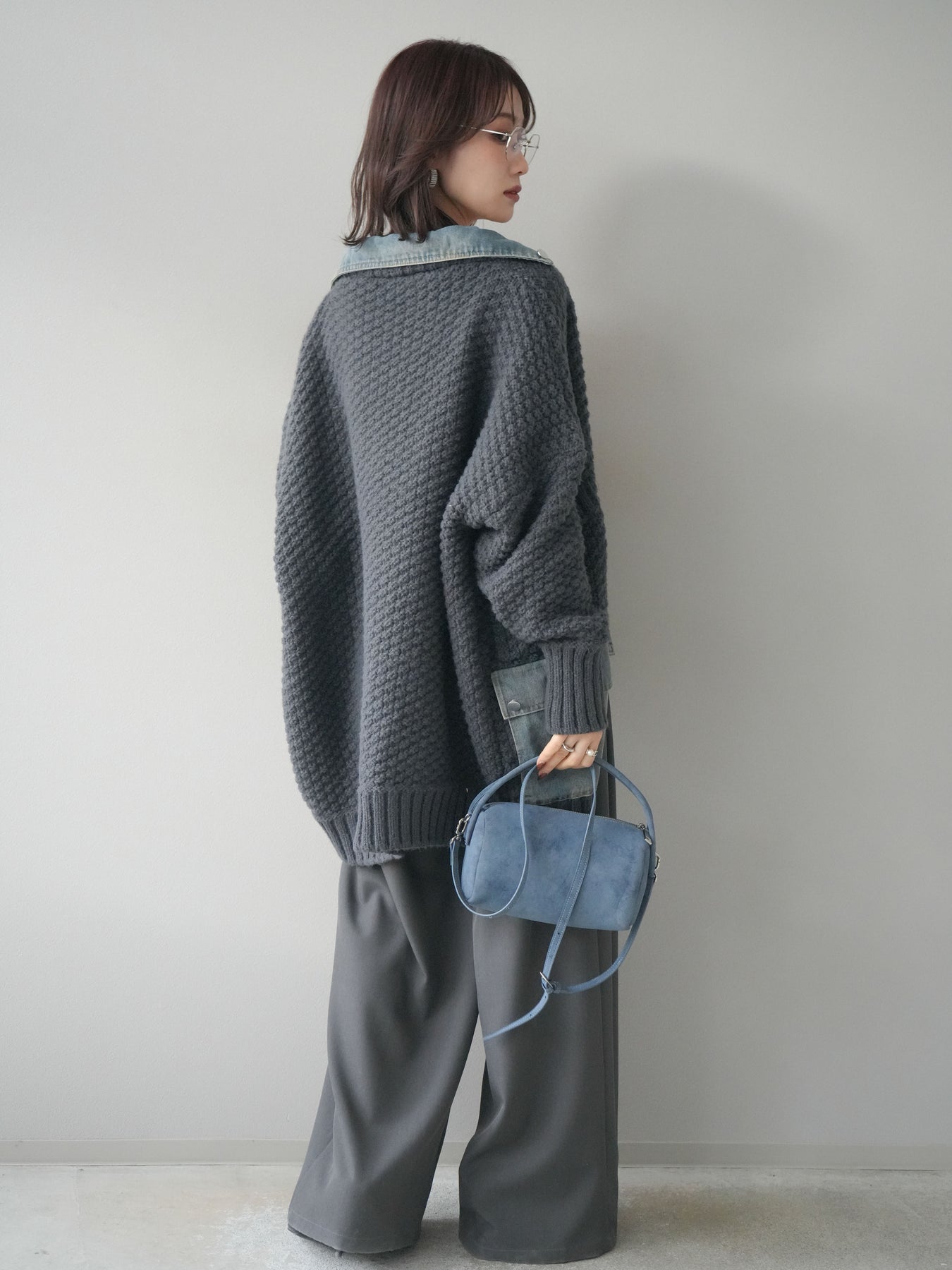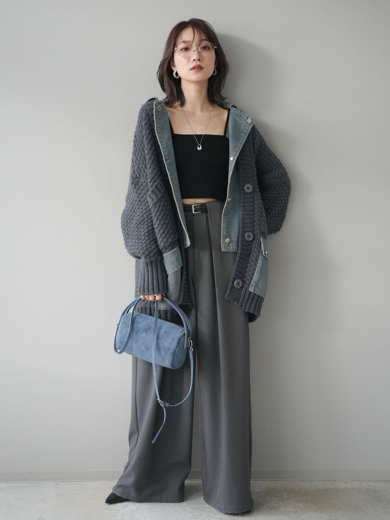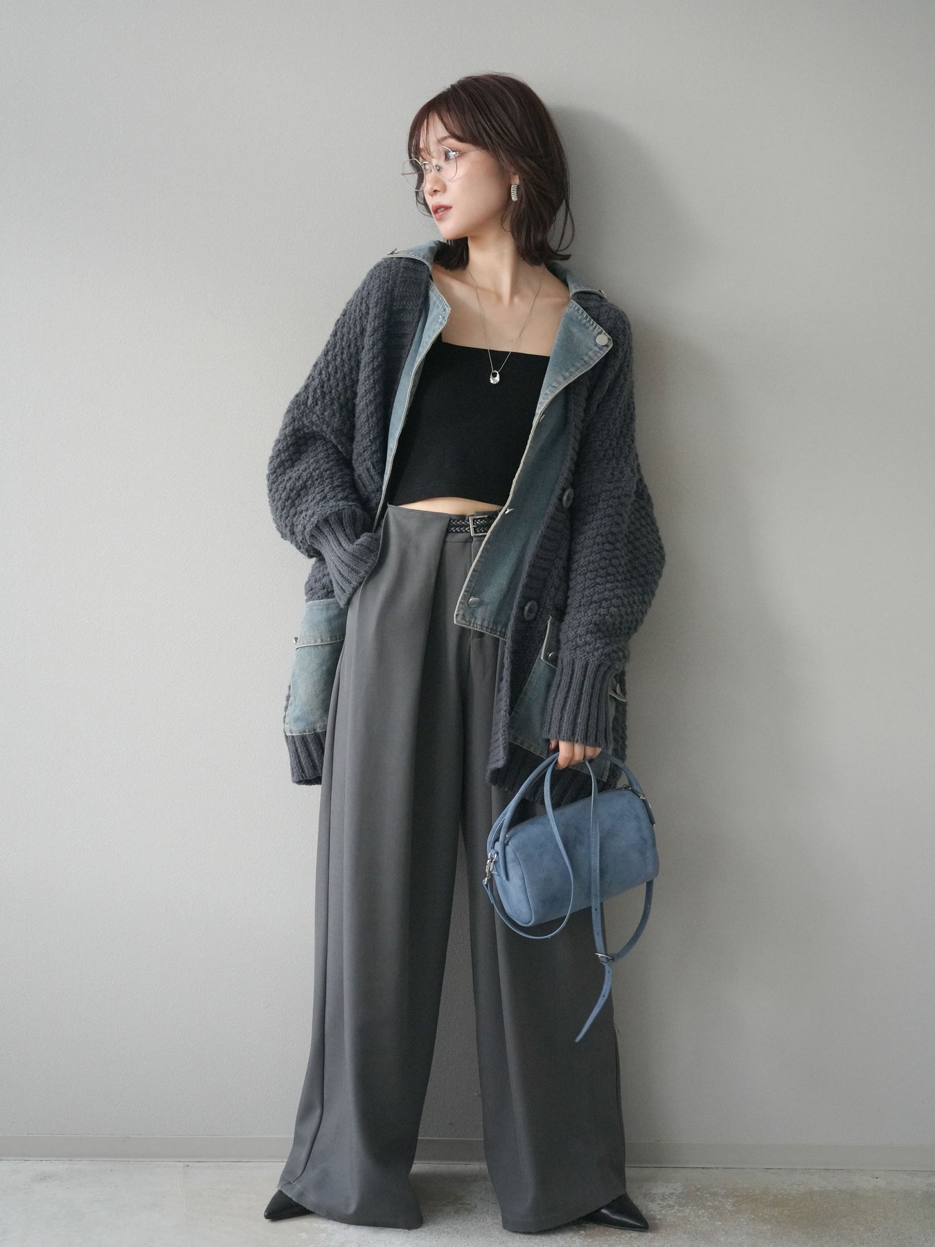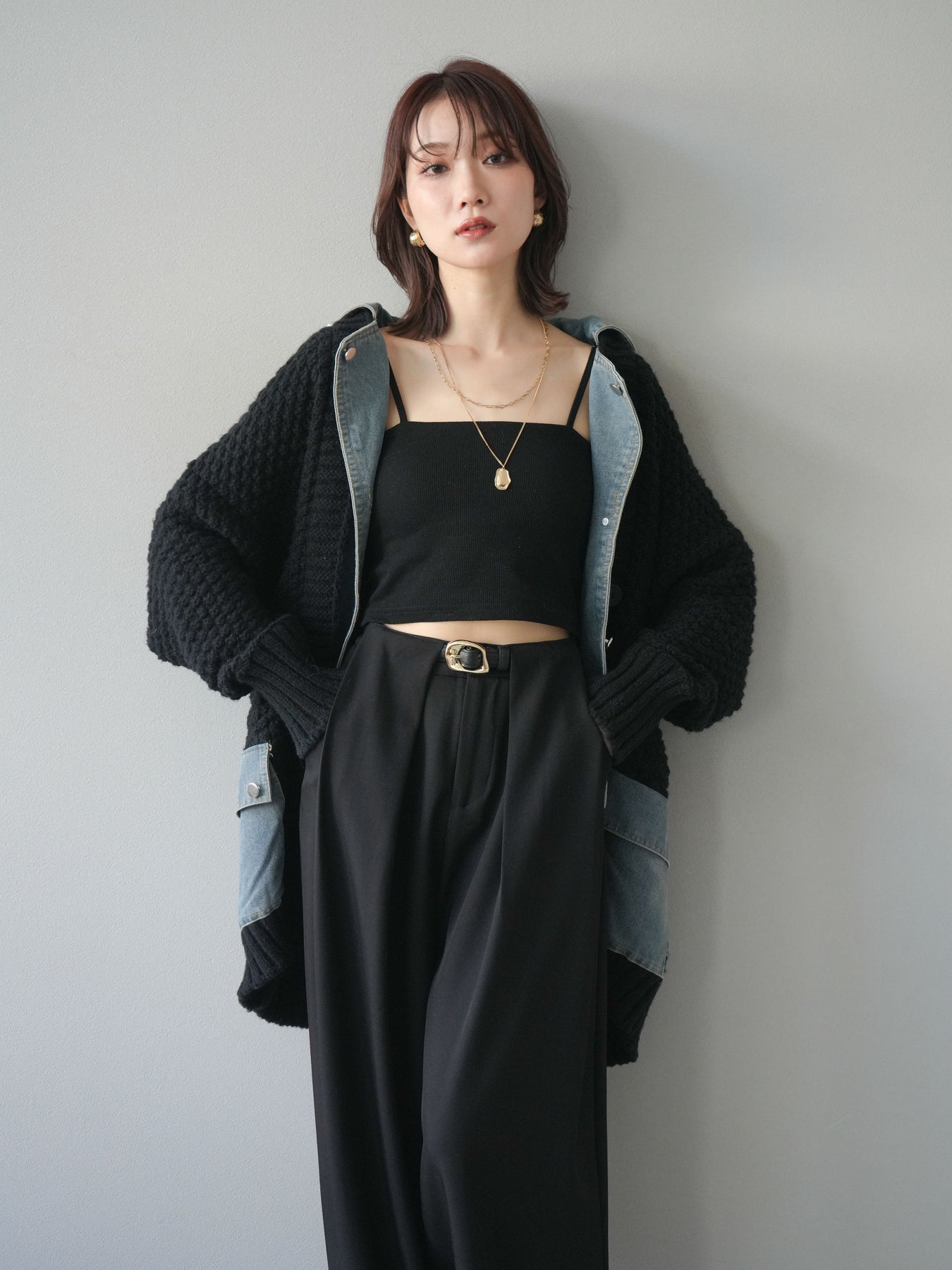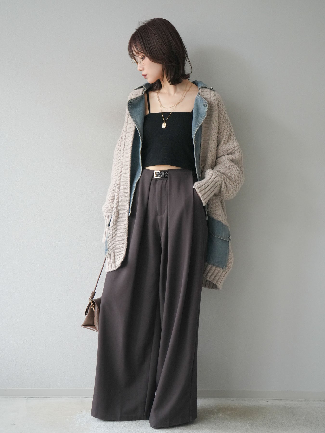 [SET]デニム襟レイヤードニットジャケット+ベルトループデザインワイドパンツ(2set)