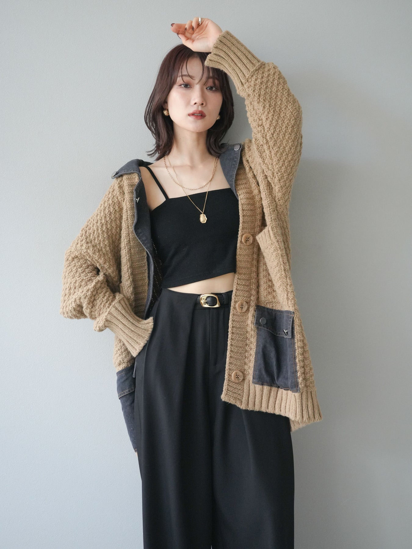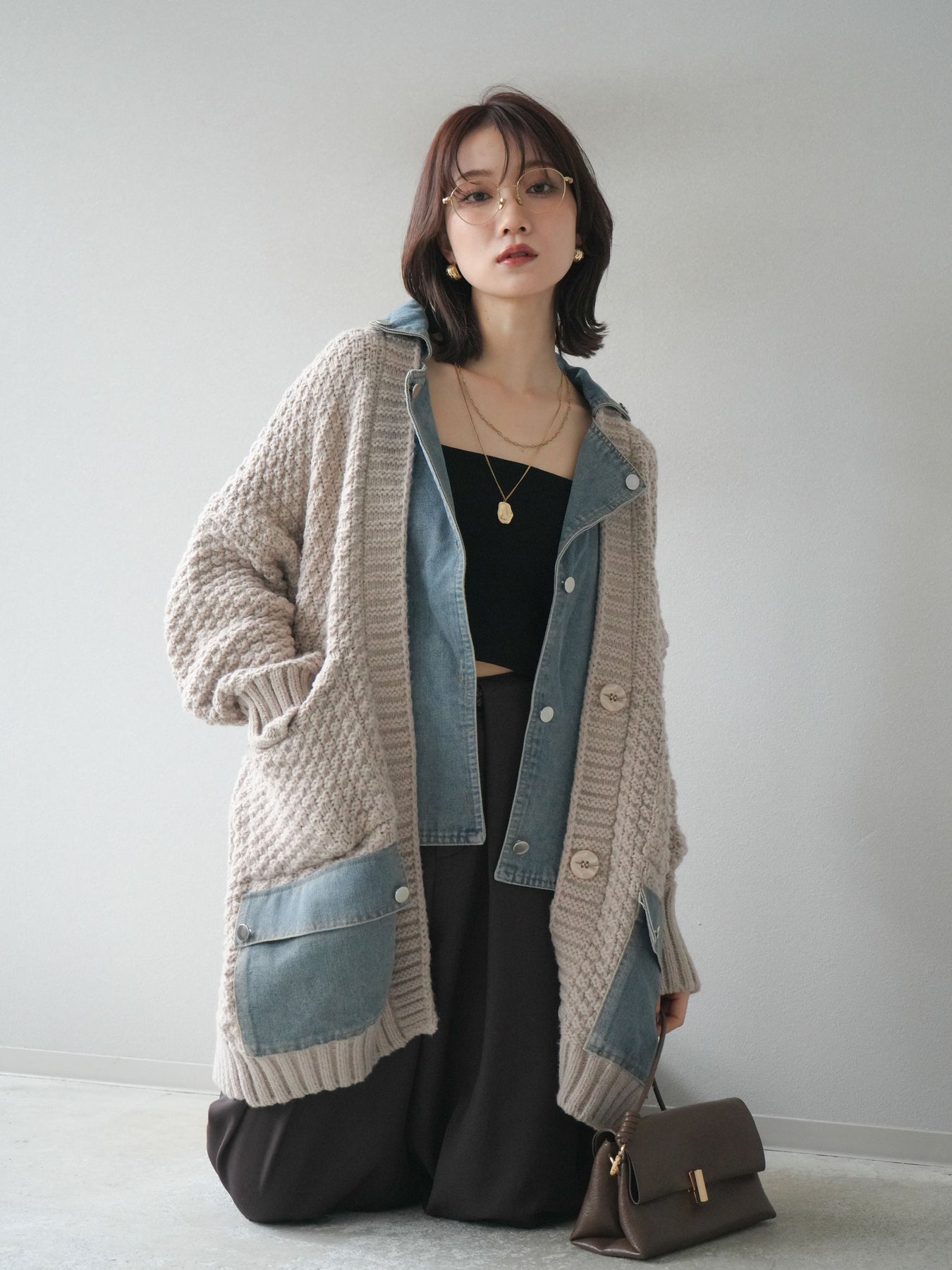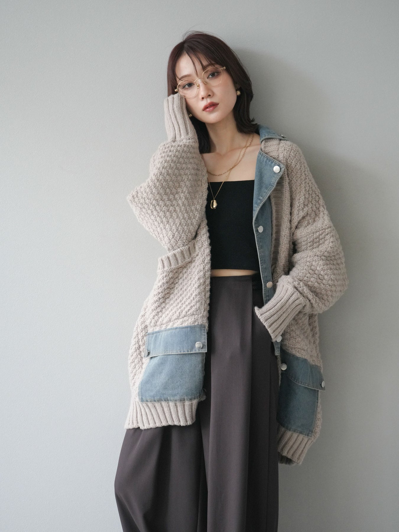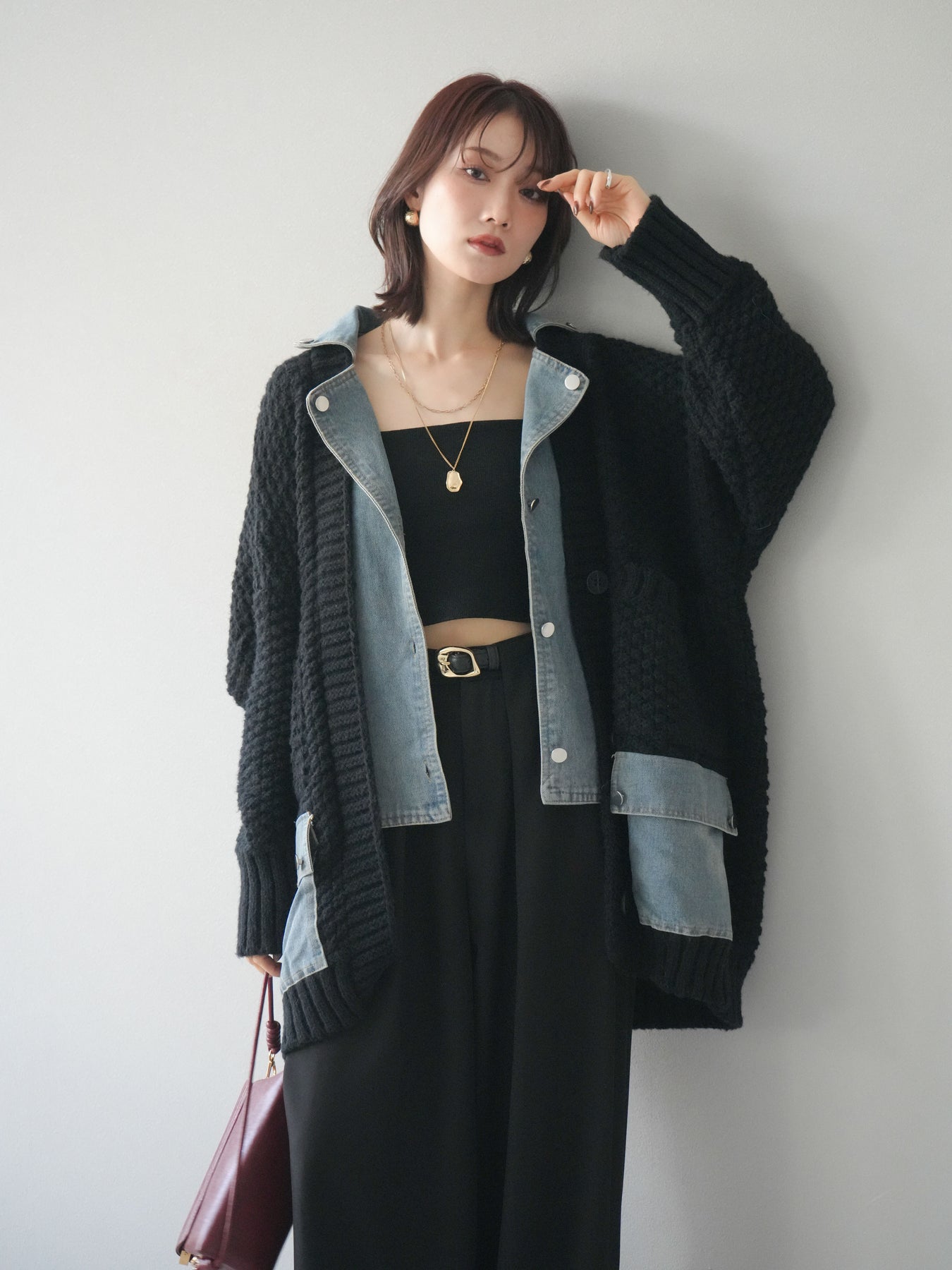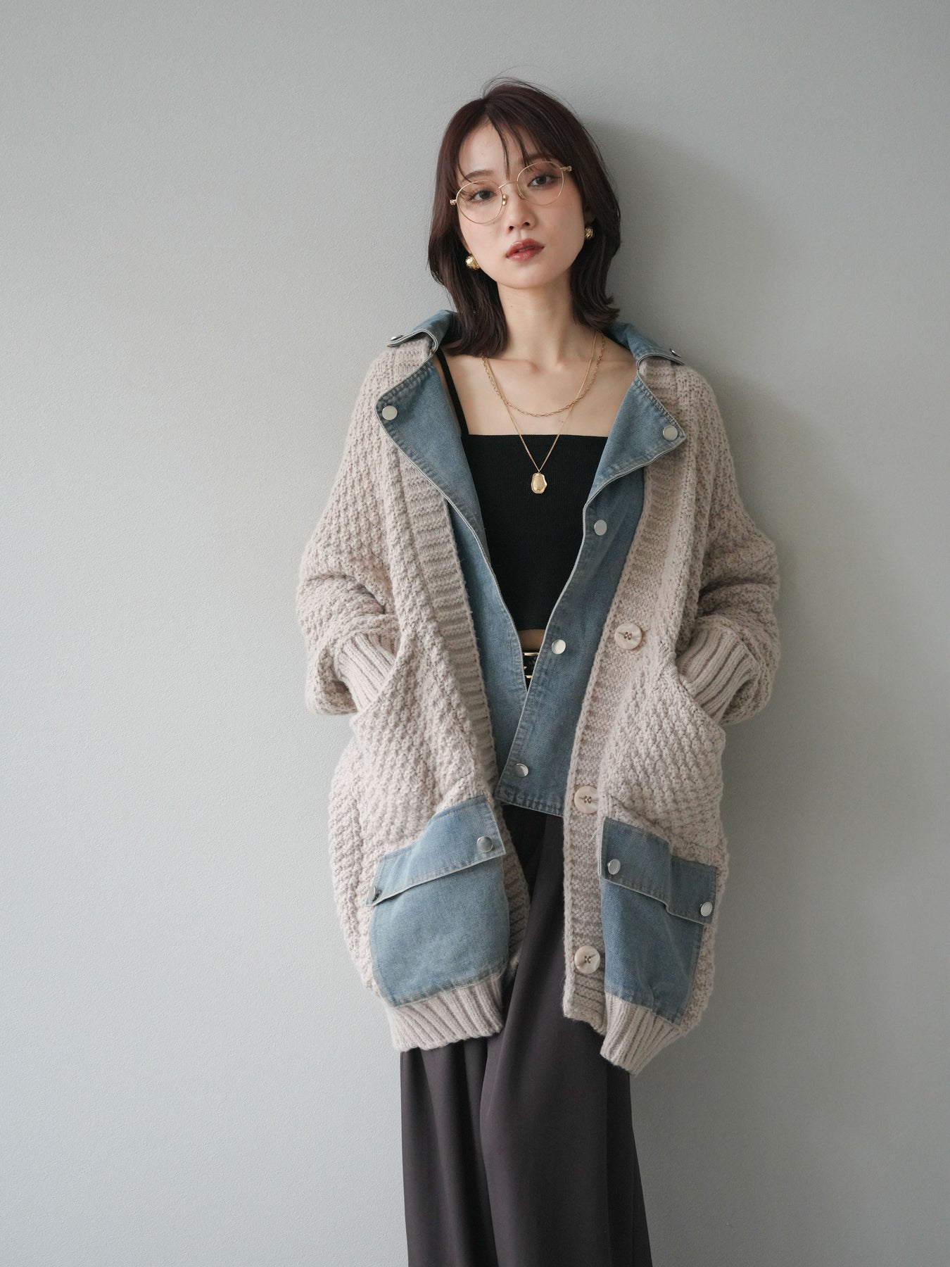 デニムとニットをドッキングした、存在感抜群のケーブルカーディガン。 ざっくりとしたケーブル編みと、デニムの切り替えが絶妙なバランスで、羽織るだけでこなれた印象を演出します。 ボリュームのあるシルエットながら軽やかな着心地で、アウターライクに使える一枚。 デニムの襟やポケットディテールがカジュアルさをプラスし、シンプルなコーディネートにも映えるデザインです。 季節の変わり目にさっと羽織れる、トレンド感のある万能アイテム。 ※ボトムス、キャミソール(インナー)以外の商品は一律でインナーは付属していません。